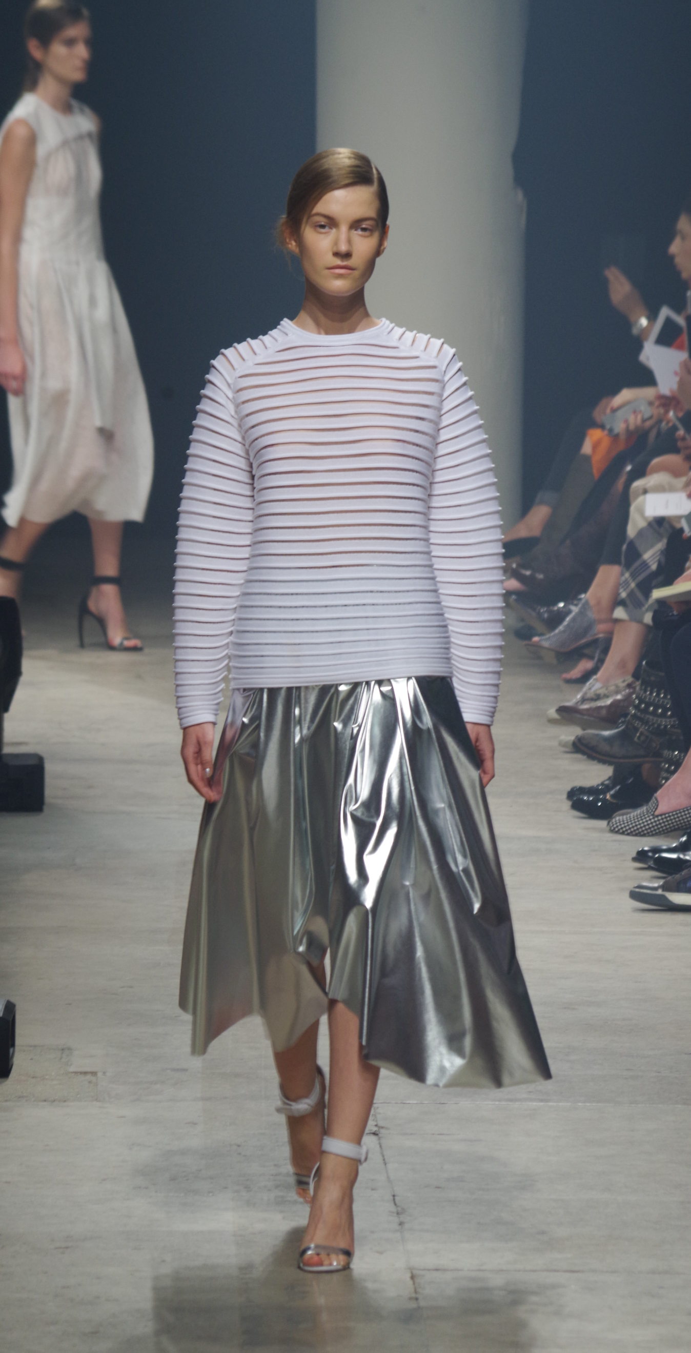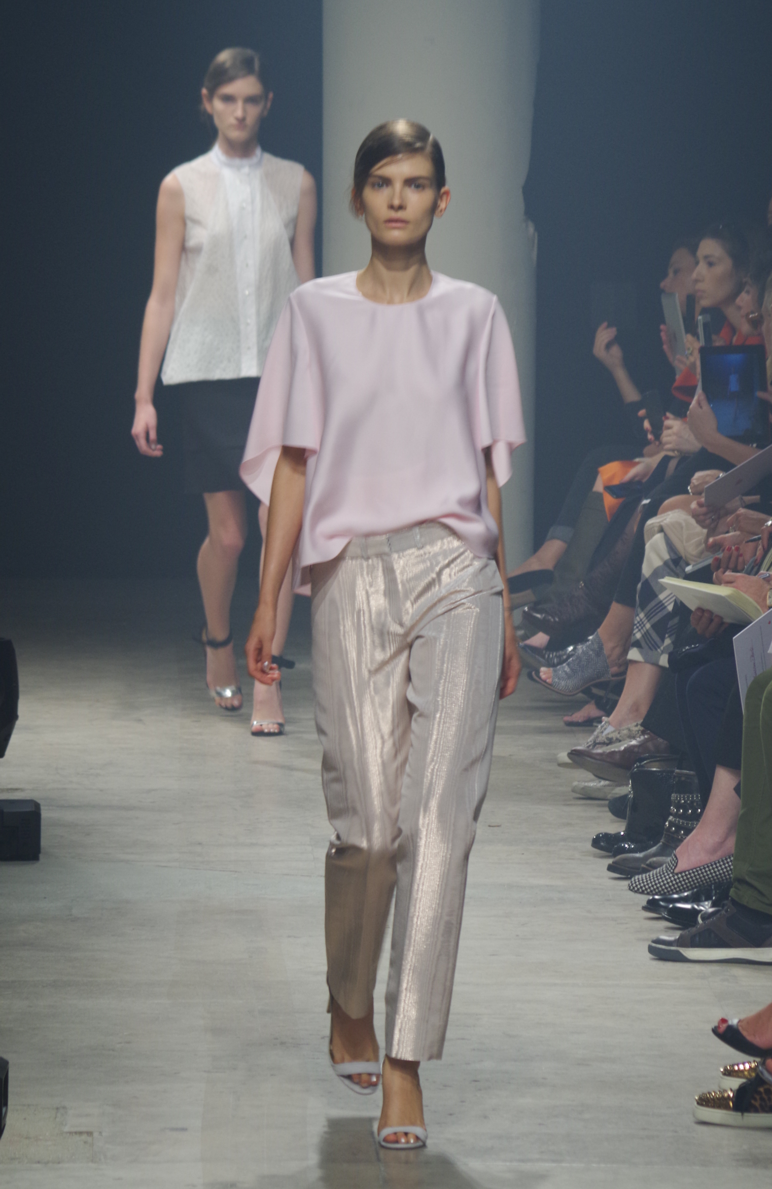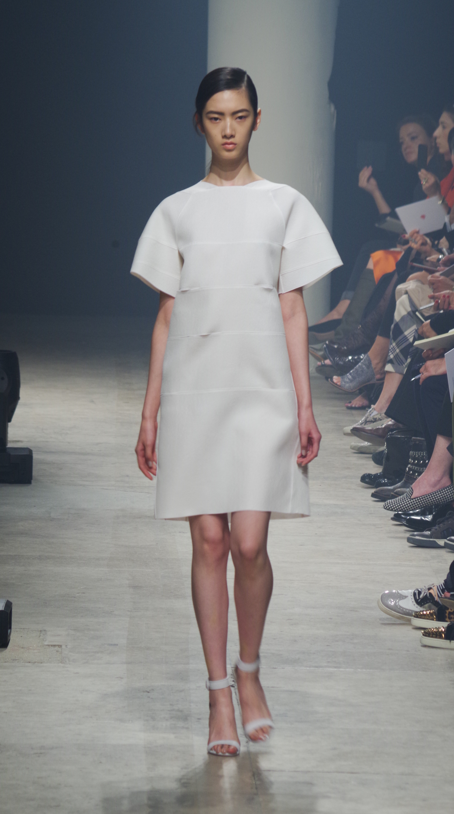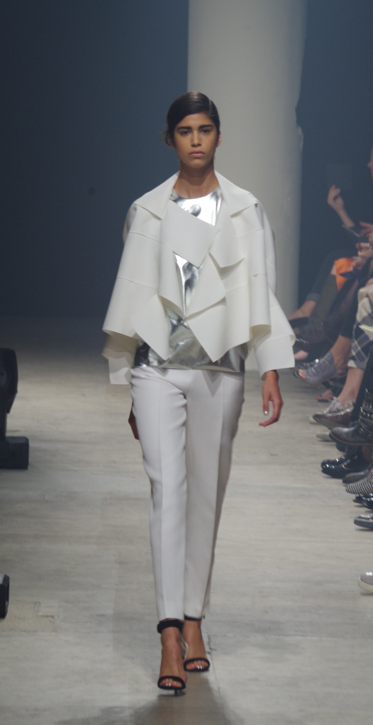 Maison Rabih Kayrouz presents a luminous collection for its Prêt à Porter Spring Summer 2014 collection. Playing with geometric shapes and, above all, materials, we are dazzled by these optical whites, by aluminum set against pink and black.