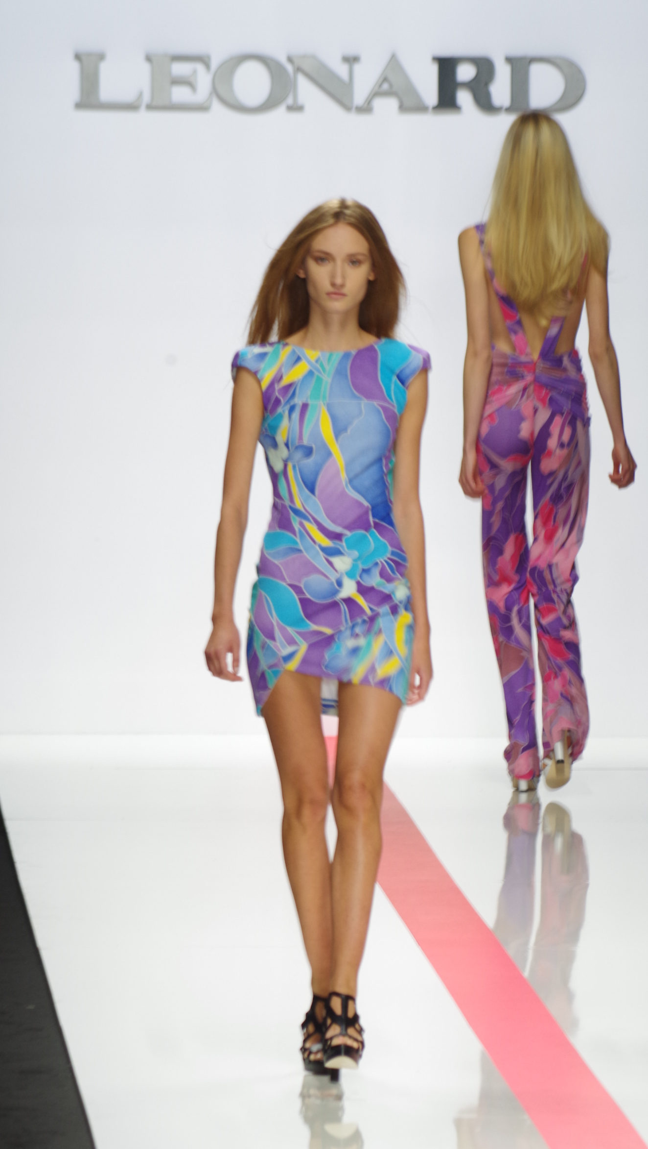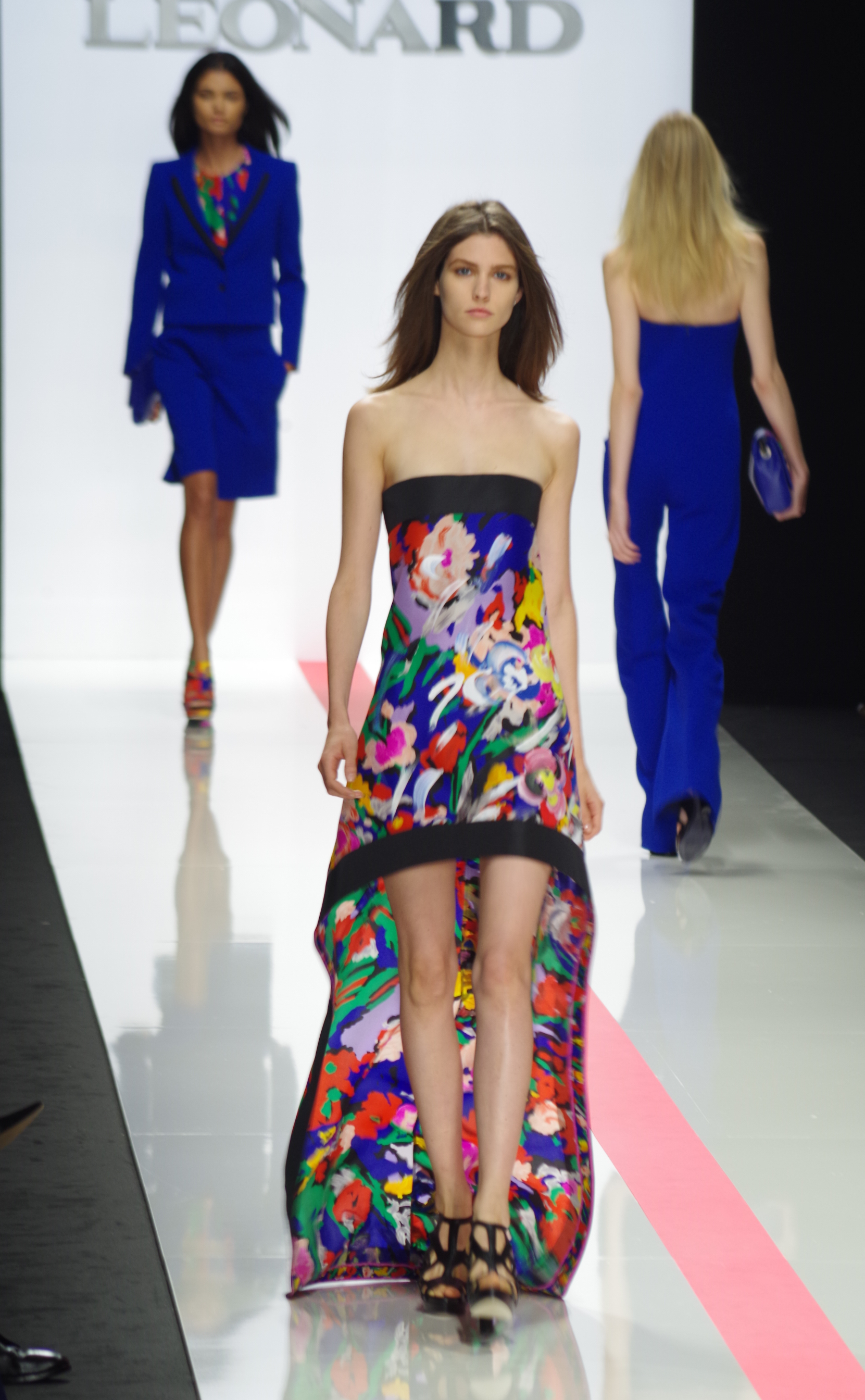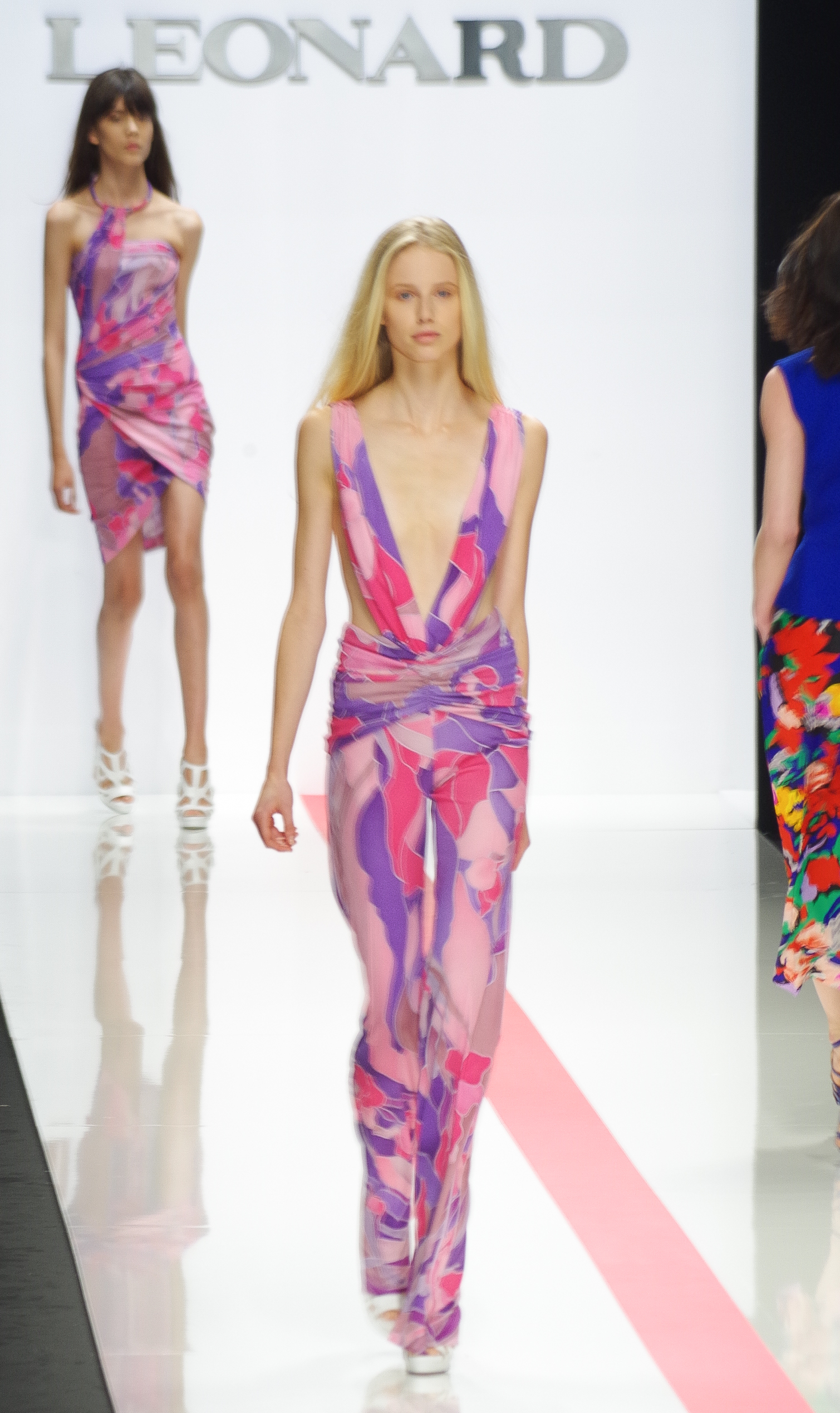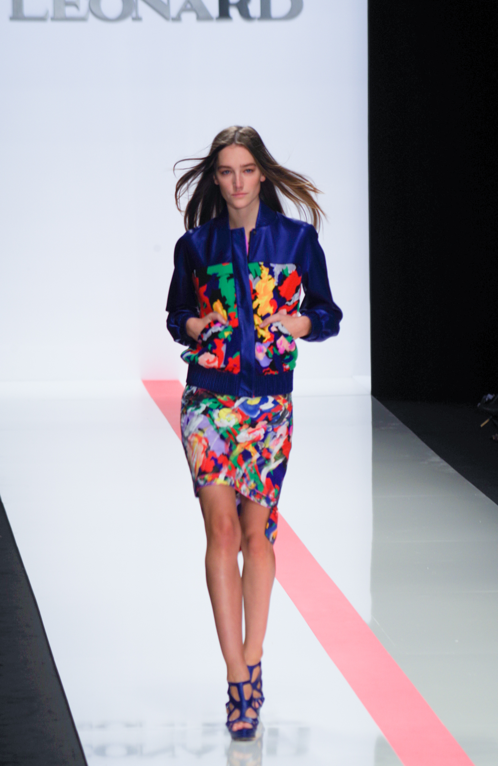 The Léonard woman of summer 2014 is sophisticated, mischievous and dynamic. She mixes elegant ease with a sportier allure. True to the house’s classics, it’s the prints that take center stage. This season’s inspiration is eighties. Urban and free, the Léonard woman combines asymmetrical skirts with a royal blue jacket and printed silk jersey, and becomes a work of art thanks to strong prints inspired by Art Nouveau and Tiffany stained glass. At night, she’s adorned in black and white with pointillist effects. It becomes sensual and feline in a tuxedo dress or bodysuit.