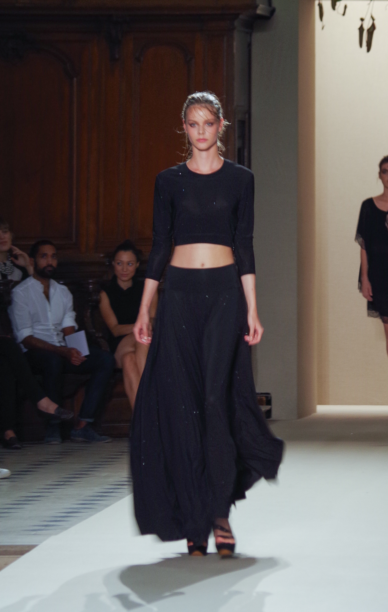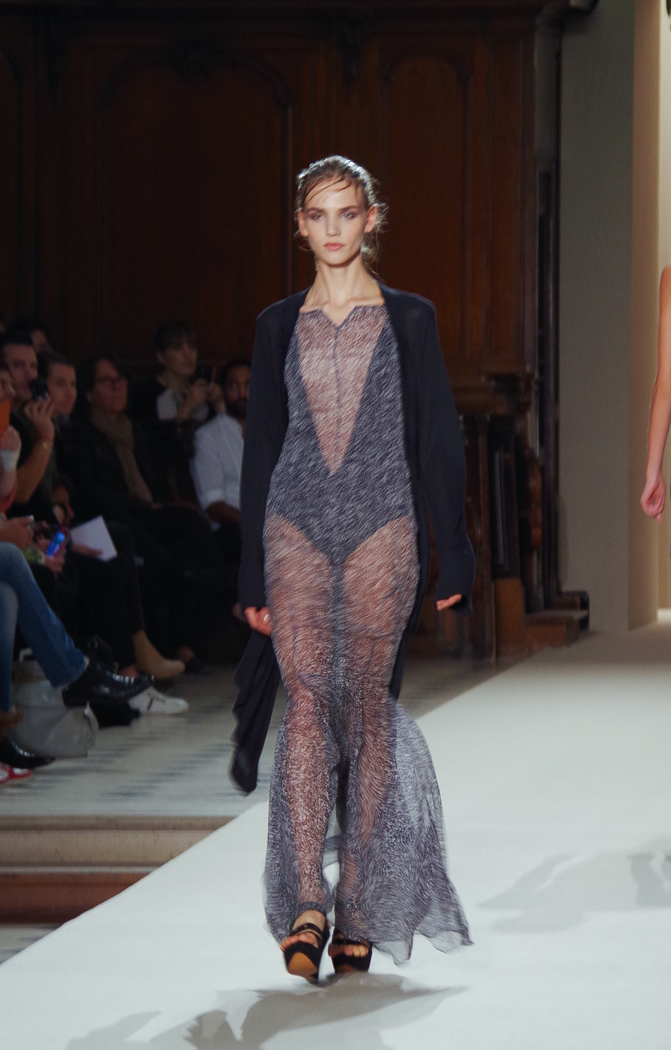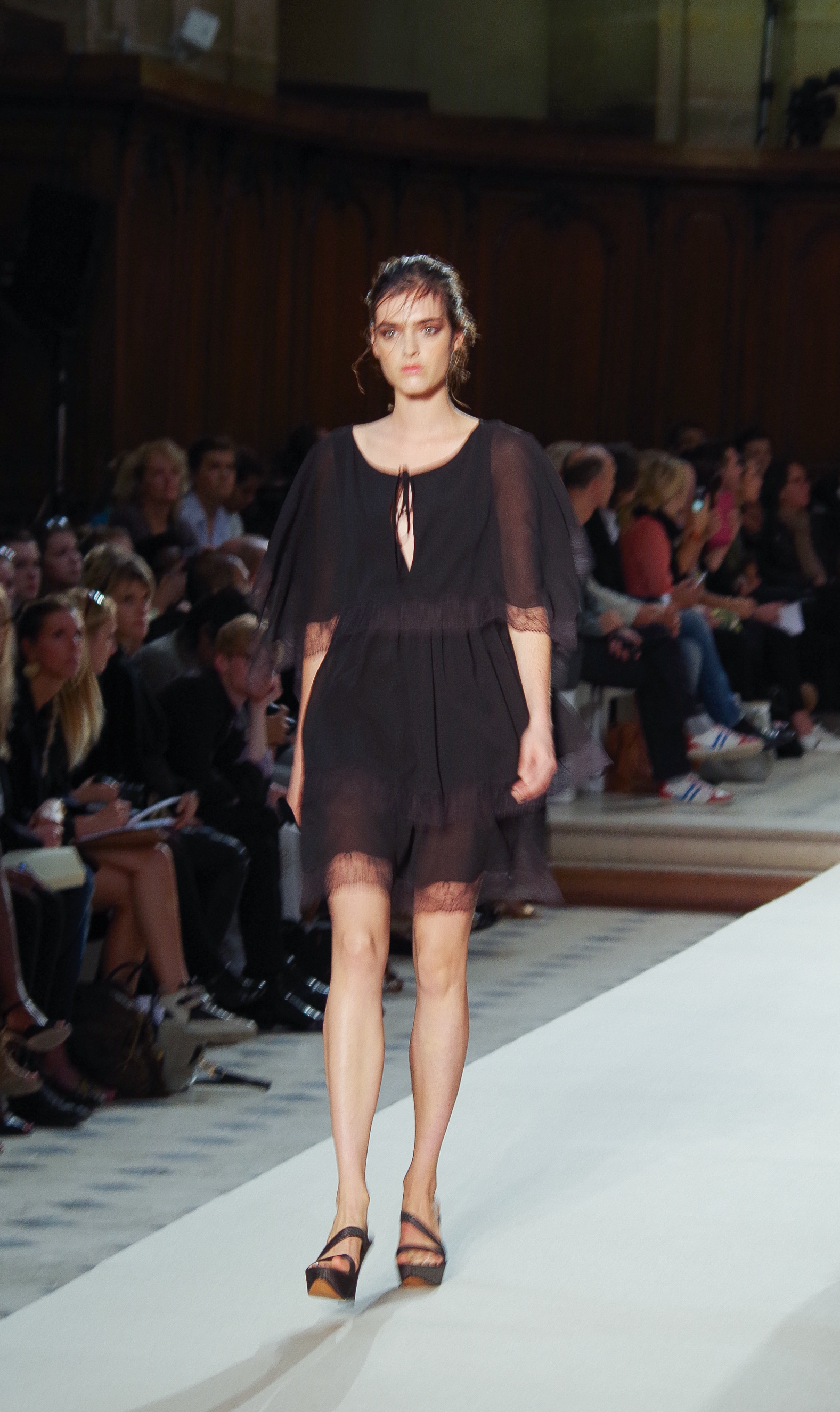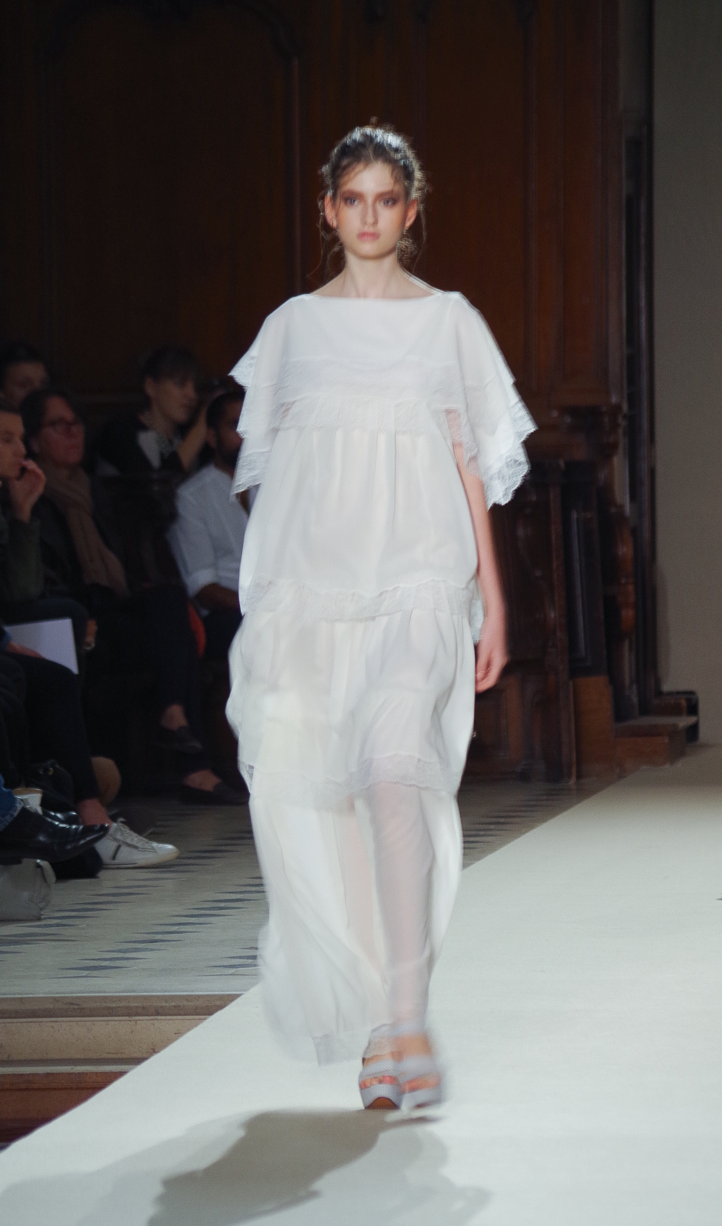 Pascal Millet presented his Spring Summer 2014 collection in Paris at the Oratoire de Paris. His collection, dark in color but sensual in material, focused on details. Millimetric cuts, fine embroidery, handkerchief dresses, short or long, light and feminine.