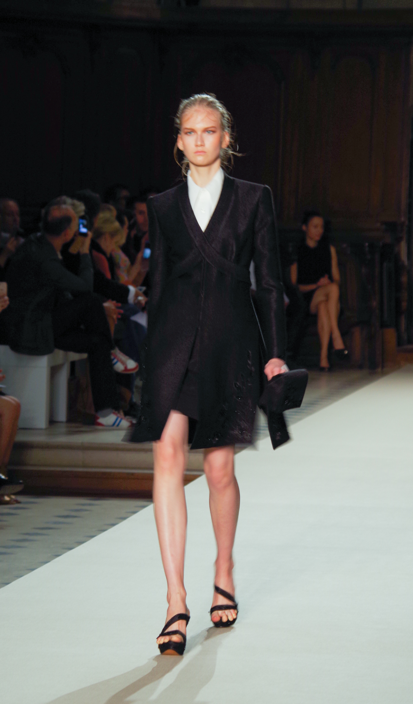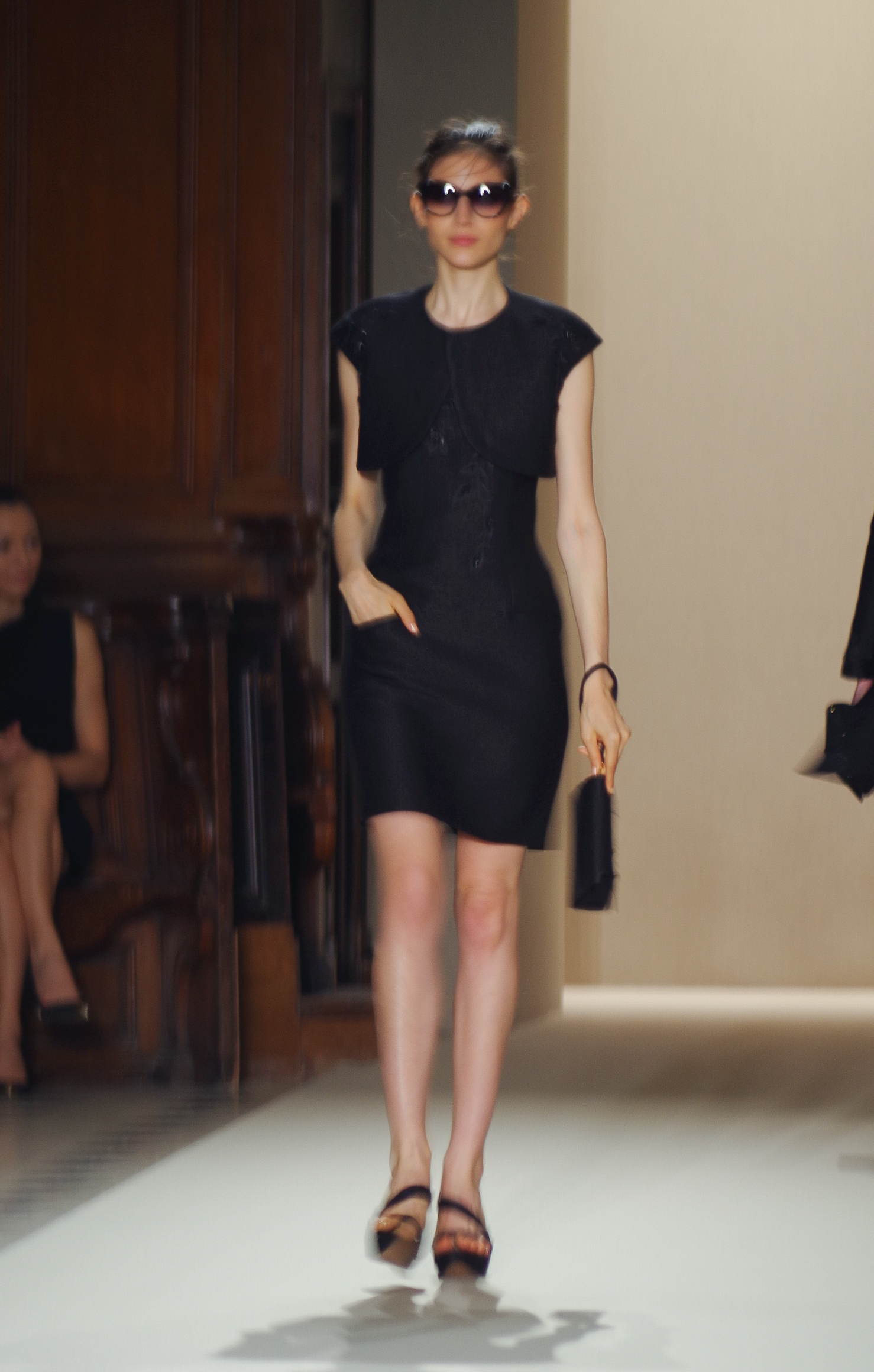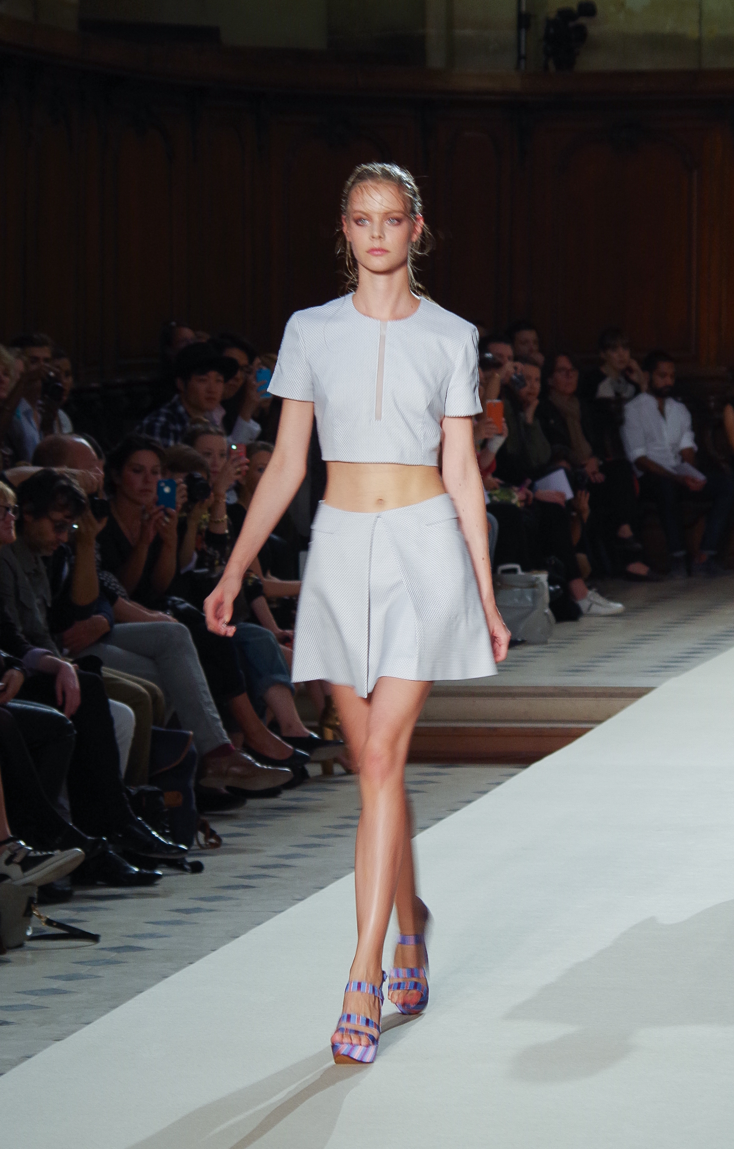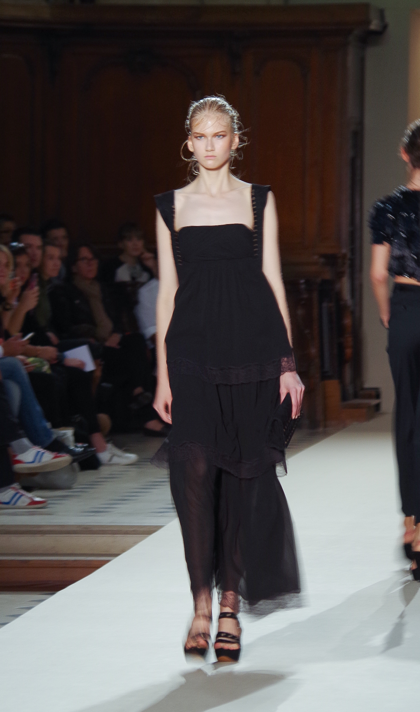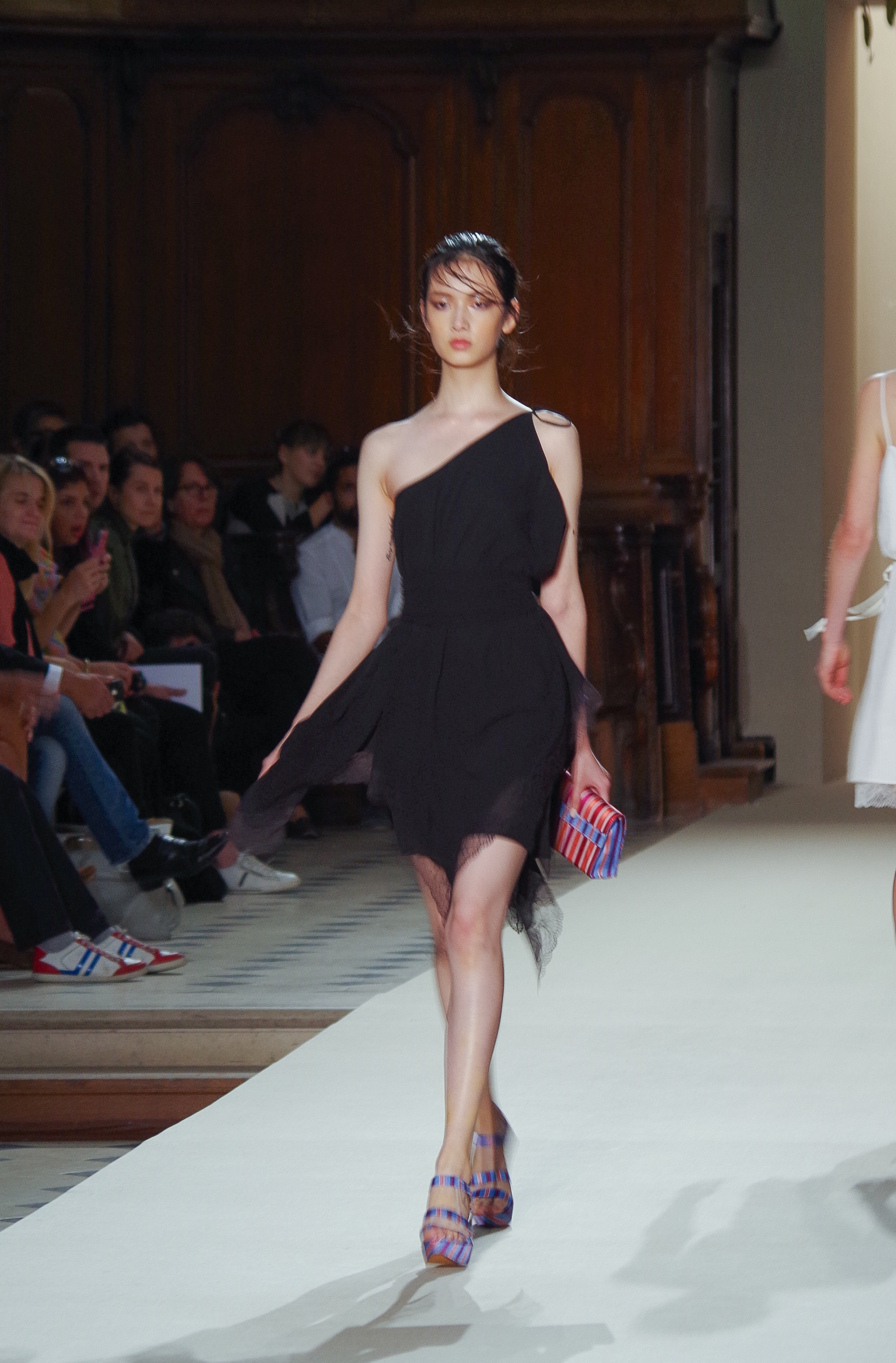Pascal Millet presented his Spring Summer 2014 collection in Paris at the Oratoire de Paris. His collection, dark in color but sensual in material, focused on details. Millimetric cuts, fine embroidery, handkerchief dresses, short or long, light and feminine.