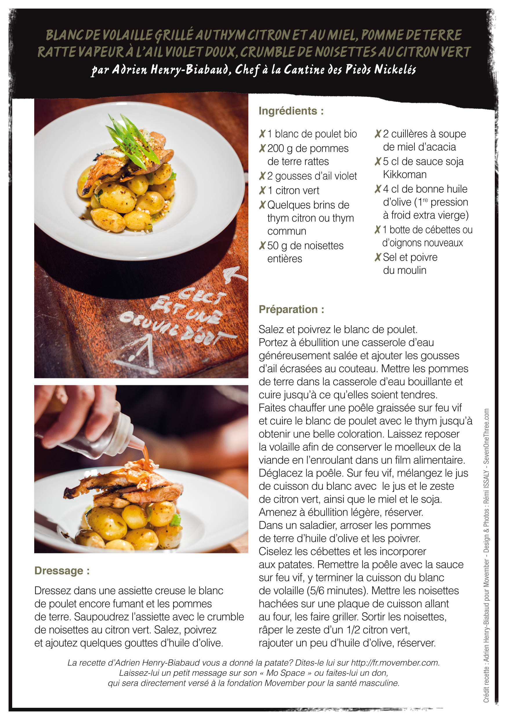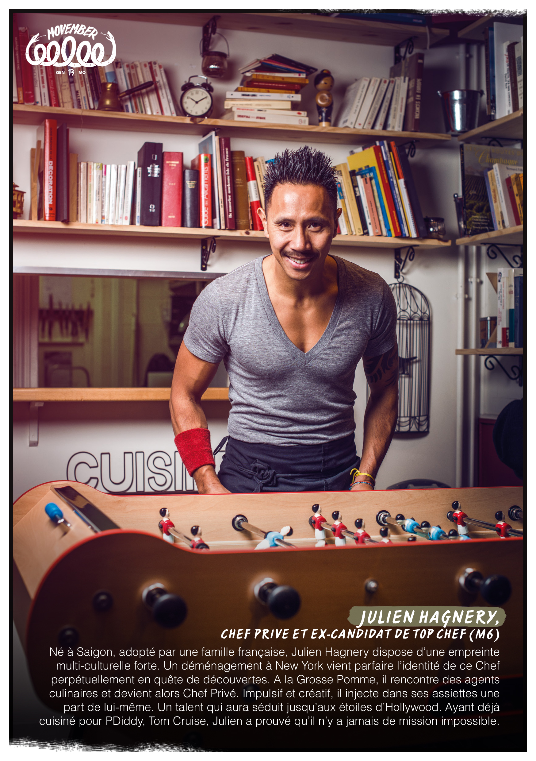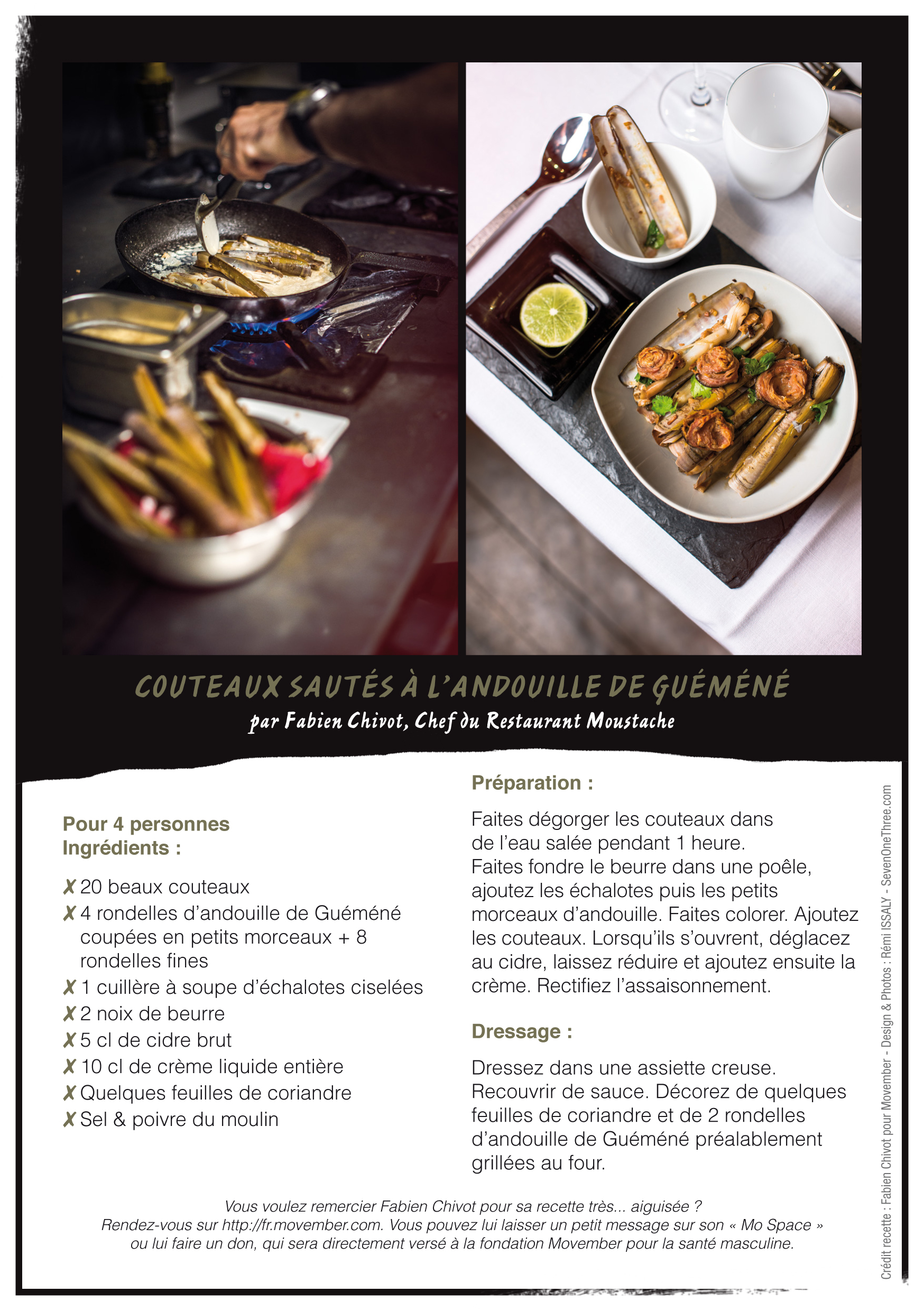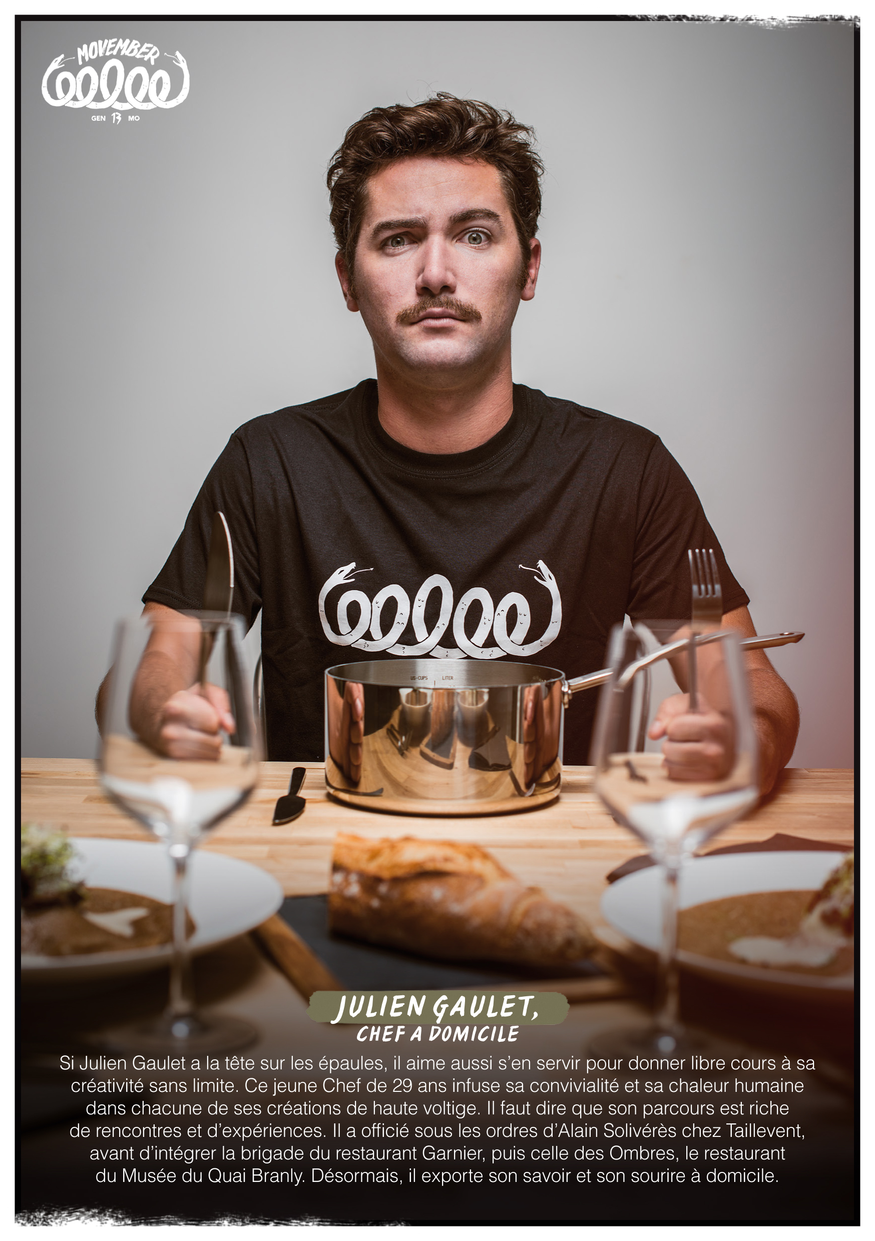 For the 13th edition of Movember, 5 chefs are getting involved: Fabien Chivot from the Parisian restaurant Moustache, Julien Hagnery, former Top Chef contestant, Thieery Bassard from the Palais de Tokyo restaurant Tokyo Eat, Julien Gaudet home chef and Adrien Nehry-Biabaud, who works at the Pieds Nickeles canteen. Movemberis also, and above all, a moment of conviviality around the moustache and men’s health. In the kitchen, chefs are on hand to provide Mo Bros and Mo Sistas with ideas for tasty dishes to share with friends and family. And what better way to work up an appetite and loosen tongues than with a good Mo Bro recipe. Mo Bros, Mo Sistas, Sunday cooks or experienced restaurateurs, get your spatulas ready! It’s the perfect opportunity to issue dinner invitations and get down to business, breaking down the taboos surrounding men’s health. In addition to the recipes from Movember‘s Chefs Ambassadors, everyone is free to create their own recipes and send them to Movember via www.facebook.com/MovemberFrance. The most inventive and tasty will be published on the Facebook page and rewarded with invitations to the Gala Parté on Saturday November 30, the official closing evening of Movember 2013.