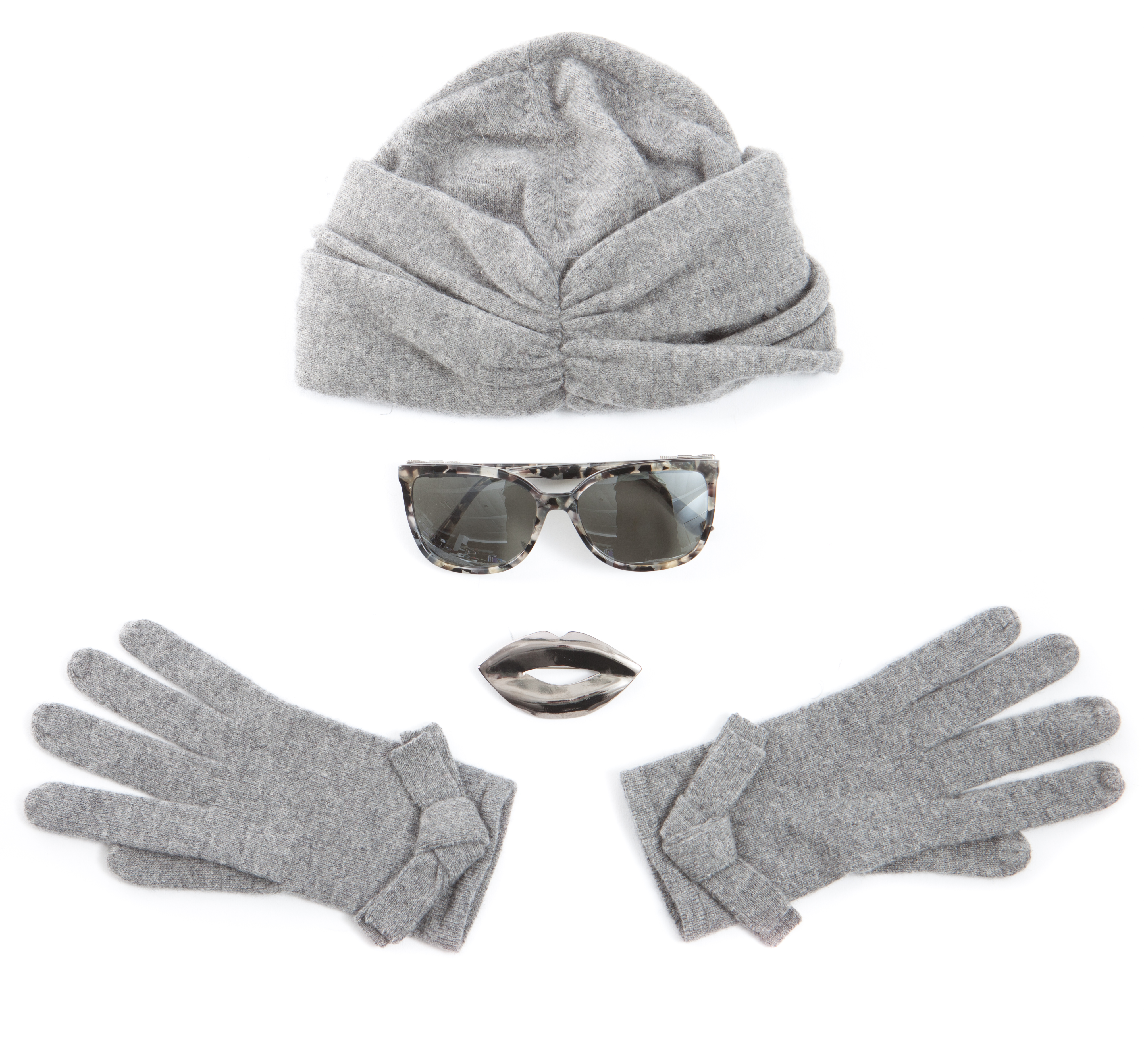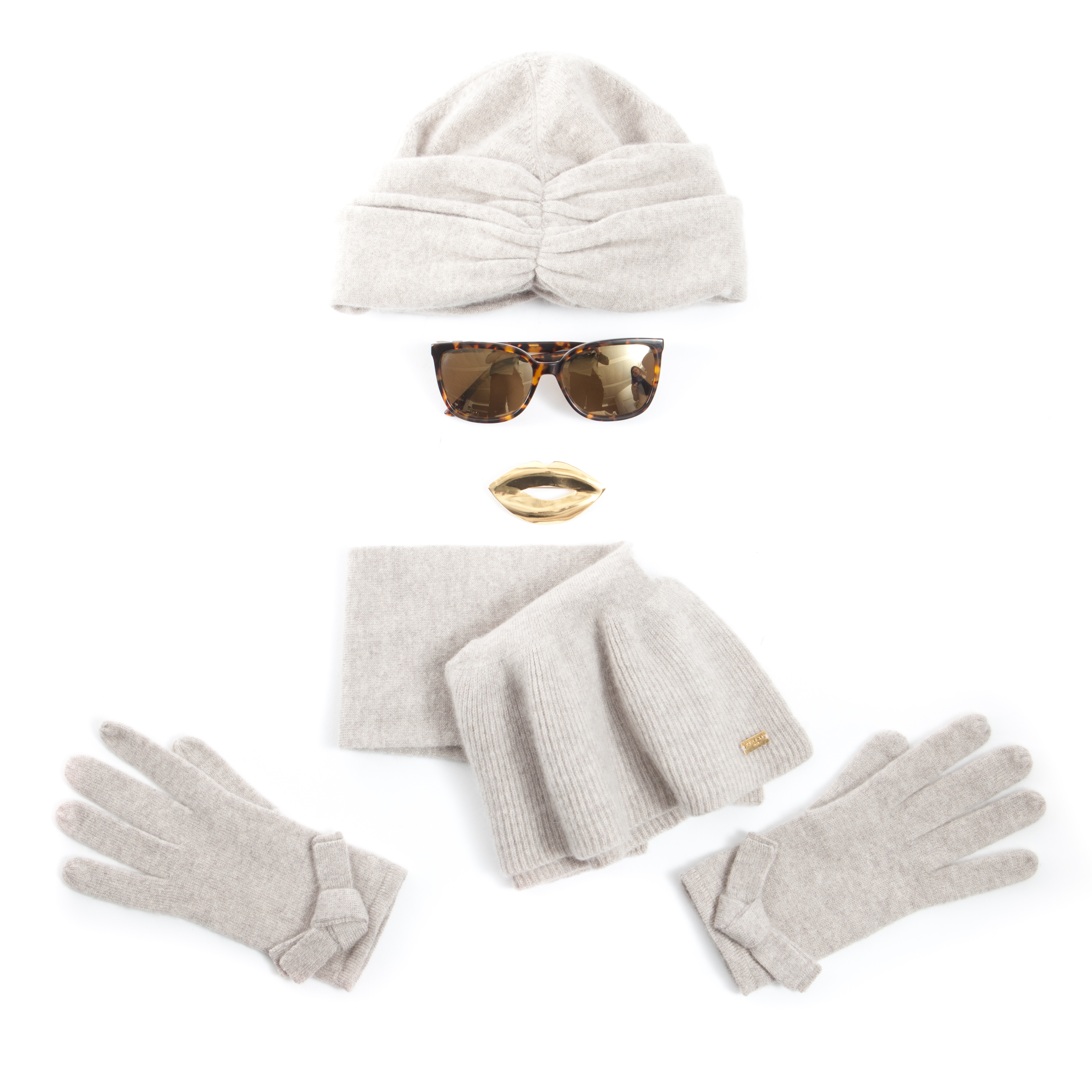 We present the perfect “equipment” to face winter in trendy style, with accessories you need to buy urgently: a cashmere turban hat in grey and beige with a scarf and gloves, “mirror” sunglasses, and the famous metal “mouth” brooch to hang on all your coats.