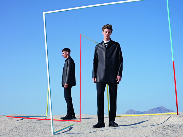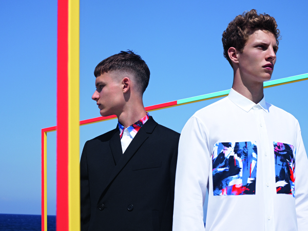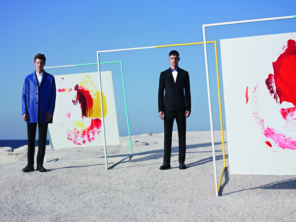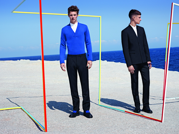 For this new spring-summer 2014 collection, Dior artistic director Kris Van Assche drew his inspiration from an old English classic poem “Follow Thy Fair Sun” by Thomas Campion, and more specifically from this line “The sun must have his shade” / “Le soleil doit avoir sa part d’ombre” / “The sun must have its share of shade” and so must men. A collection cradled by this prose and more generally by the distinctive aesthetic of the 80s, a decade that saw the advent of sportswear. These creations also feature inspired by the famous Mondrian rectangles so dear to fashion.