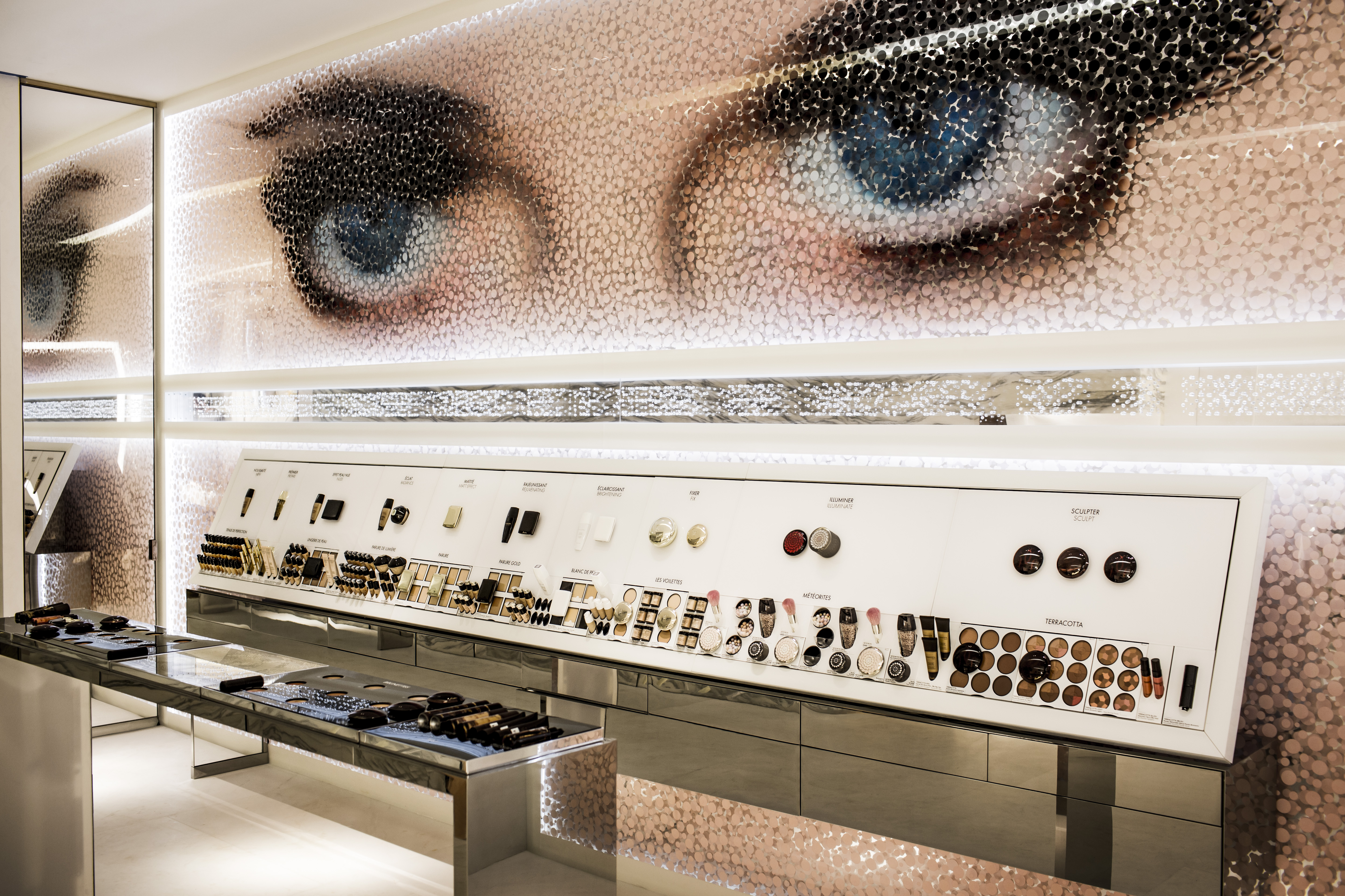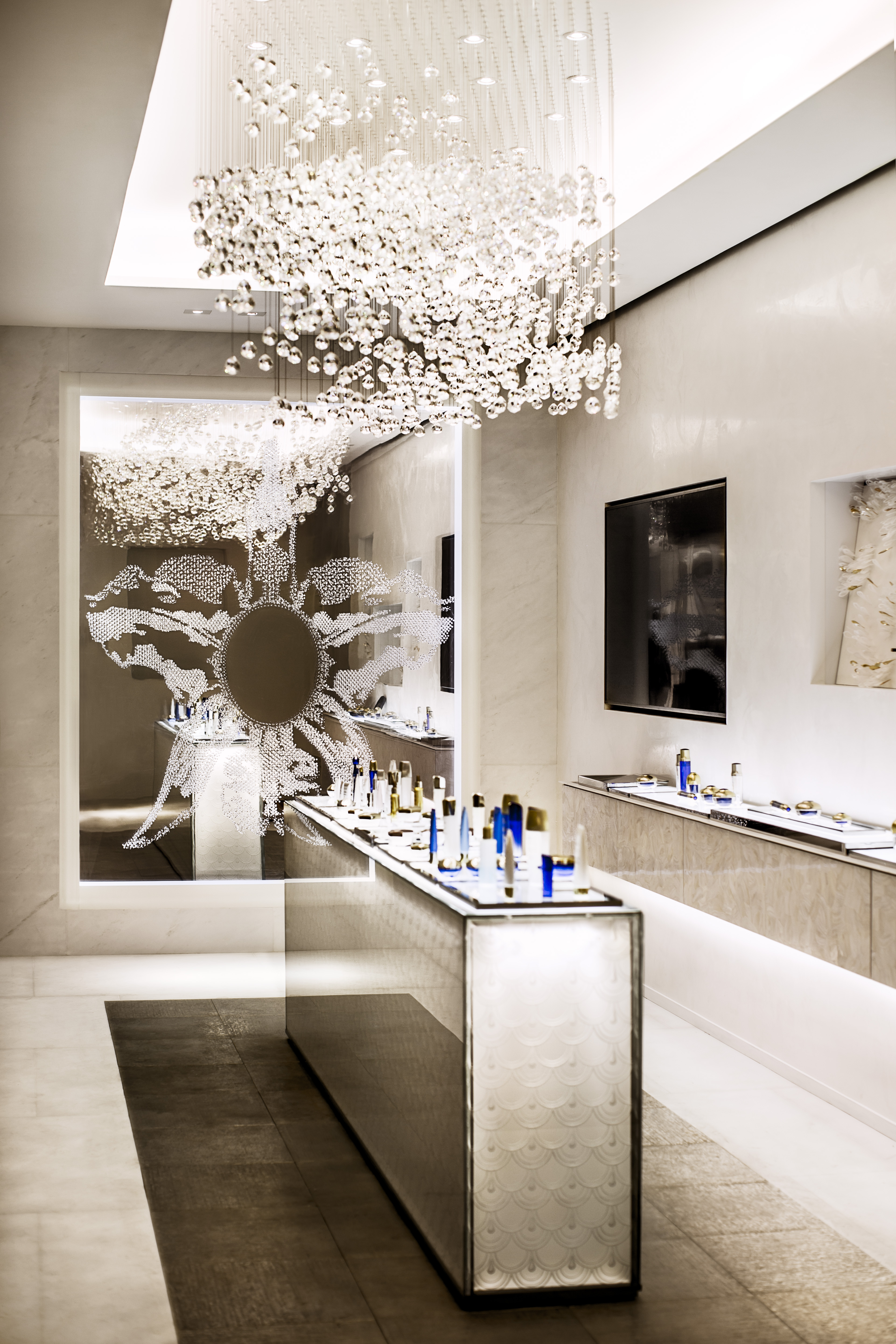 In a large white marble entrance overlooking the Champs Elysées, a seven-meter-high skylight has been designed to showcase an installation of golden bees designed by artist Gérard Cholot, le Vol des Abeilles. Visitors to this new space are greeted by the symbol of Guerlain, the bee that has been part of the House’s history since 1853.
