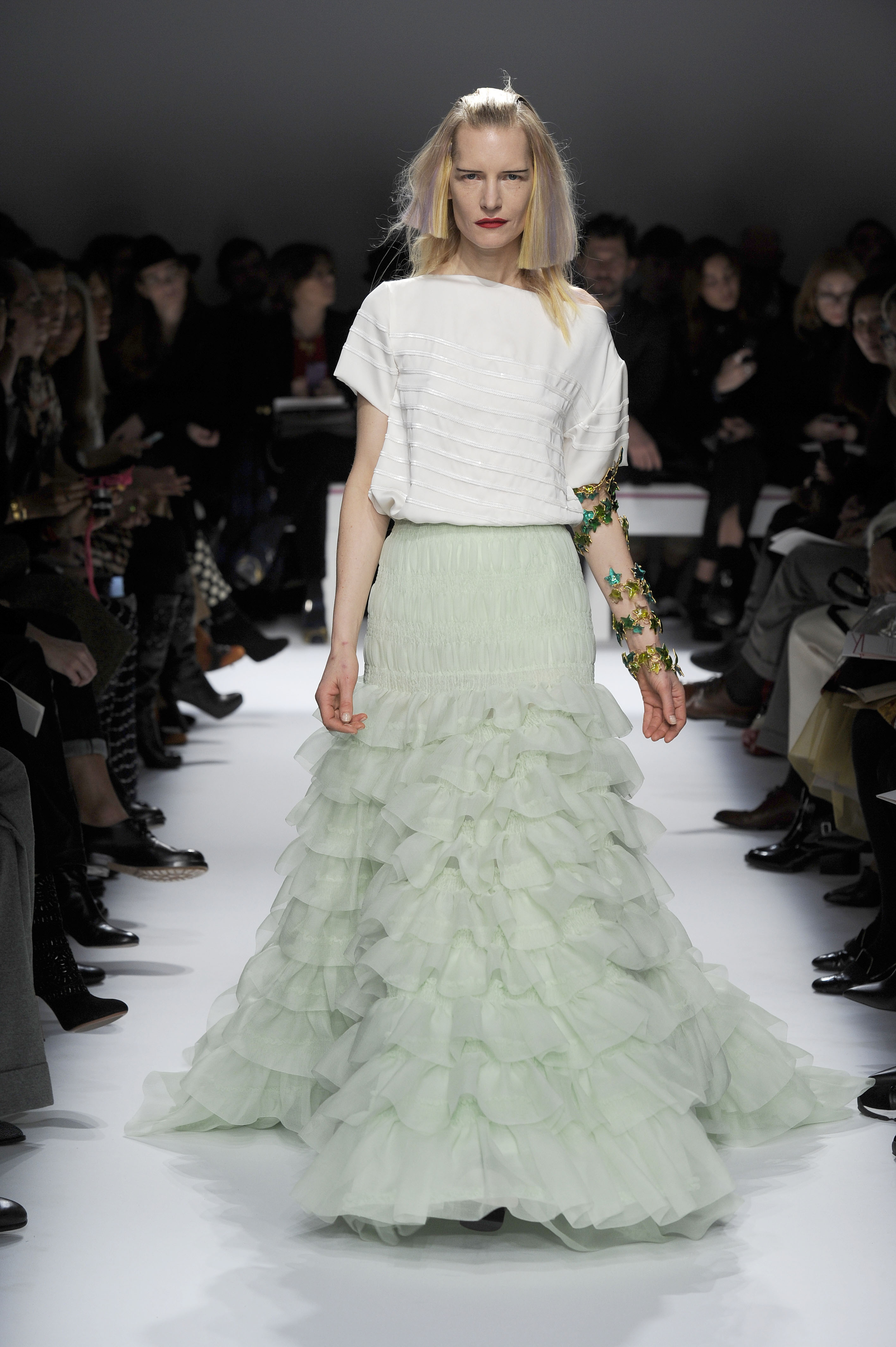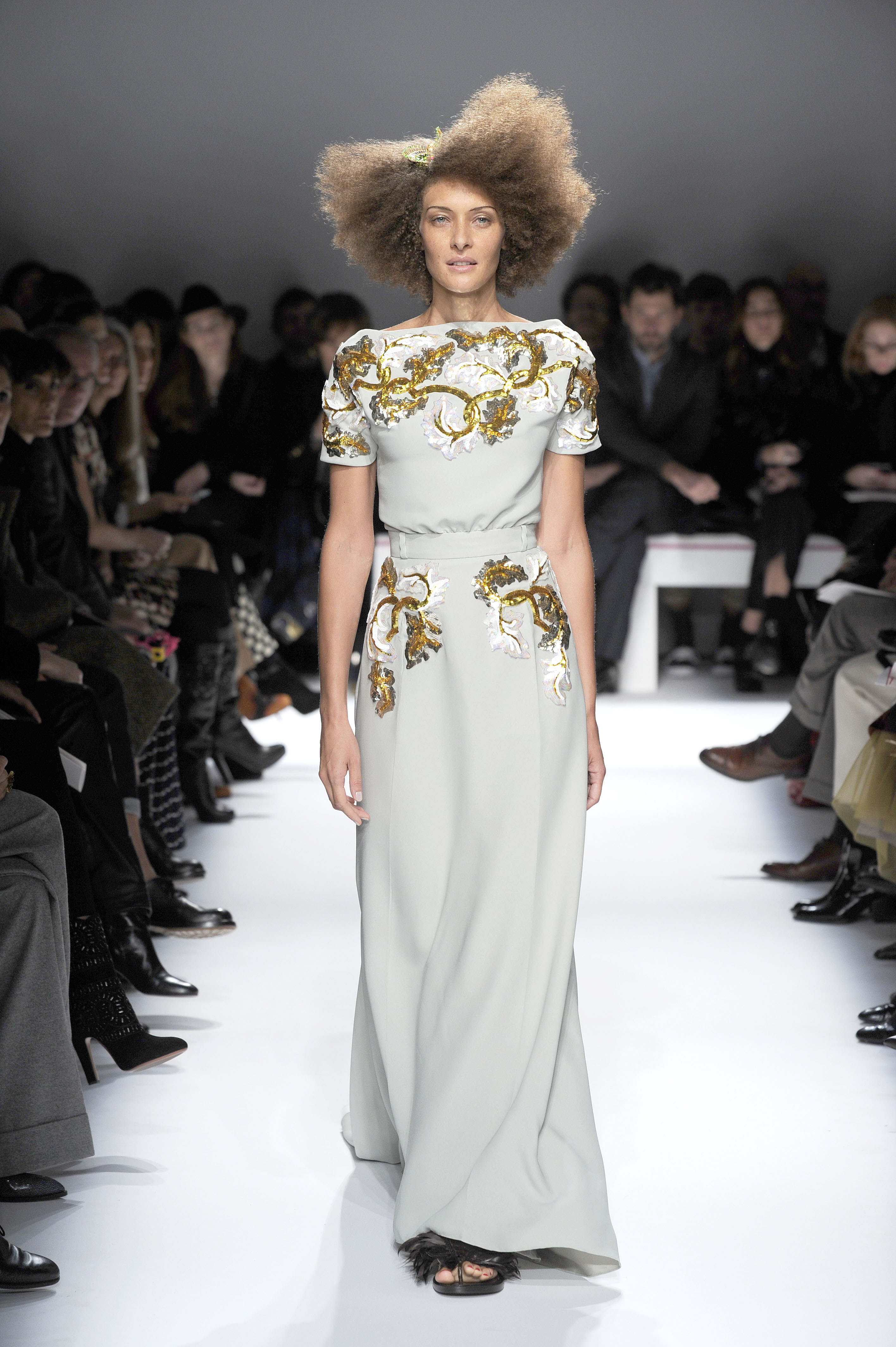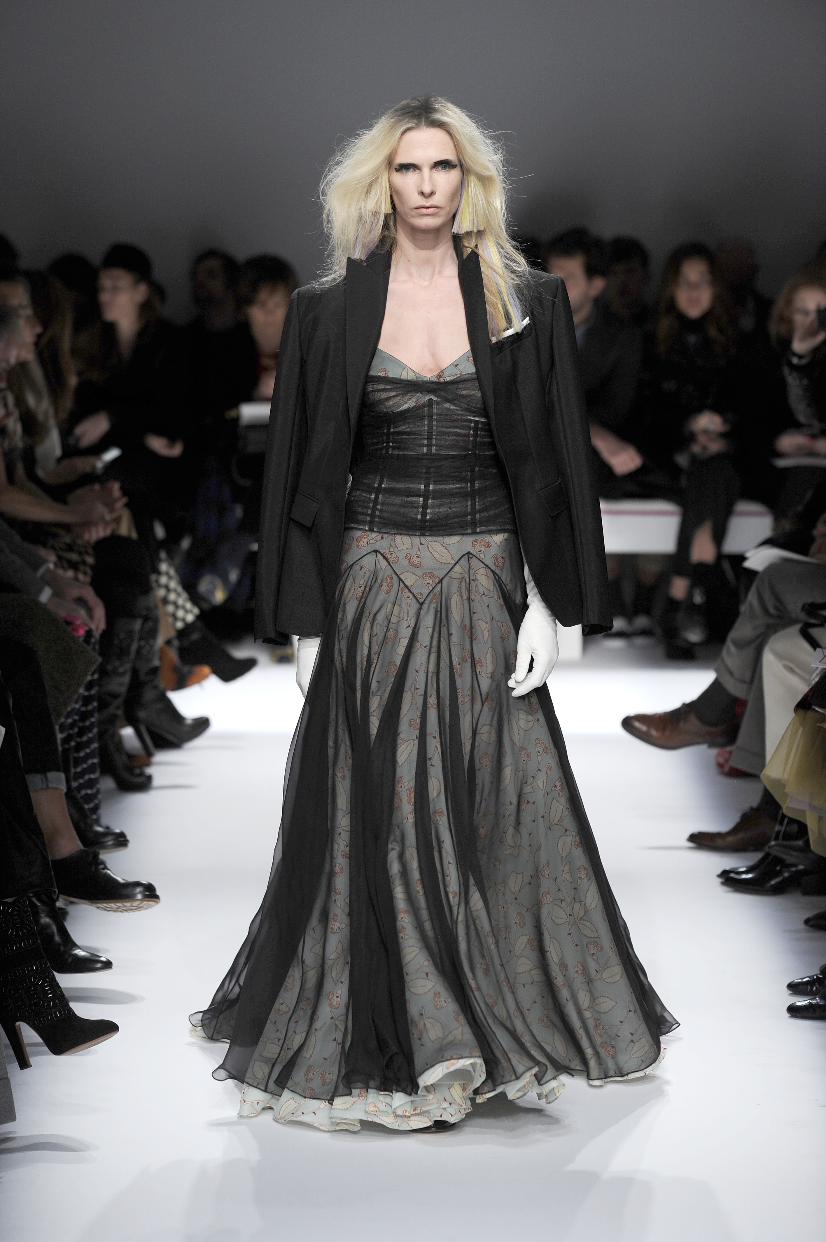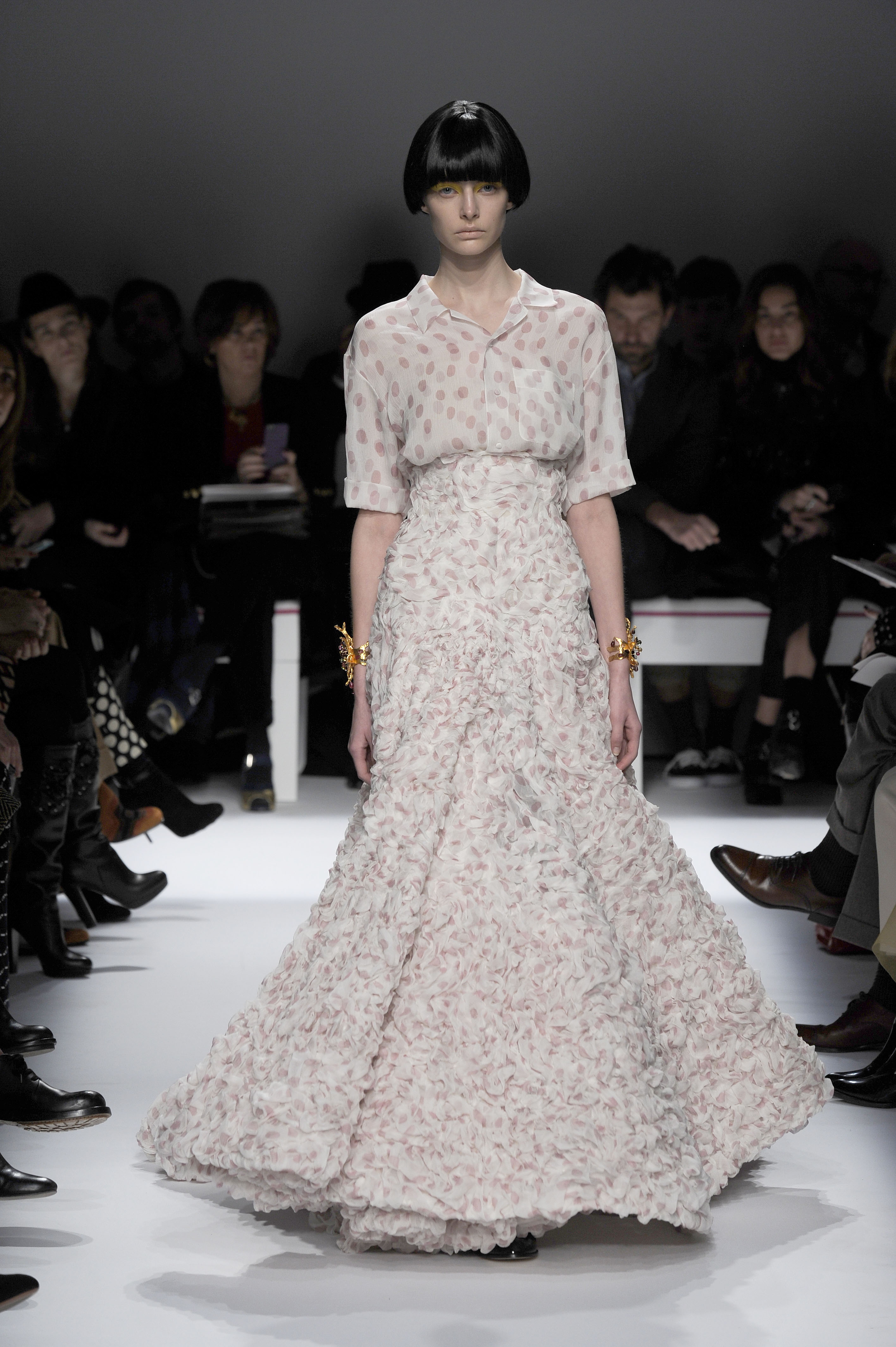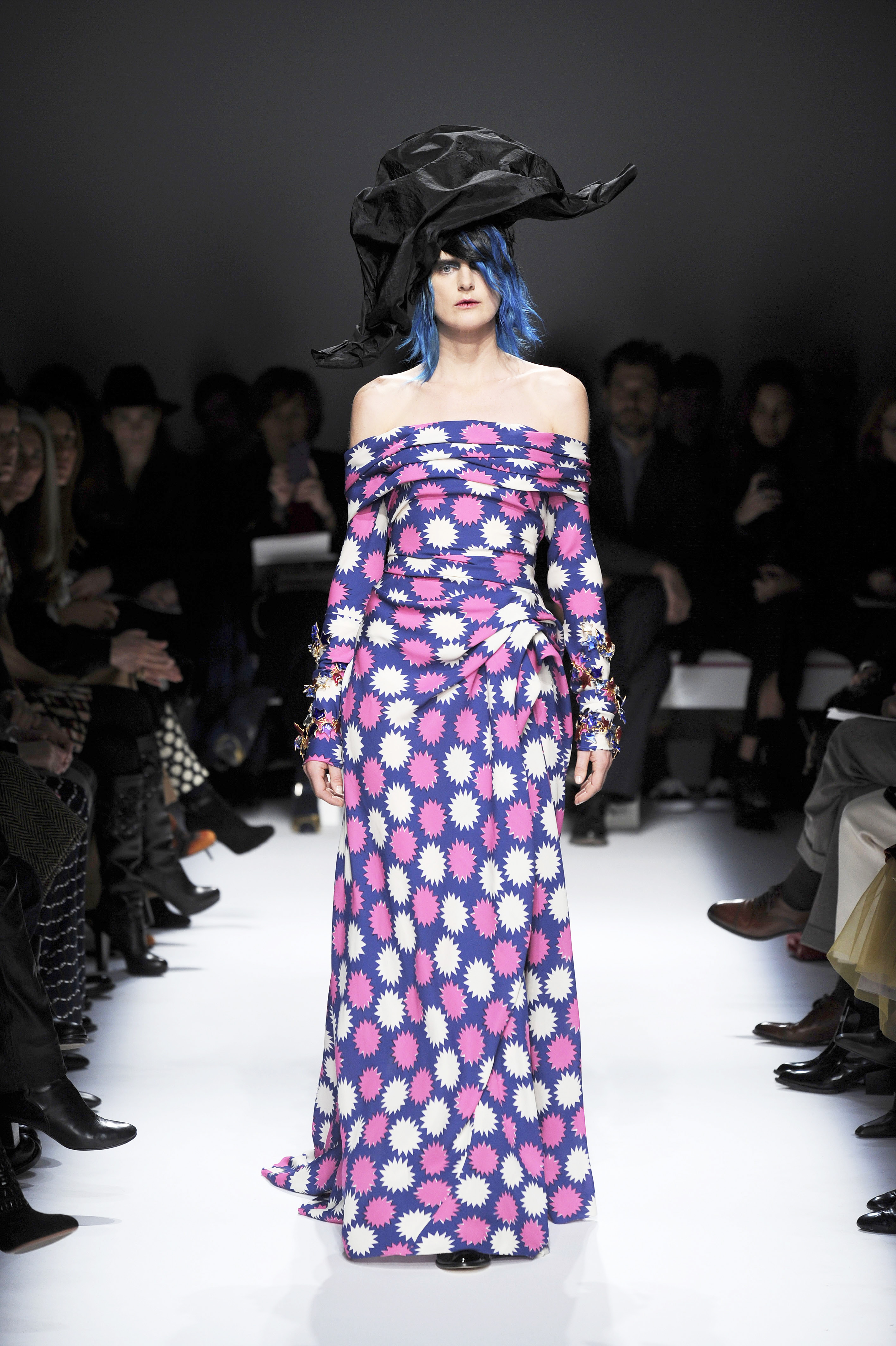 After a 60-year absence, La Maison Elsa Schiaparelli, returns with a splendid runway show for Paris Fashion Week on Monday, January 20. A revival of the brand with the presentation of the Spring-Summer 2014 collection. The creations celebrate today’s woman with exalting silhouettes, a renewed femininity. A highly original collection. There are lots of hand-painted prints, large motifs, embroidery and bright colors contrasted with neutral and pastel tones. Many creations play on the masculine/feminine card. Designed by Marco Zanini.
