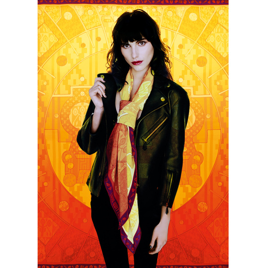 Borrowing his name from the Inca sun god, INTI draws his inspiration from Andean culture. The Chilean-born artist decided to revisit Louis Vuitton’s emblematic giant silk square. He adorns it with a sun, a motif that refers to deities from the Inca pantheon. The designer uses warm, golden and orange hues. This street artist has already exhibited in galleries around the world. He is known for his pronounced taste for color and his use of iconographic symbols from all over South America.