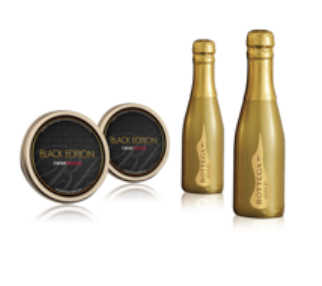 The Gold duo consists of 2 x 20G tins of BLACK EDITION caviar: with its very mild taste and delicious hazelnut flavor. It rivals the best caviars in the world and is already winning over the most discerning connoisseurs; 2 x 20cl bottles of Bottega Gold (Italian Procecco) and 2 mother-of-pearl spoons.