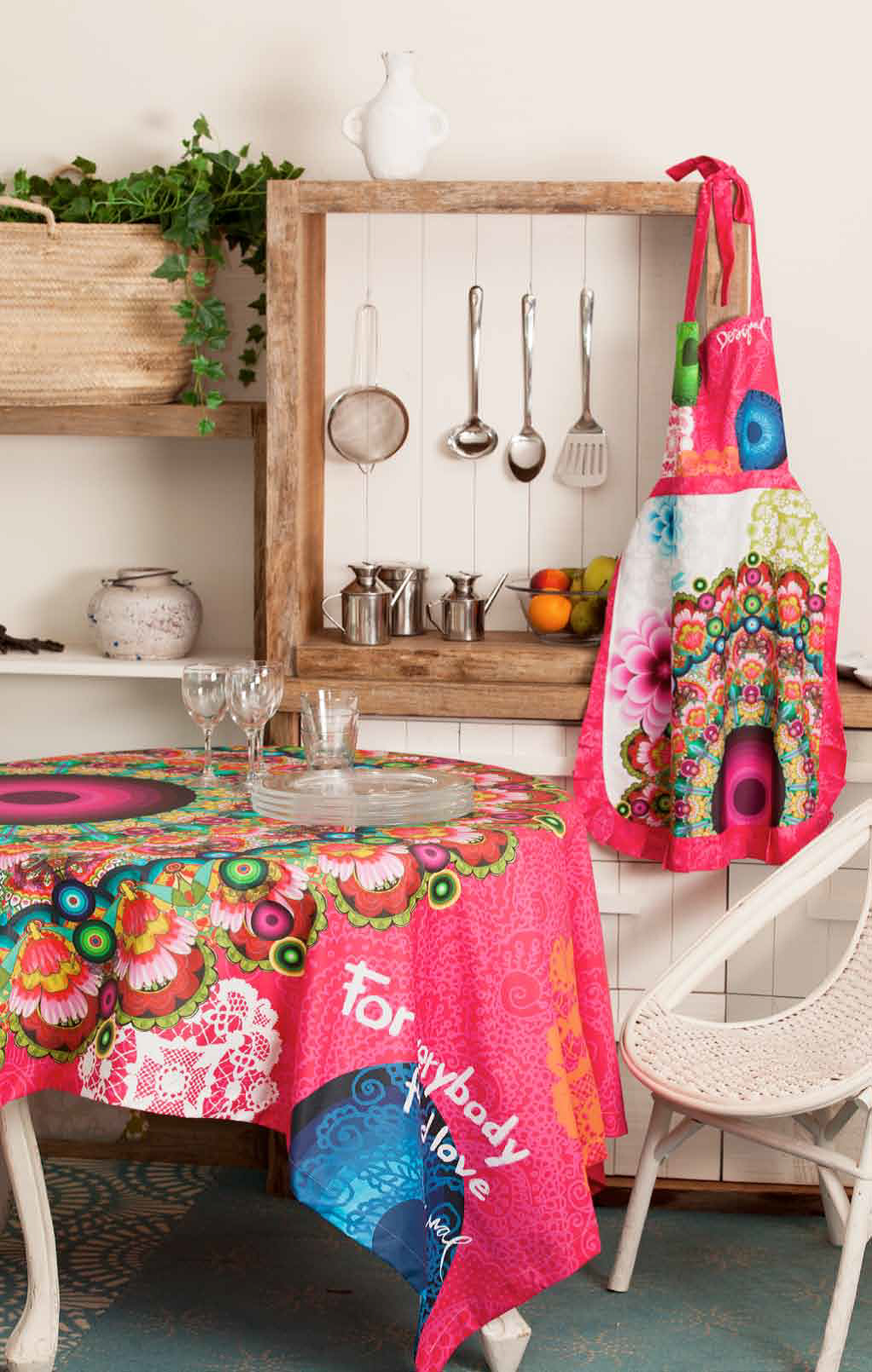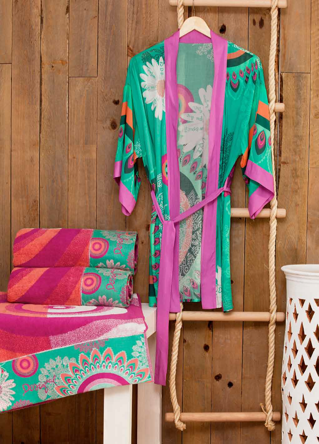 The colors and patterns of the bedding collection are echoed in the bathroom and kitchen lines. Design and colors are coordinated to promote unity in the home. Desigual offers towels and bathrobes for the bathroom. They are made from high-quality (550g), highly absorbent terry cloth and cotton jacquard fabric. For the kitchen, there are table runners, potholders and aprons.