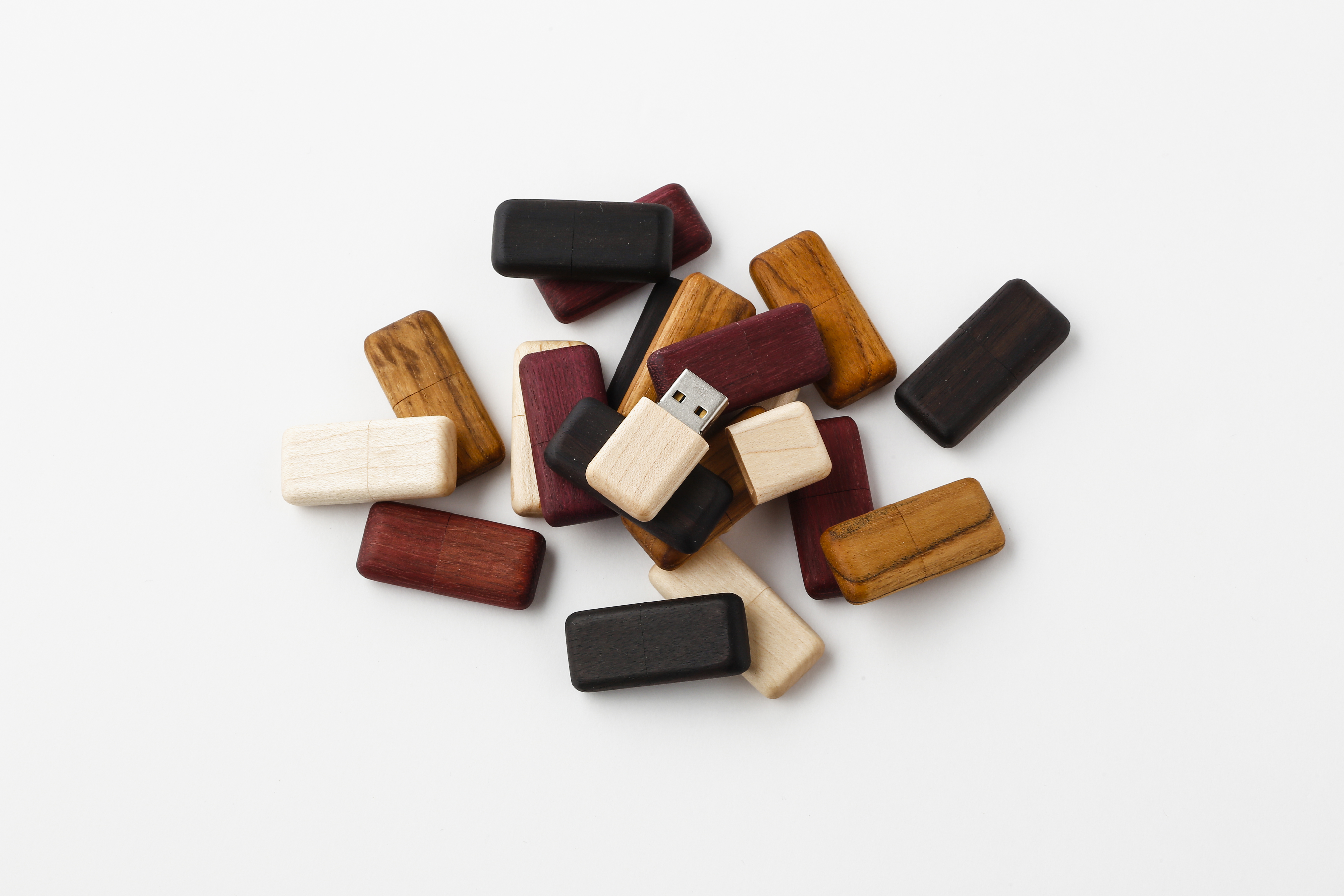 First of all, USB flash drives with 8 gigabytes of memory, encased in wood. A sleek design and unfailing practicality.