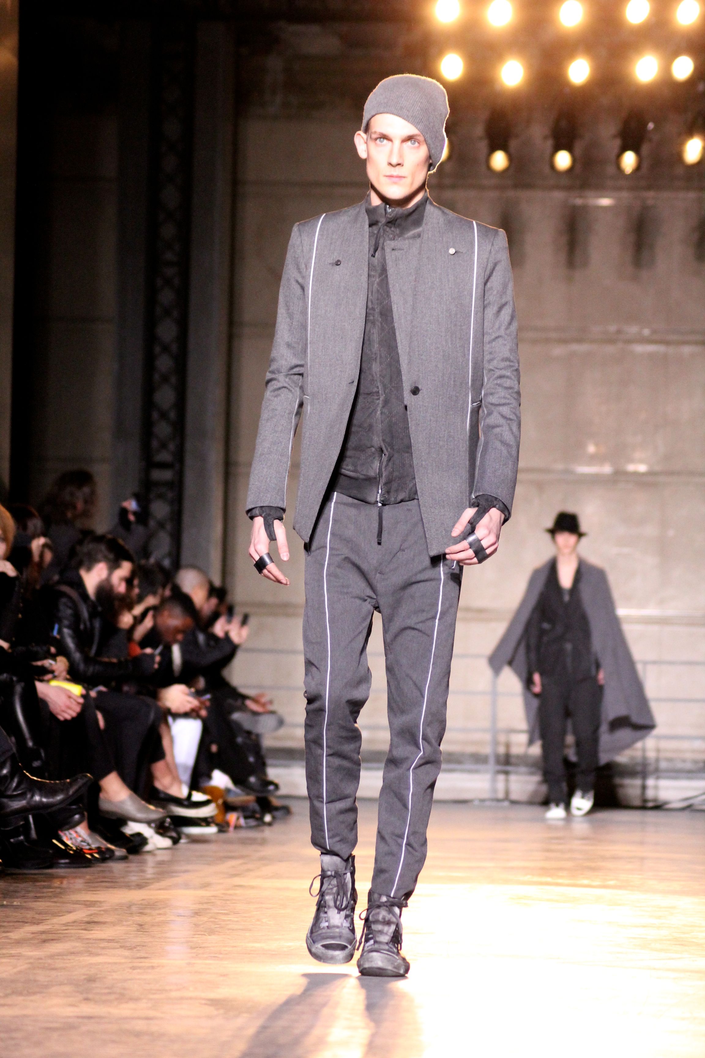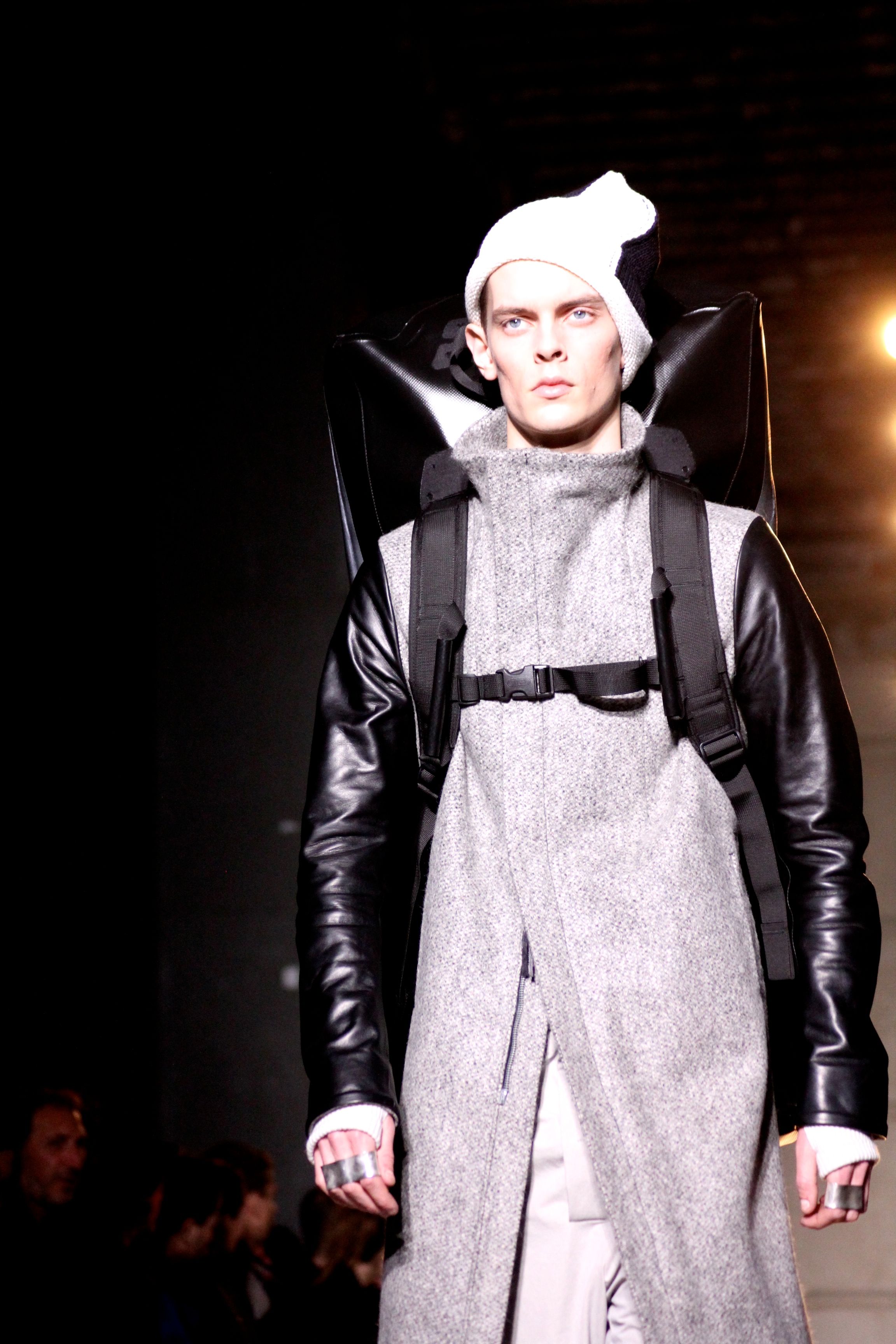 Playing with shades of gray, off-white and black, Boris Bidjan Saberi’s collection is definitely urban. The silhouettes are sporty, accessorized with XXL bags, hats or Panama hats.