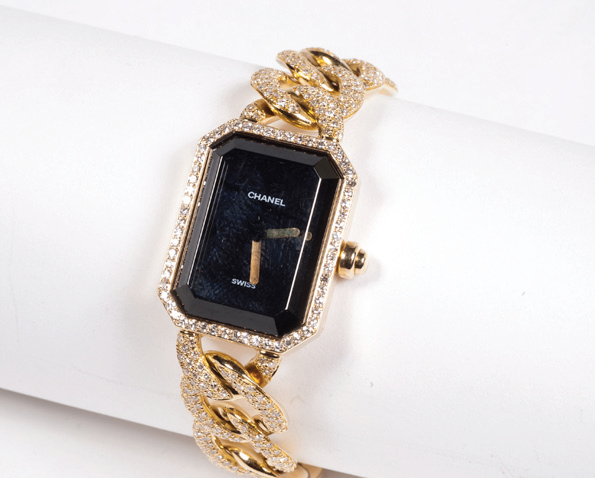 You will be able to admire and bid on the Haute Couture circa 1956-1960 (black wool jersey dinner dress accessorized with a removable ecru silk collar highlighted by a simple bow) estimated at 800€ to 1000€, the 2.55 bag (red quilted jersey bag, gilded metal chain and clasp) estimated between €1,600 and €1,700, or the Première watch (yellow gold watch, black dial, beveled glass, quartz movement, links, bezel and clasp entirely paved with diamonds) estimated between €17,000 and €19,000.