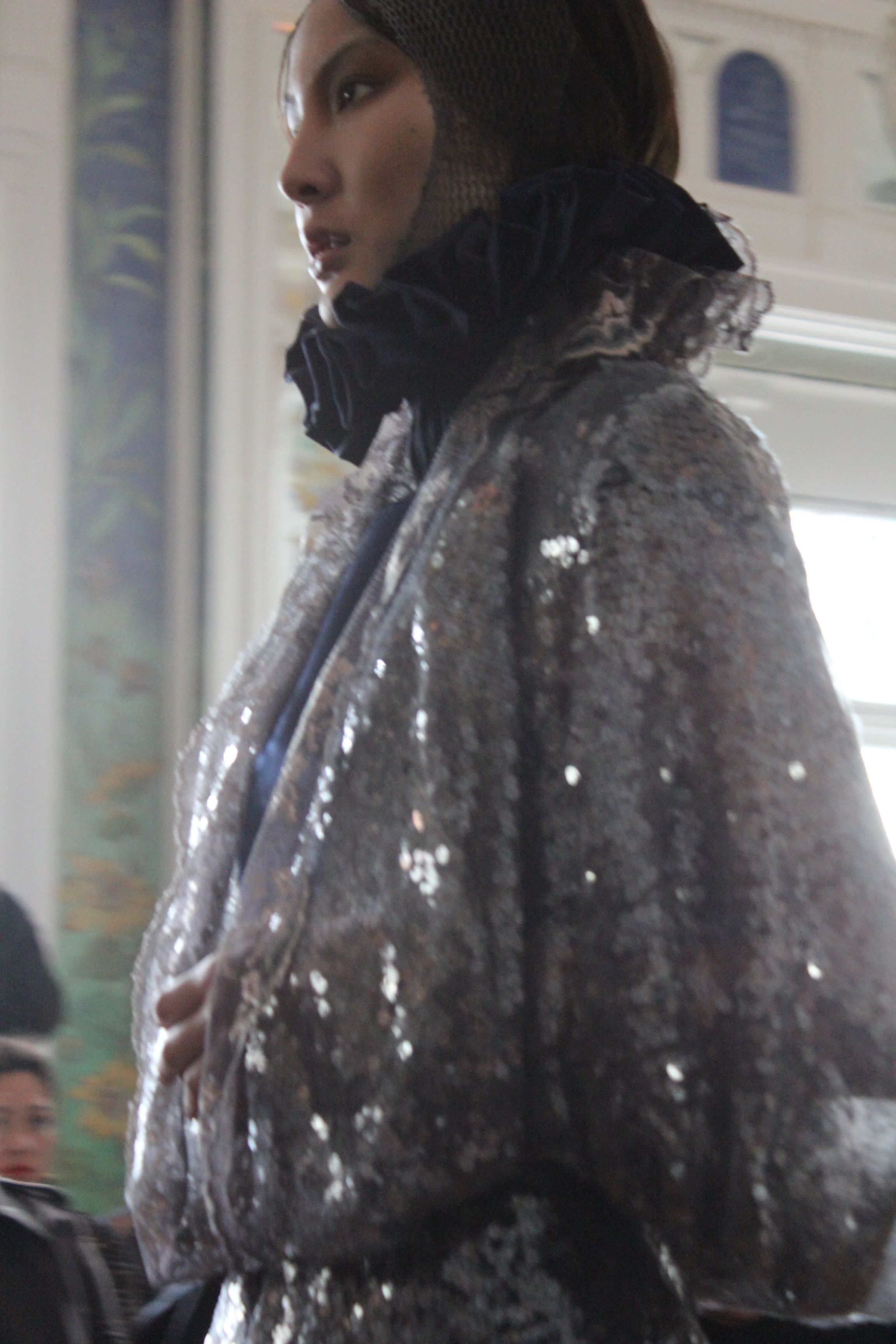 Corrie Nielsen, an American designer invited by the Fédération Française de la couture du prêt à porter, presented her collection in Paris after several years in London. Called the “Cradle of Humanity”, the collection was inspired by myths such as Dracula. This collection, with its dark tones, is nevertheless surprising and spectacular, so original and architectural are the silhouettes.