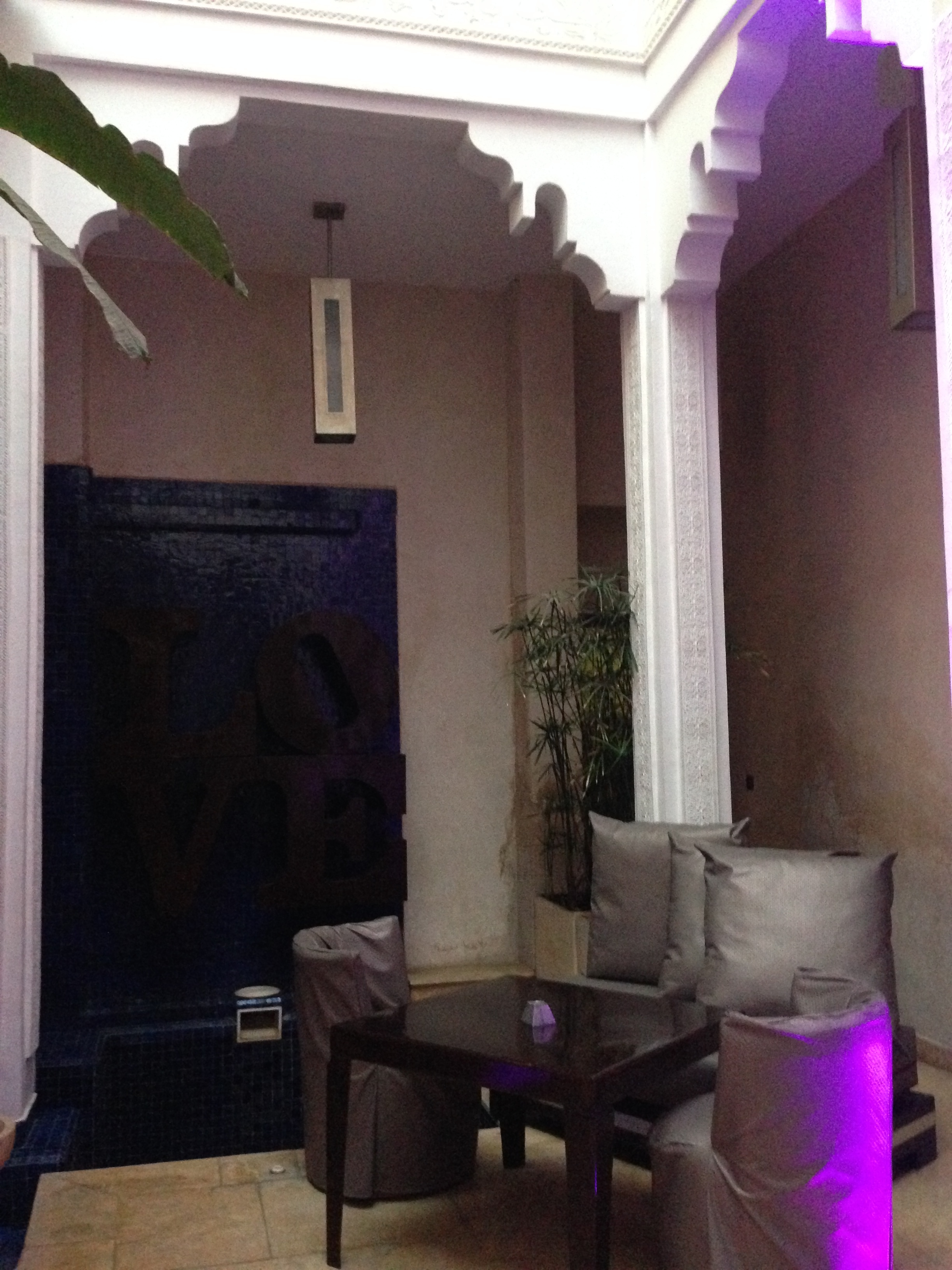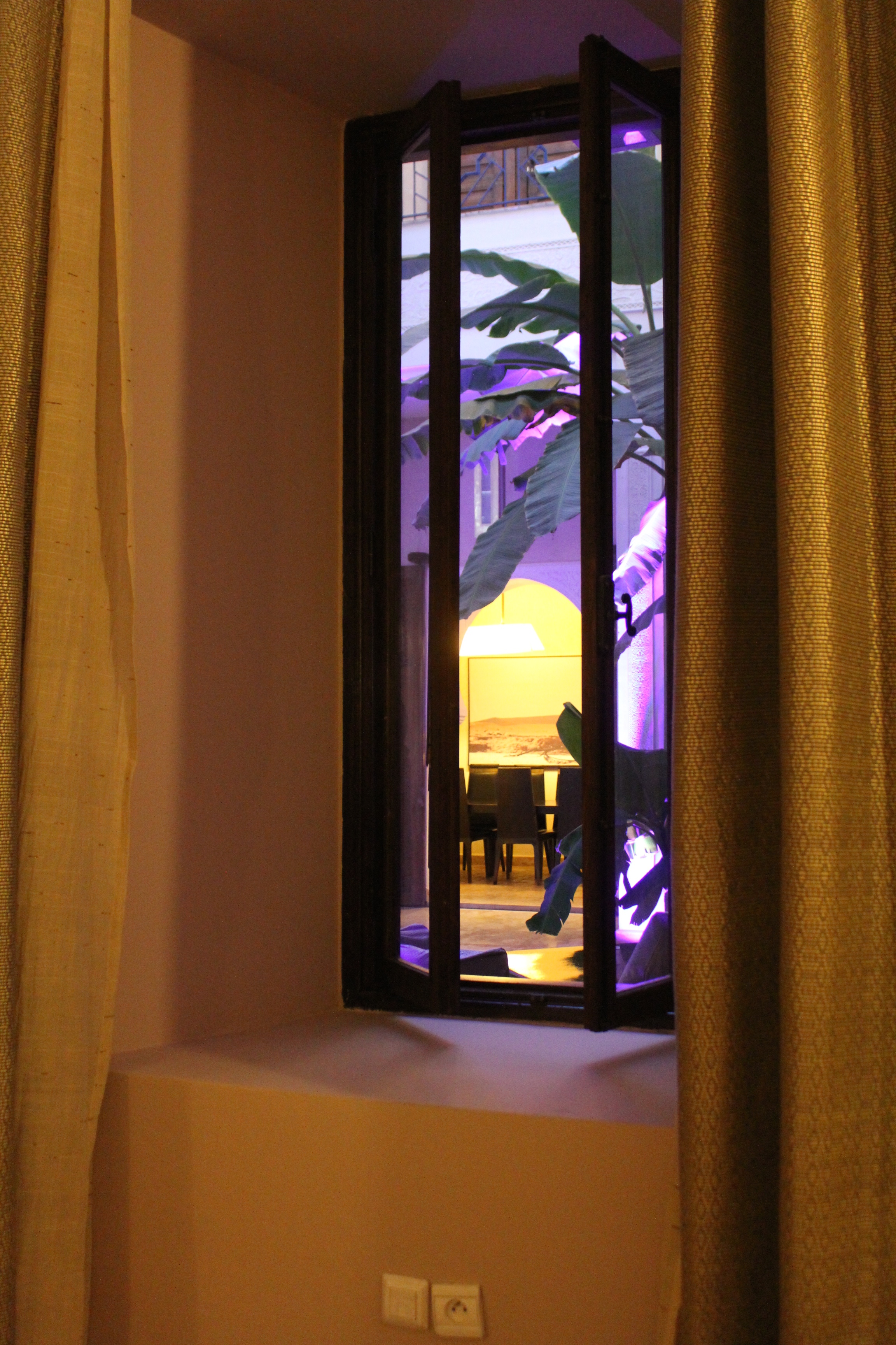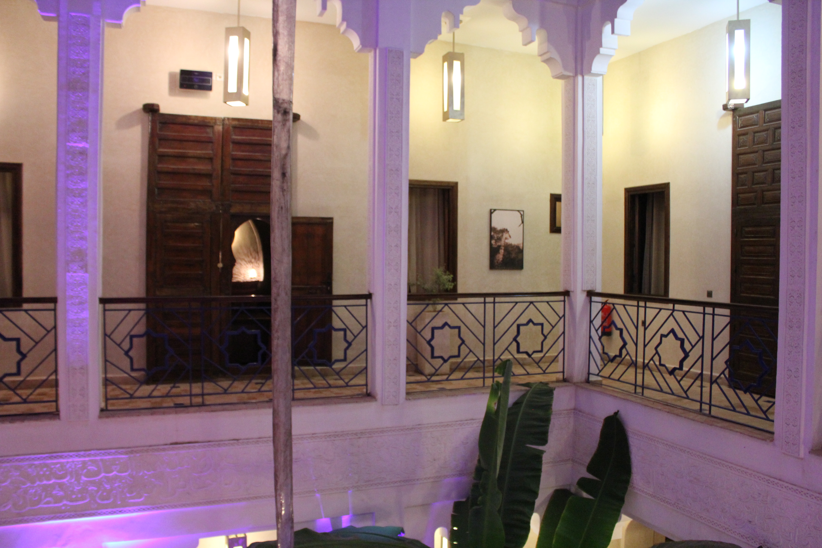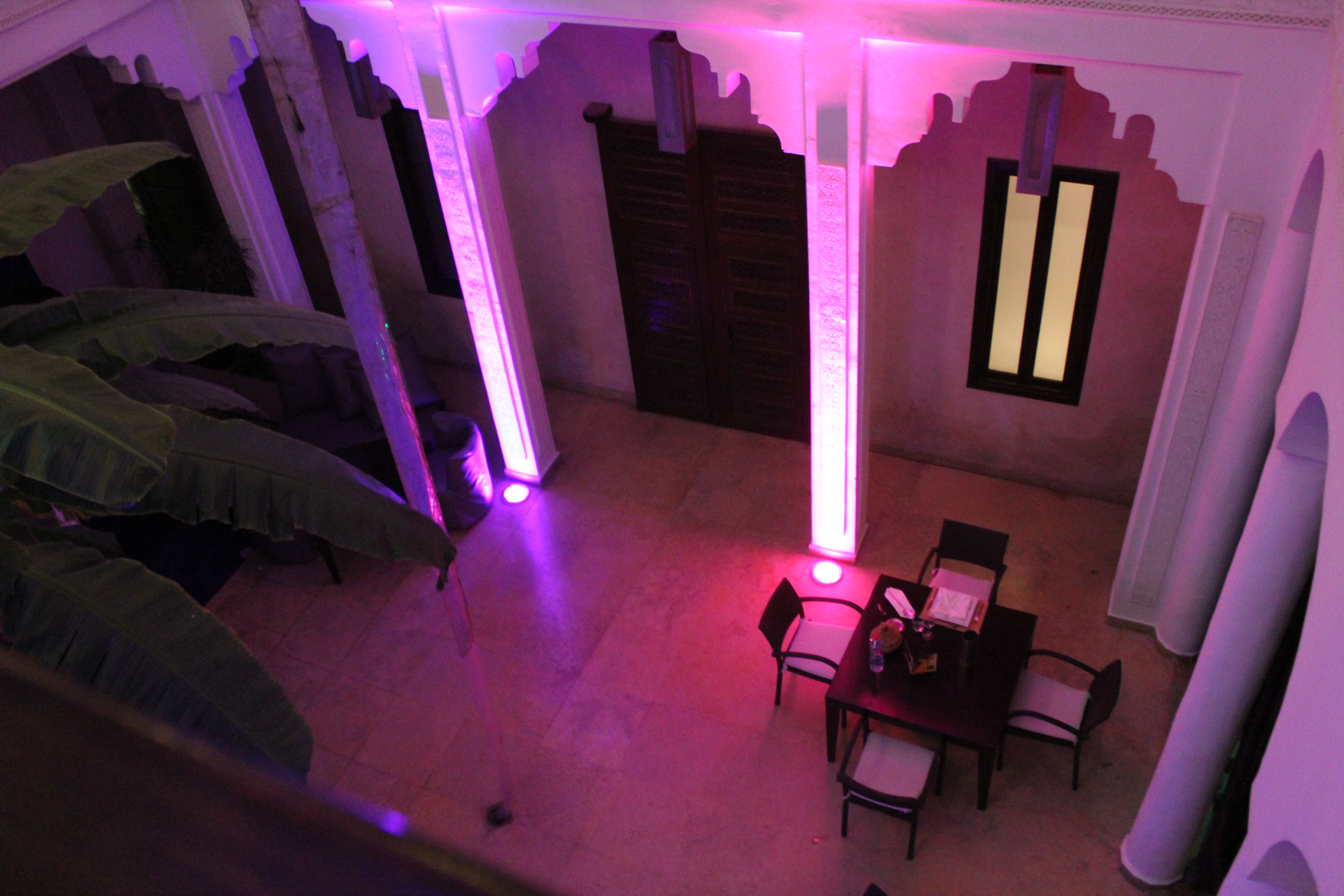 The trendy first floor lounge, lit up in mauve hues in the evening, creates a feeling of harmony and well-being… from the dining room, where you can enjoy the quintessence of local cuisine, to the warm, intimate lounge opening onto the spacious patio, where you can enjoy a glass of mint tea accompanied by the best Moroccan pastries…