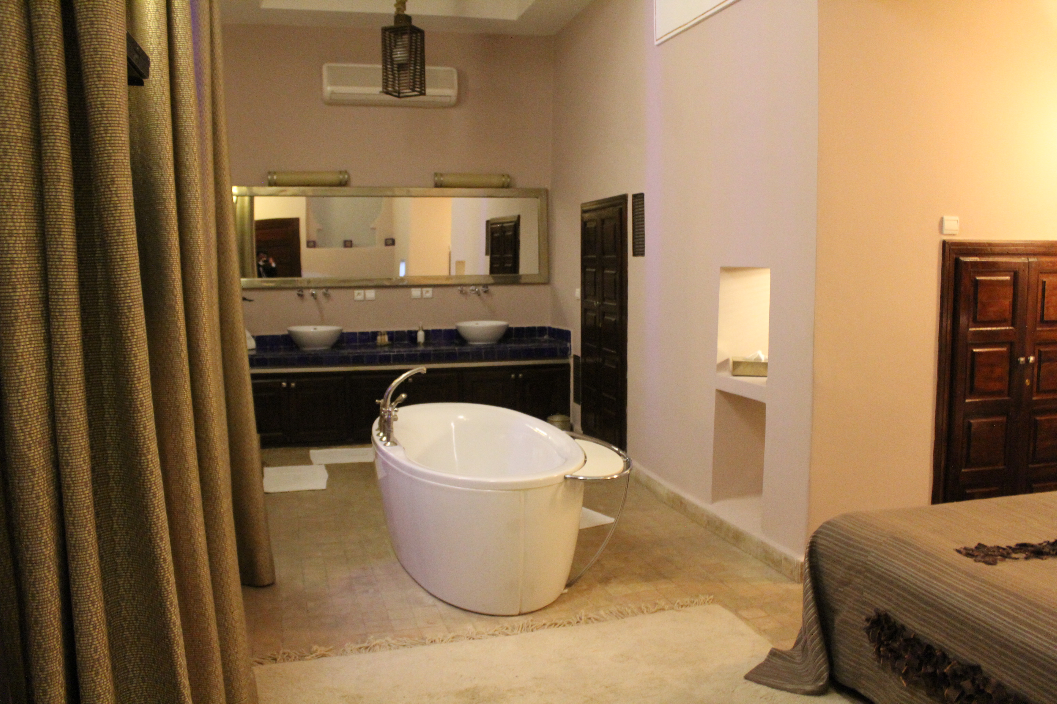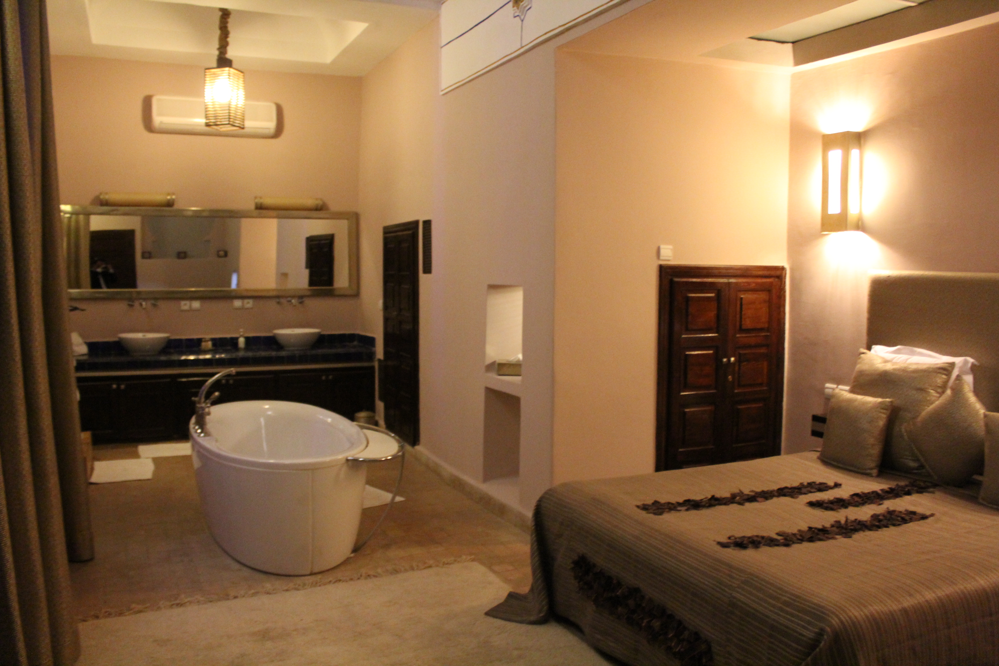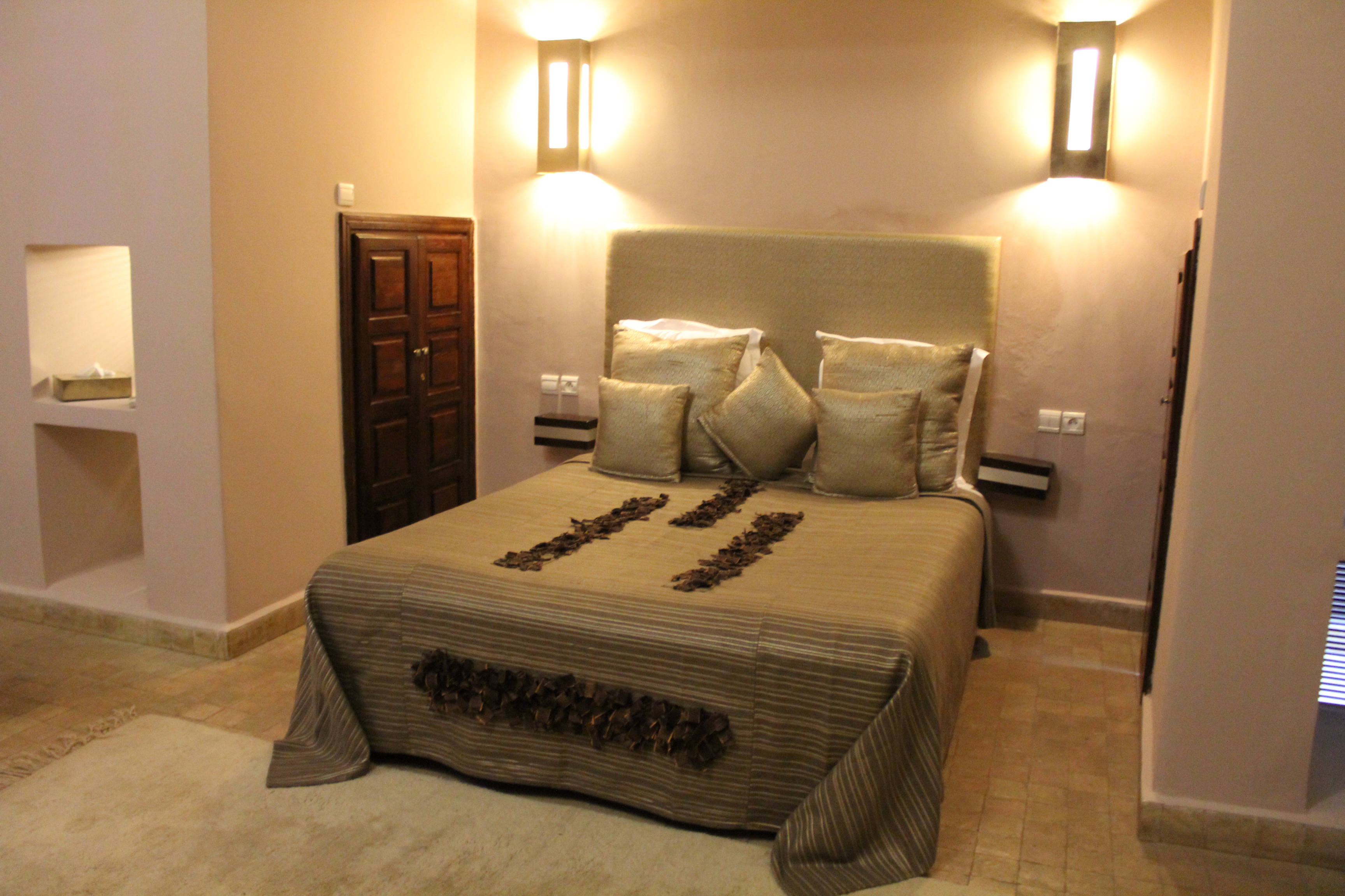 Immerse yourself in a refined Berber spirit with the brown tones of the Matthieu suite, feel all the passion and emotions of the city with the cameo of reds of the Pierre suite or bask in the taupe shades of the Jade suite… Each room has a large tadelakt bathroom for relaxation or massage, and some have a fireplace for winter evenings