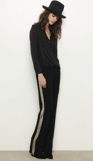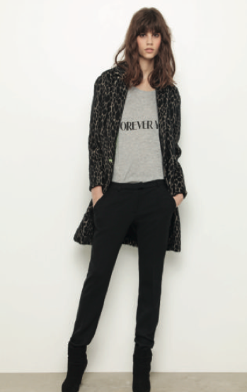 A free spirit emanates from the collection, the silhouette is fluid and elegant, and the androgynous trend presents itself through bombers, leather jackets and reversed skins. The assertive Ba&sh woman is sexy-chic with angora pullovers and leather skirts. Fragile in wide-leg suit pants, black dresses in light lace or the superposition of sweater and long skirt. She’s also wild in zebra, leopard or snake prints. Feminine in gold or ethnic symbols.