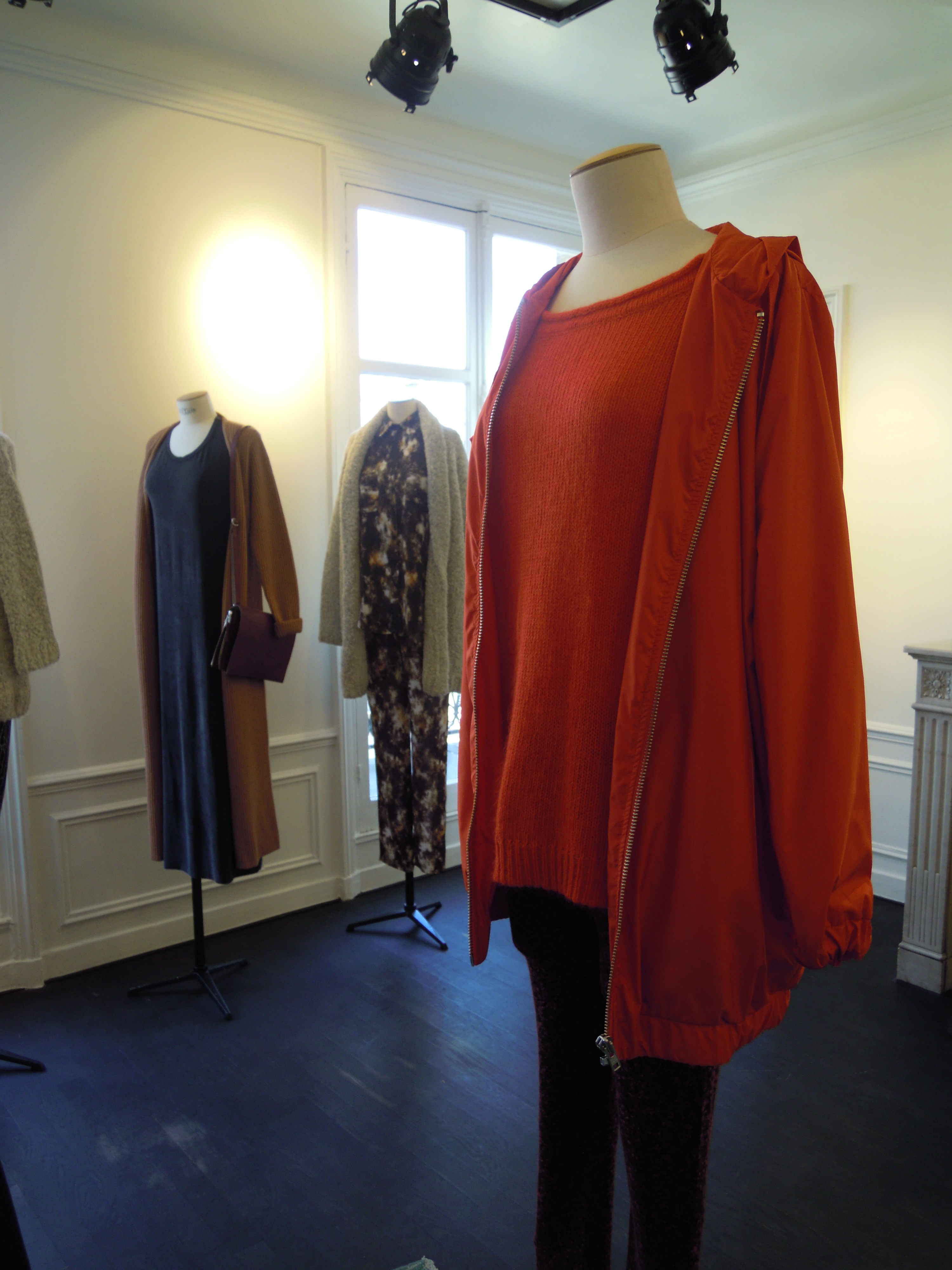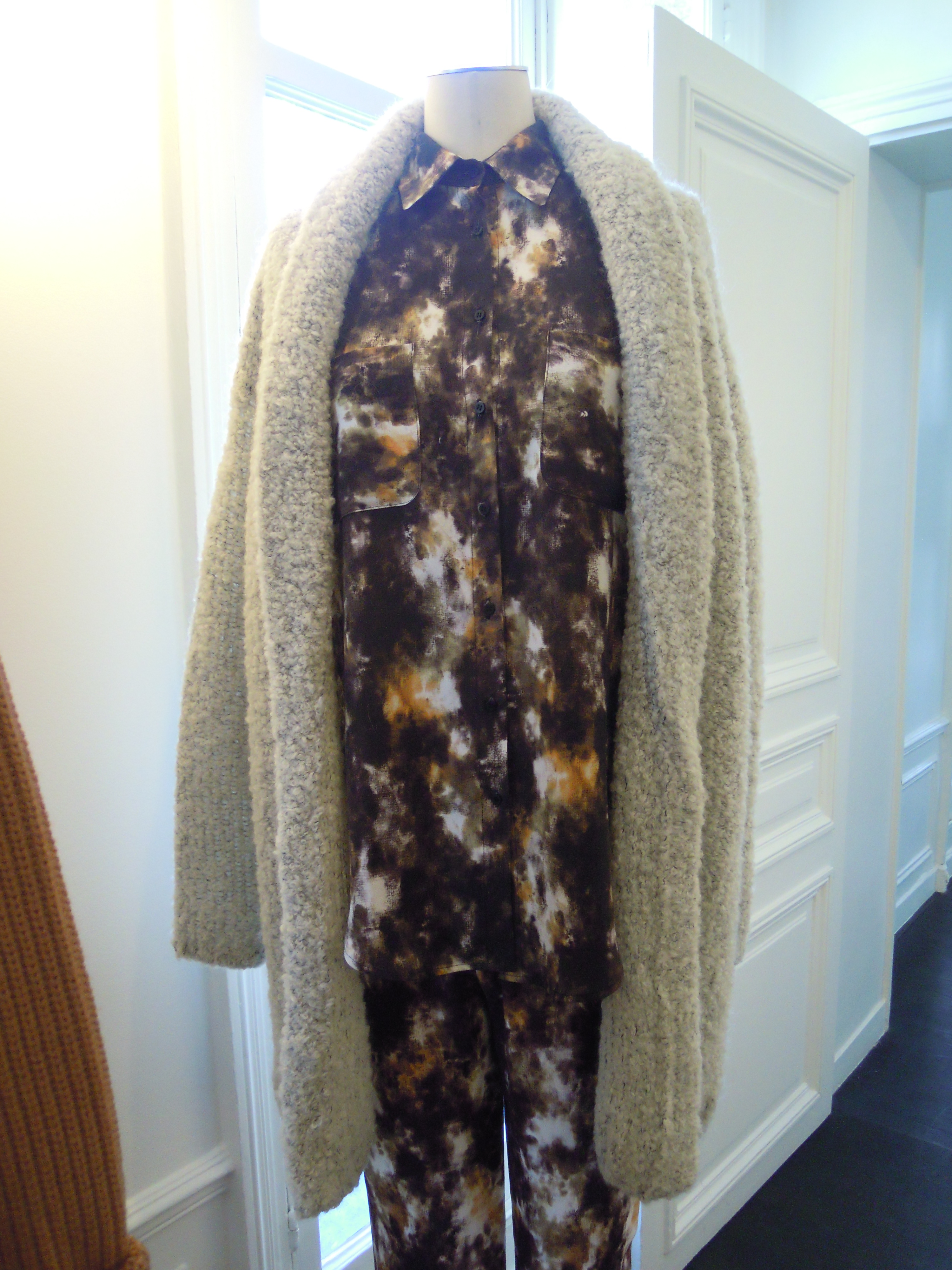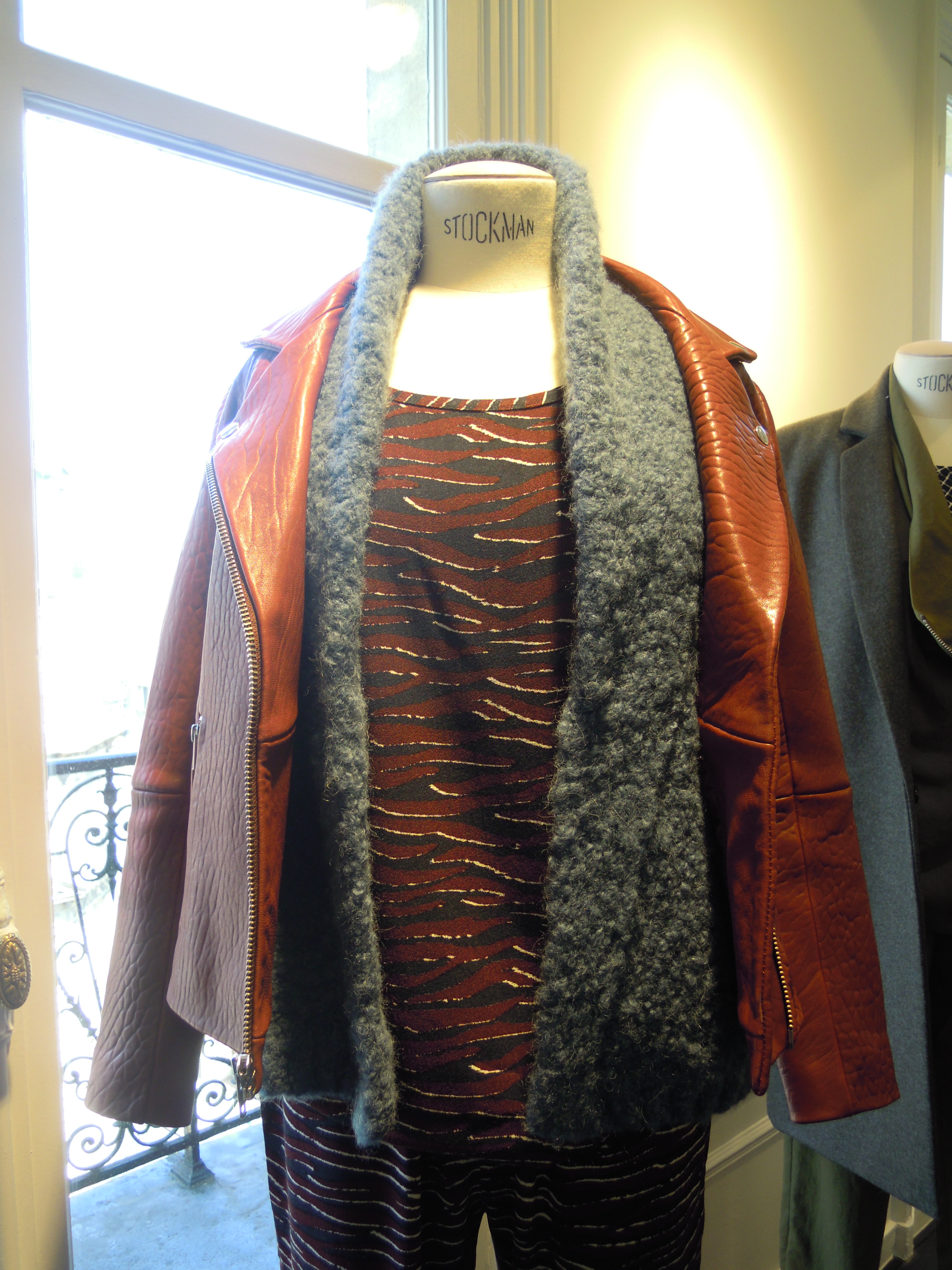 Enhanced by abstract prints, the collection also includes leather pieces like this black or white perfecto, or very supple leggings. Colors are sometimes bright, for a dash of vitamin, sometimes dark, for greater discretion. Orange, burgundy and mustard predominate with mottled gray!