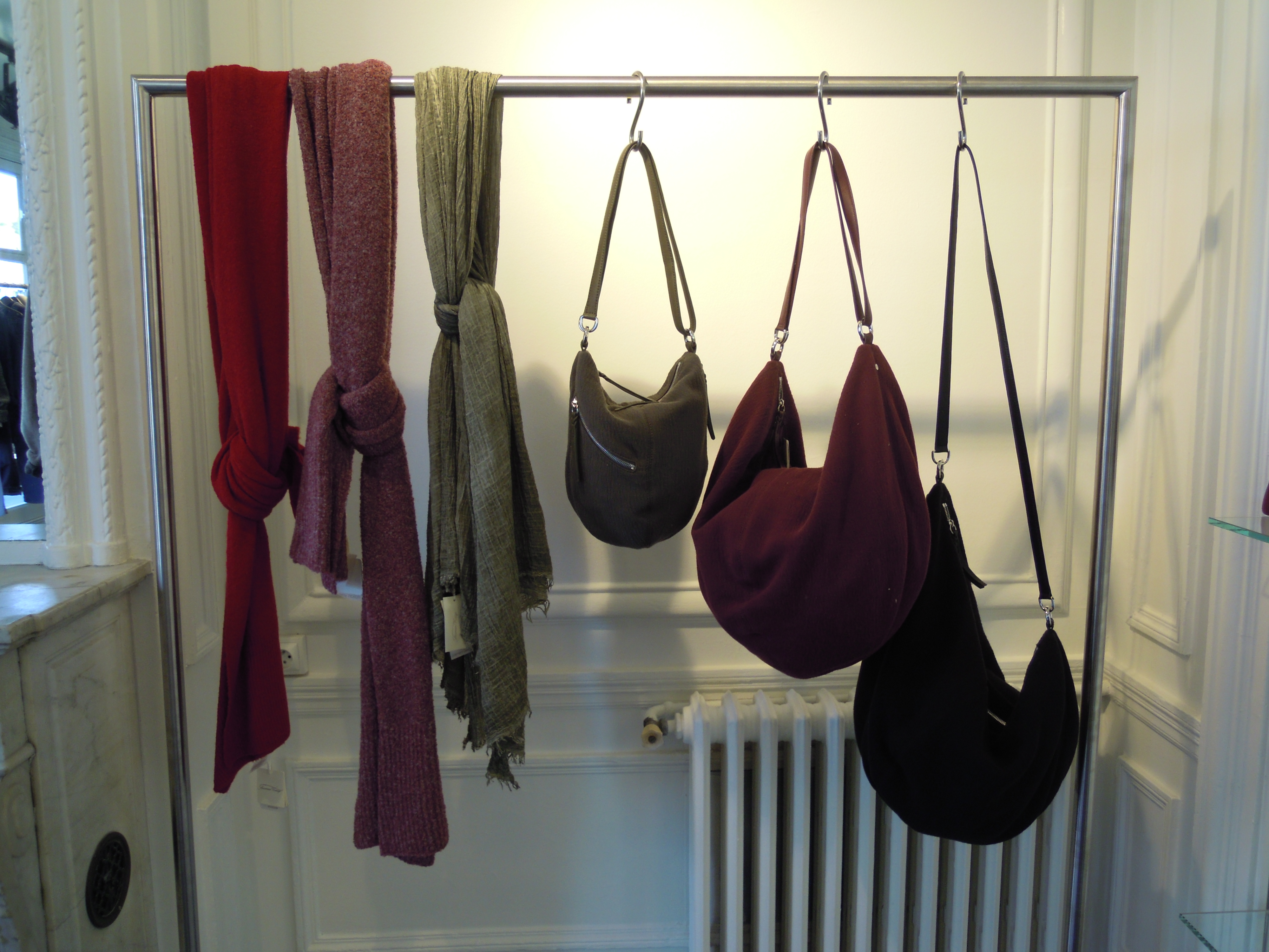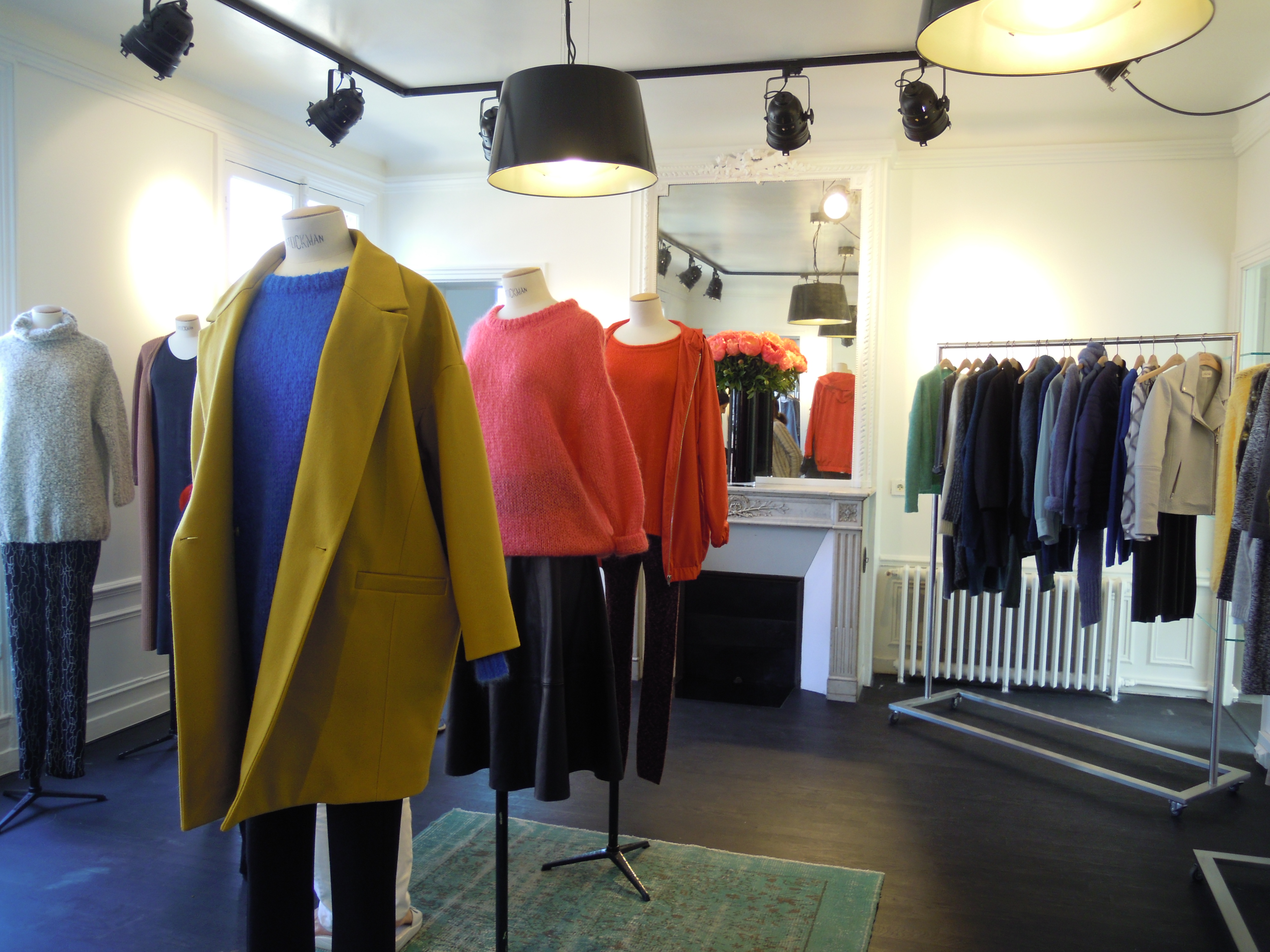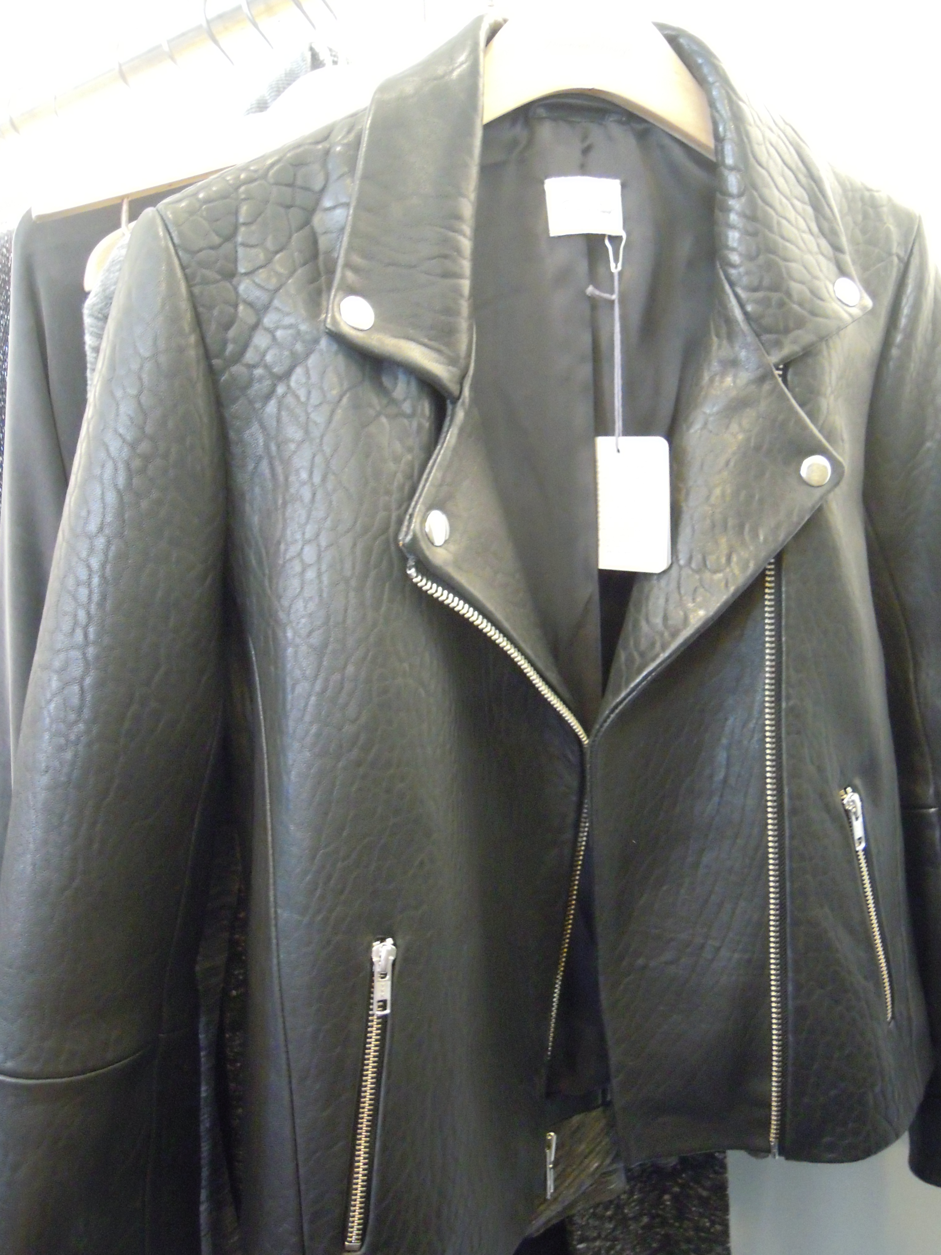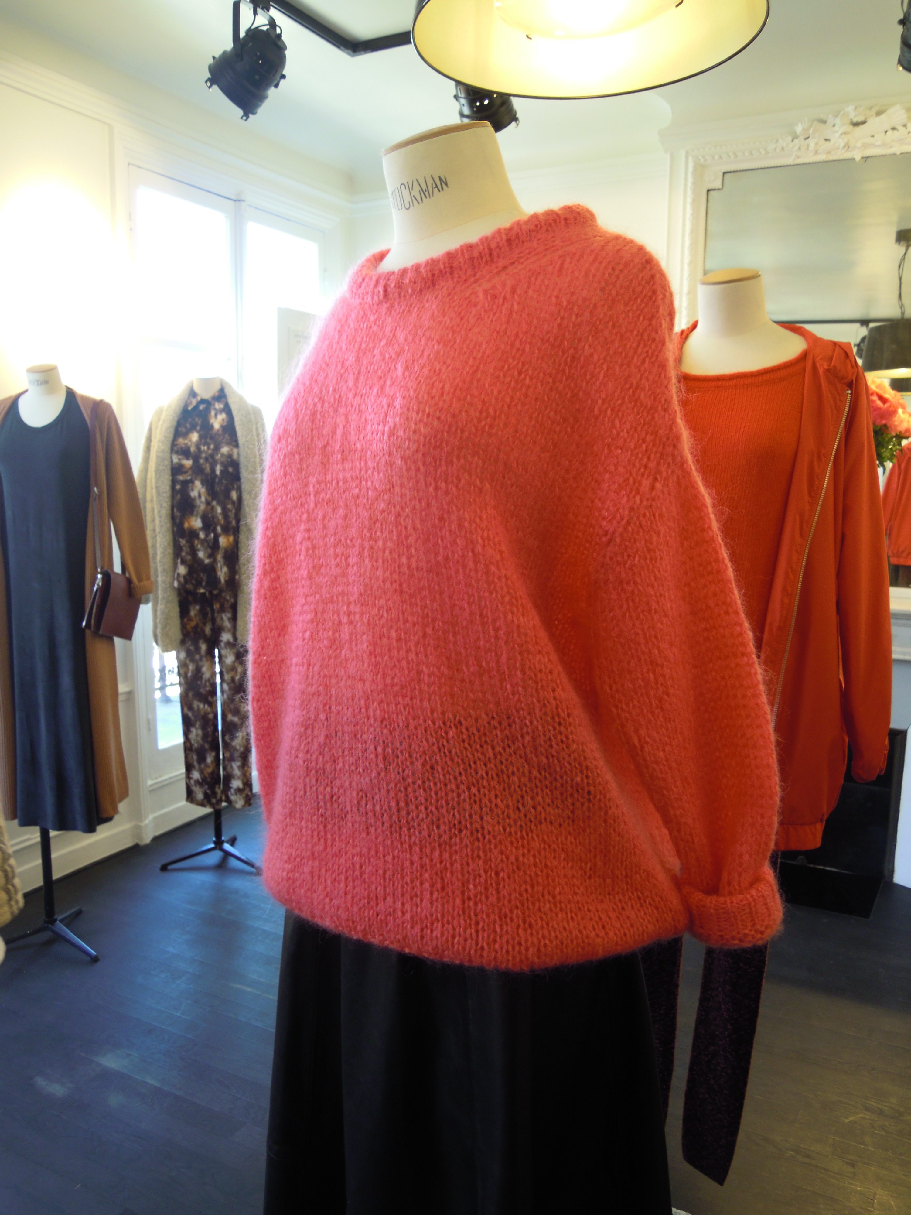 Enhanced by abstract prints, the collection also includes leather pieces like this black or white perfecto, or very supple leggings. Colors are sometimes bright, for a dash of vitamin, sometimes dark, for greater discretion. Orange, burgundy and mustard predominate with mottled gray!