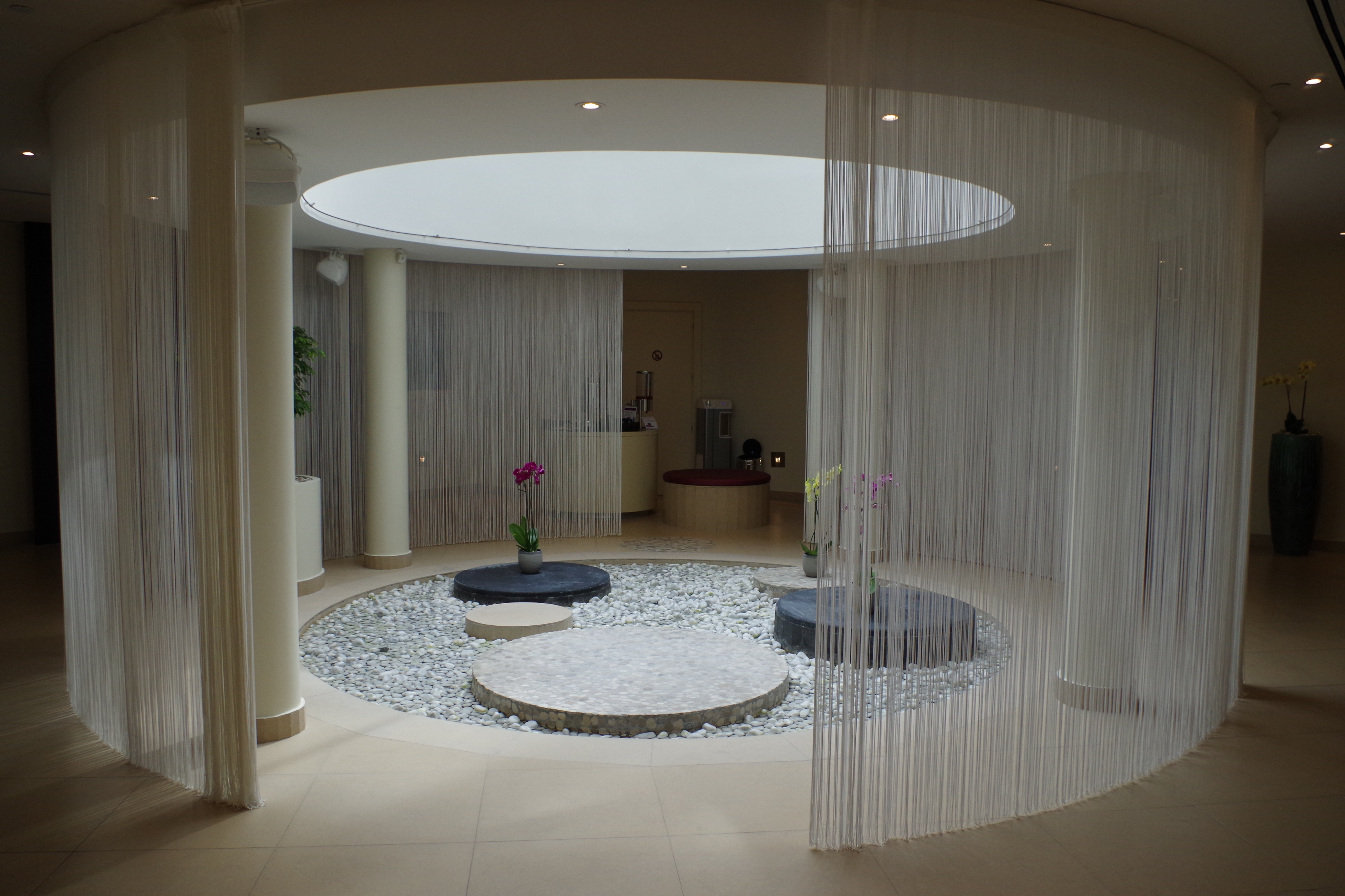 The ideal orientation of the views to the sea, to the east, south and west, creates an “L”-shaped hotel with three 11-storey towers. Its neoclassical (1900-1930s) architecture lends it an old-world charm, while elegantly and subtly integrating the latest leisure and high-tech facilities. The international aspect of the hotel is also illustrated by five stained-glass windows by Jean-Michel Folon representing space. The facades are punctuated by a succession of colonnades and arcades in a trilogy: base, upper floor and attic. Particular attention was paid to the building’s lighting, which cuts through its various architectural elements. Exterior lighting is designed to give the gardens a romantic “moonlight” feel, with a crescendo from the hotel to the tip of the dark areas, revealing backgrounds that are the antithesis of traditional public lighting. A cybernetic fountain surprises visitors as soon as they enter the reception area. In front of the hotel, while two domes project flames, a computer-animated fountain gives a ten-minute foretaste every hour of the surprises that await visitors during their stay: water games are triggered and evolve in synchronization with a musical background. A sophisticated colorimetry system reflects changing light through the jets.