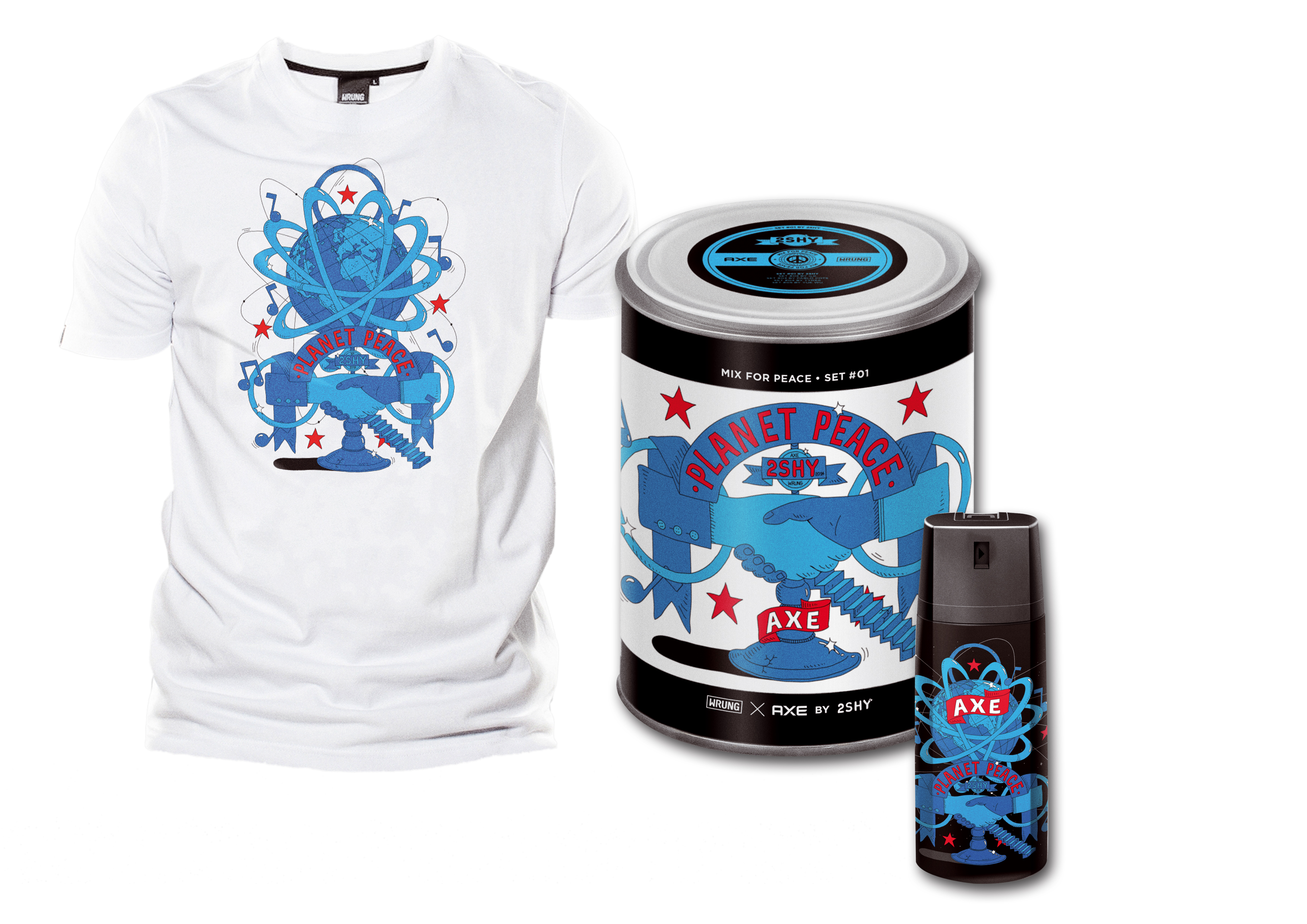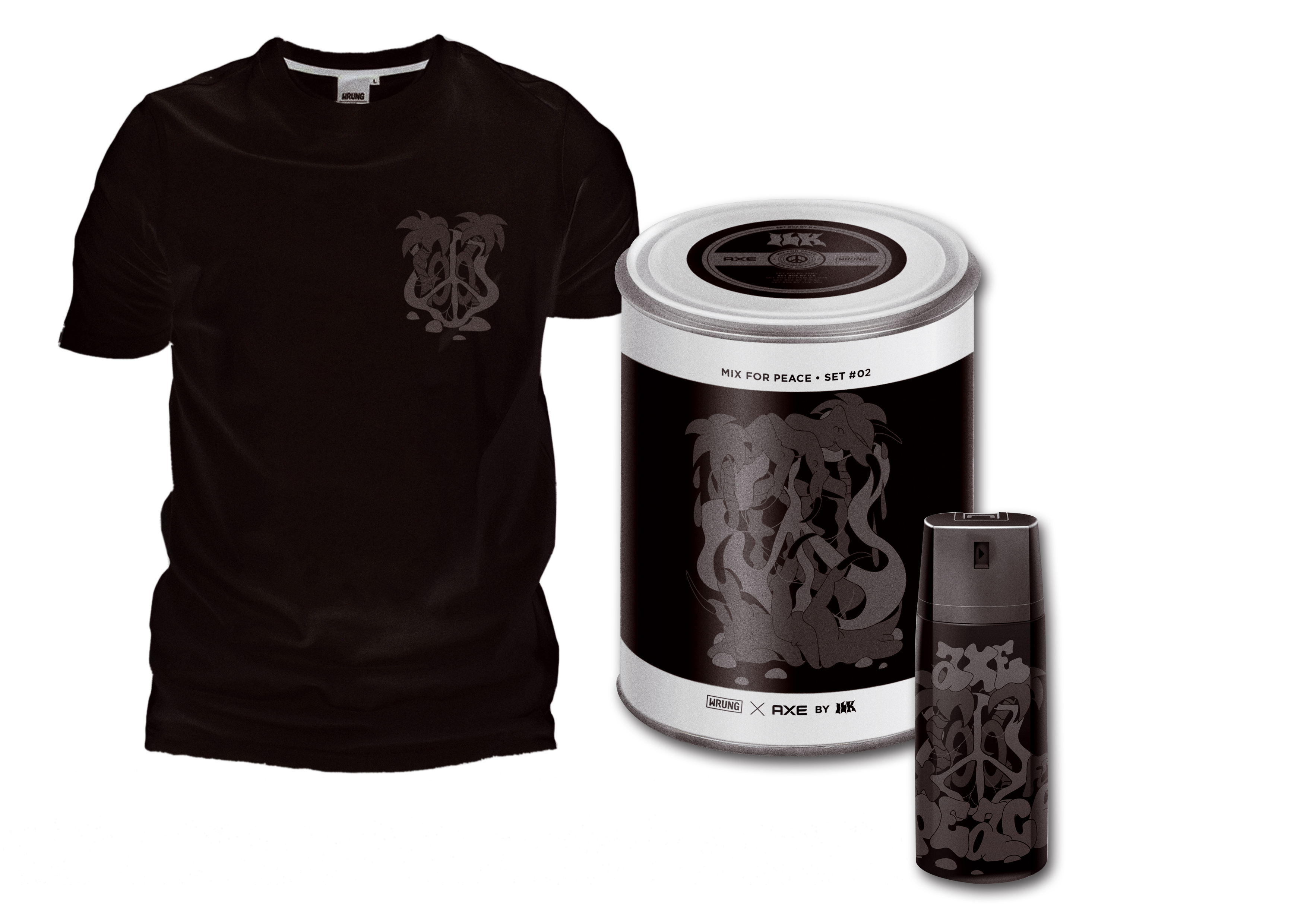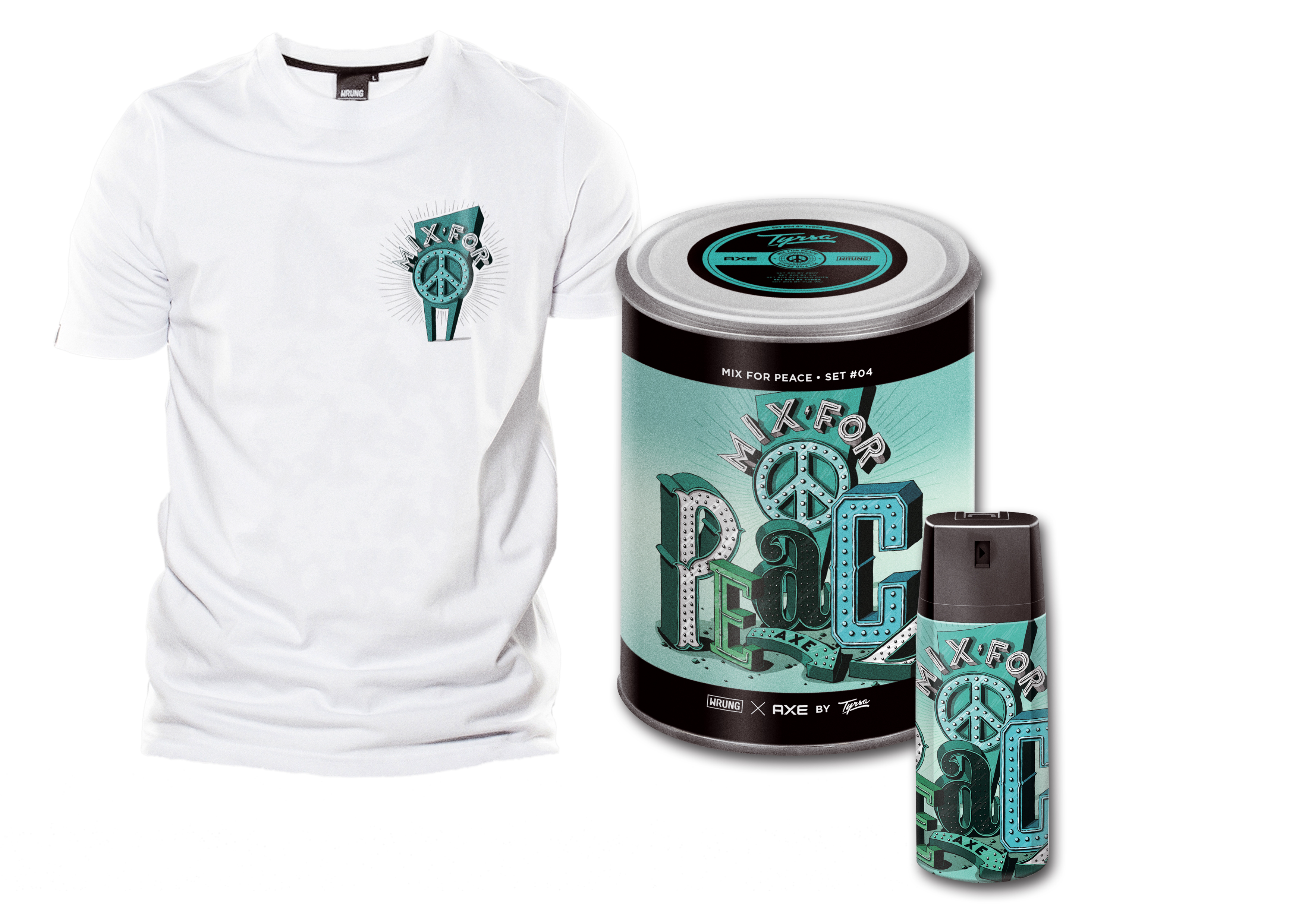 In a pot of industrial paint, a nod to the street art atmosphere, men will discover a WRUNG T-shirt and an AXE Peace atomizer, each bearing a visual designed by one of the artists.