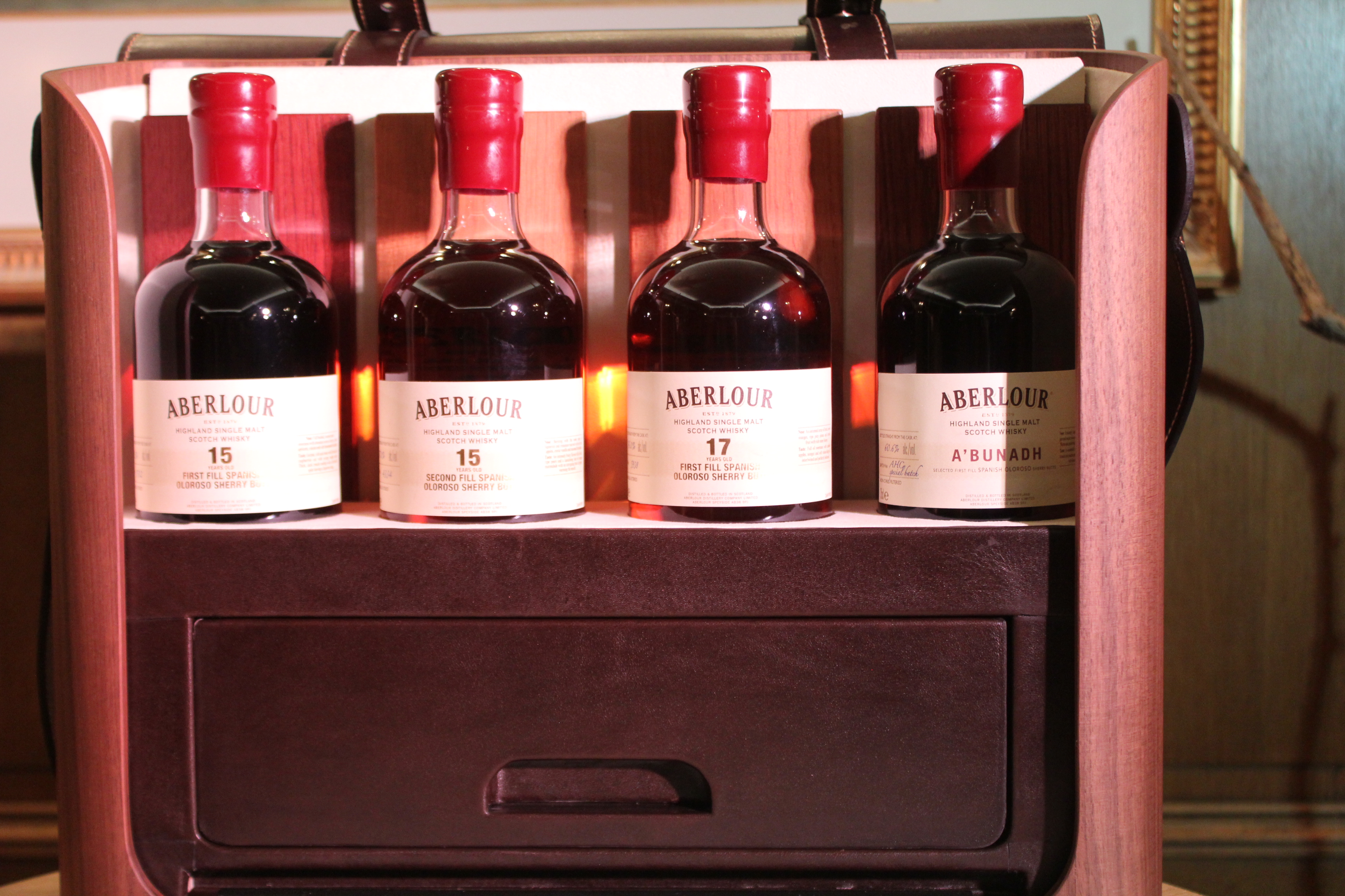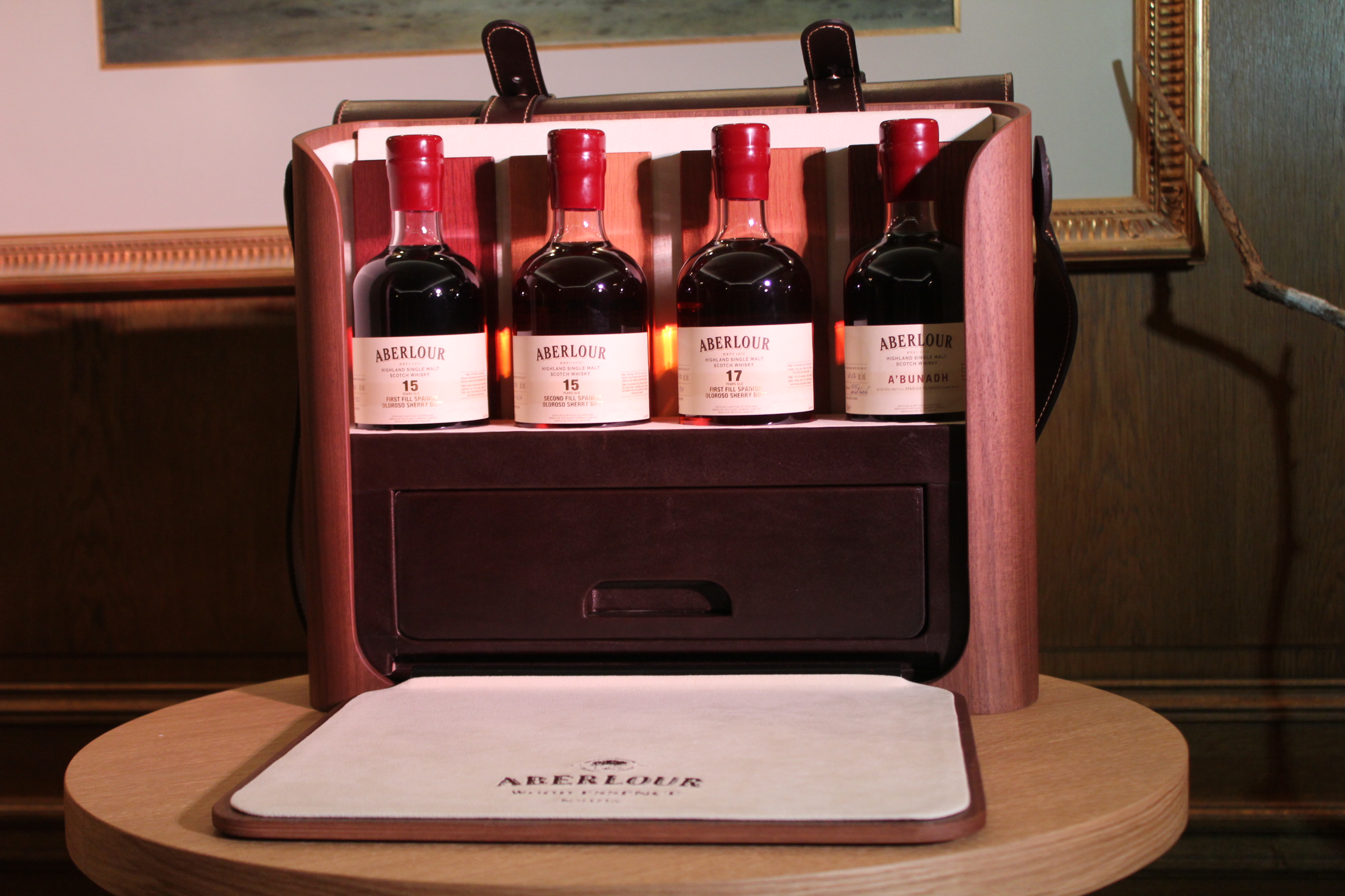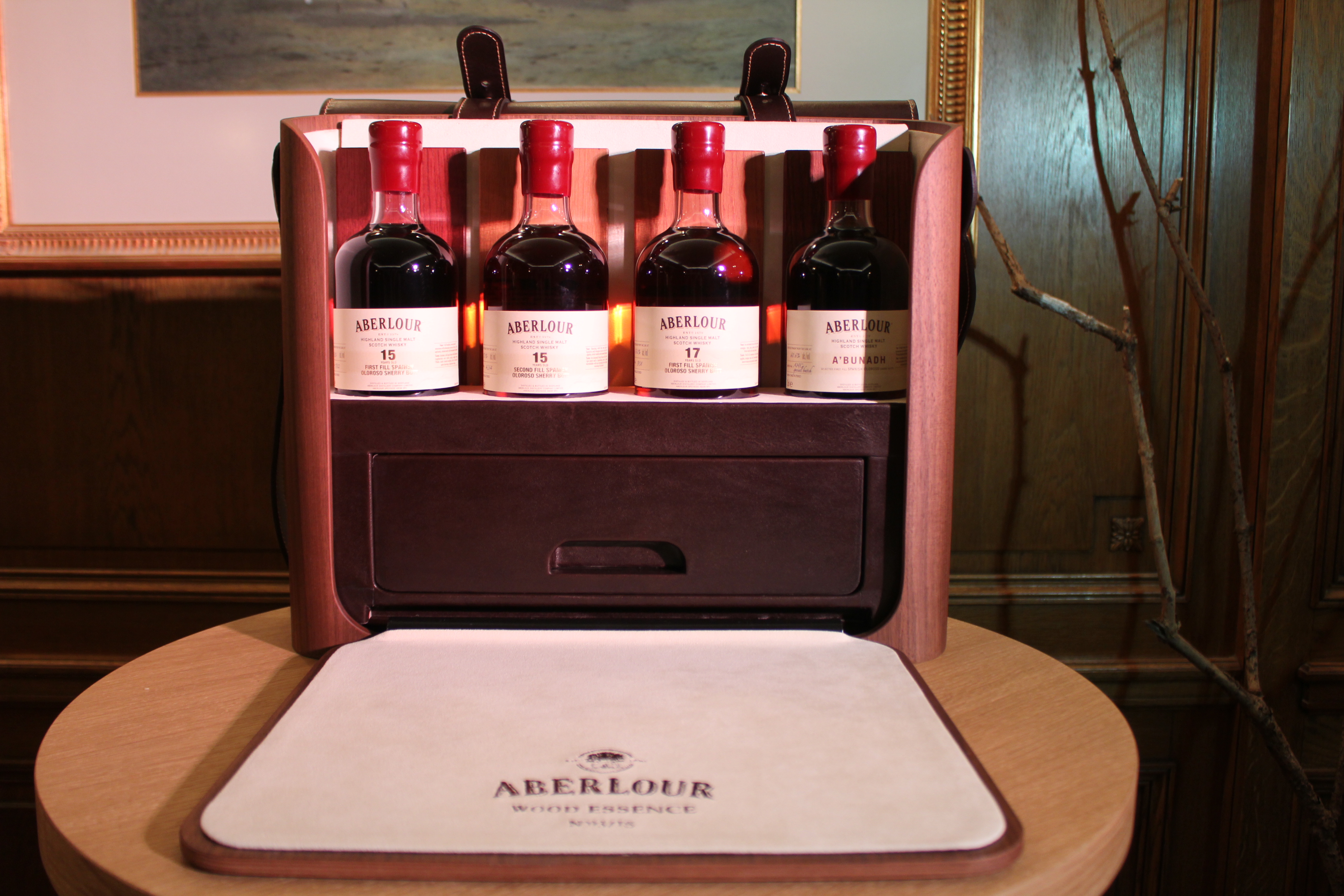 A handcrafted creation inspired by the hunter’s pouch, the ABERLOUR Wood Essence box combines the nobility of wood with the elegance of leather. This bespoke accessory has been conceived and designed to highlight the virtues of wood. While most ABERLOUR Single Malts are aged in two different casks, the ABERLOUR Wood Essence box offers for the first time a unique collection of four 100% Sherry cask bottles: three ABERLOUR Single Malts accompanied by an original edition of the prestigious A’BUNADH. Thanks to its expertise in double maturation, in Sherry and Bourbon casks, the distillery’s signature, ABERLOUR is able to exploit “the maximum and obtain the best from Sherry”, according to the Master Distiller, initiator of this collection.