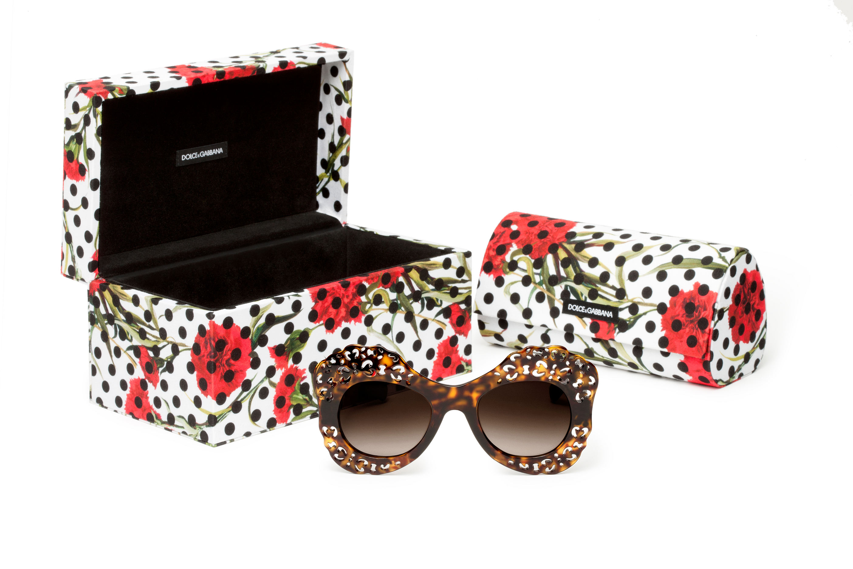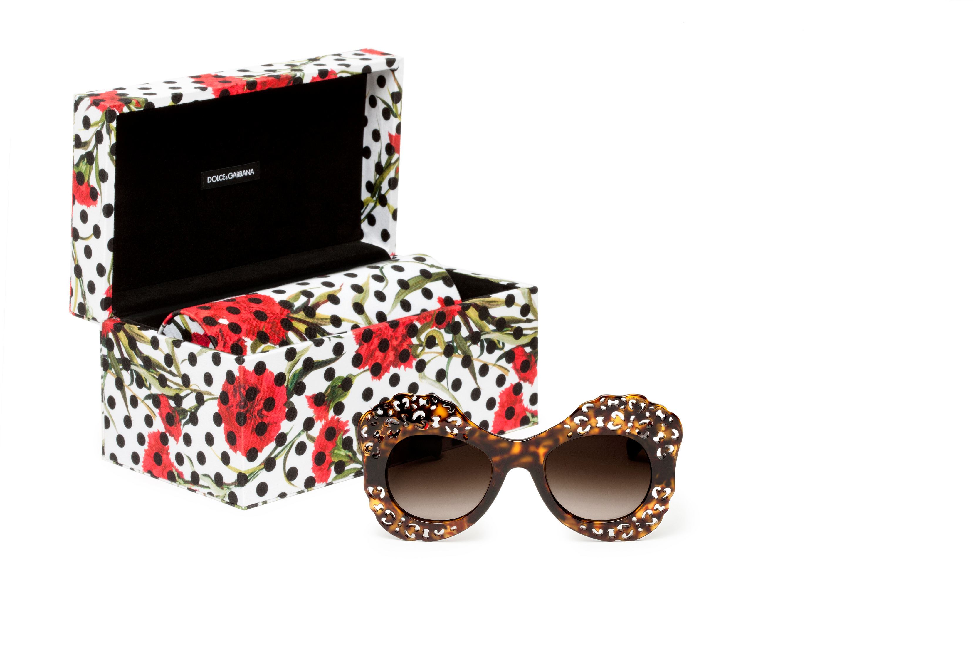 play of chiaroscuro and smoked lenses. Three colors are available: gloss black with smoked gray glass; dark Havana and blond Havana with smoked cognac glass. The Dolce&Gabbana logo under resin appears on the temple stud. The glasses come in a special “precious box” with case, customized with a motif of red eyelets on black and white polka dots.