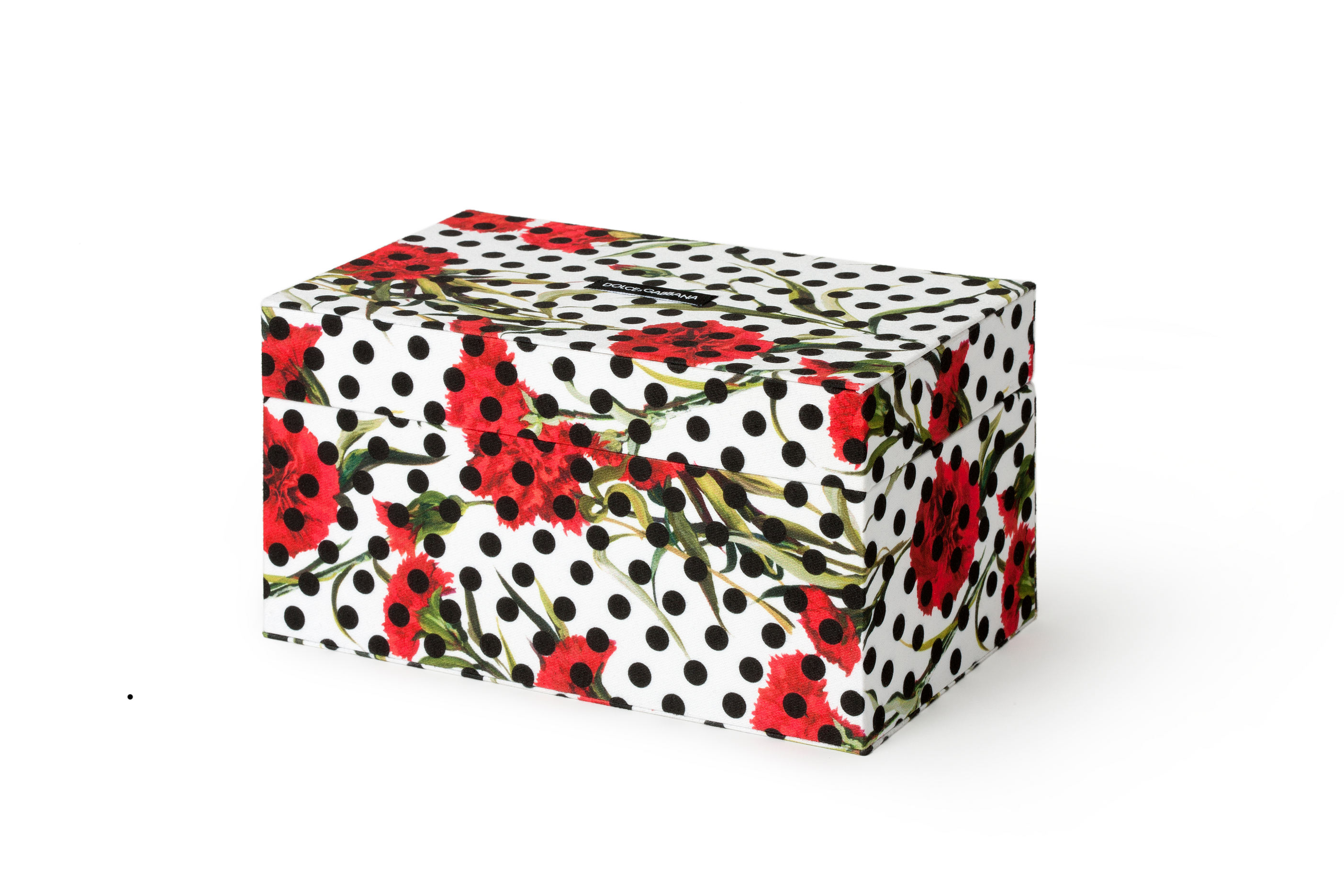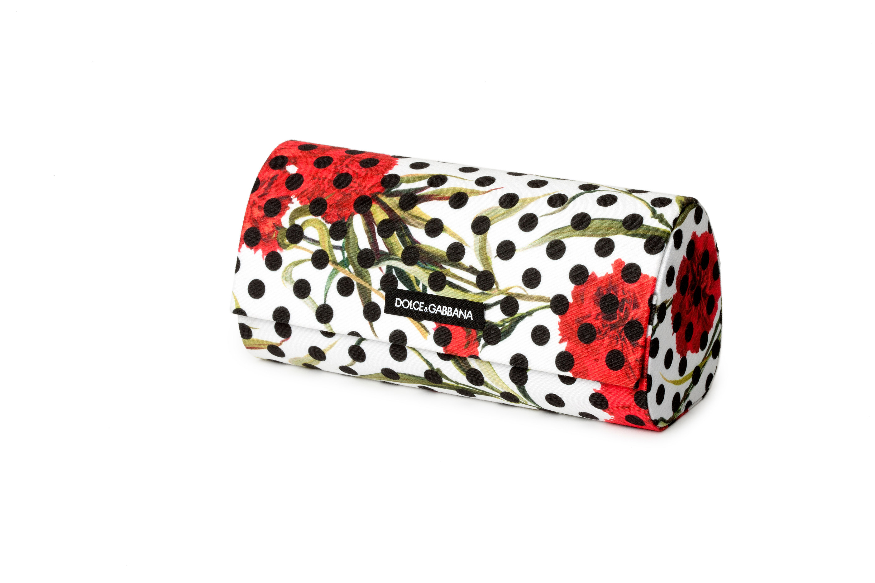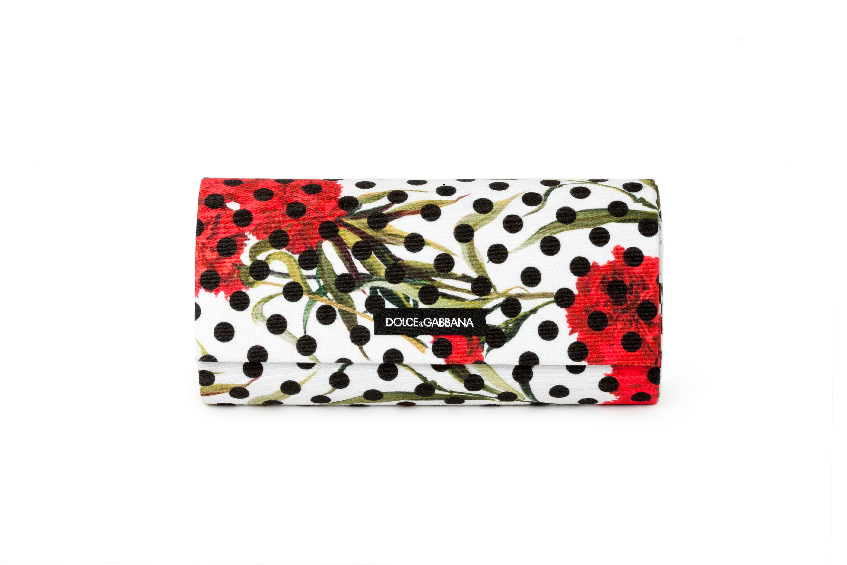 lens. The Dolce&Gabbana logo under resin appears on the temple stud. The glasses come in a special custom case with a motif of red eyelets on black and white polka dots.
