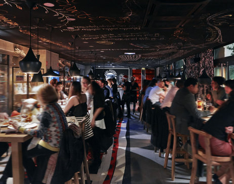The restaurant offers simple, home-cooked dishes designed by Alain Senderens and Jérôme Banctel, to share with friends around the tables d’hôtes. At the gigantic bar, in the pizzeria or on the terrace, you can meet American poets, Japanese painters or Latin American writers.