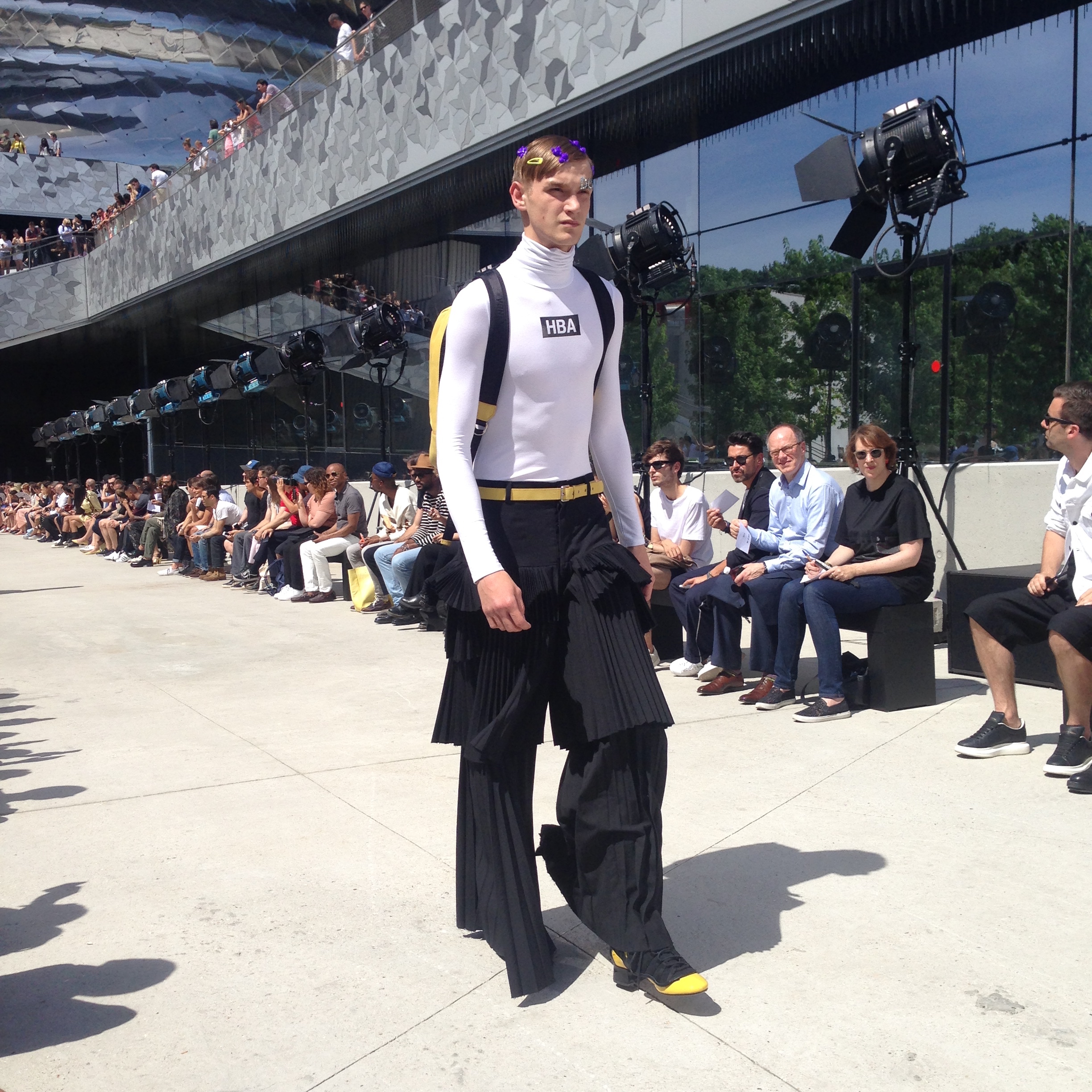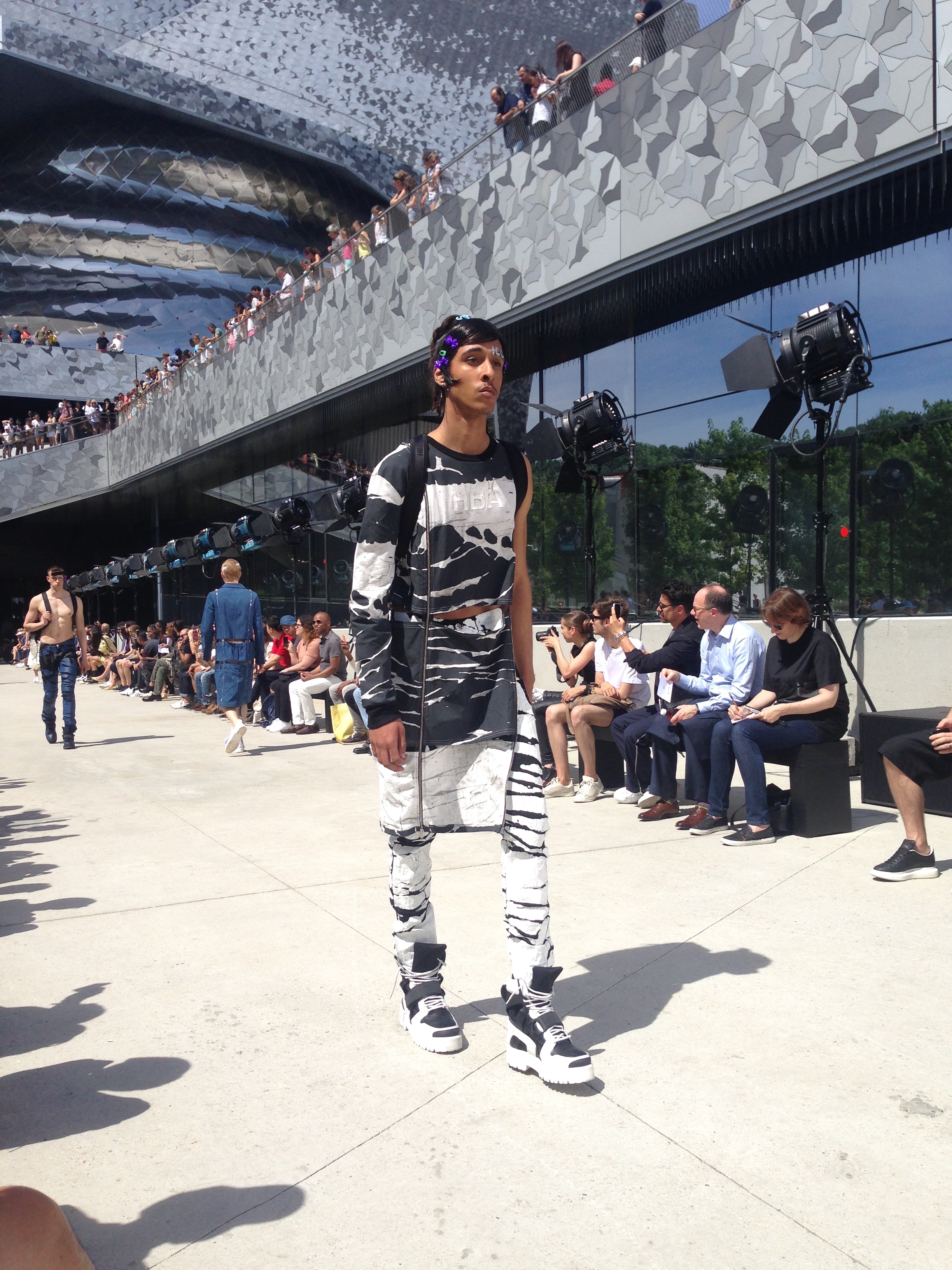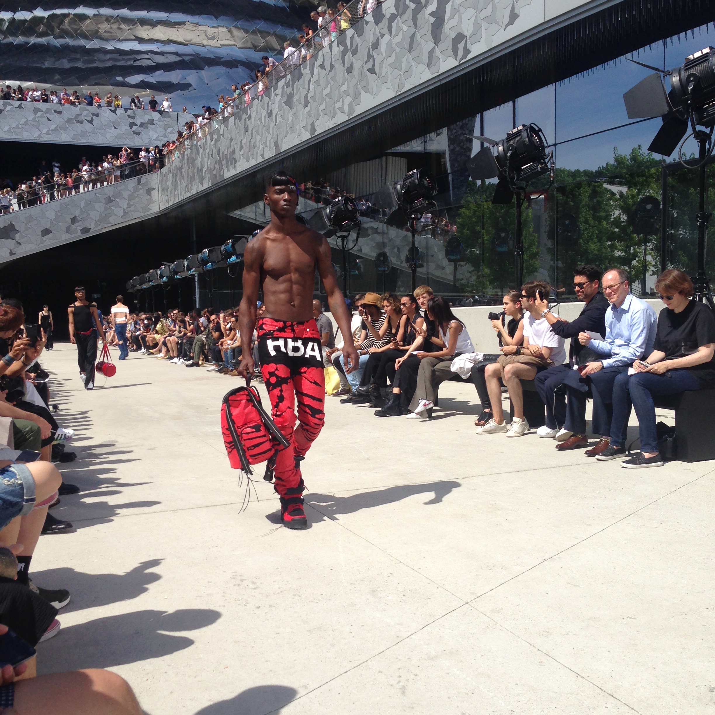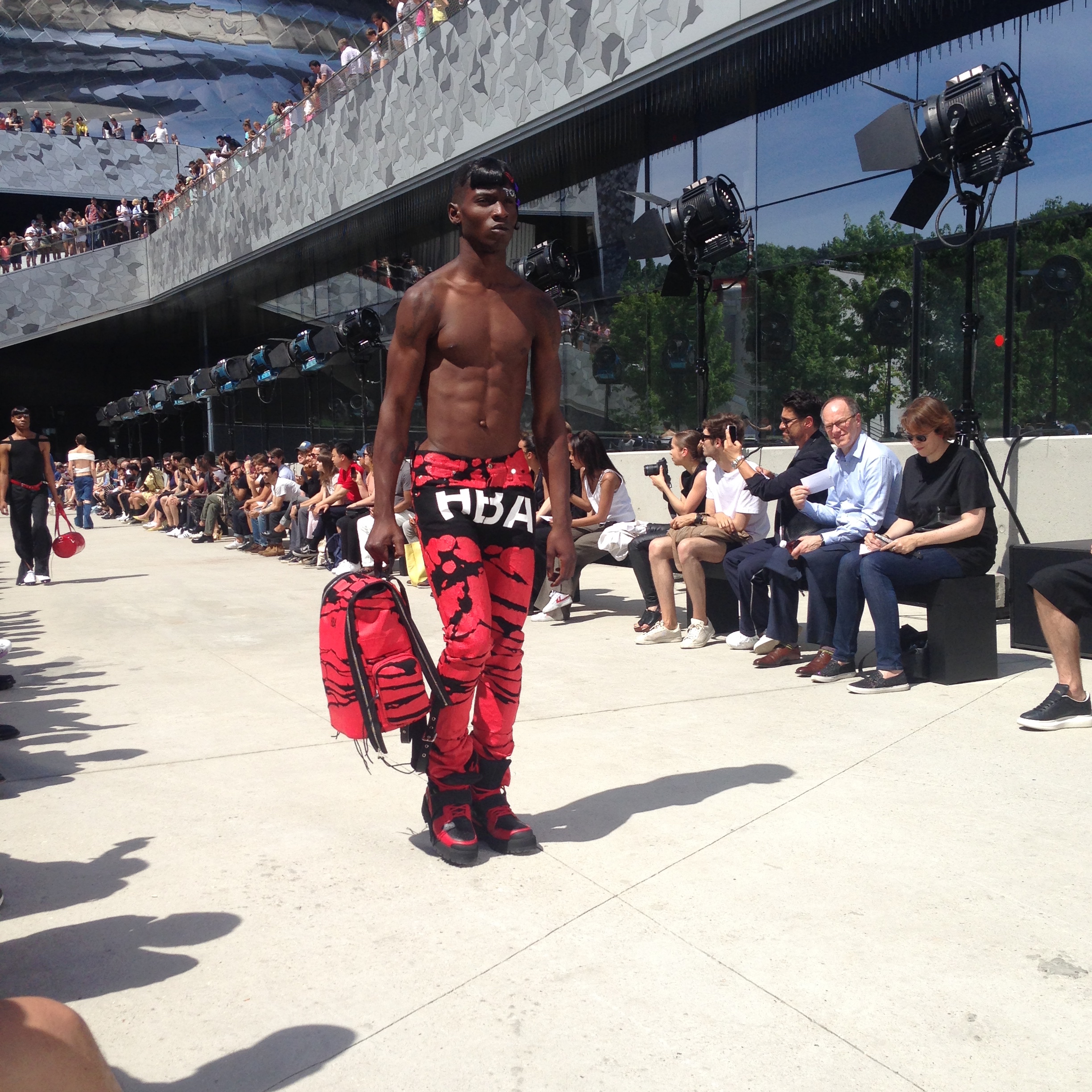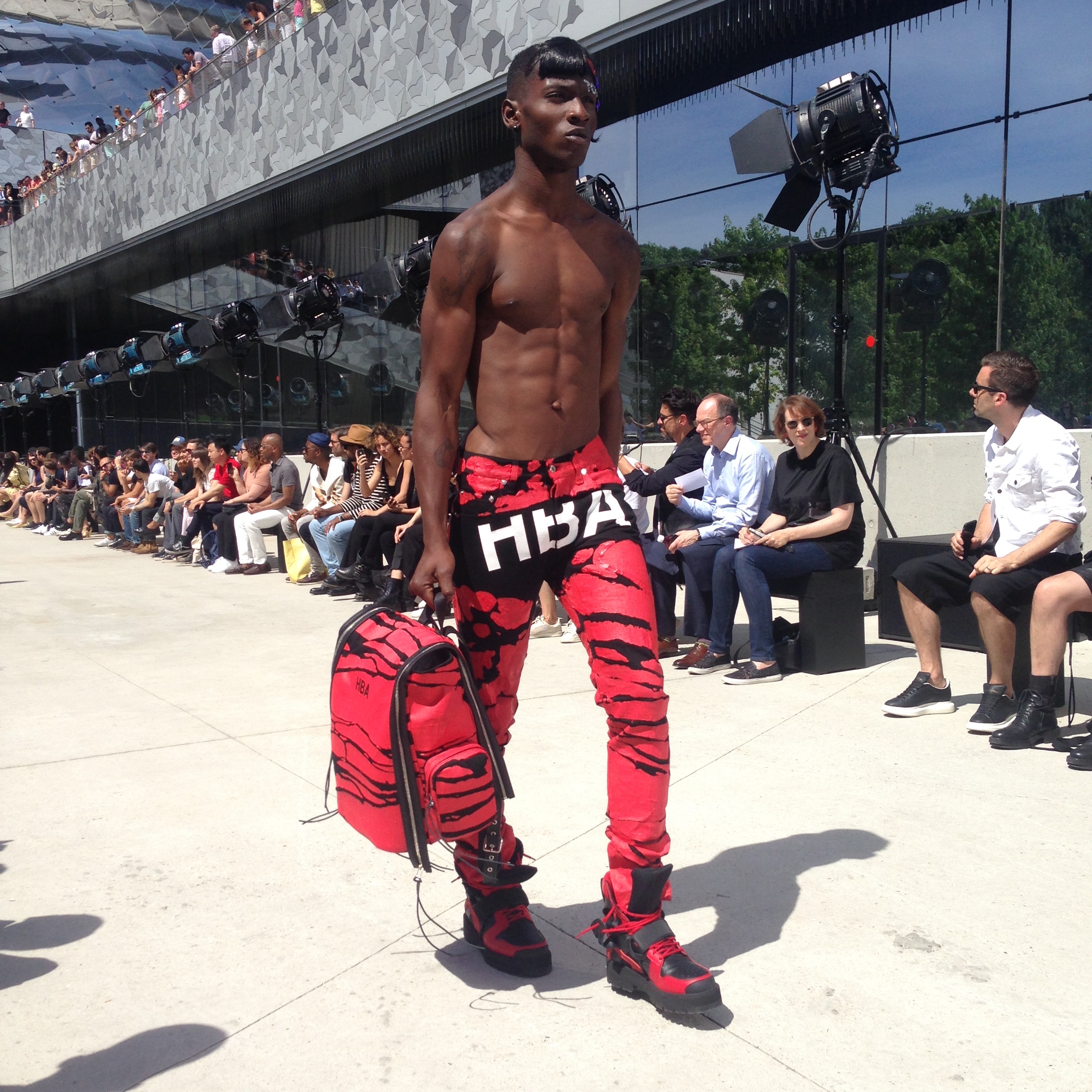 American label Hood by Air shows its men’s collection in Paris. Hood by Air, the up-and-coming label from New York, shows its men’s collection in Paris, with the undulating Philharmonie building as backdrop. Designer Shayne Oliver likes to mix genres, going from Rnb to goth, from sporty to drag queen, from strapping to frail… Just like today’s youth, who are already fans of the label. For summer 2016, HBA men dare to wear everything, including hair clips and diamond rhinestones on eyelashes, and even mouth guards made of needles or pearls. Oliver cuts, detaches and reattaches. The pants split into three pieces and unzip, the top drapes, the purple leather expands, the jeans crackle, the hand accessory is worn like a boxing glove. The “HBA” logo, already widely recognized and adopted, is found throughout the collection. Aware of the mix of cultures and the importance of streewear, Oliver mixes and plays with everything, isn’t afraid to surprise, experiments, and creates an “HBA” gang phenomenon…