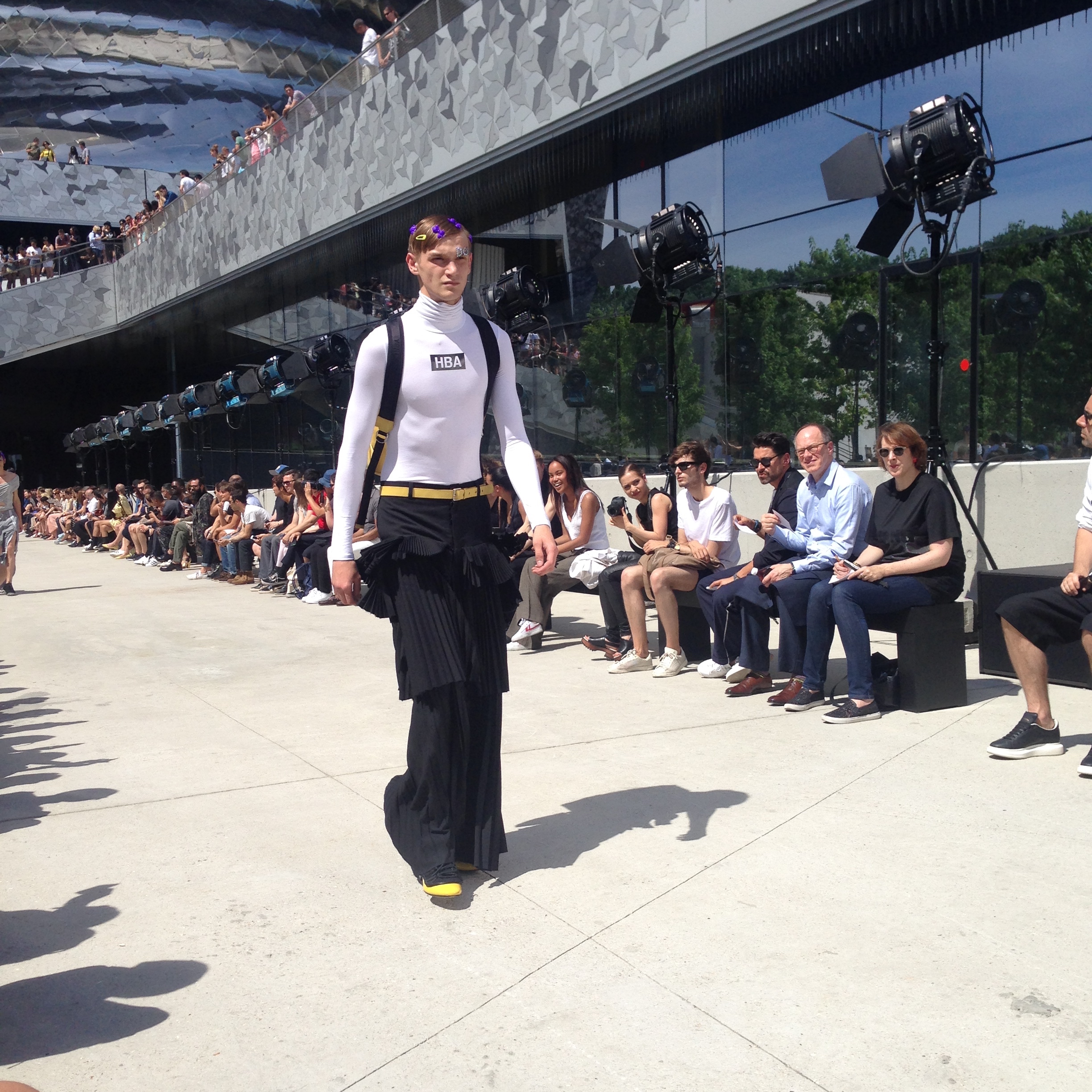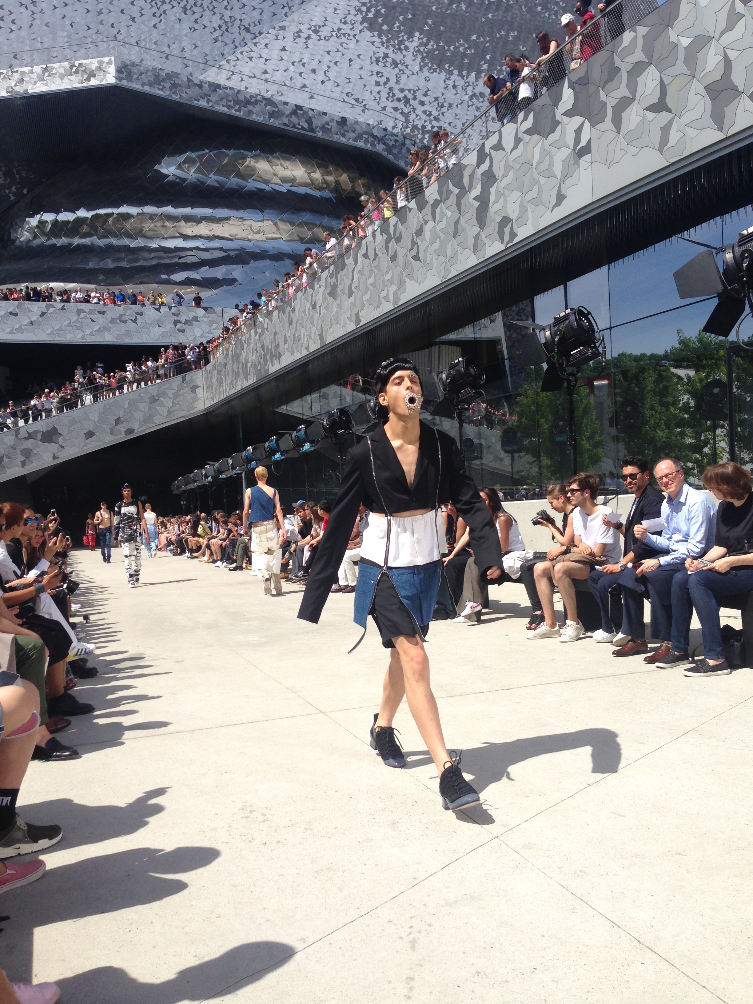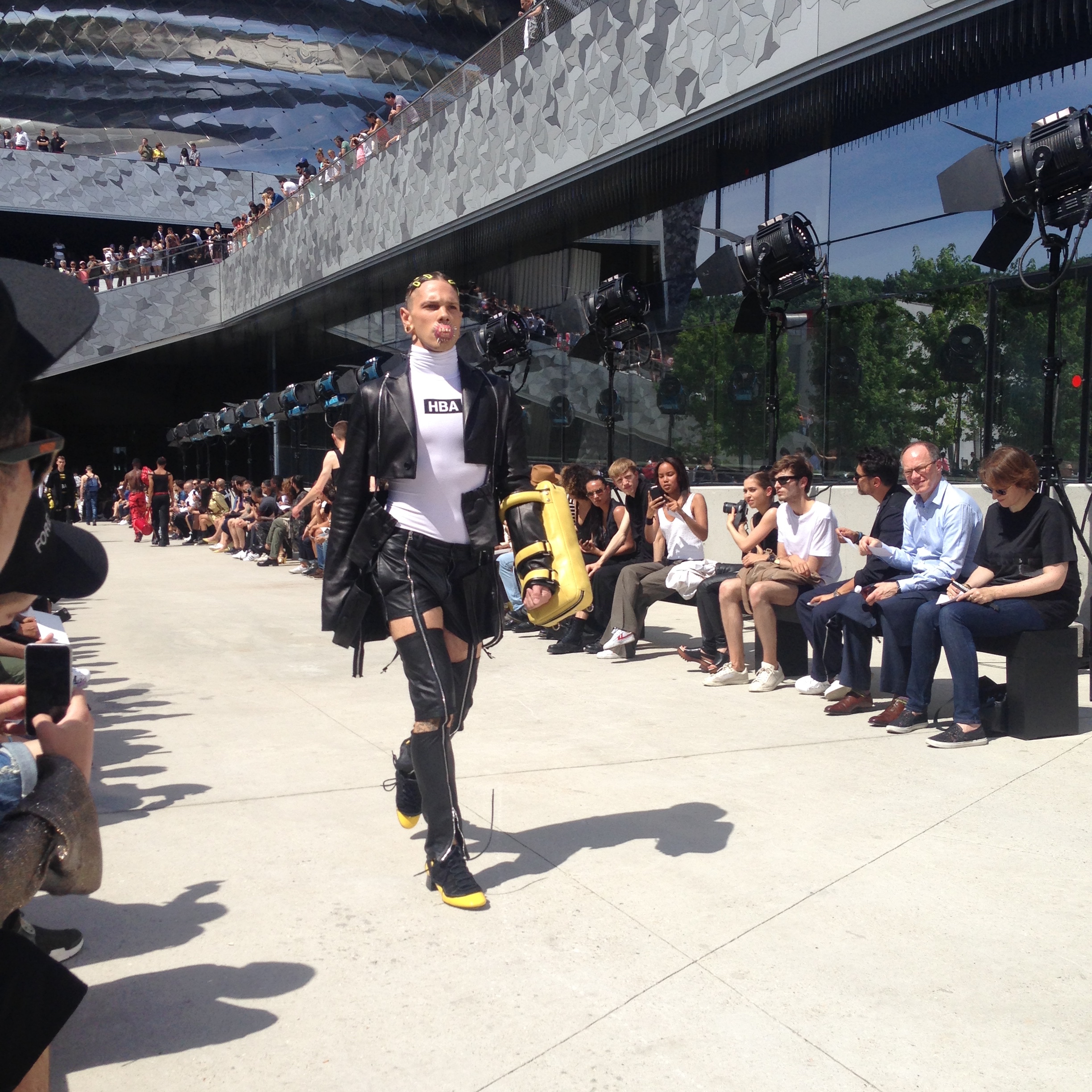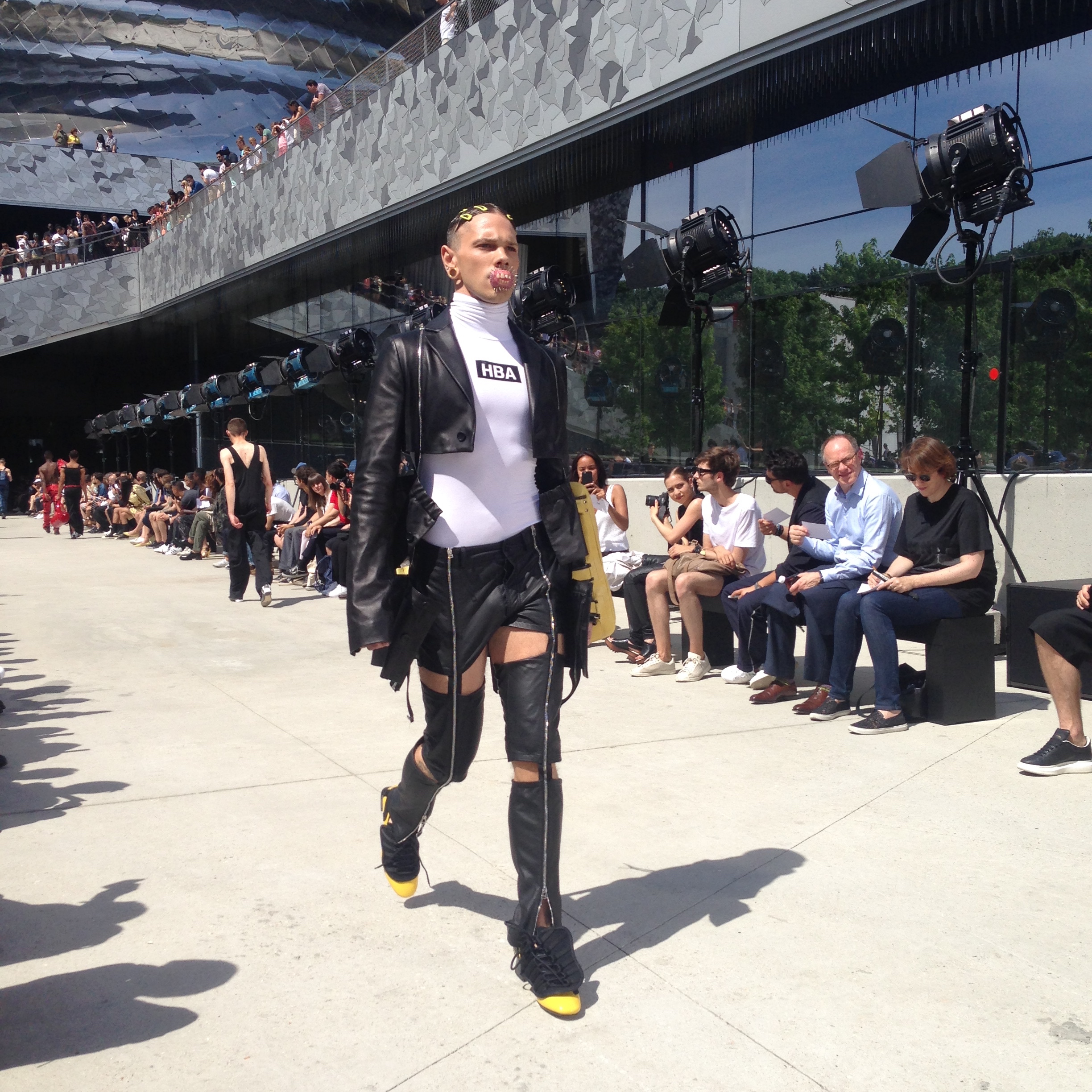 American label Hood by Air shows its men’s collection in Paris. Hood by Air, the up-and-coming label from New York, shows its men’s collection in Paris, with the undulating Philharmonie building as backdrop. Designer Shayne Oliver likes to mix genres, going from Rnb to goth, from sporty to drag queen, from strapping to frail… Just like today’s youth, who are already fans of the label. For summer 2016, HBA men dare to wear everything, including hair clips and diamond rhinestones on eyelashes, and even mouth guards made of needles or pearls. Oliver cuts, detaches and reattaches. The pants split into three pieces and unzip, the top drapes, the purple leather expands, the jeans crackle, the hand accessory is worn like a boxing glove. The “HBA” logo, already widely recognized and adopted, is found throughout the collection. Aware of the mix of cultures and the importance of streewear, Oliver mixes and plays with everything, isn’t afraid to surprise, experiments, and creates an “HBA” gang phenomenon…