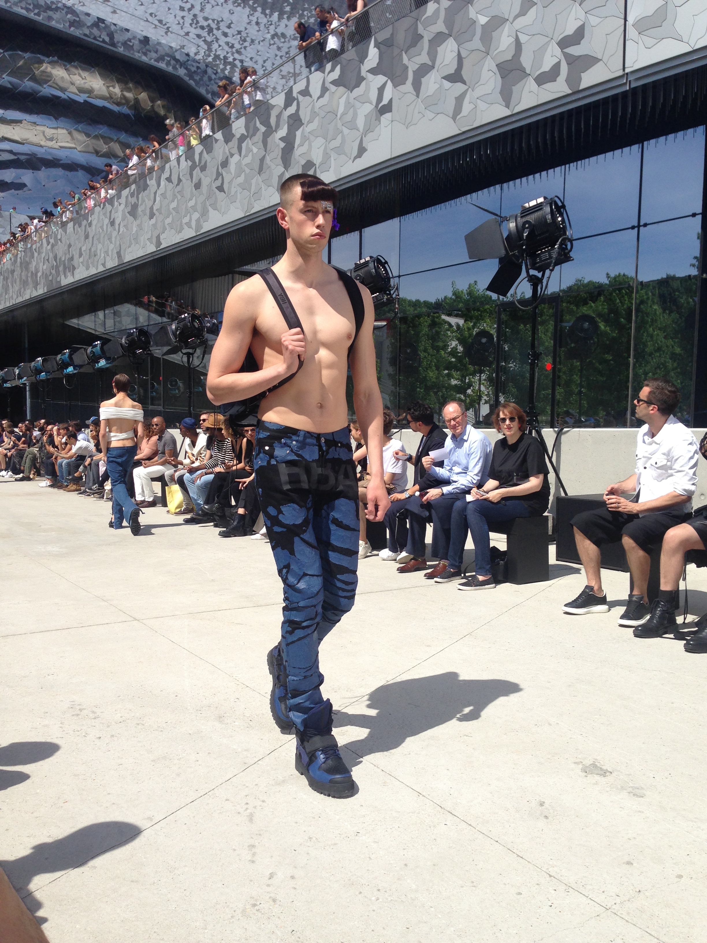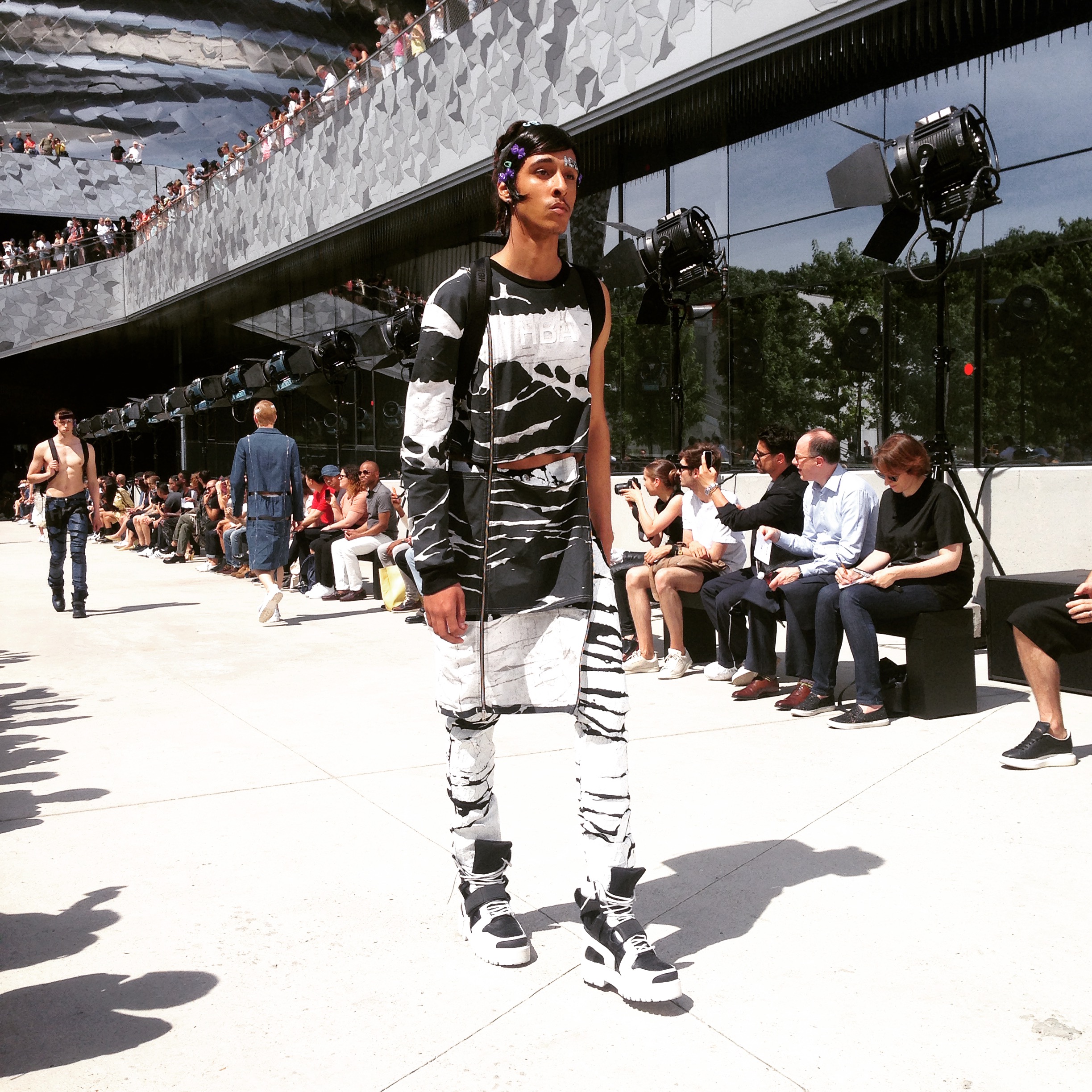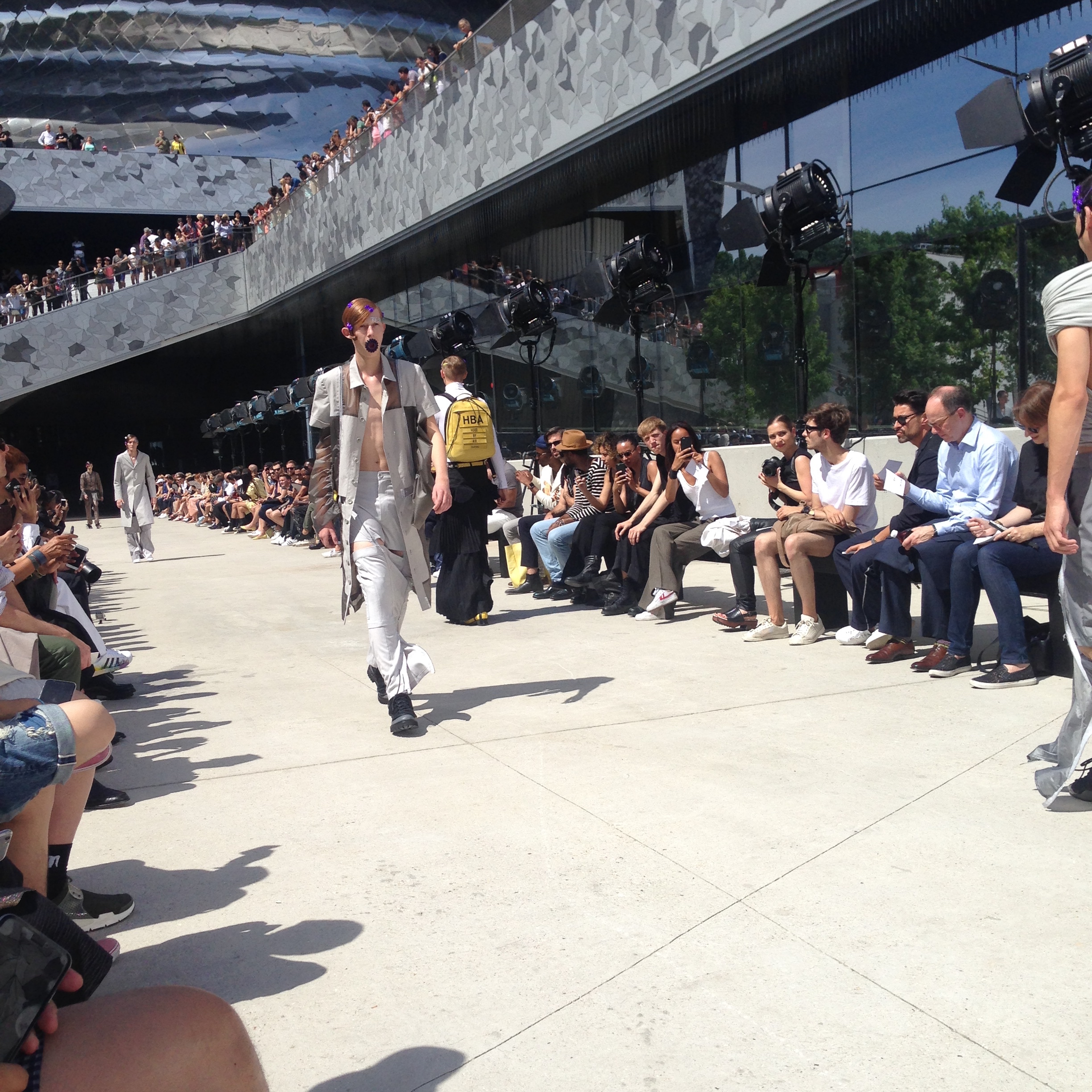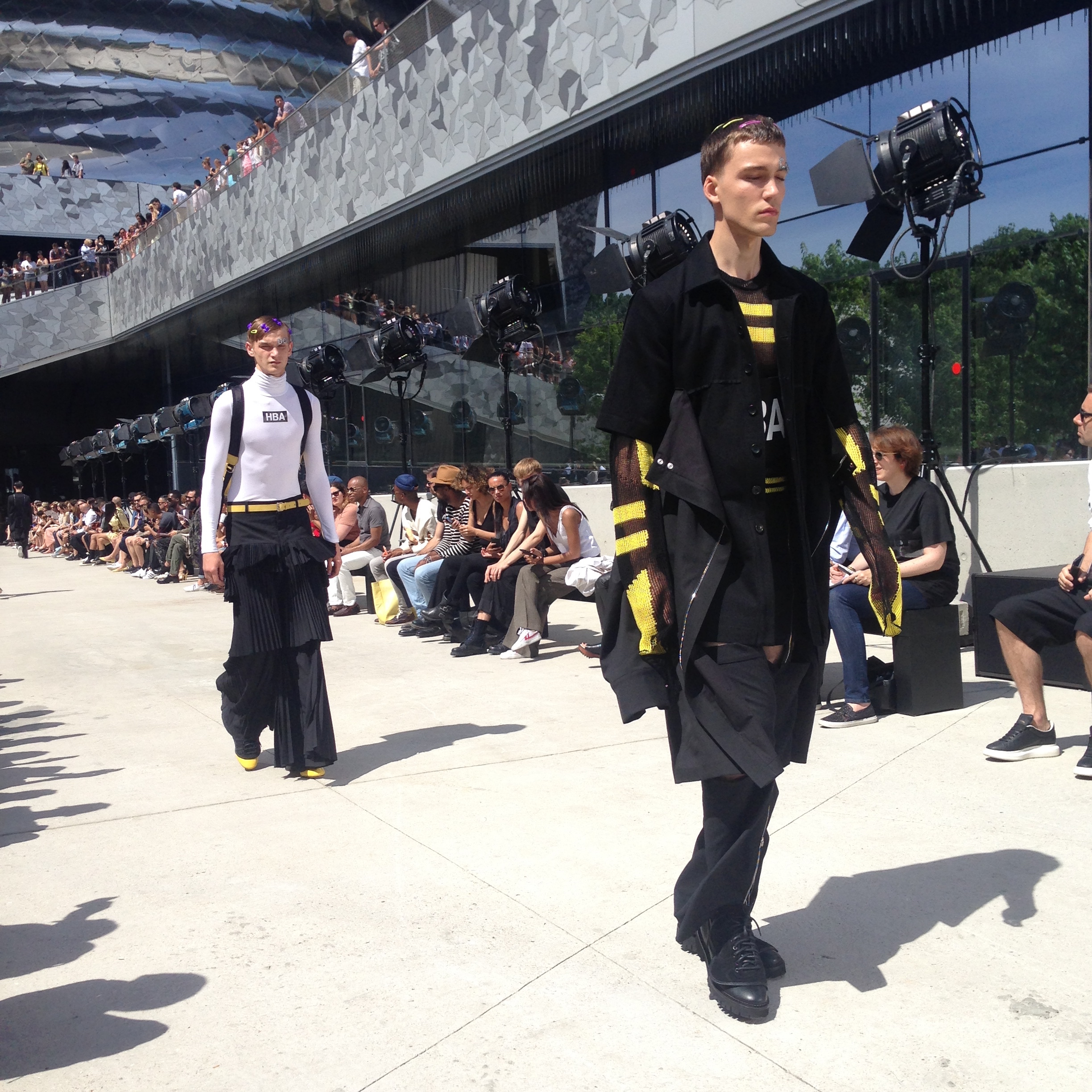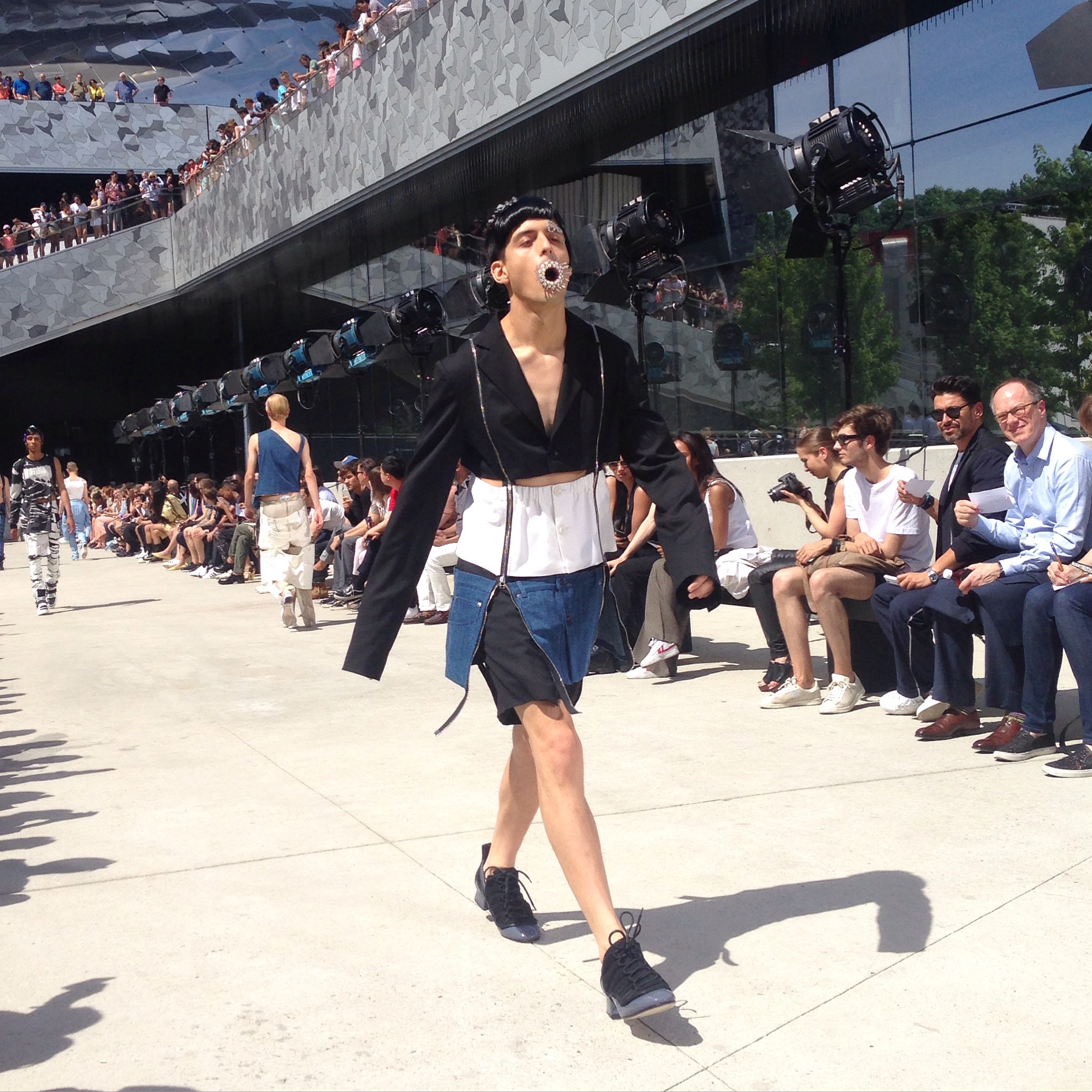 American label Hood by Air shows its men’s collection in Paris. Hood by Air, the up-and-coming label from New York, shows its men’s collection in Paris, with the undulating Philharmonie building as backdrop. Designer Shayne Oliver likes to mix genres, going from Rnb to goth, from sporty to drag queen, from strapping to frail… Just like today’s youth, who are already fans of the label. For summer 2016, HBA men dare to wear everything, including hair clips and diamond rhinestones on eyelashes, and even mouth guards made of needles or pearls. Oliver cuts, detaches and reattaches. The pants split into three pieces and unzip, the top drapes, the purple leather expands, the jeans crackle, the hand accessory is worn like a boxing glove. The “HBA” logo, already widely recognized and adopted, is found throughout the collection. Aware of the mix of cultures and the importance of streewear, Oliver mixes and plays with everything, isn’t afraid to surprise, experiments, and creates an “HBA” gang phenomenon…