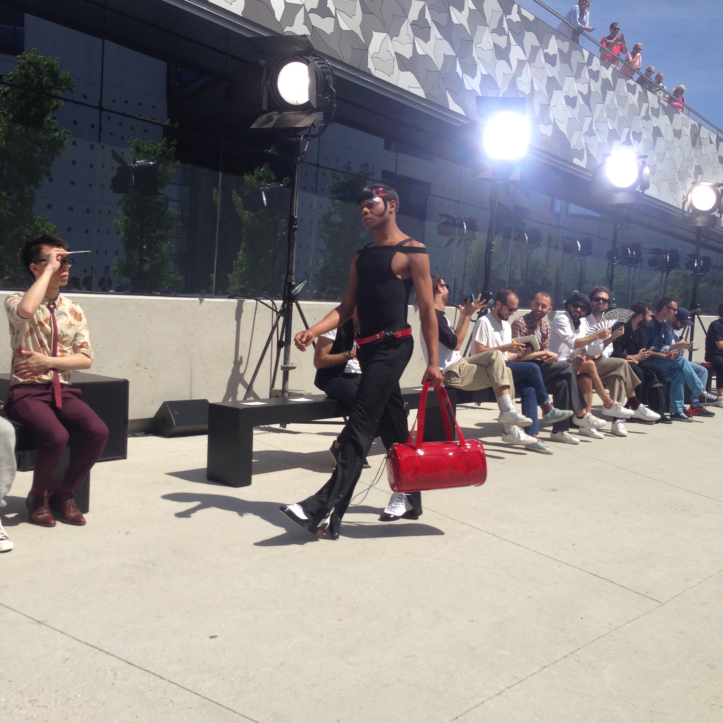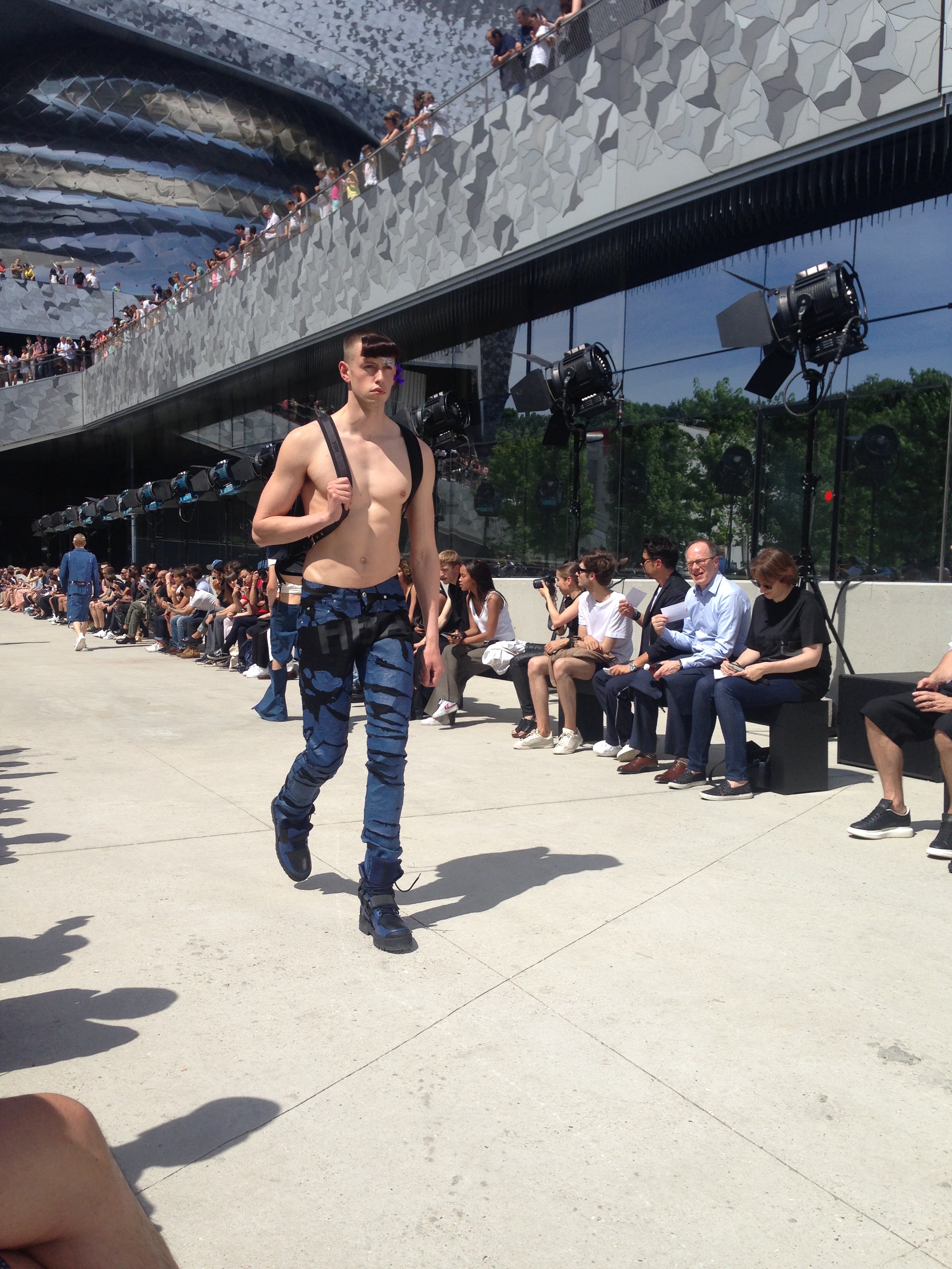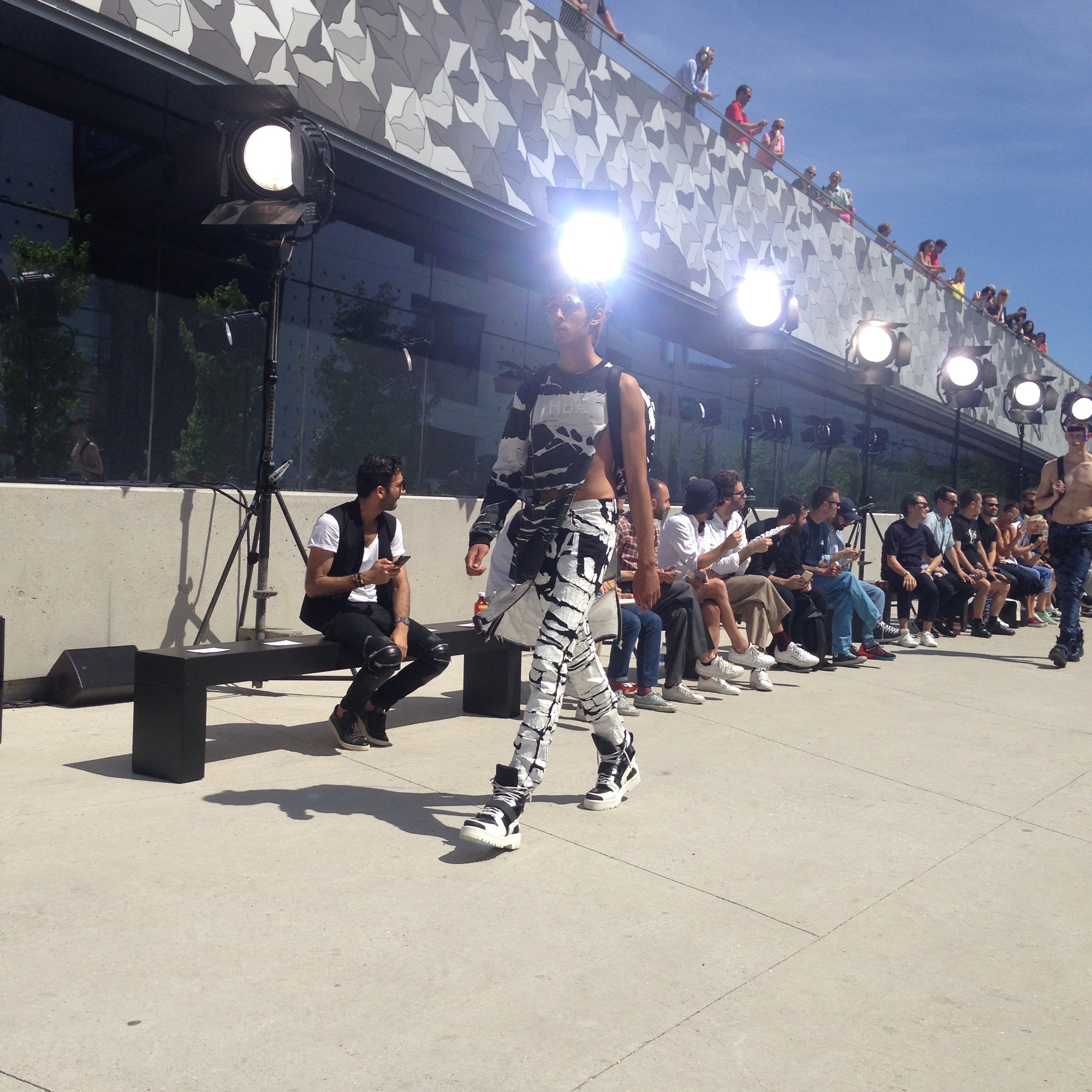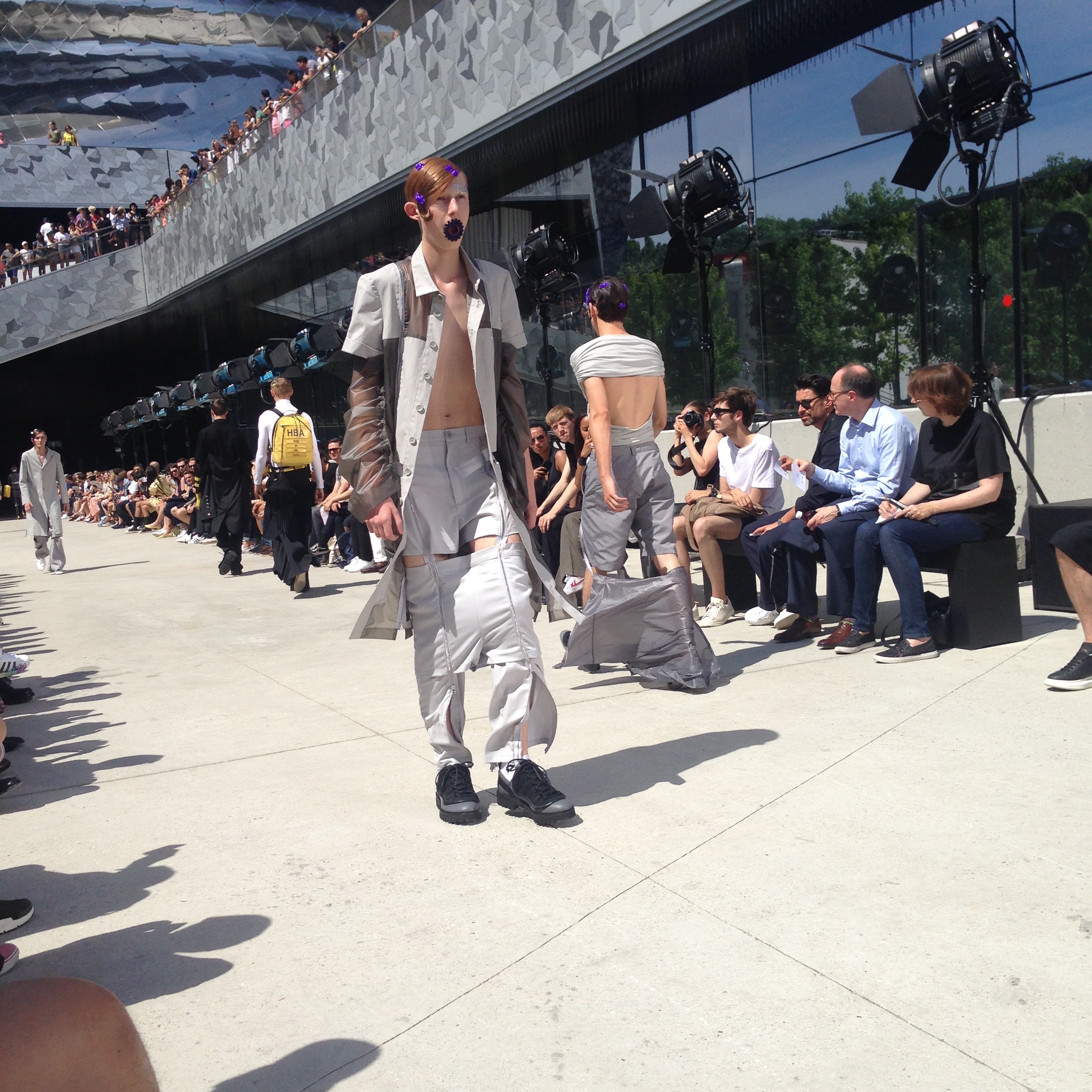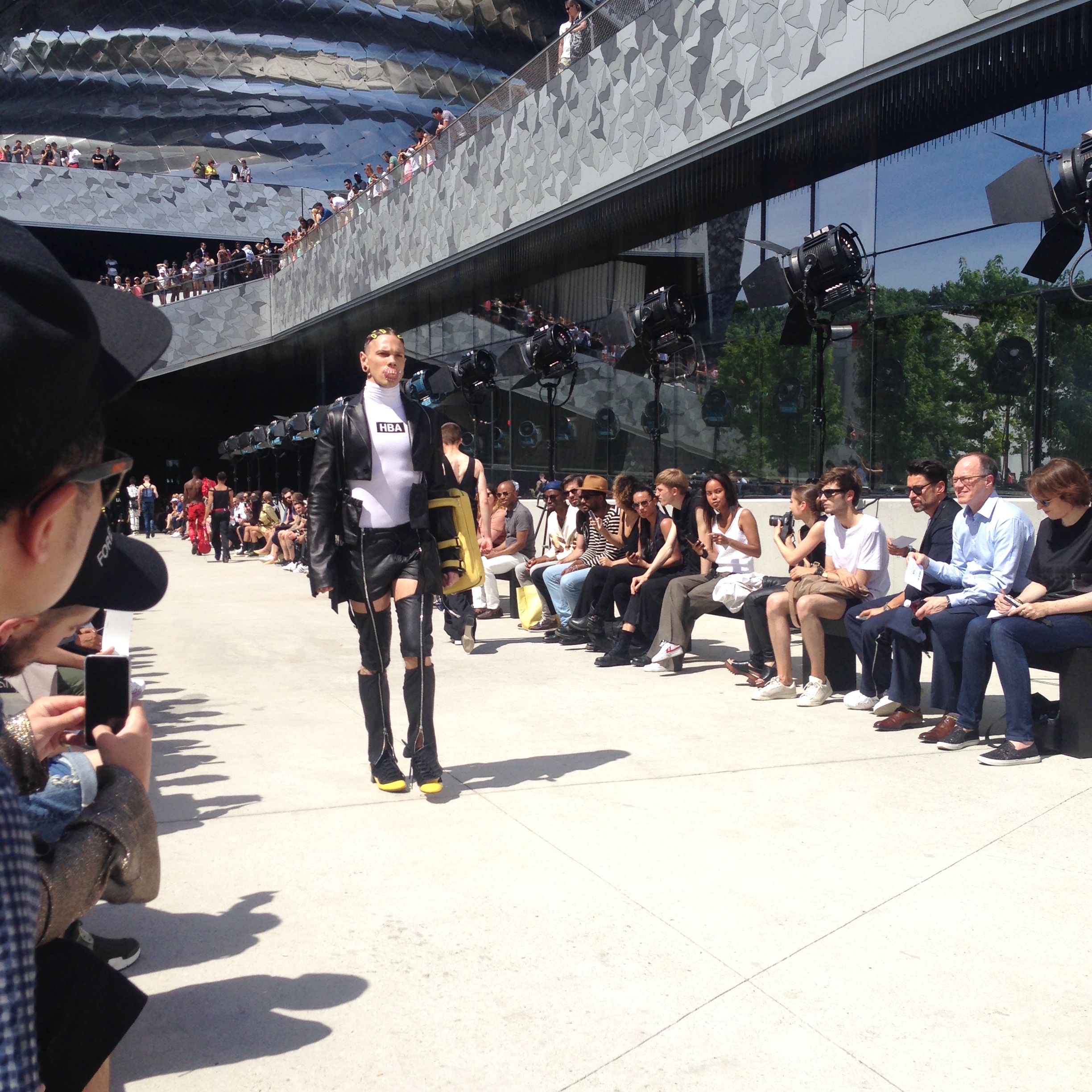 American label Hood by Air shows its men’s collection in Paris. Hood by Air, the up-and-coming label from New York, shows its men’s collection in Paris, with the undulating Philharmonie building as backdrop. Designer Shayne Oliver likes to mix genres, going from Rnb to goth, from sporty to drag queen, from strapping to frail… Just like today’s youth, who are already fans of the label. For summer 2016, HBA men dare to wear everything, including hair clips and diamond rhinestones on eyelashes, and even mouth guards made of needles or pearls. Oliver cuts, detaches and reattaches. The pants split into three pieces and unzip, the top drapes, the purple leather expands, the jeans crackle, the hand accessory is worn like a boxing glove. The “HBA” logo, already widely recognized and adopted, is found throughout the collection. Aware of the mix of cultures and the importance of streewear, Oliver mixes and plays with everything, isn’t afraid to surprise, experiments, and creates an “HBA” gang phenomenon…