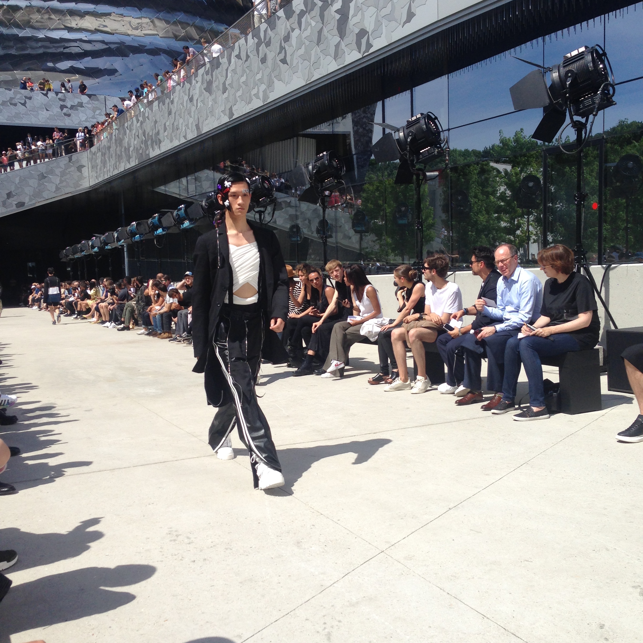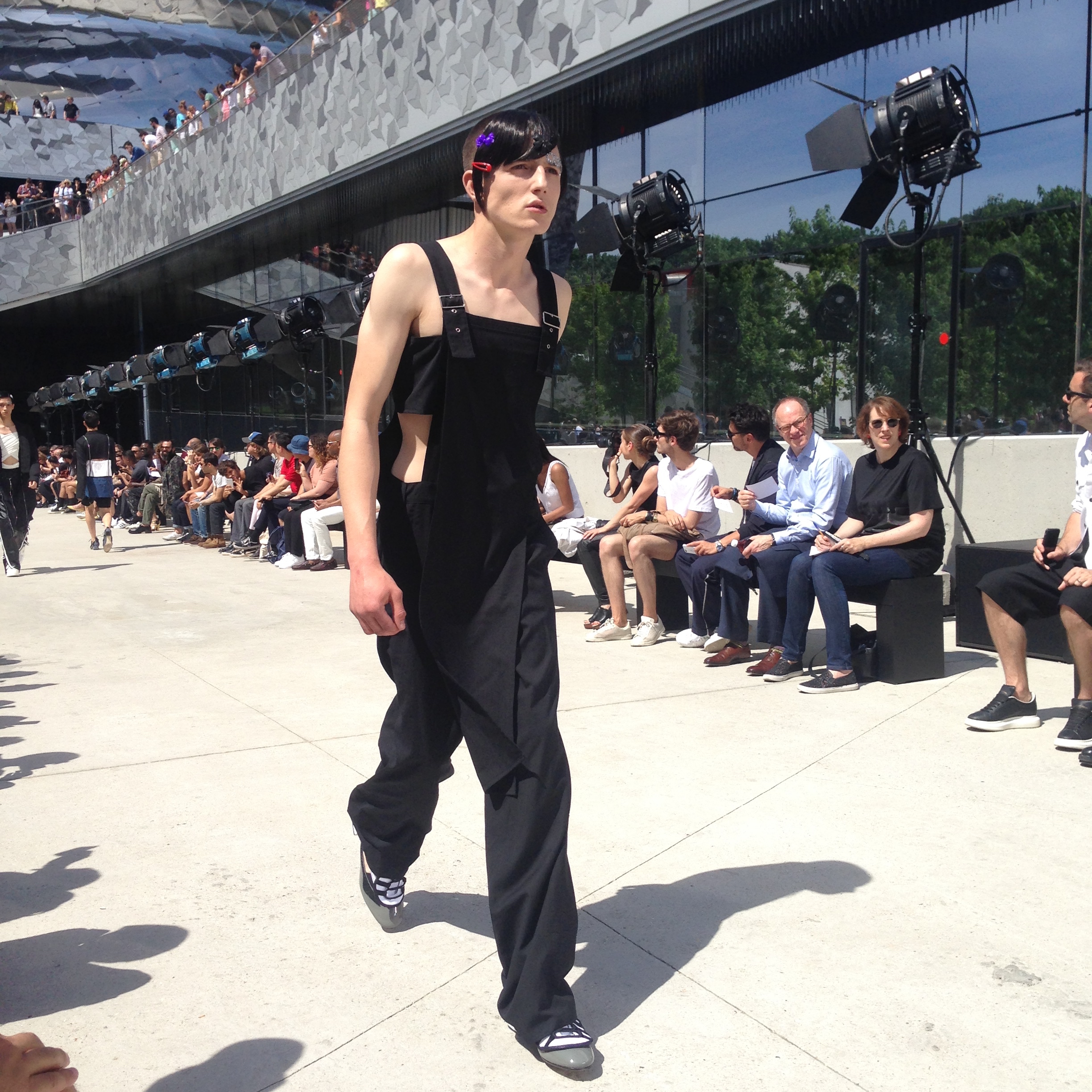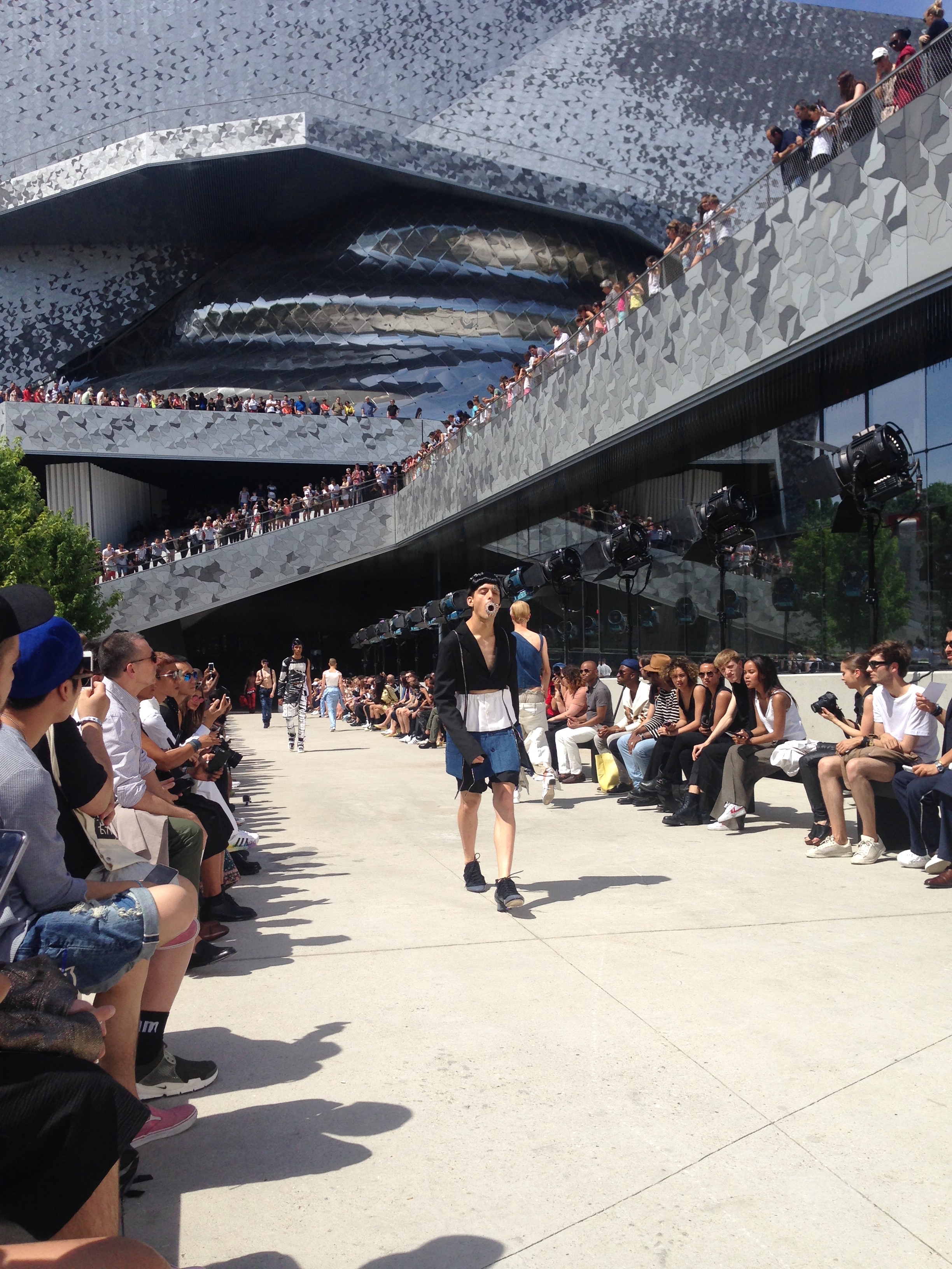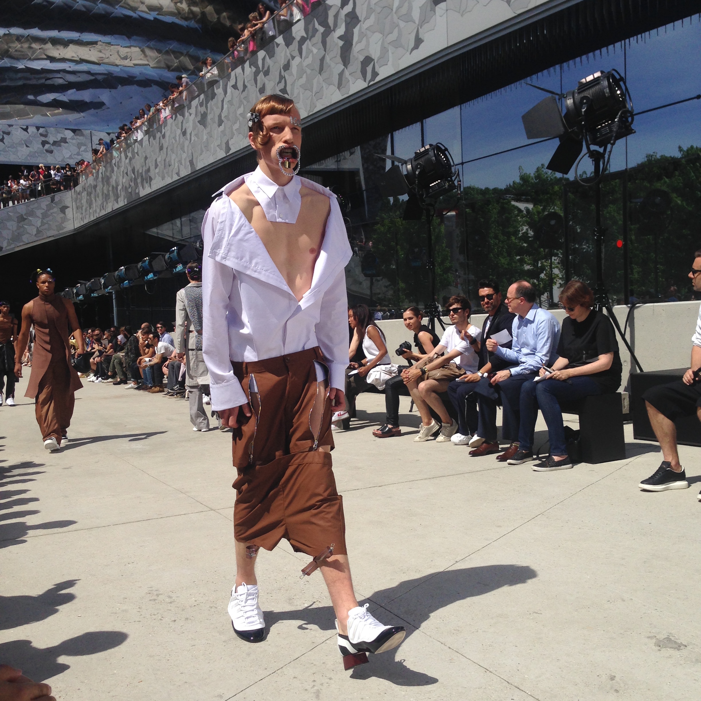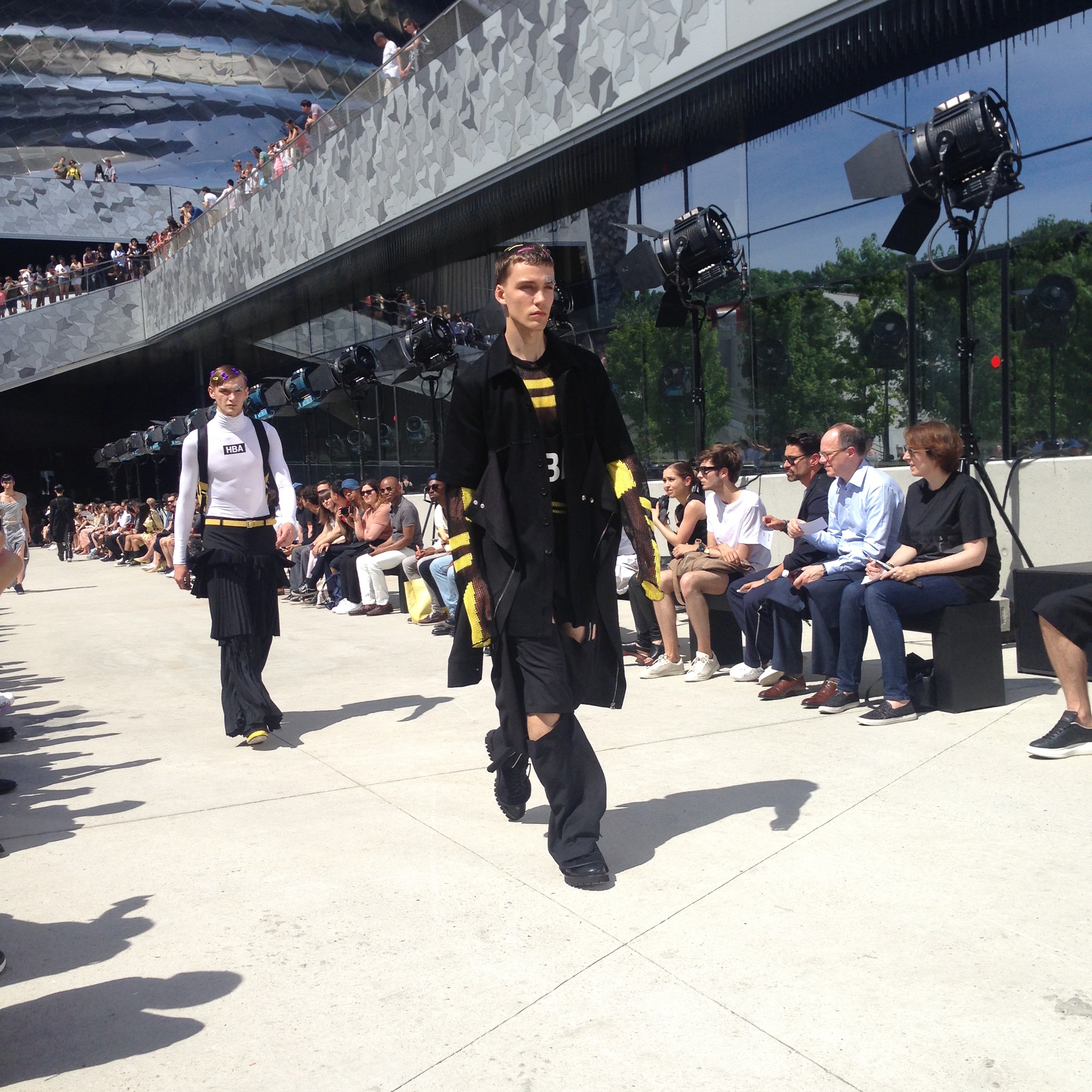 American label Hood by Air shows its men’s collection in Paris. Hood by Air, the up-and-coming label from New York, shows its men’s collection in Paris, with the undulating Philharmonie building as backdrop. Designer Shayne Oliver likes to mix genres, going from Rnb to goth, from sporty to drag queen, from strapping to frail… Just like today’s youth, who are already fans of the label. For summer 2016, HBA men dare to wear everything, including hair clips and diamond rhinestones on eyelashes, and even mouth guards made of needles or pearls. Oliver cuts, detaches and reattaches. The pants split into three pieces and unzip, the top drapes, the purple leather expands, the jeans crackle, the hand accessory is worn like a boxing glove. The “HBA” logo, already widely recognized and adopted, is found throughout the collection. Aware of the mix of cultures and the importance of streewear, Oliver mixes and plays with everything, isn’t afraid to surprise, experiments, and creates an “HBA” gang phenomenon…