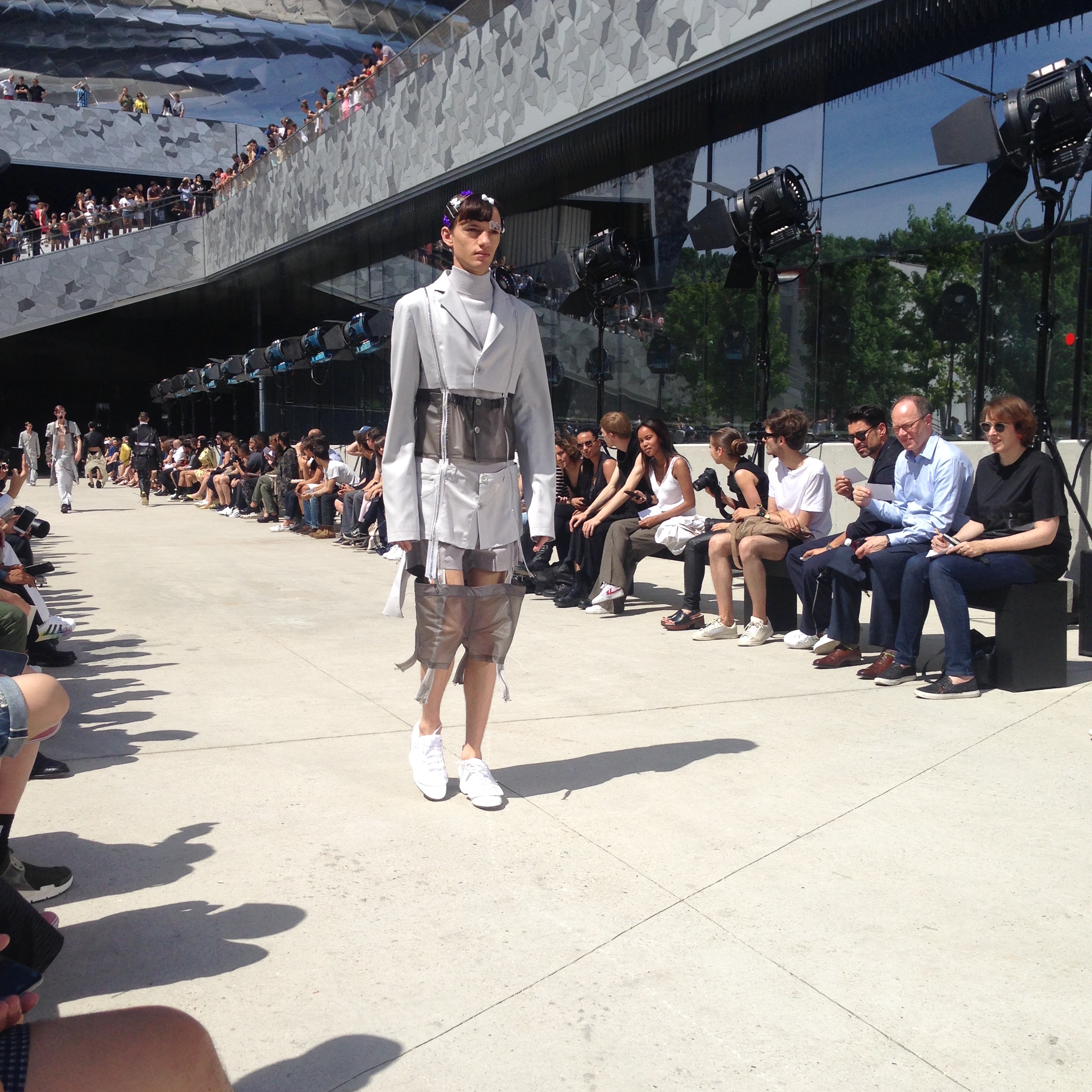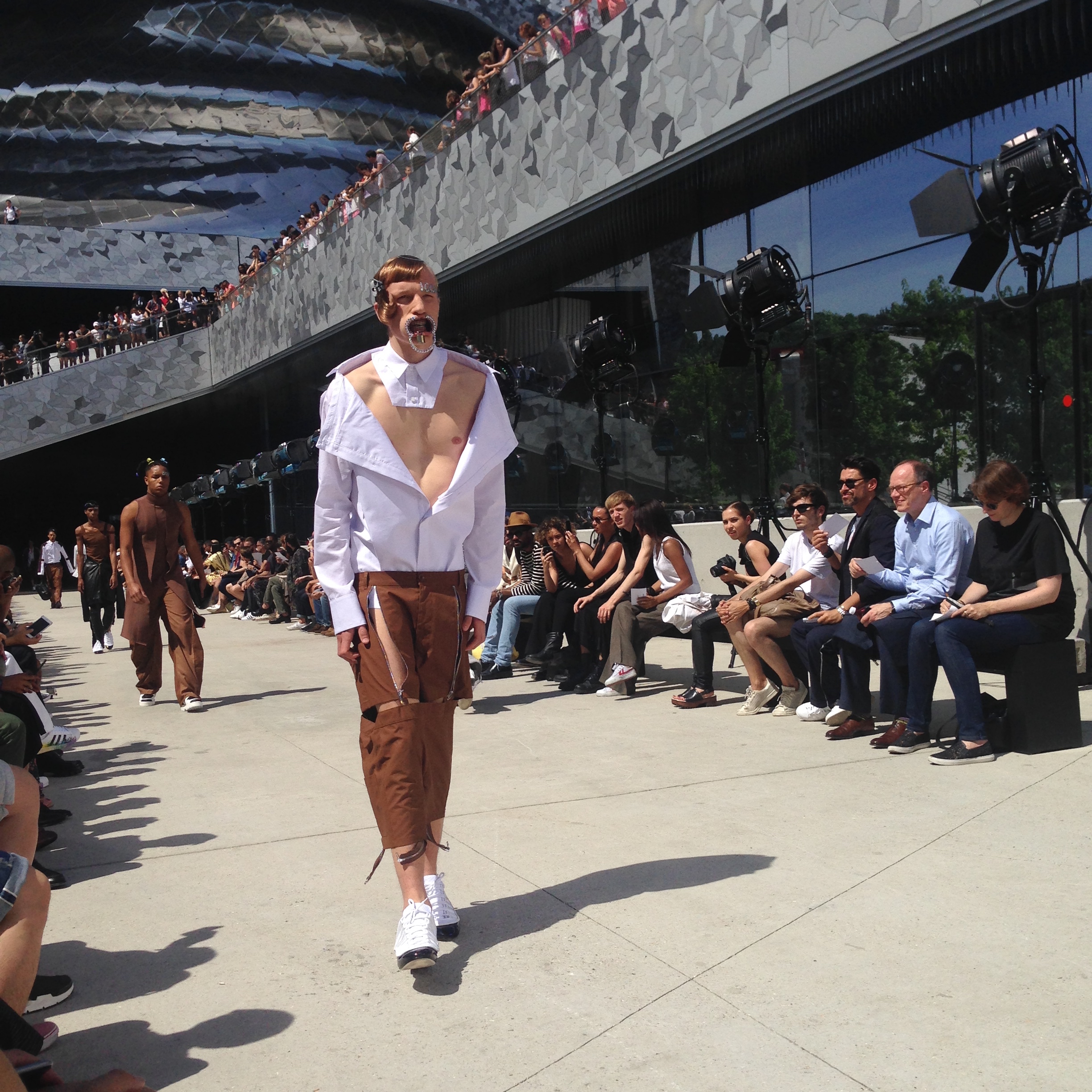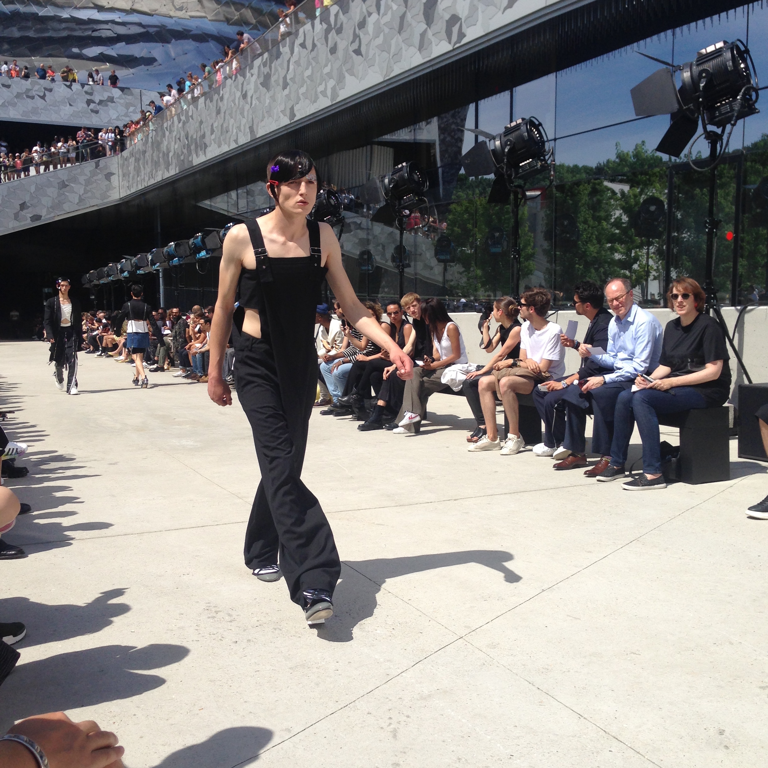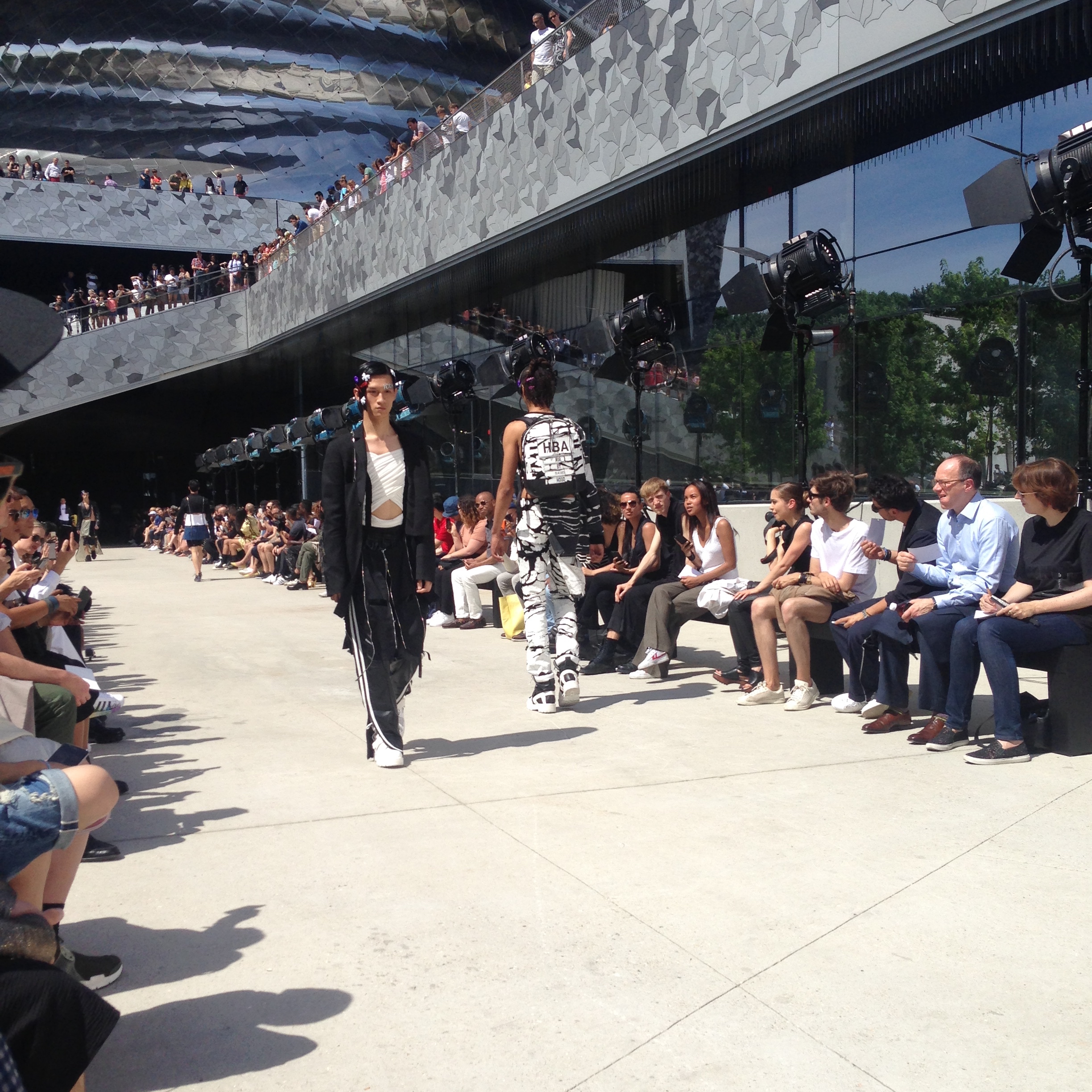 American label Hood by Air shows its men’s collection in Paris. Hood by Air, the up-and-coming label from New York, shows its men’s collection in Paris, with the undulating Philharmonie building as backdrop. Designer Shayne Oliver likes to mix genres, going from Rnb to goth, from sporty to drag queen, from strapping to frail… Just like today’s youth, who are already fans of the label. For summer 2016, HBA men dare to wear everything, including hair clips and diamond rhinestones on eyelashes, and even mouth guards made of needles or pearls. Oliver cuts, detaches and reattaches. The pants split into three pieces and unzip, the top drapes, the purple leather expands, the jeans crackle, the hand accessory is worn like a boxing glove. The “HBA” logo, already widely recognized and adopted, is found throughout the collection. Aware of the mix of cultures and the importance of streewear, Oliver mixes and plays with everything, isn’t afraid to surprise, experiments, and creates an “HBA” gang phenomenon…