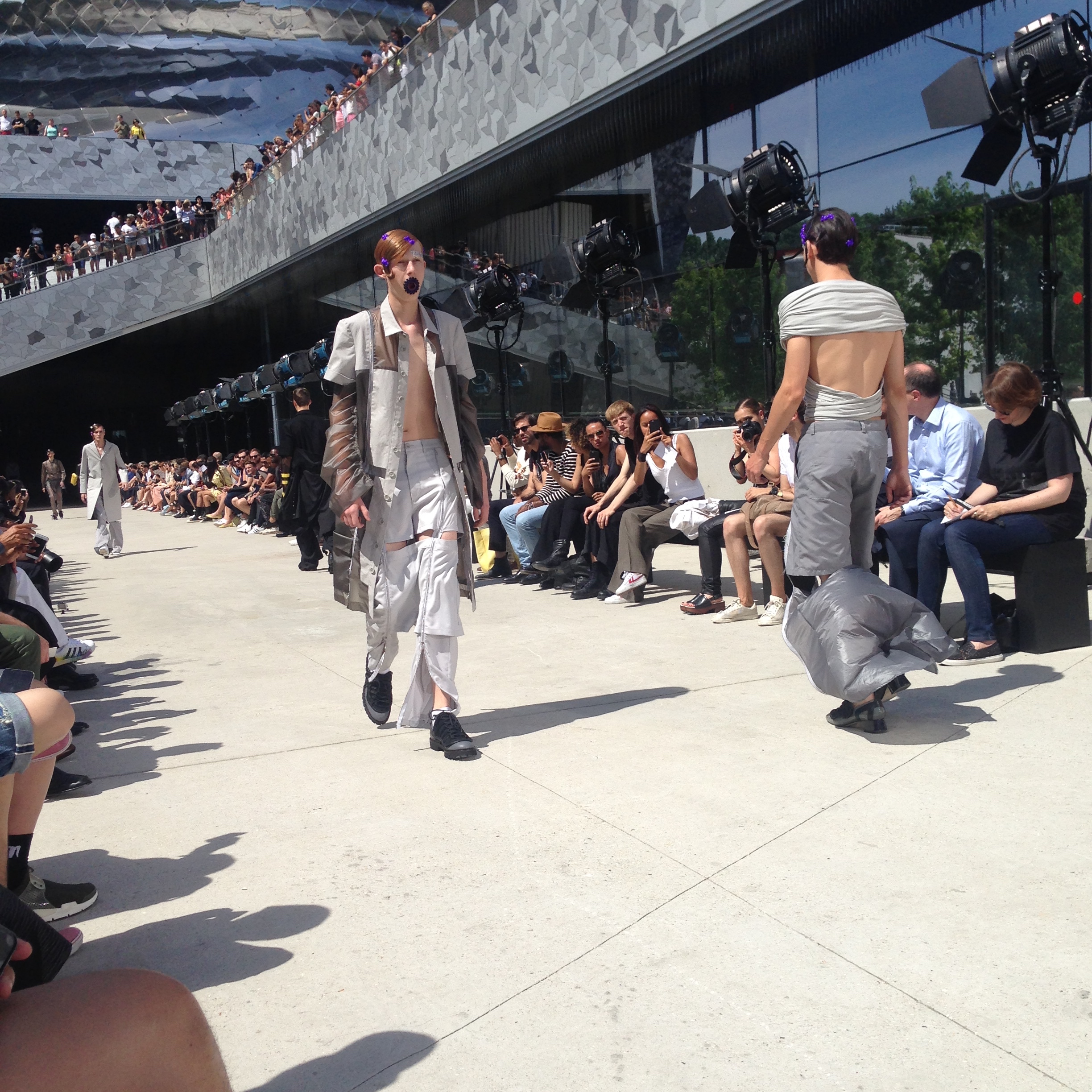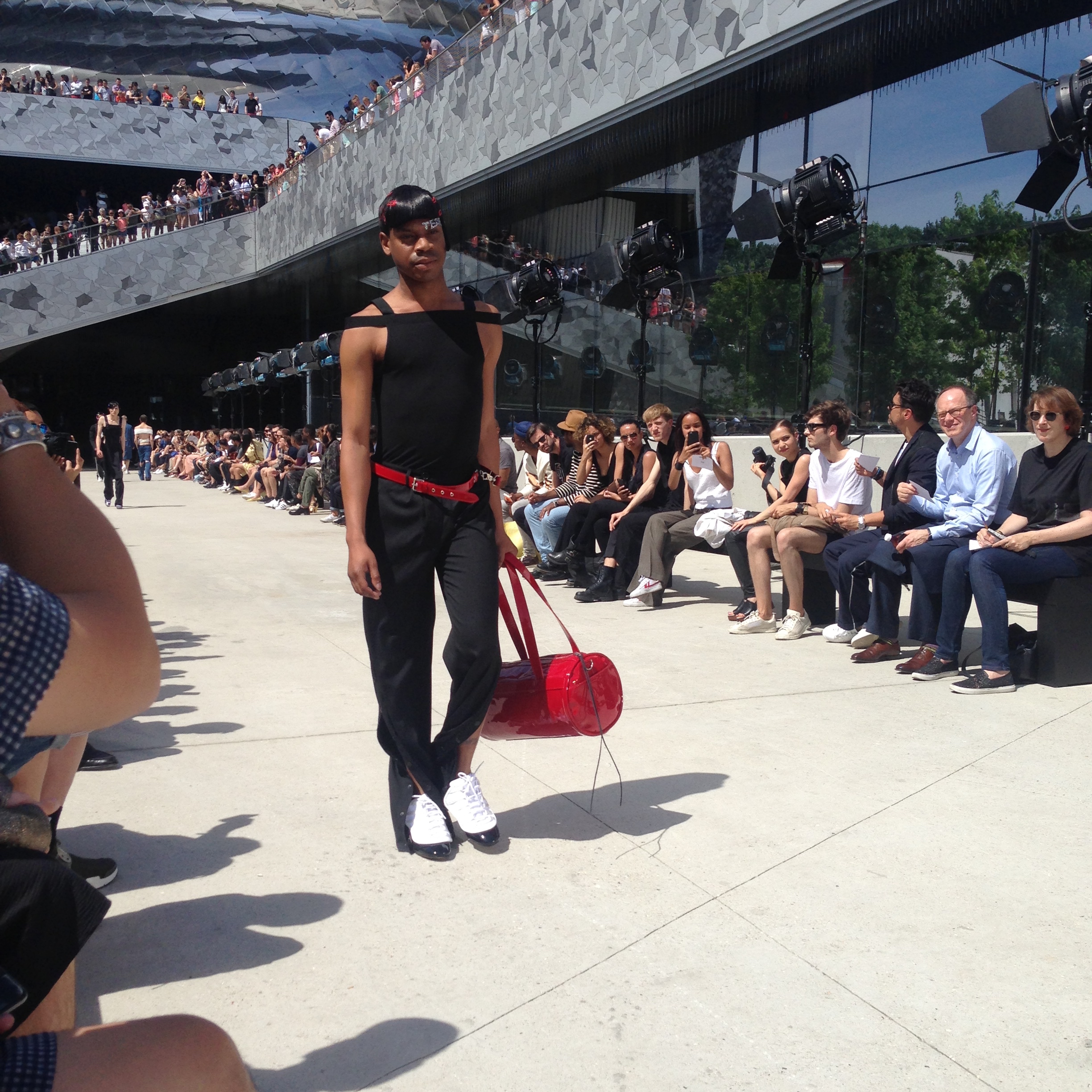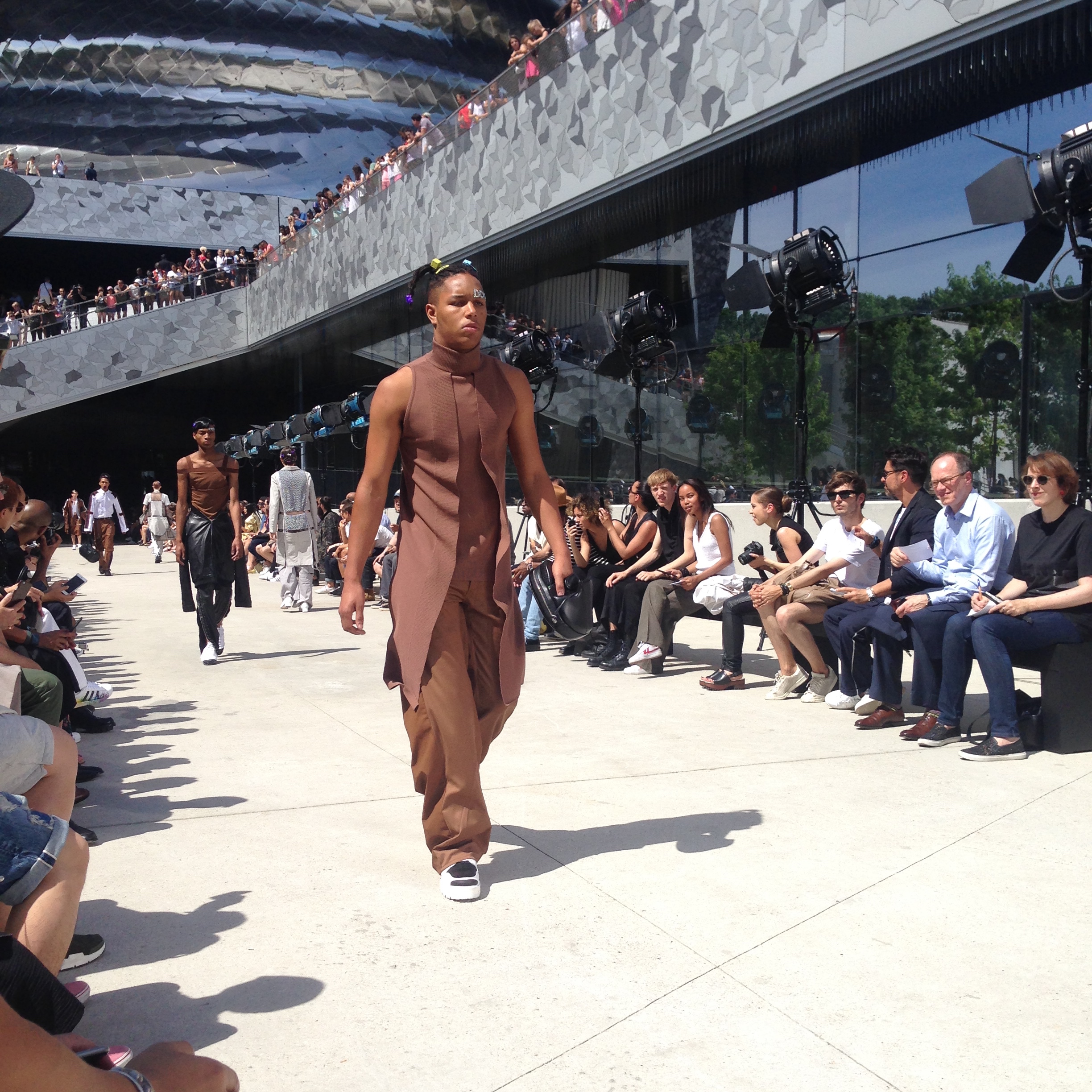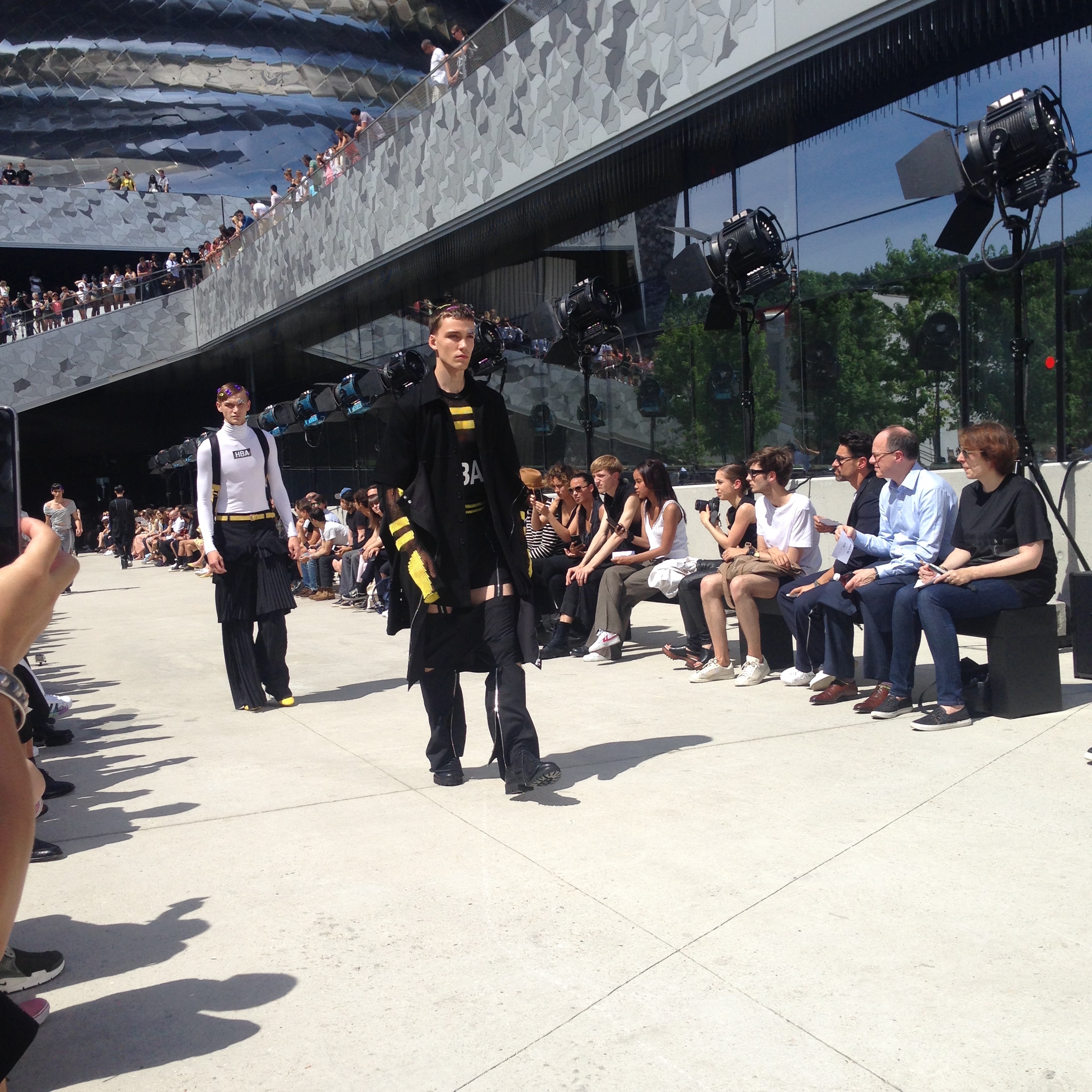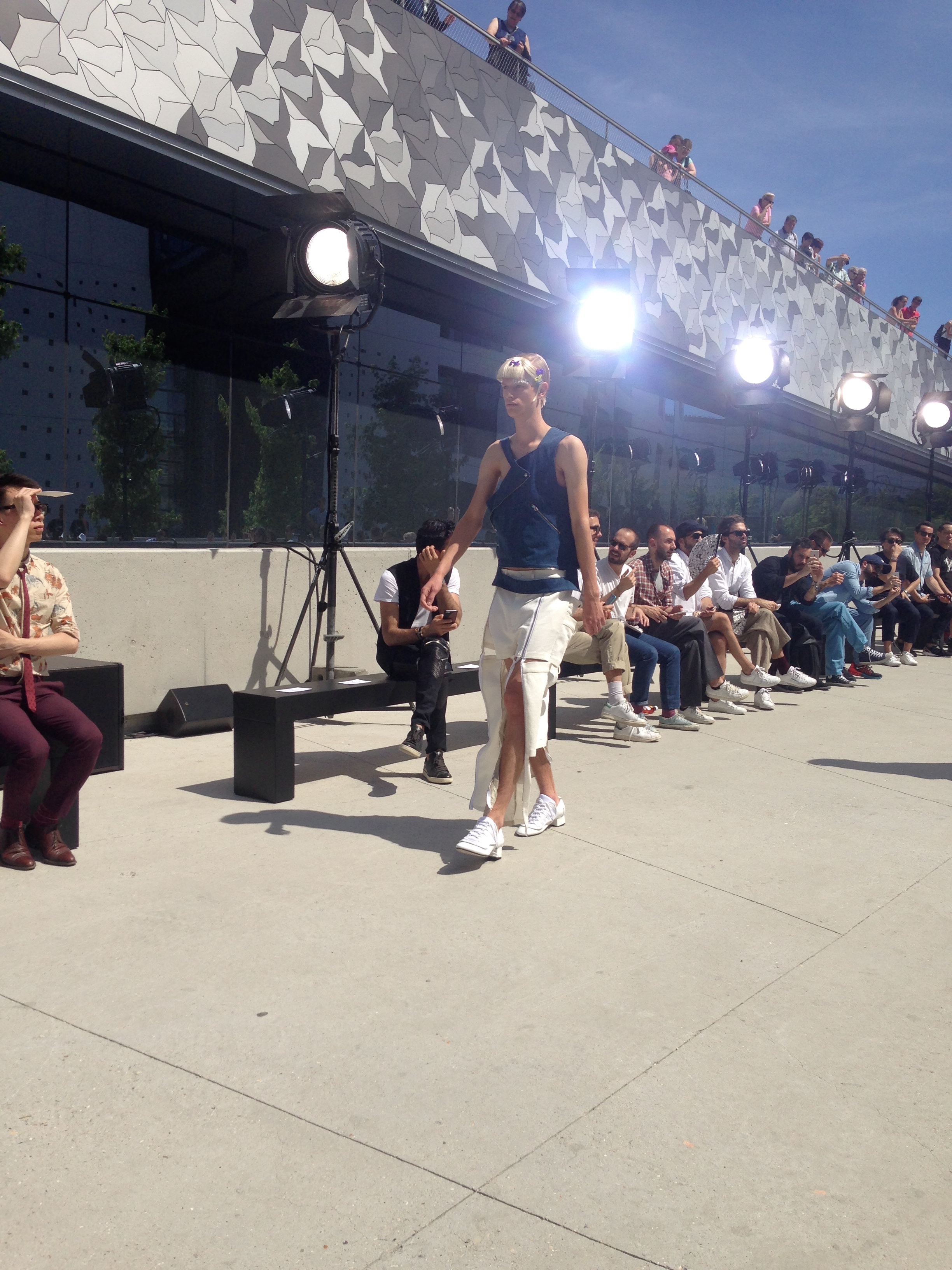 American label Hood by Air shows its men’s collection in Paris. Hood by Air, the up-and-coming label from New York, shows its men’s collection in Paris, with the undulating Philharmonie building as backdrop. Designer Shayne Oliver likes to mix genres, going from Rnb to goth, from sporty to drag queen, from strapping to frail… Just like today’s youth, who are already fans of the label. For summer 2016, HBA men dare to wear everything, including hair clips and diamond rhinestones on eyelashes, and even mouth guards made of needles or pearls. Oliver cuts, detaches and reattaches. The pants split into three pieces and unzip, the top drapes, the purple leather expands, the jeans crackle, the hand accessory is worn like a boxing glove. The “HBA” logo, already widely recognized and adopted, is found throughout the collection. Aware of the mix of cultures and the importance of streewear, Oliver mixes and plays with everything, isn’t afraid to surprise, experiments, and creates an “HBA” gang phenomenon…