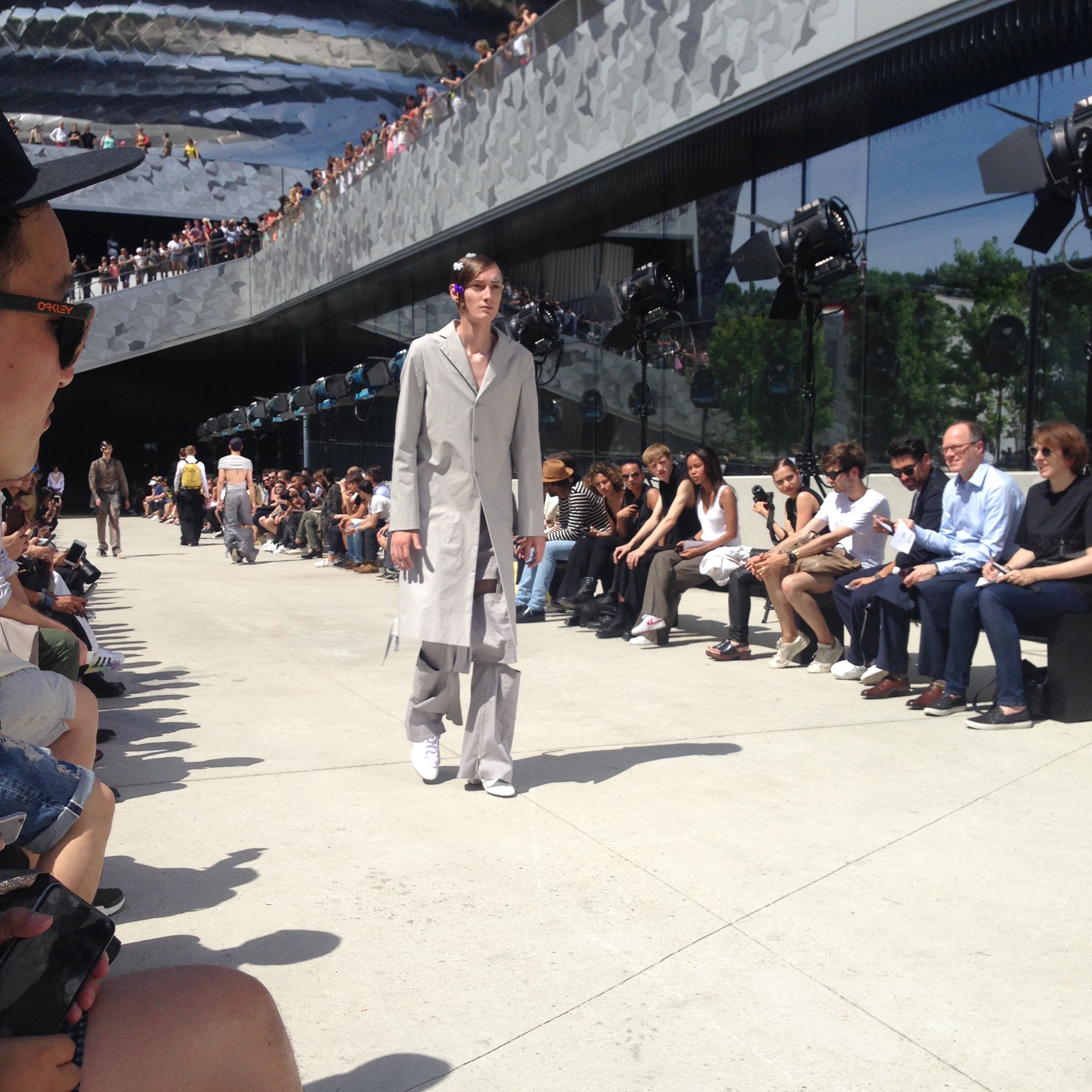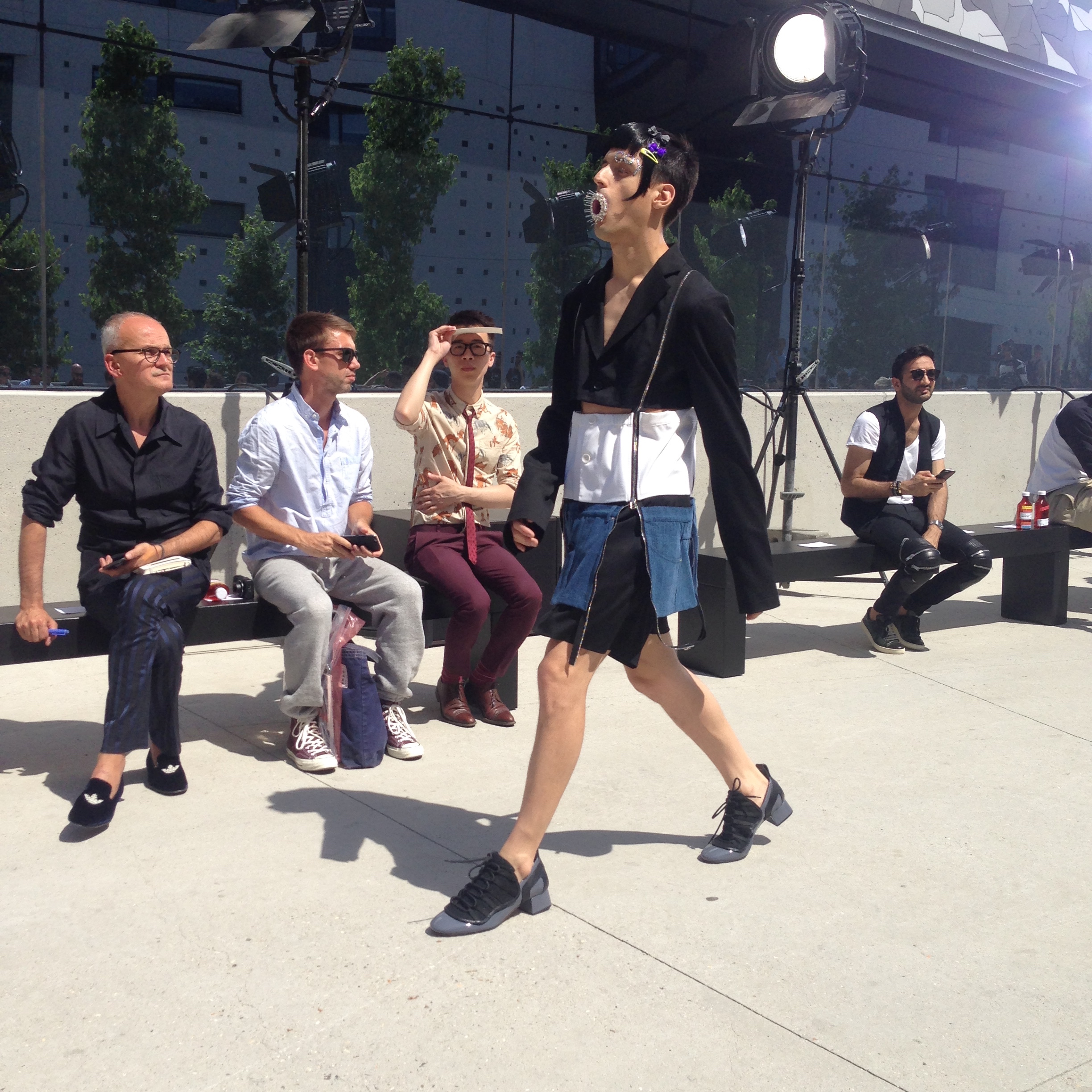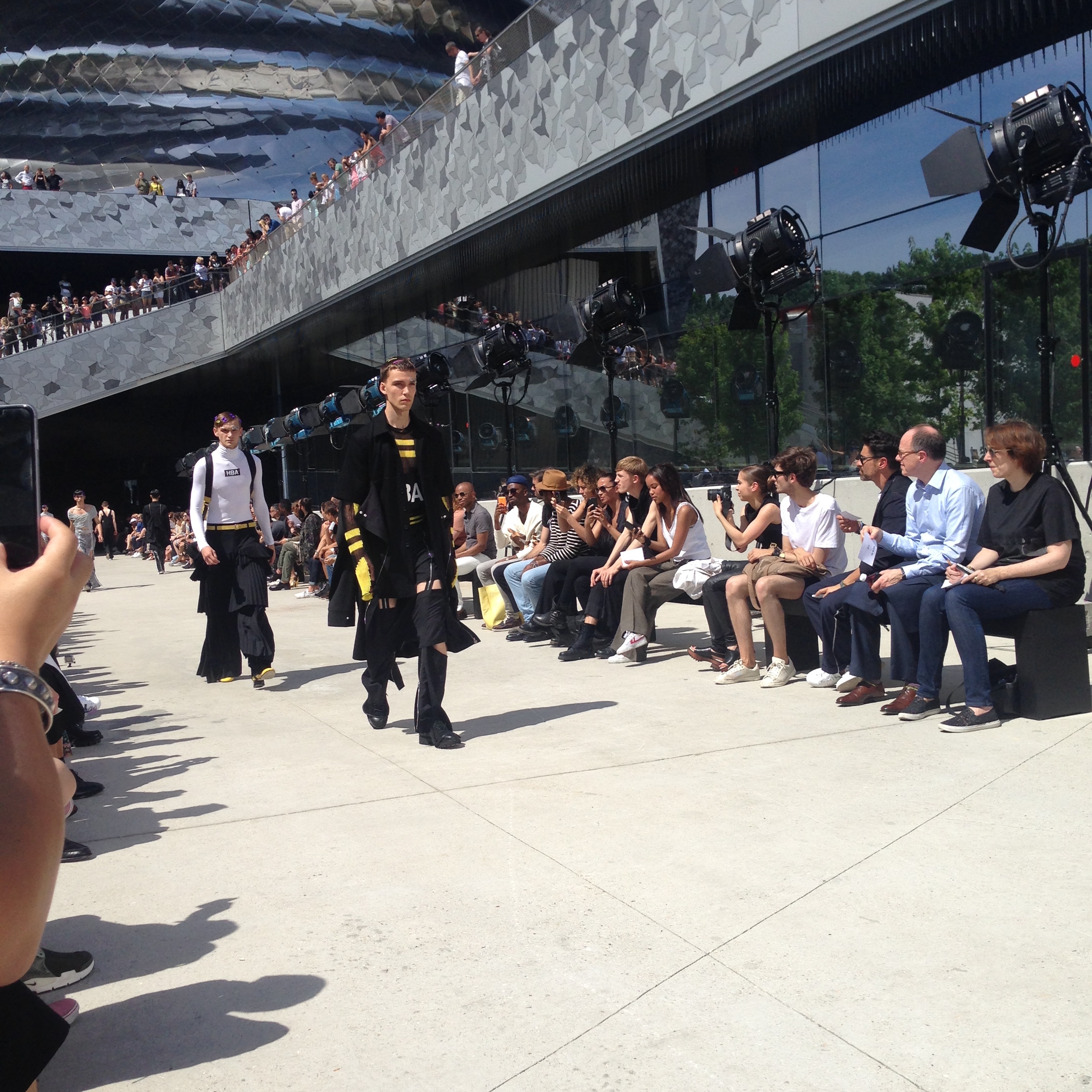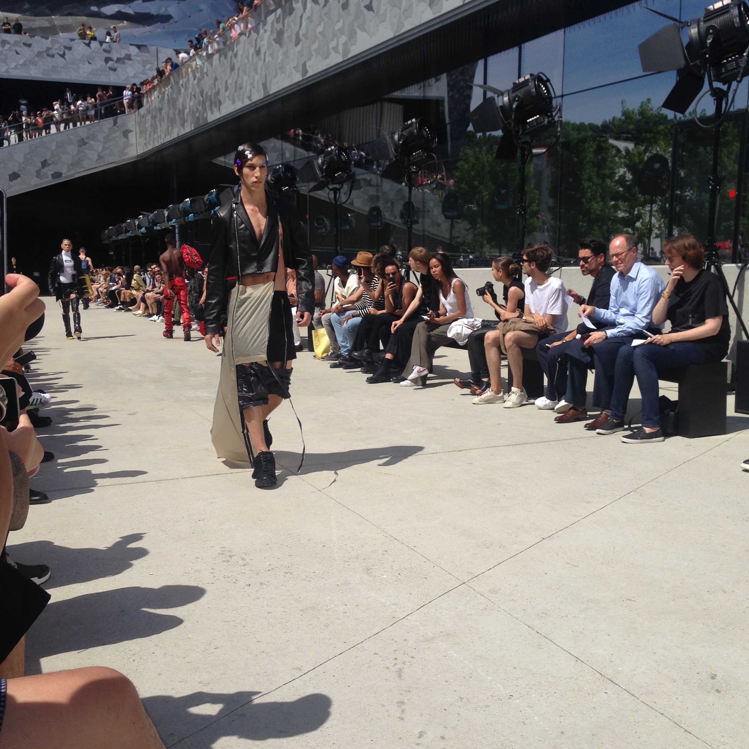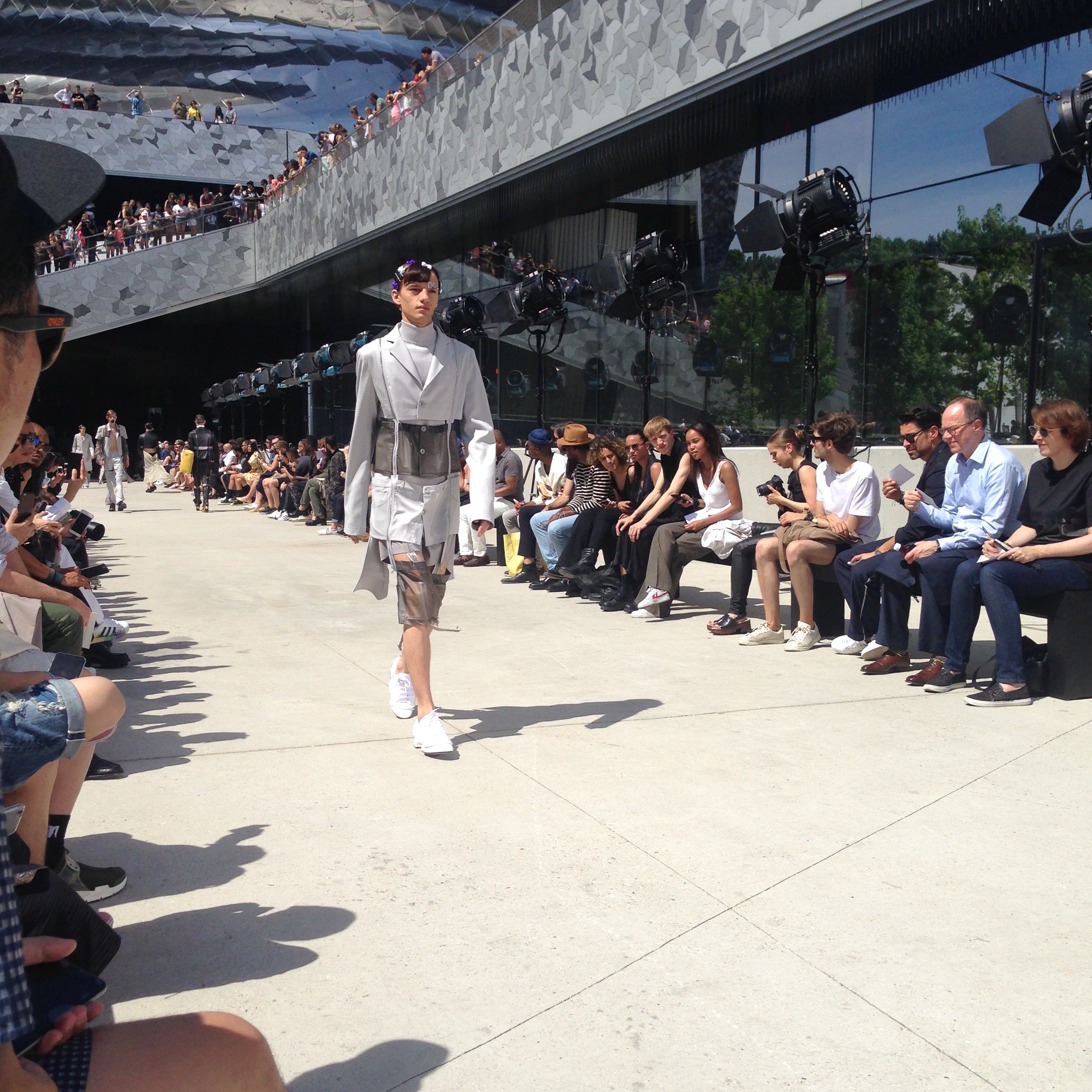 American label Hood by Air shows its men’s collection in Paris. Hood by Air, the up-and-coming label from New York, shows its men’s collection in Paris, with the undulating Philharmonie building as backdrop. Designer Shayne Oliver likes to mix genres, going from Rnb to goth, from sporty to drag queen, from strapping to frail… Just like today’s youth, who are already fans of the label. For summer 2016, HBA men dare to wear everything, including hair clips and diamond rhinestones on eyelashes, and even mouth guards made of needles or pearls. Oliver cuts, detaches and reattaches. The pants split into three pieces and unzip, the top drapes, the purple leather expands, the jeans crackle, the hand accessory is worn like a boxing glove. The “HBA” logo, already widely recognized and adopted, is found throughout the collection. Aware of the mix of cultures and the importance of streewear, Oliver mixes and plays with everything, isn’t afraid to surprise, experiments, and creates an “HBA” gang phenomenon…