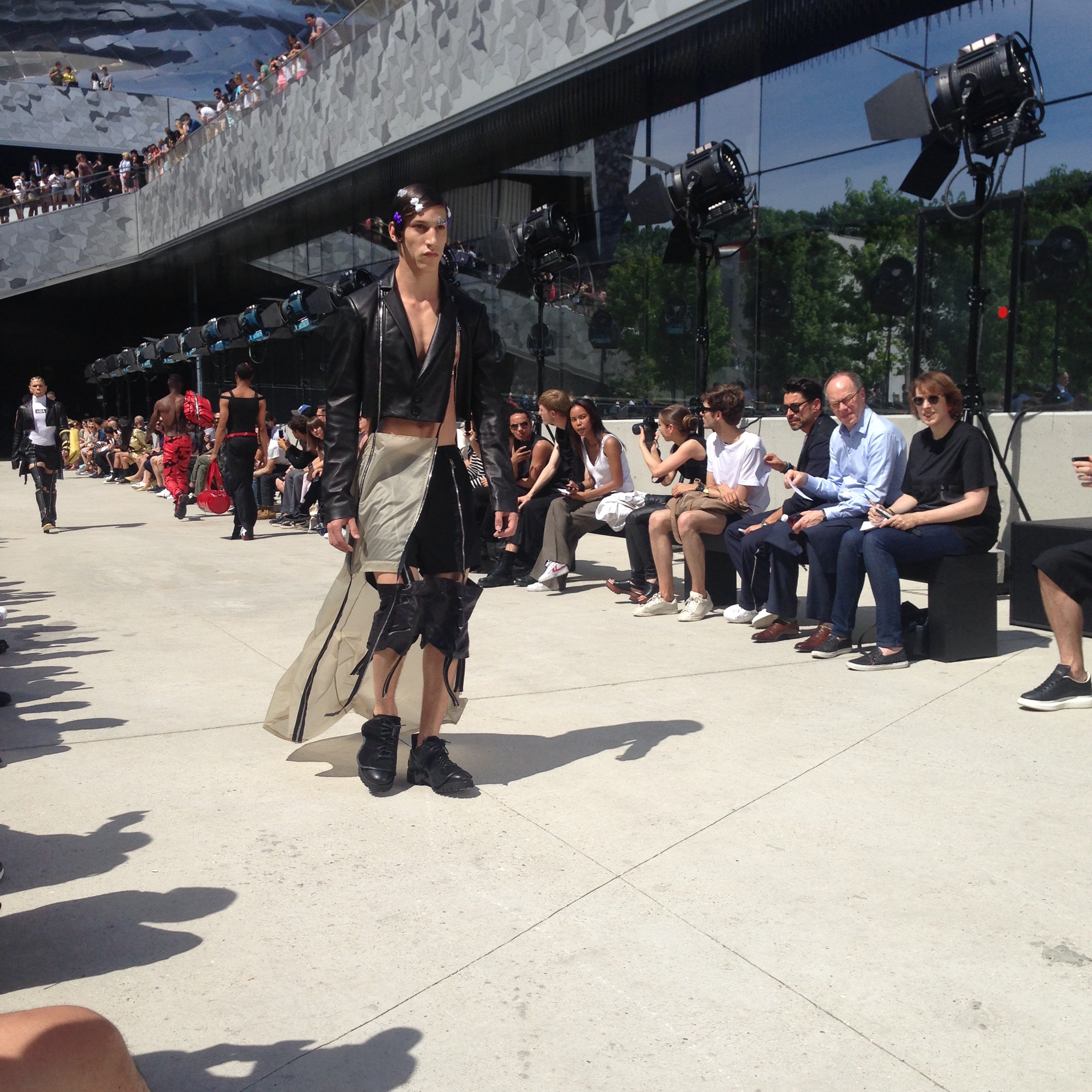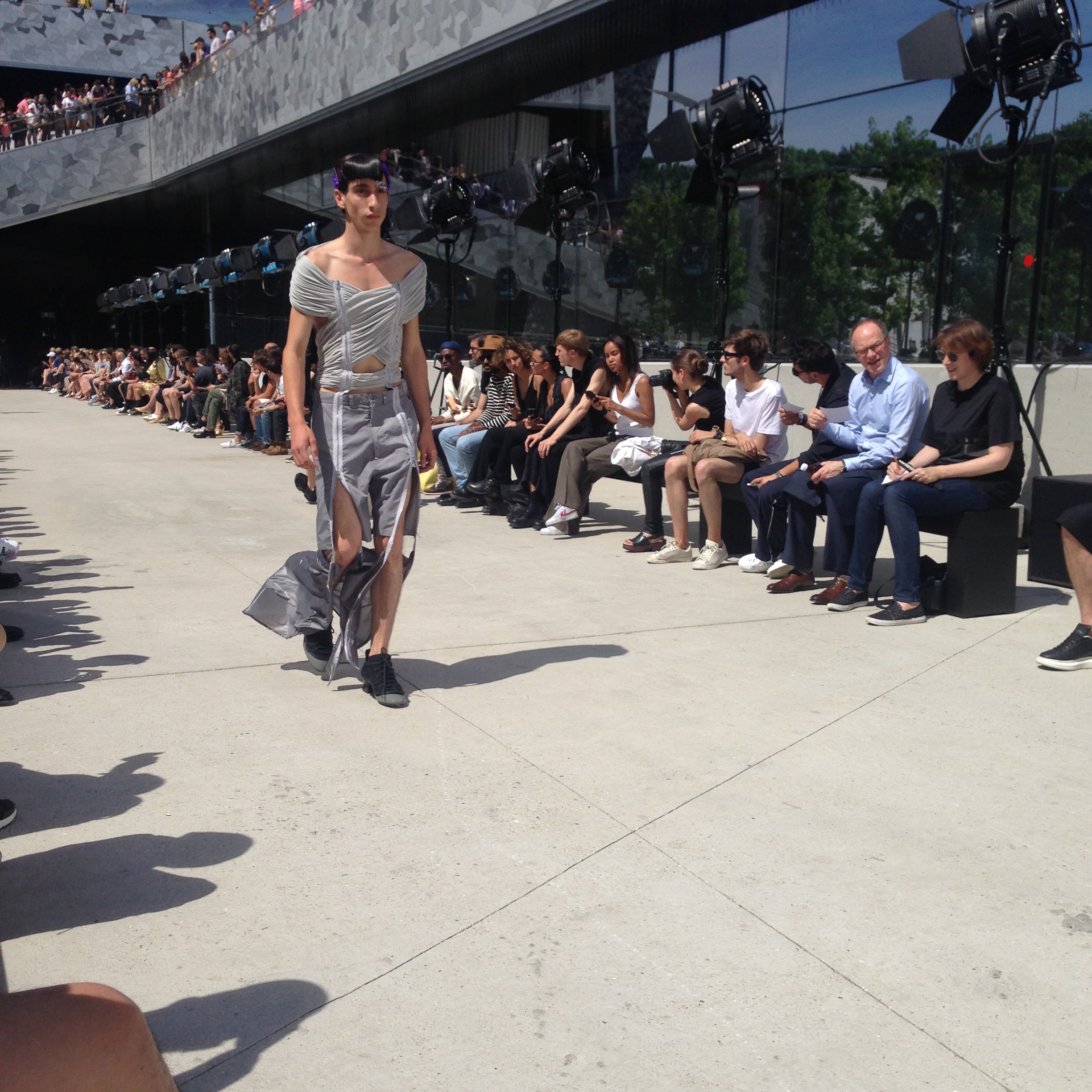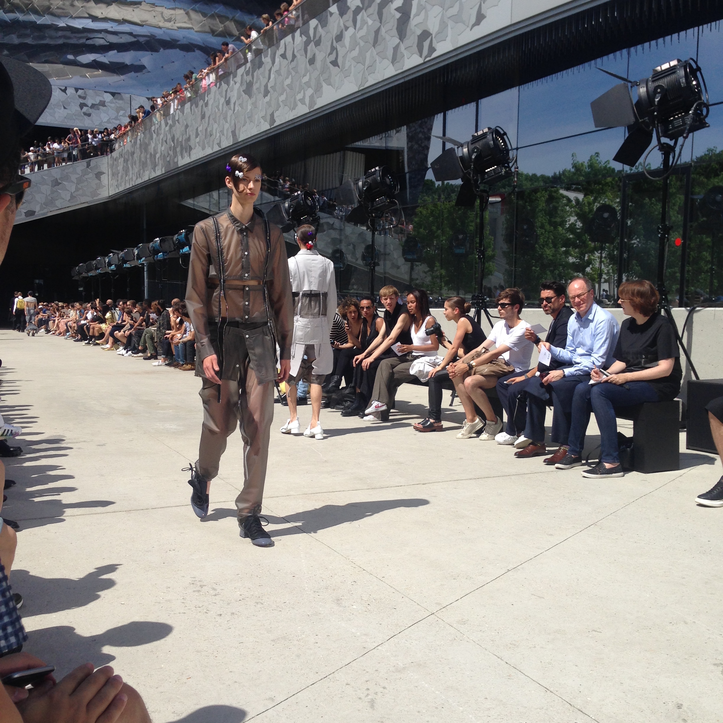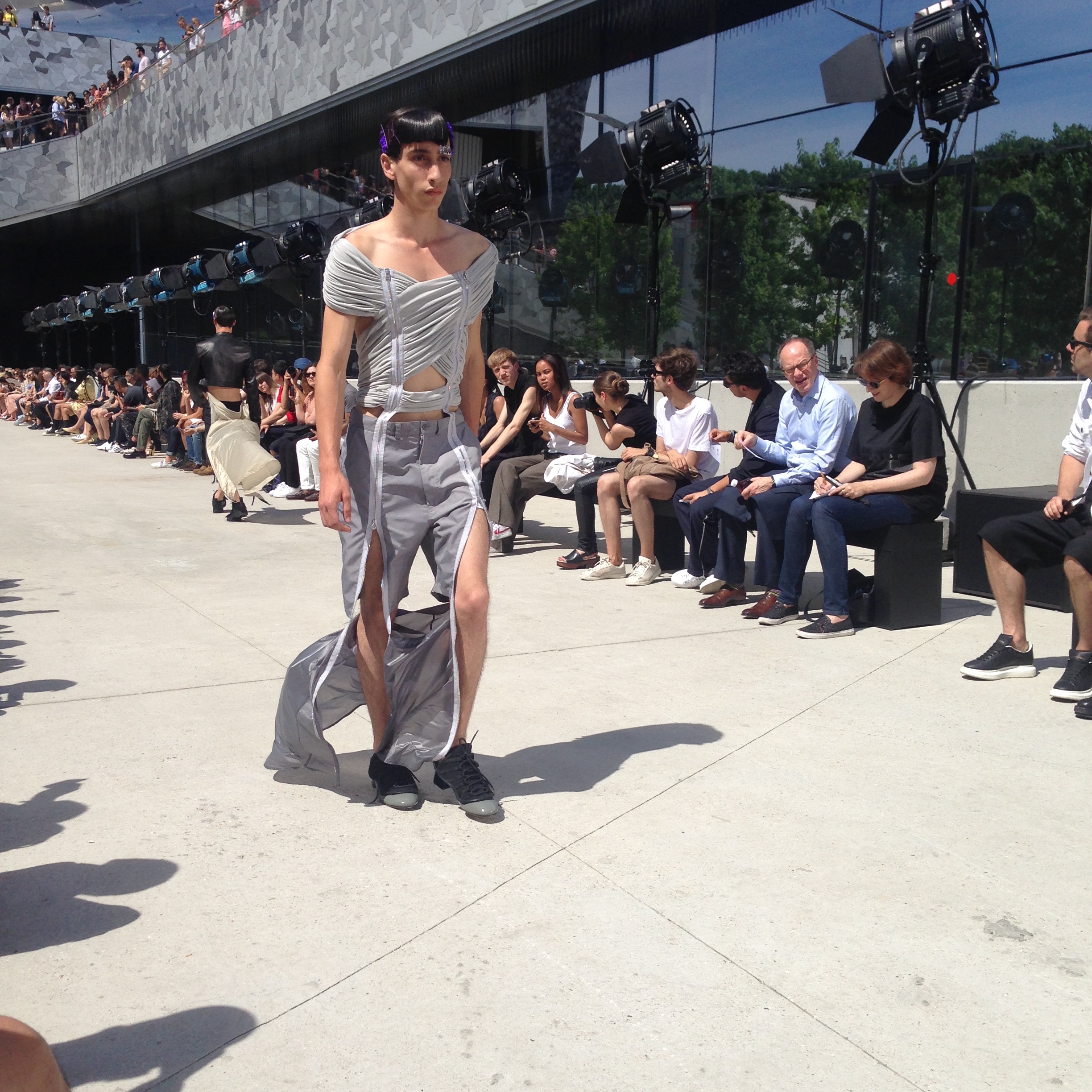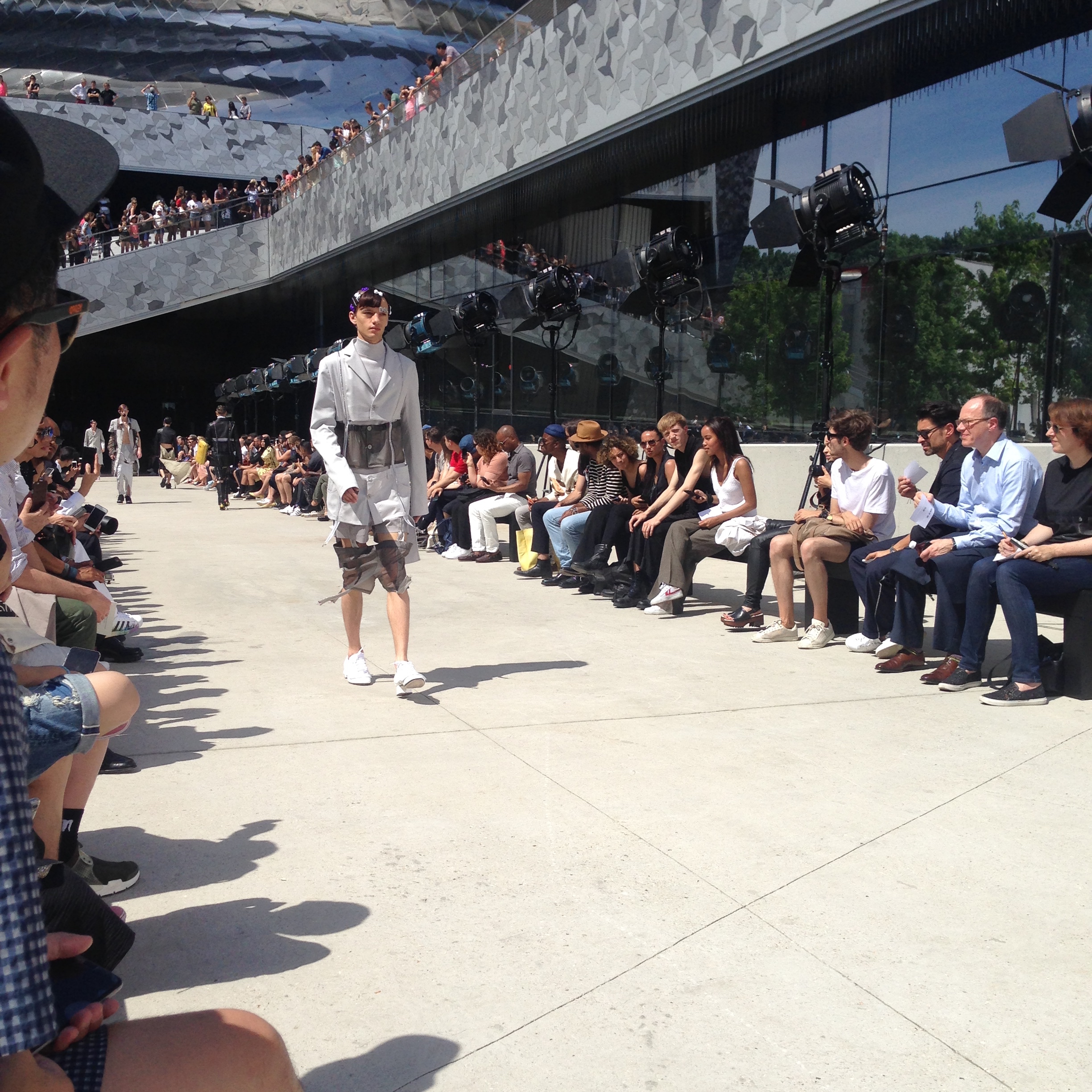 American label Hood by Air shows its men’s collection in Paris. Hood by Air, the up-and-coming label from New York, shows its men’s collection in Paris, with the undulating Philharmonie building as backdrop. Designer Shayne Oliver likes to mix genres, going from Rnb to goth, from sporty to drag queen, from strapping to frail… Just like today’s youth, who are already fans of the label. For summer 2016, HBA men dare to wear everything, including hair clips and diamond rhinestones on eyelashes, and even mouth guards made of needles or pearls. Oliver cuts, detaches and reattaches. The pants split into three pieces and unzip, the top drapes, the purple leather expands, the jeans crackle, the hand accessory is worn like a boxing glove. The “HBA” logo, already widely recognized and adopted, is found throughout the collection. Aware of the mix of cultures and the importance of streewear, Oliver mixes and plays with everything, isn’t afraid to surprise, experiments, and creates an “HBA” gang phenomenon…