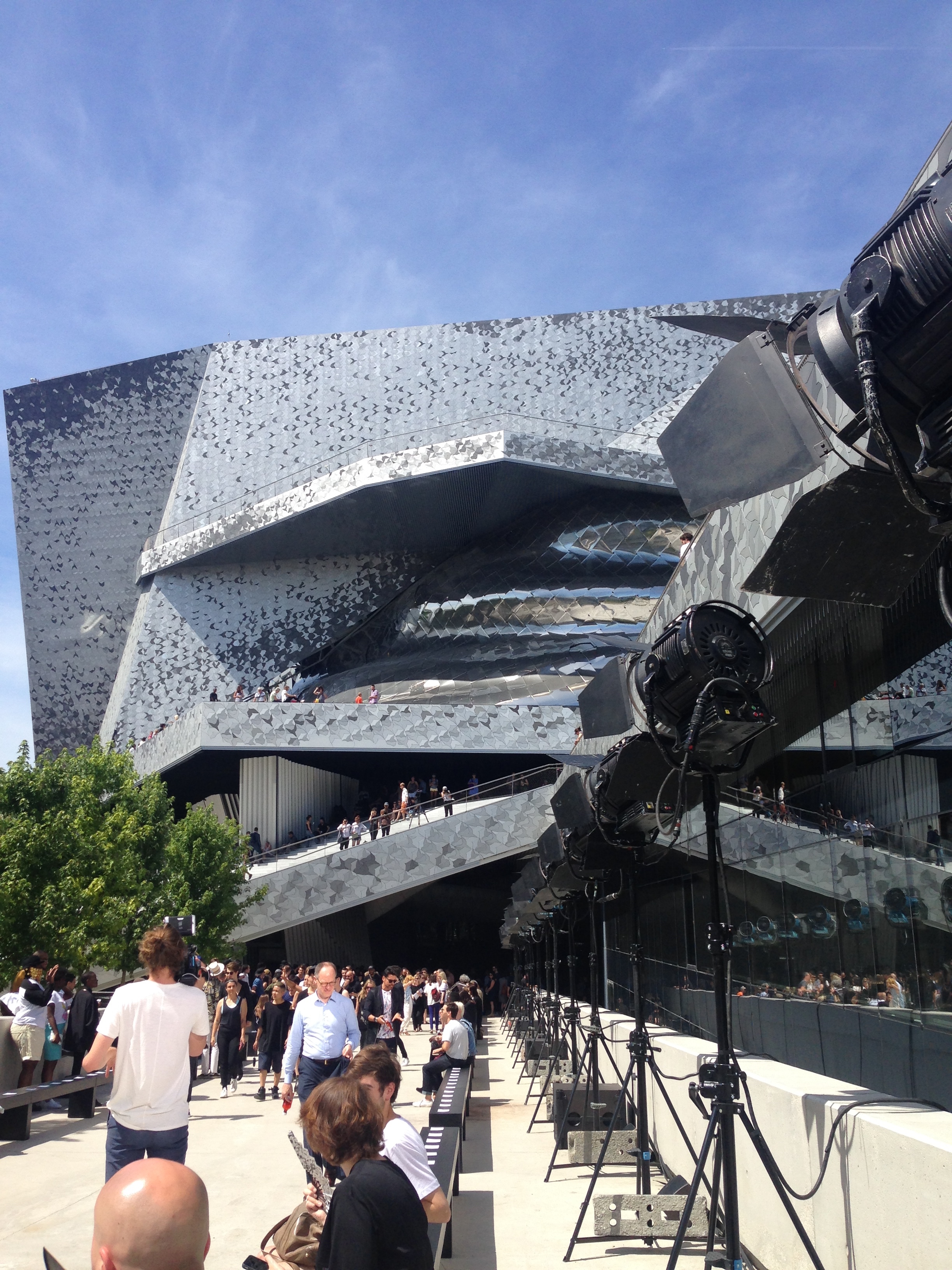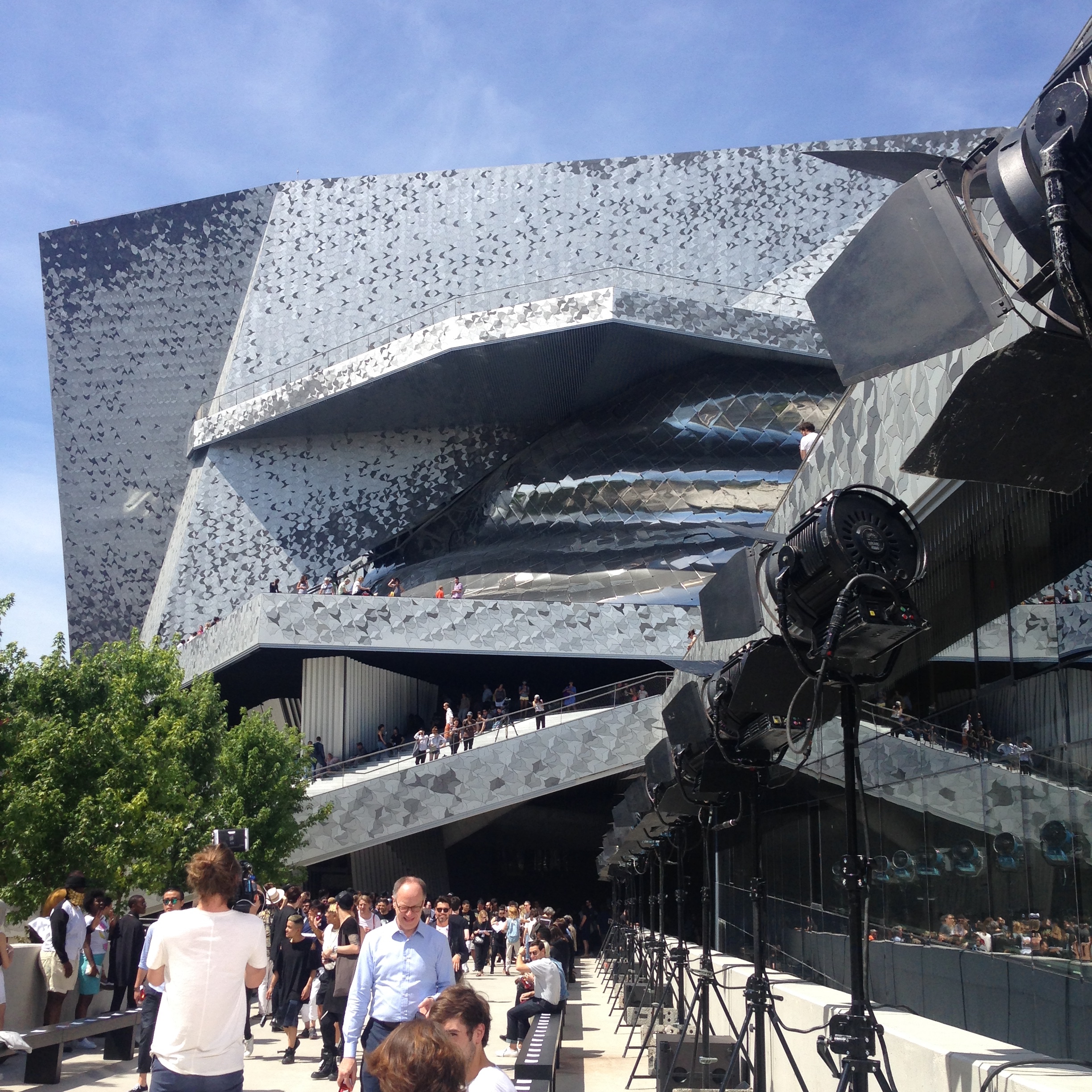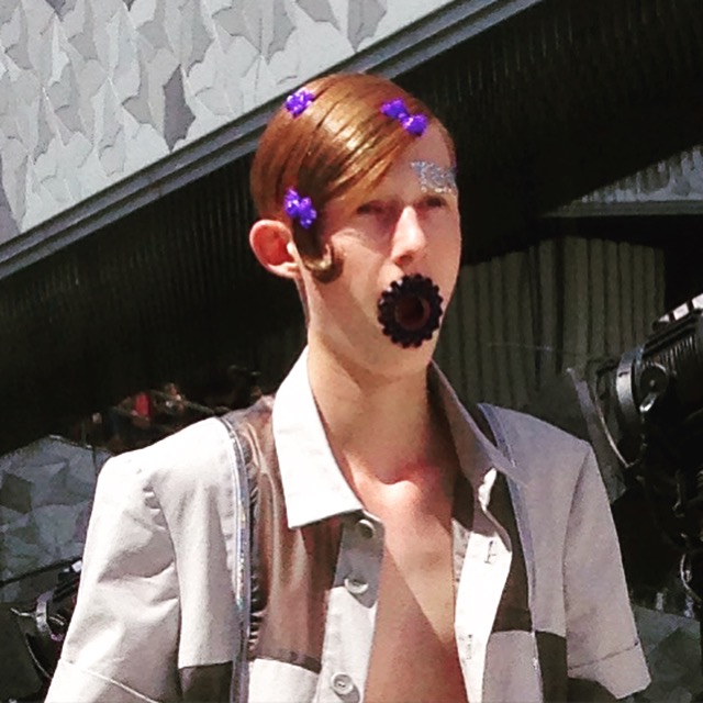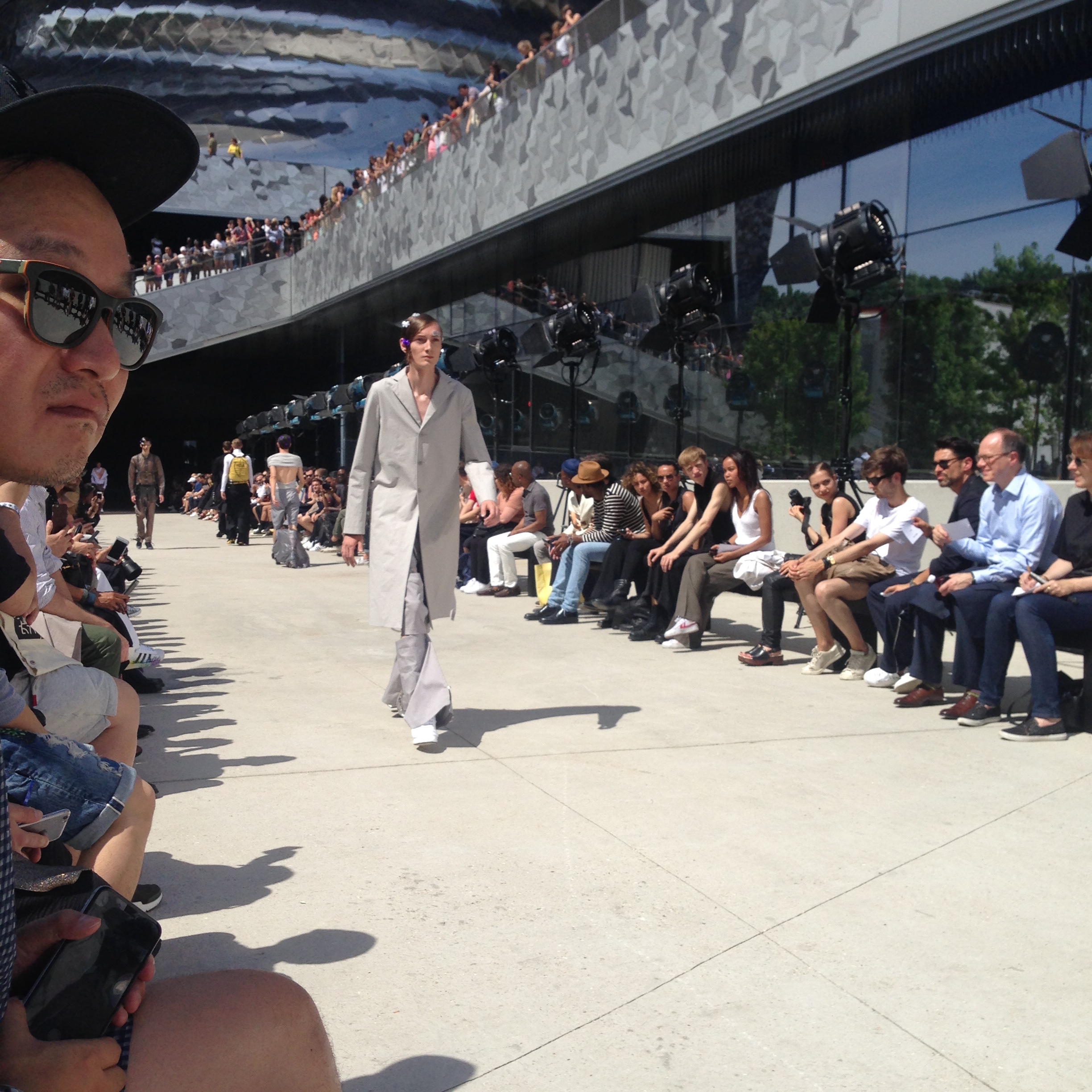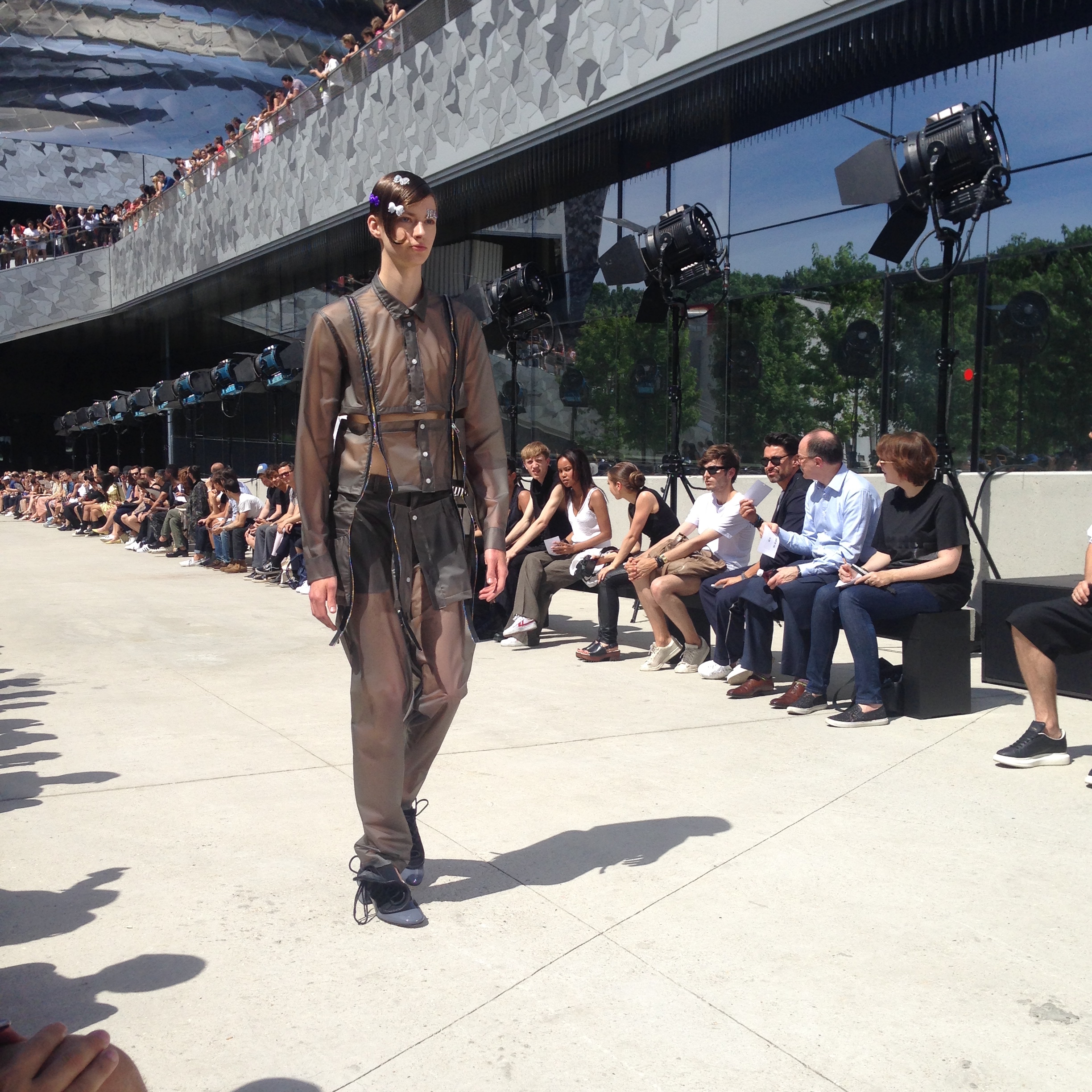 American label Hood by Air shows its men’s collection in Paris. Hood by Air, the up-and-coming label from New York, shows its men’s collection in Paris, with the undulating Philharmonie building as backdrop. Designer Shayne Oliver likes to mix genres, going from Rnb to goth, from sporty to drag queen, from strapping to frail… Just like today’s youth, who are already fans of the label. For summer 2016, HBA men dare to wear everything, including hair clips and diamond rhinestones on eyelashes, and even mouth guards made of needles or pearls. Oliver cuts, detaches and reattaches. The pants split into three pieces and unzip, the top drapes, the purple leather expands, the jeans crackle, the hand accessory is worn like a boxing glove. The “HBA” logo, already widely recognized and adopted, is found throughout the collection. Aware of the mix of cultures and the importance of streewear, Oliver mixes and plays with everything, isn’t afraid to surprise, experiments, and creates an “HBA” gang phenomenon…