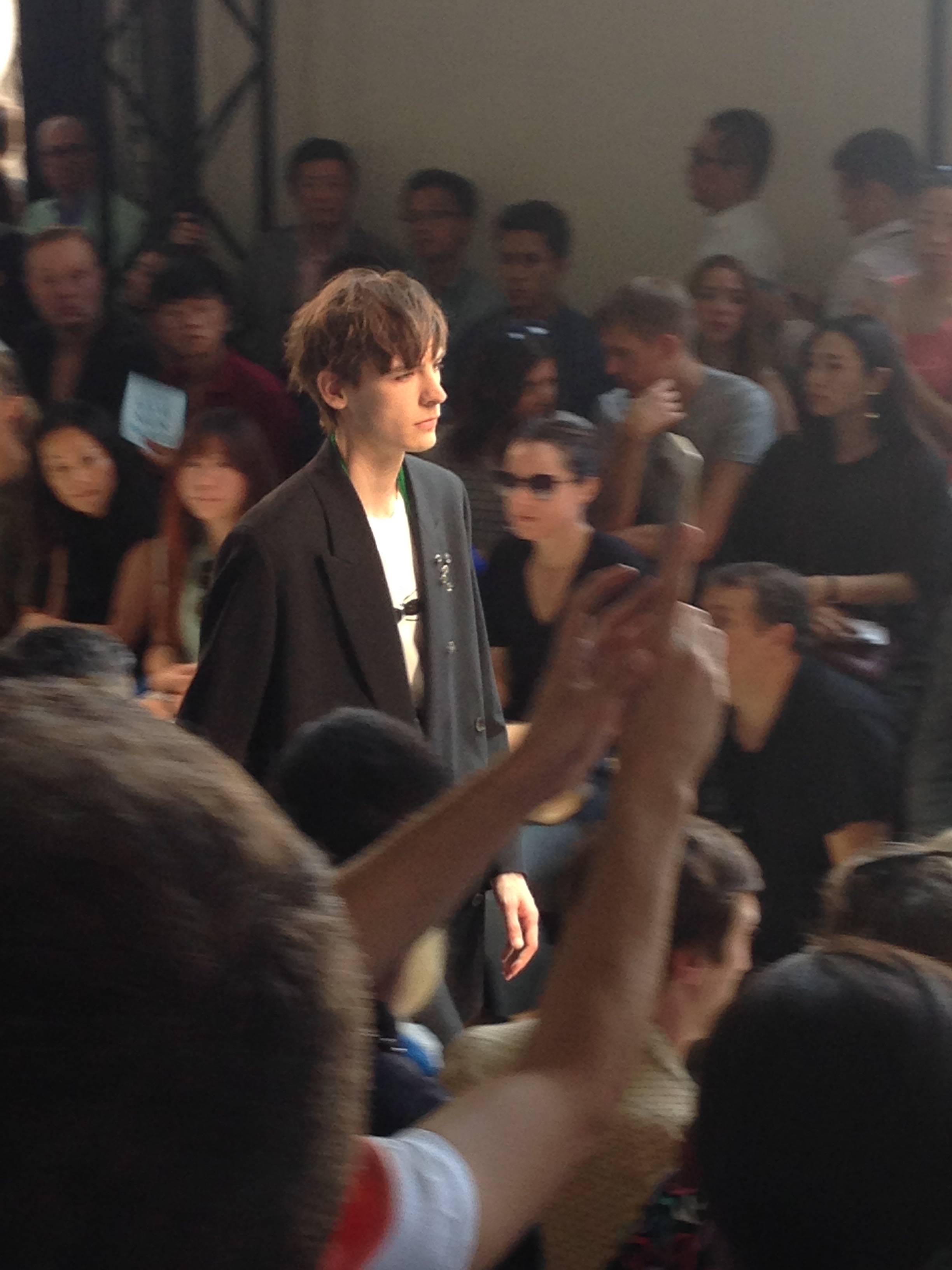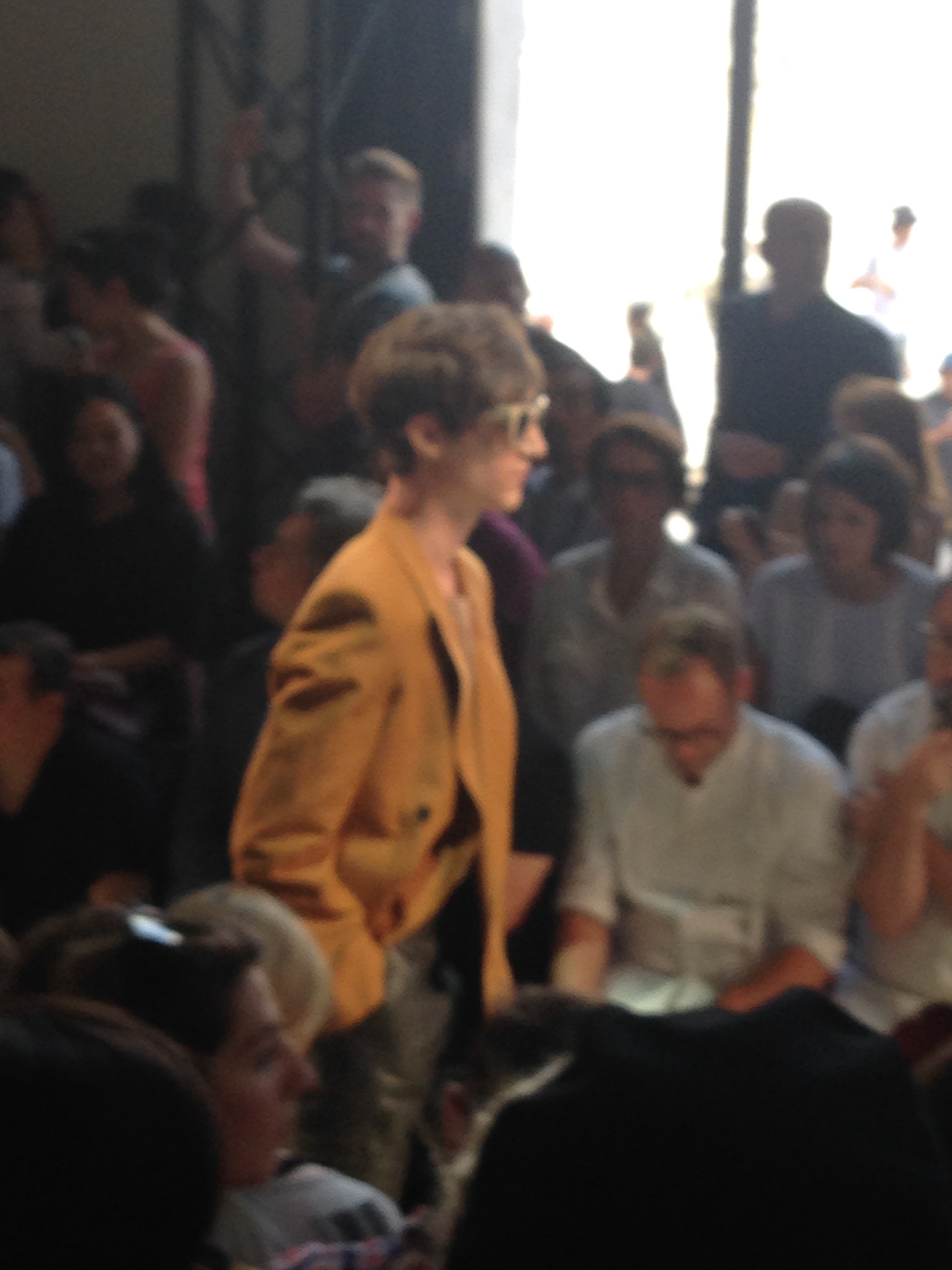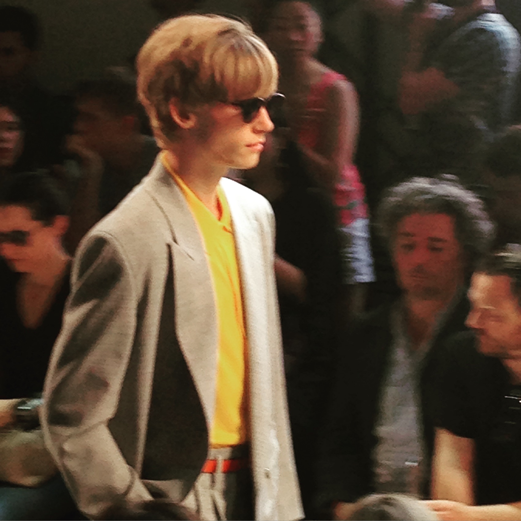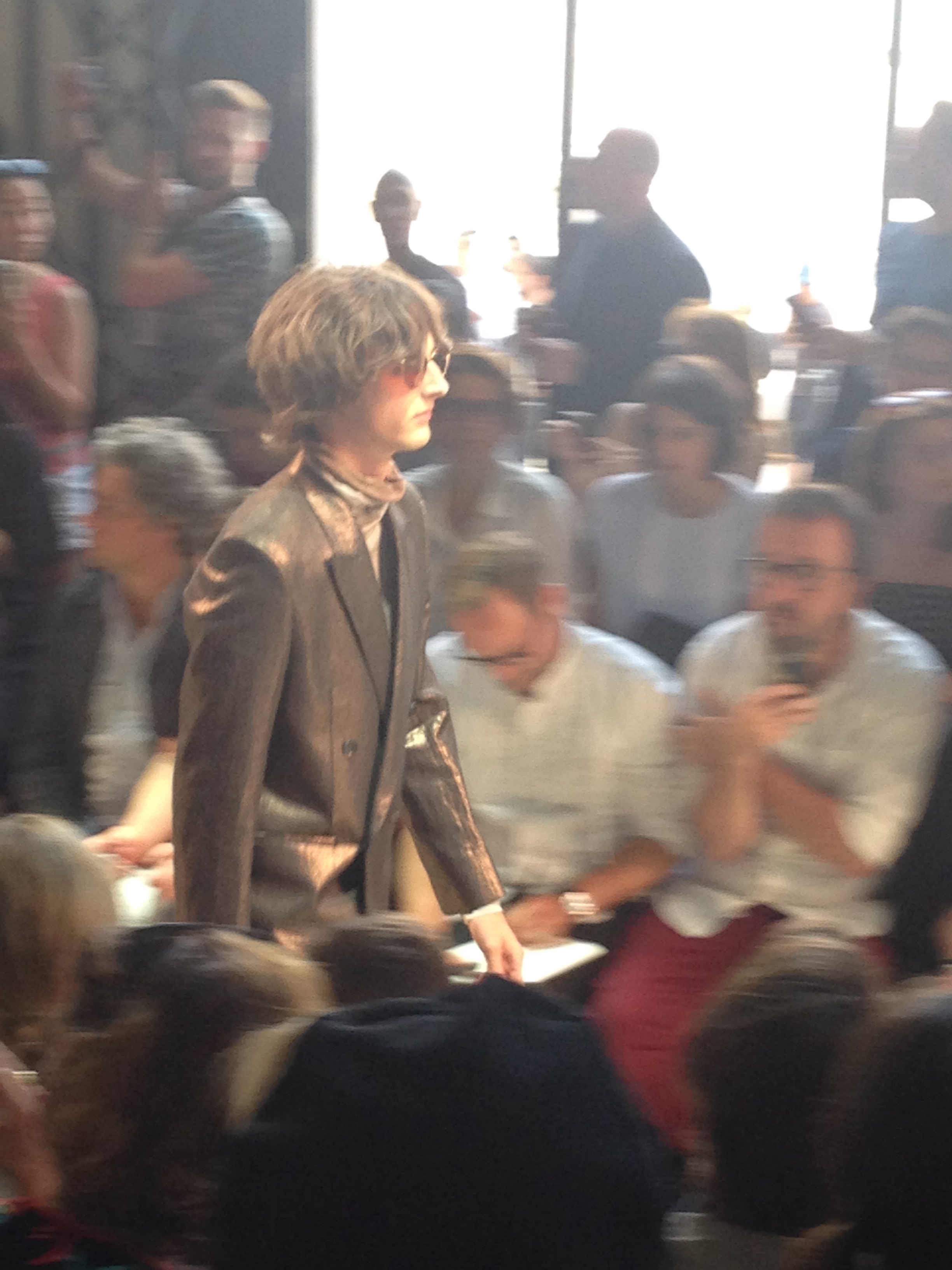 Paul Smith’s “Independent Mind” plays with colors, proportions and prints, always with humor and joy. Paul Smith speaks to us of independence of spirit, all to the tune of rock! He dares to wear orange or a green blazer coordinated with yellow pants, and confesses backstage to being very inspired by David Hockney, a friend and client. It’s all about proportions, with rock’n’roll slim-fit pants or volumes with eighties-style loose-fitting jackets and pants. He adds a seventies disco feel with brassy tones and, of course, a sense of humor with bunny and ant prints, Paul Smith’s example of successful community living…