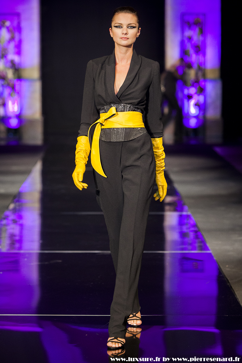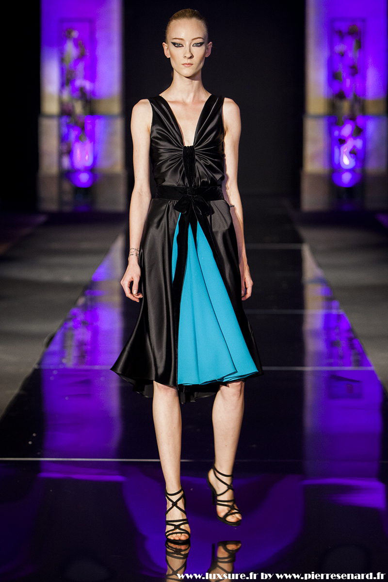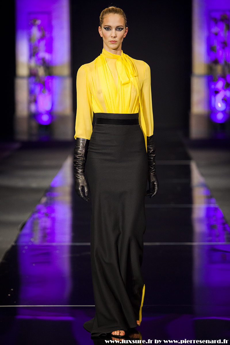 The first act lived up to all our expectations, unveiling the new ‘Noir Désirs’ Winter 2015-2016 collection. The signature of this collection is its composition of bi-chrome dresses and ensembles: Black is continually mixed with color. At first, cadmium yellow was timidly added to a black ensemble in the form of accessories: glove, belt, feathers. Gradually, it became an integral part of a dress, taking over from the darkness. This pattern was repeated with a slightly fluoridated turquoise, then a royal blue tending towards the electricity of Klein blue, to end with a mauve gradient stretching to orange via red.