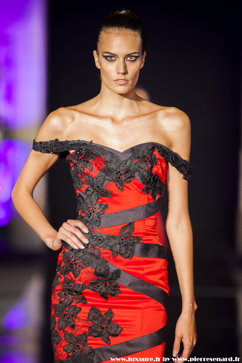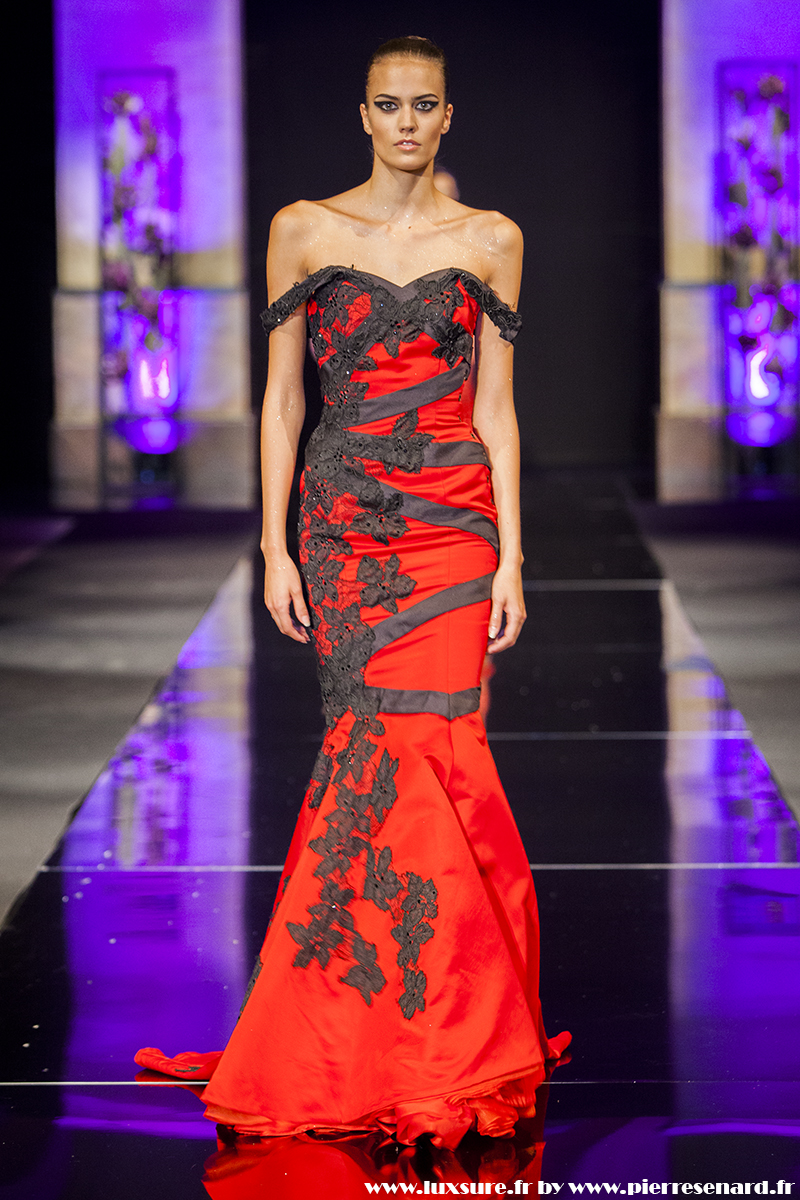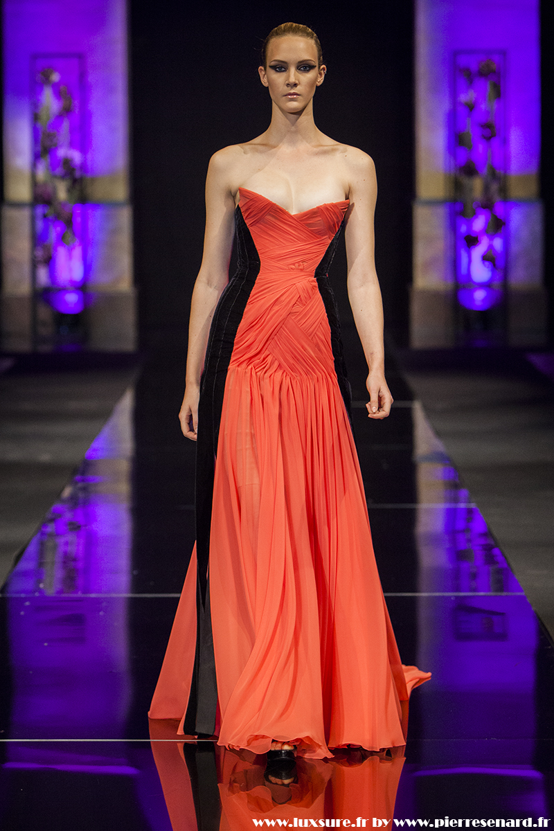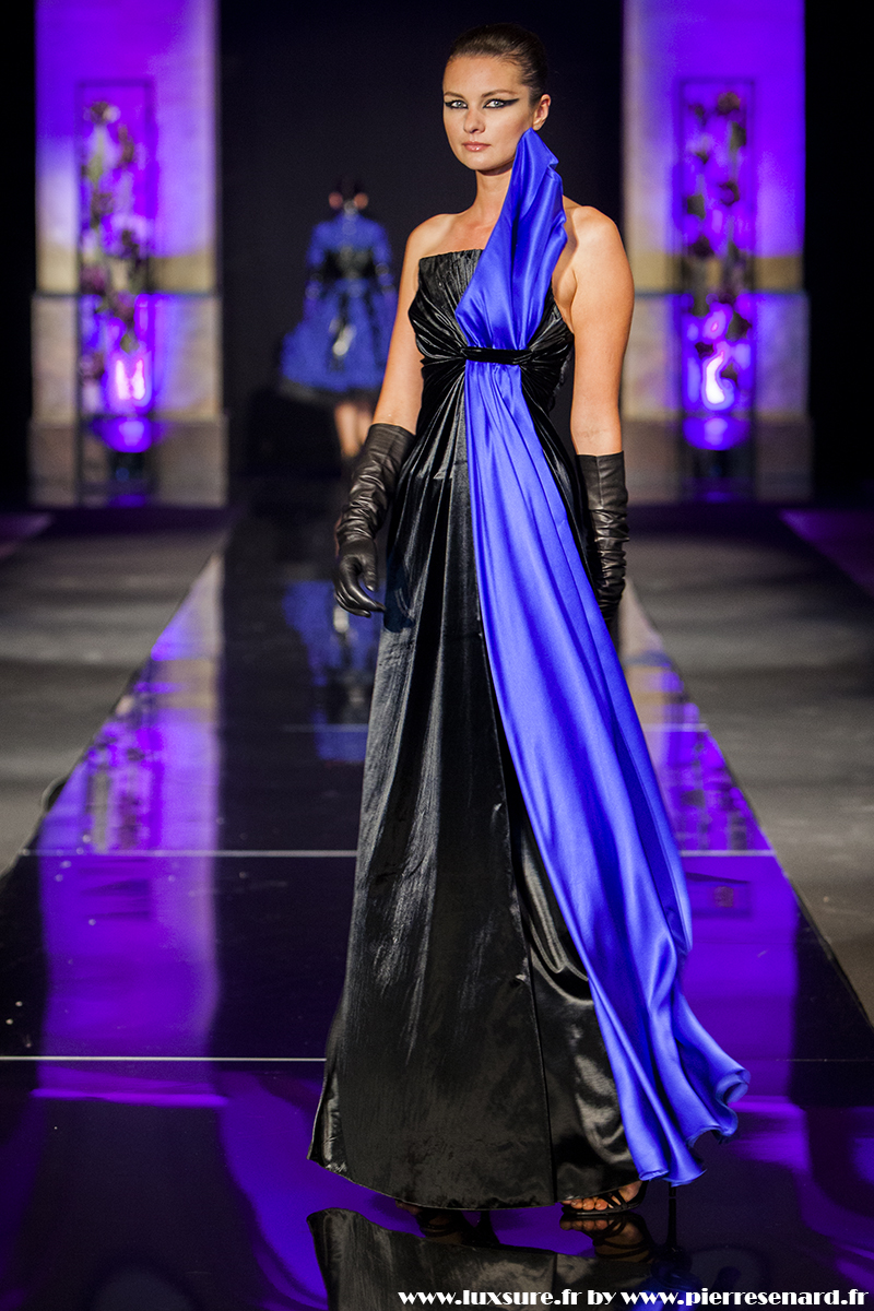 The first act lived up to all our expectations, unveiling the new ‘Noir Désirs’ Winter 2015-2016 collection. The signature of this collection is its composition of bi-chrome dresses and ensembles: Black is continually mixed with color. At first, cadmium yellow was timidly added to a black ensemble in the form of accessories: glove, belt, feathers. Gradually, it became an integral part of a dress, taking over from the darkness. This pattern was repeated with a slightly fluoridated turquoise, then a royal blue tending towards the electricity of Klein blue, to end with a mauve gradient stretching to orange via red.