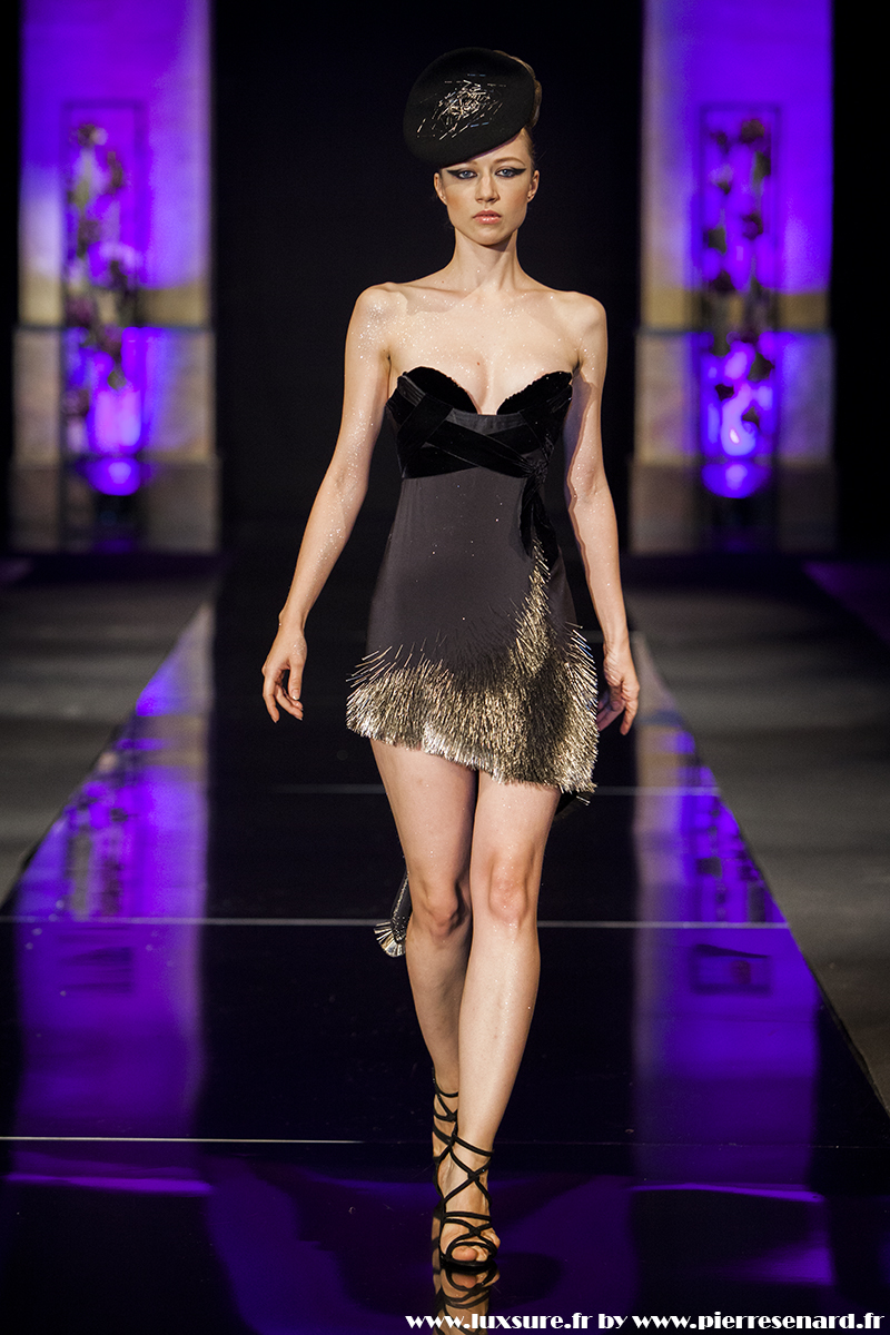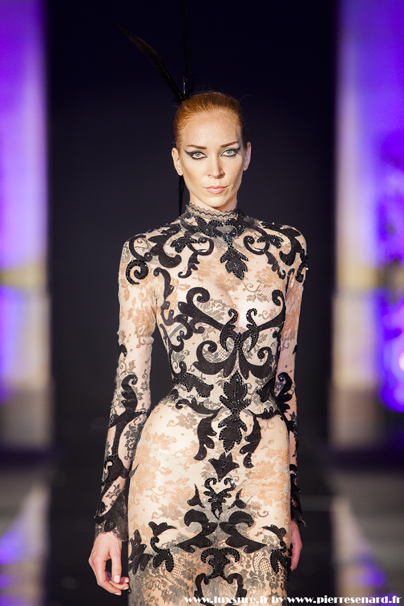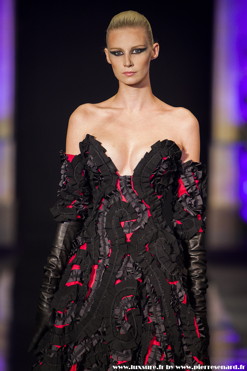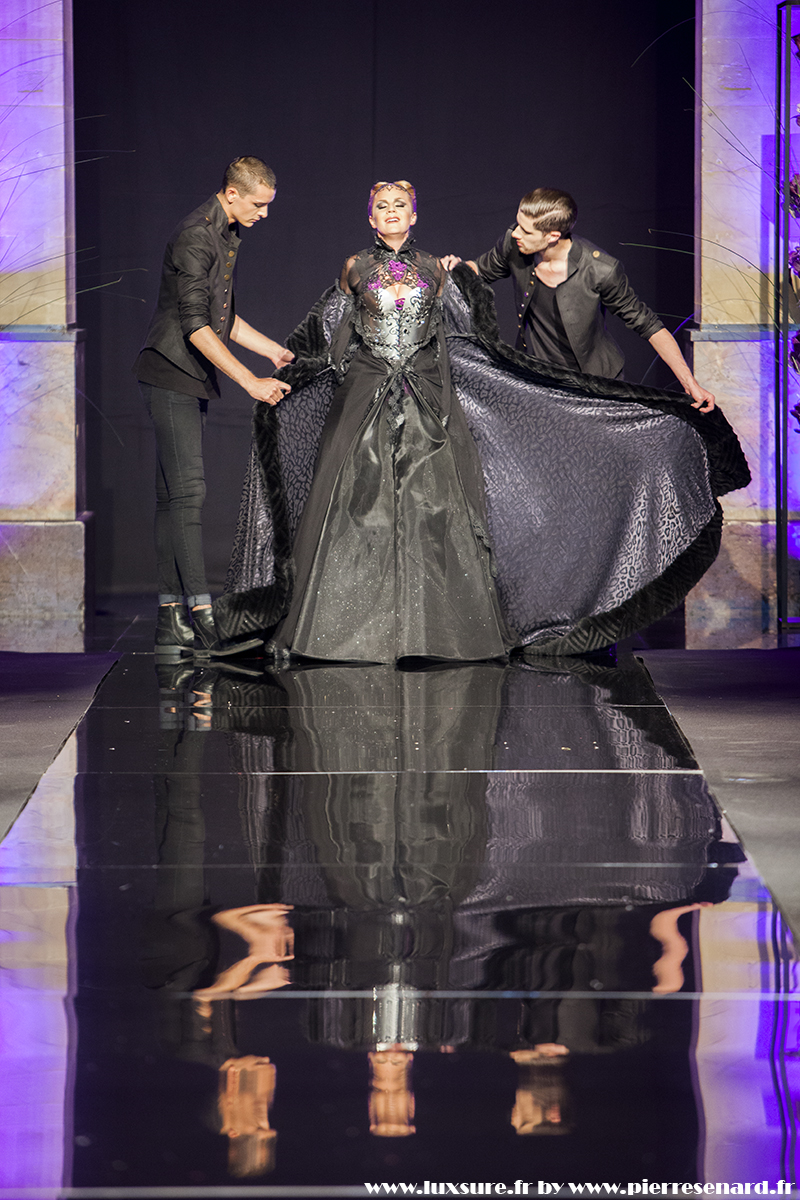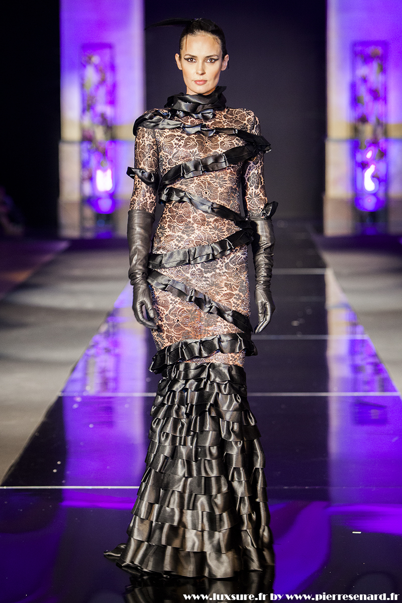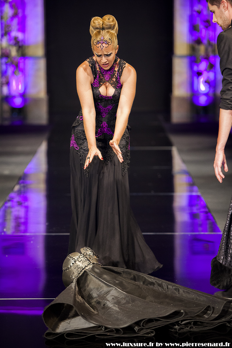 The second act was marked by both suspense and surprise, with an unexpected performance of a requiem from the 2010 Salle Pleyel opera couture. The baroque-like lyric artist was adorned in a black leopard bocard coat, a gown of silk taffeta and ostrich feathers, a large black horsehair gown and a laced aluminum bustier, and finally a gown tattooed with black and purple passementerie. Each ‘layer’ was revealed by two male escorts who gradually ‘stripped’ her of each ornament. This intermission merely heralded the immoderation of what was to come.