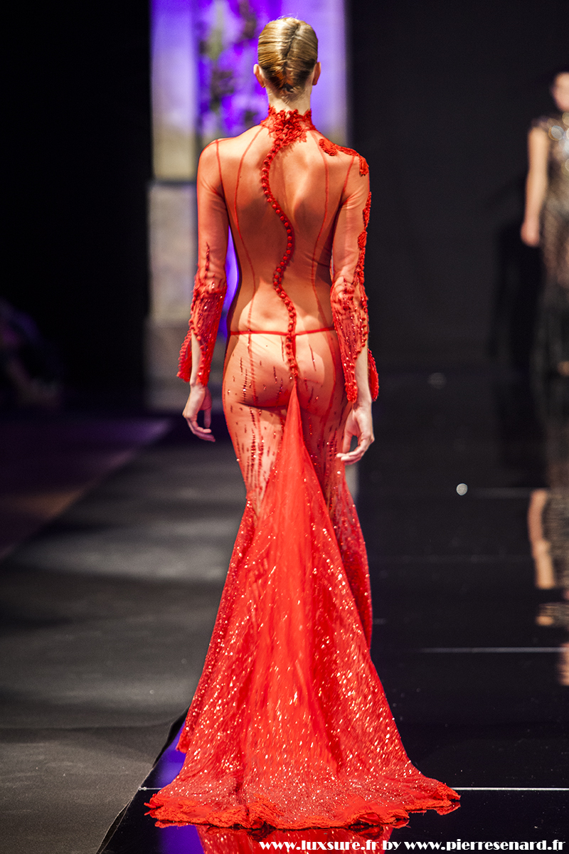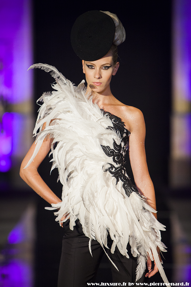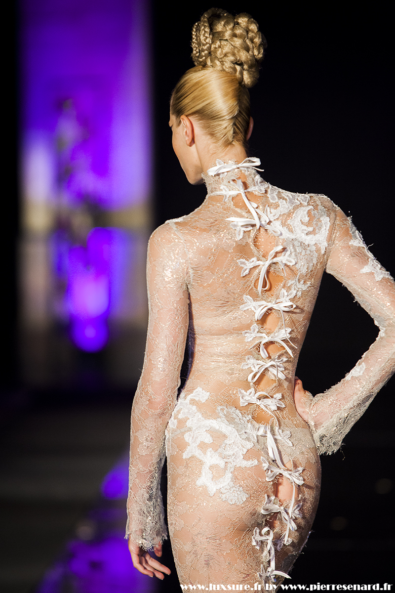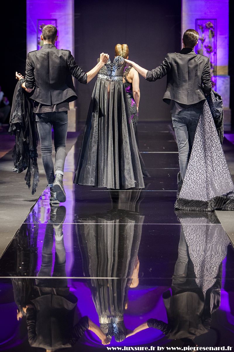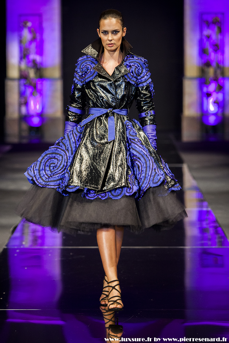 The second act was marked by both suspense and surprise, with an unexpected performance of a requiem from the 2010 Salle Pleyel opera couture. The baroque-like lyric artist was adorned in a black leopard bocard coat, a gown of silk taffeta and ostrich feathers, a large black horsehair gown and a laced aluminum bustier, and finally a gown tattooed with black and purple passementerie. Each ‘layer’ was revealed by two male escorts who gradually ‘stripped’ her of each ornament. This intermission merely heralded the immoderation of what was to come.