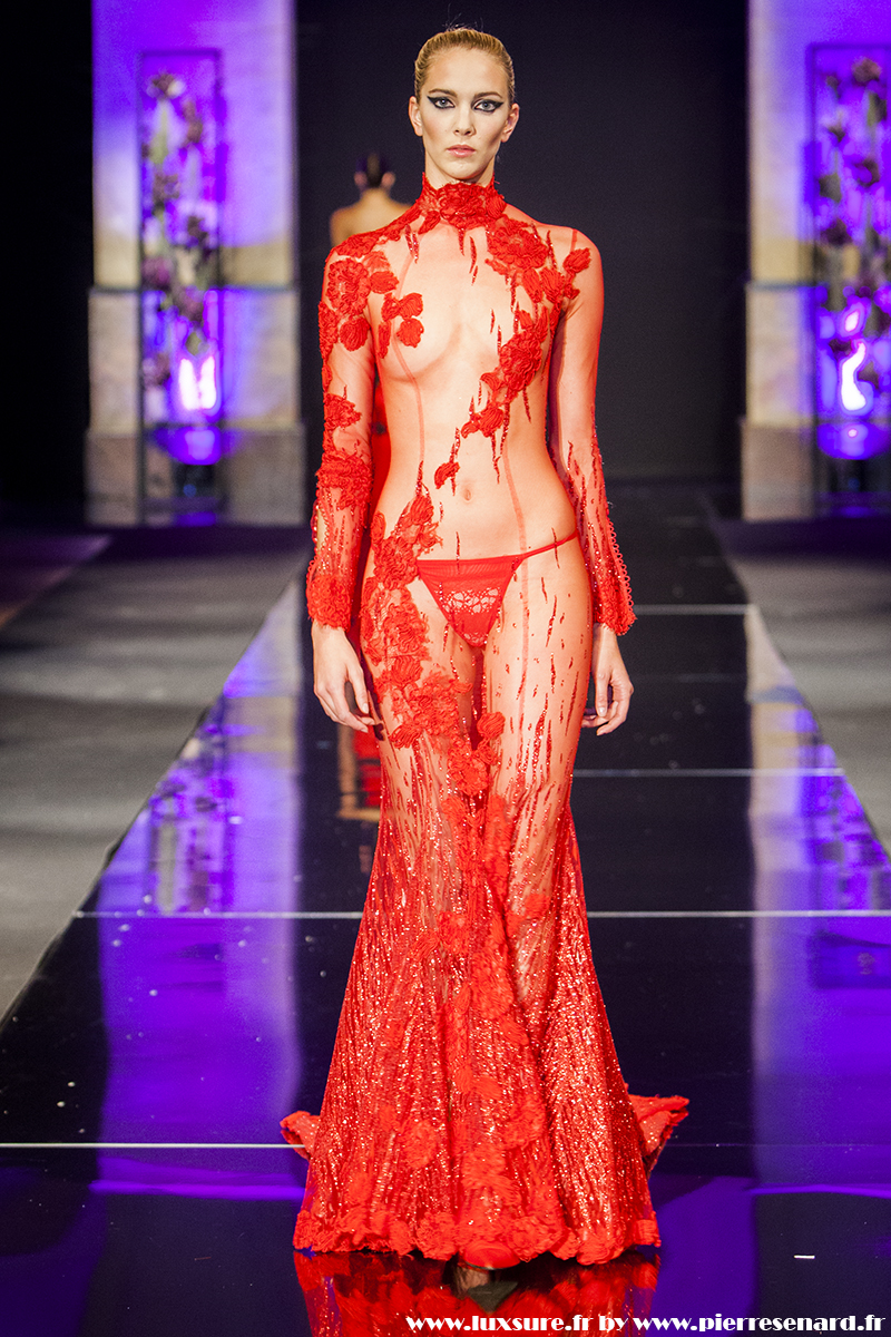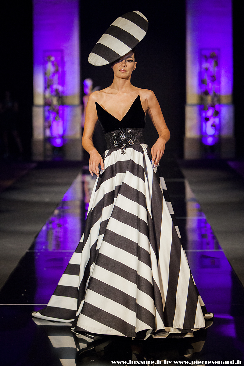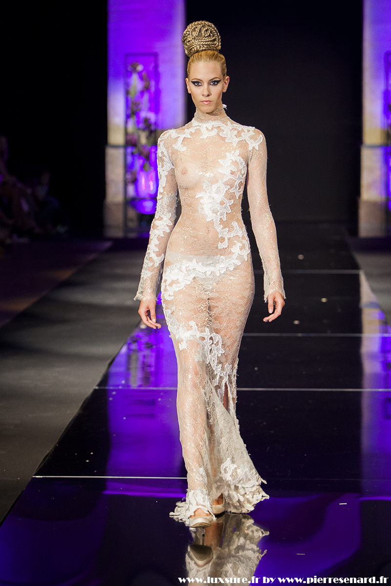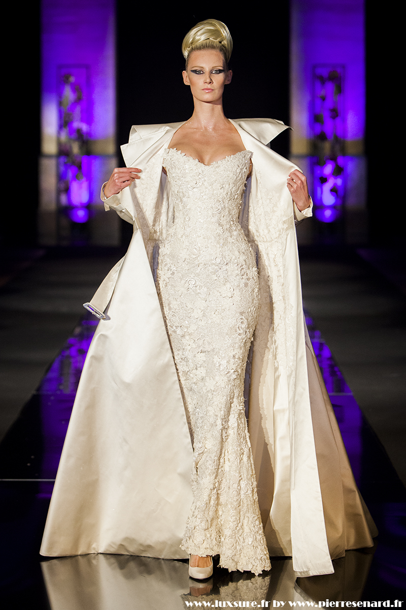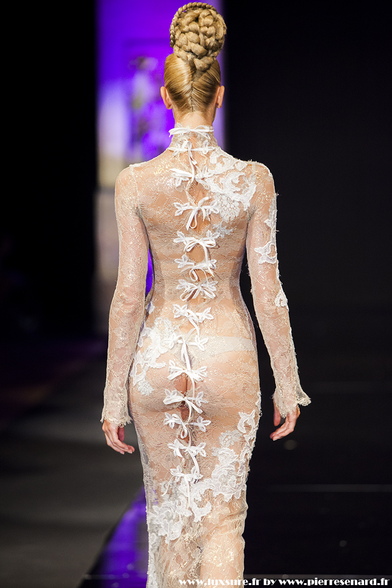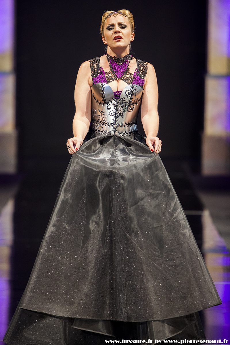 The second act was marked by both suspense and surprise, with an unexpected performance of a requiem from the 2010 Salle Pleyel opera couture. The baroque-like lyric artist was adorned in a black leopard bocard coat, a gown of silk taffeta and ostrich feathers, a large black horsehair gown and a laced aluminum bustier, and finally a gown tattooed with black and purple passementerie. Each ‘layer’ was revealed by two male escorts who gradually ‘stripped’ her of each ornament. This intermission merely heralded the immoderation of what was to come.