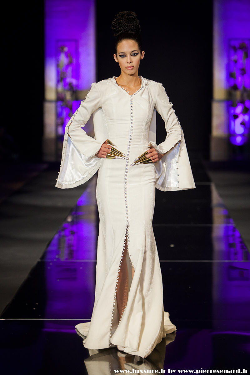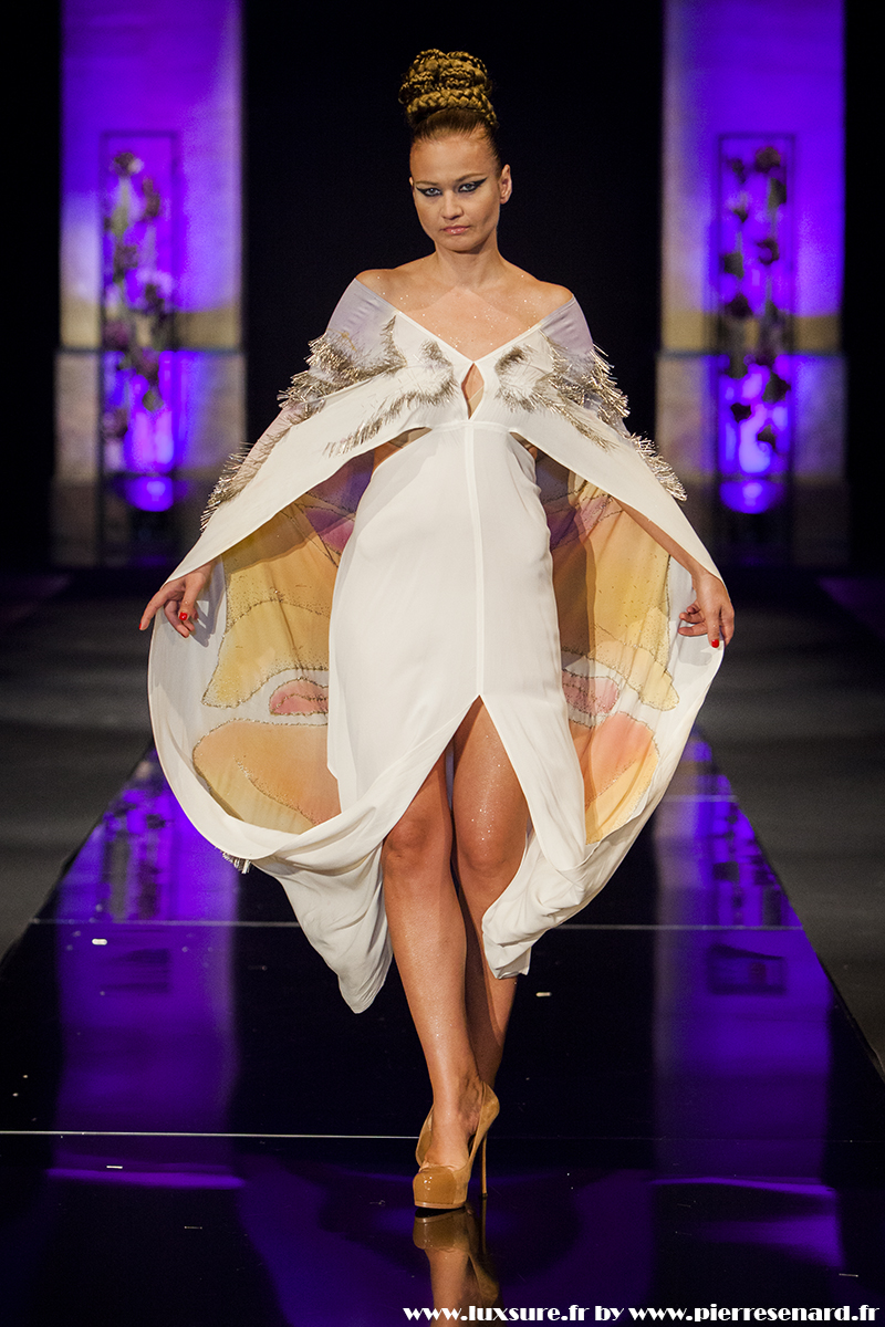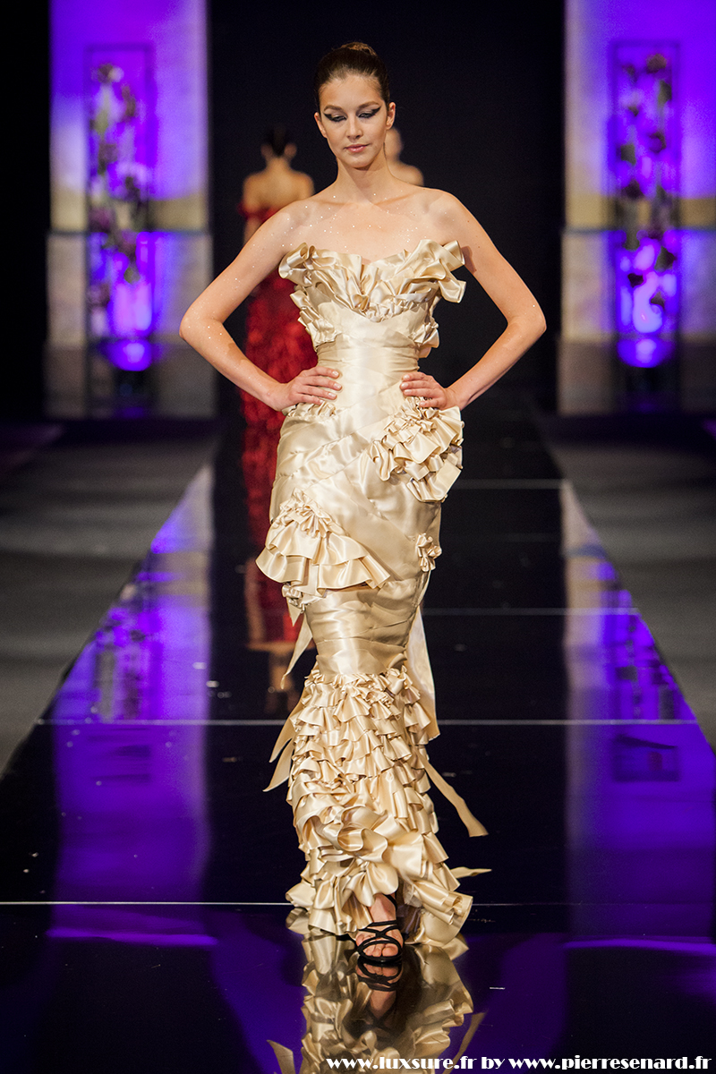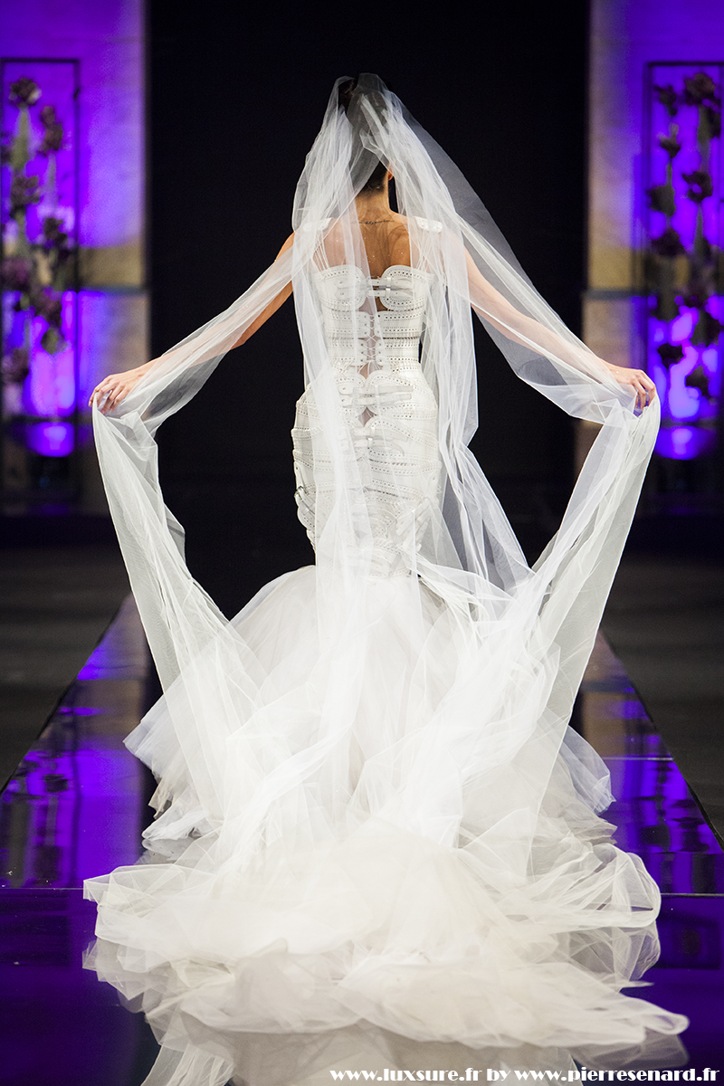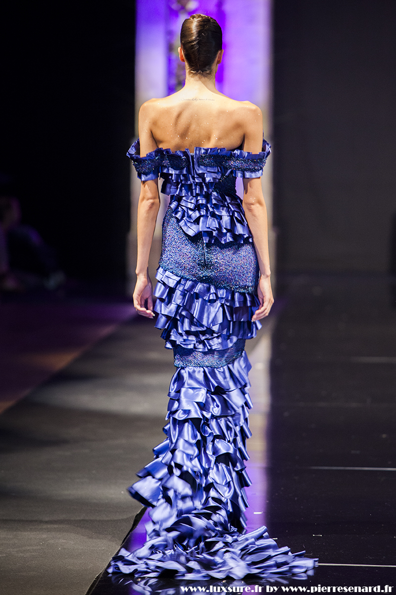 The second act was marked by both suspense and surprise, with an unexpected performance of a requiem from the 2010 Salle Pleyel opera couture. The baroque-like lyric artist was adorned in a black leopard bocard coat, a gown of silk taffeta and ostrich feathers, a large black horsehair gown and a laced aluminum bustier, and finally a gown tattooed with black and purple passementerie. Each ‘layer’ was revealed by two male escorts who gradually ‘stripped’ her of each ornament. This intermission merely heralded the immoderation of what was to come.