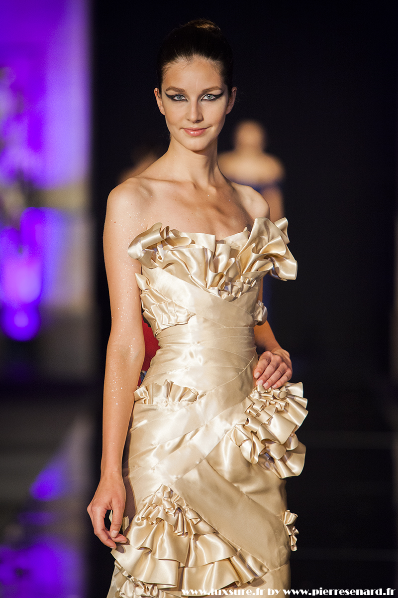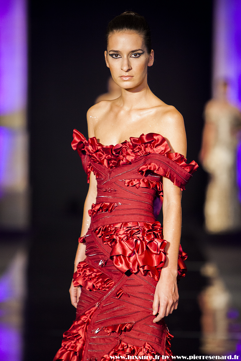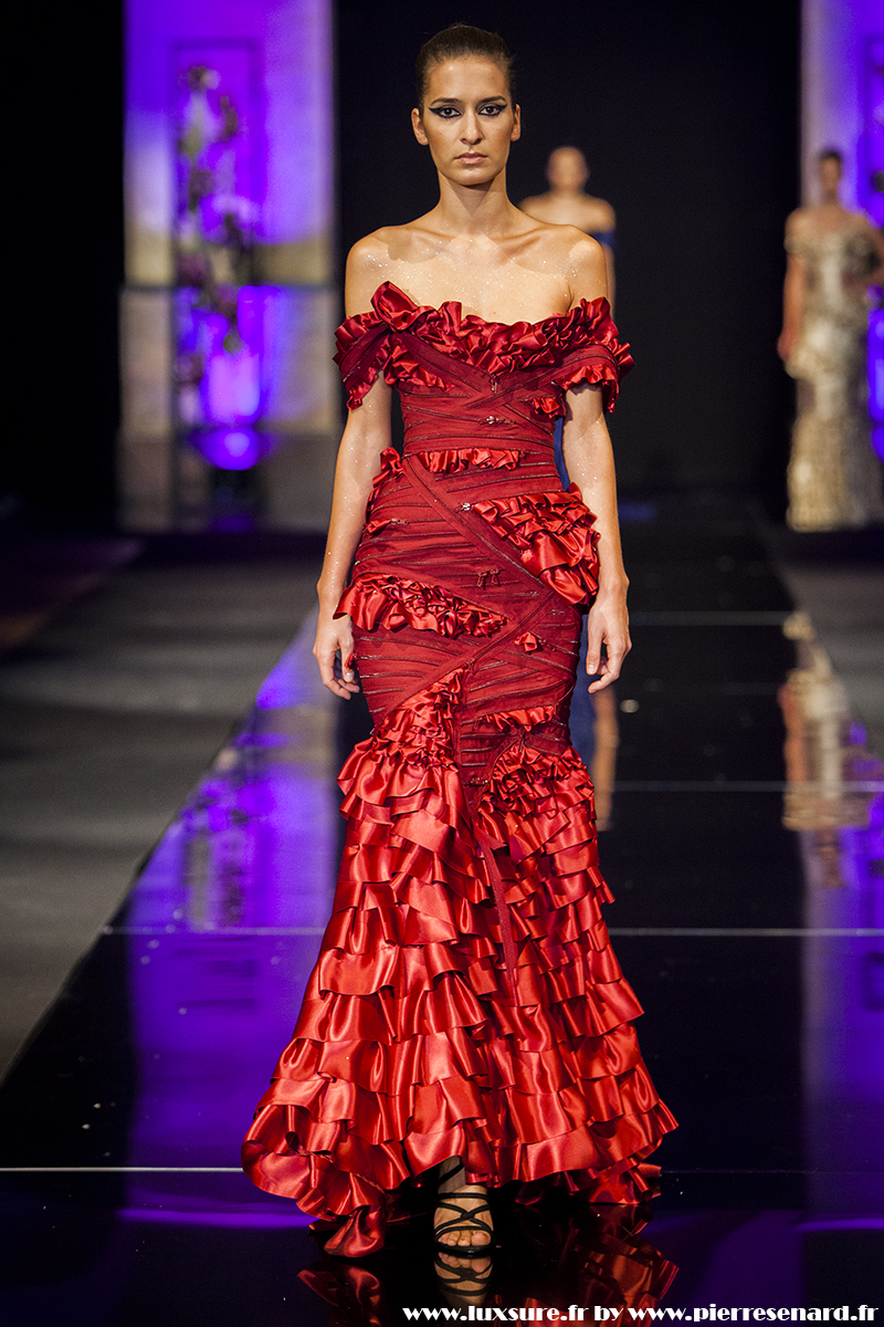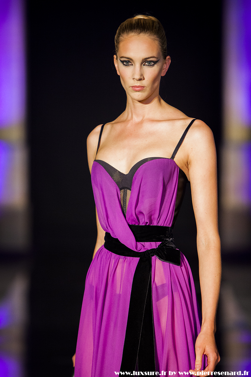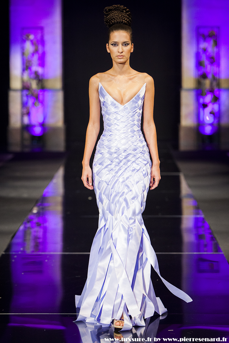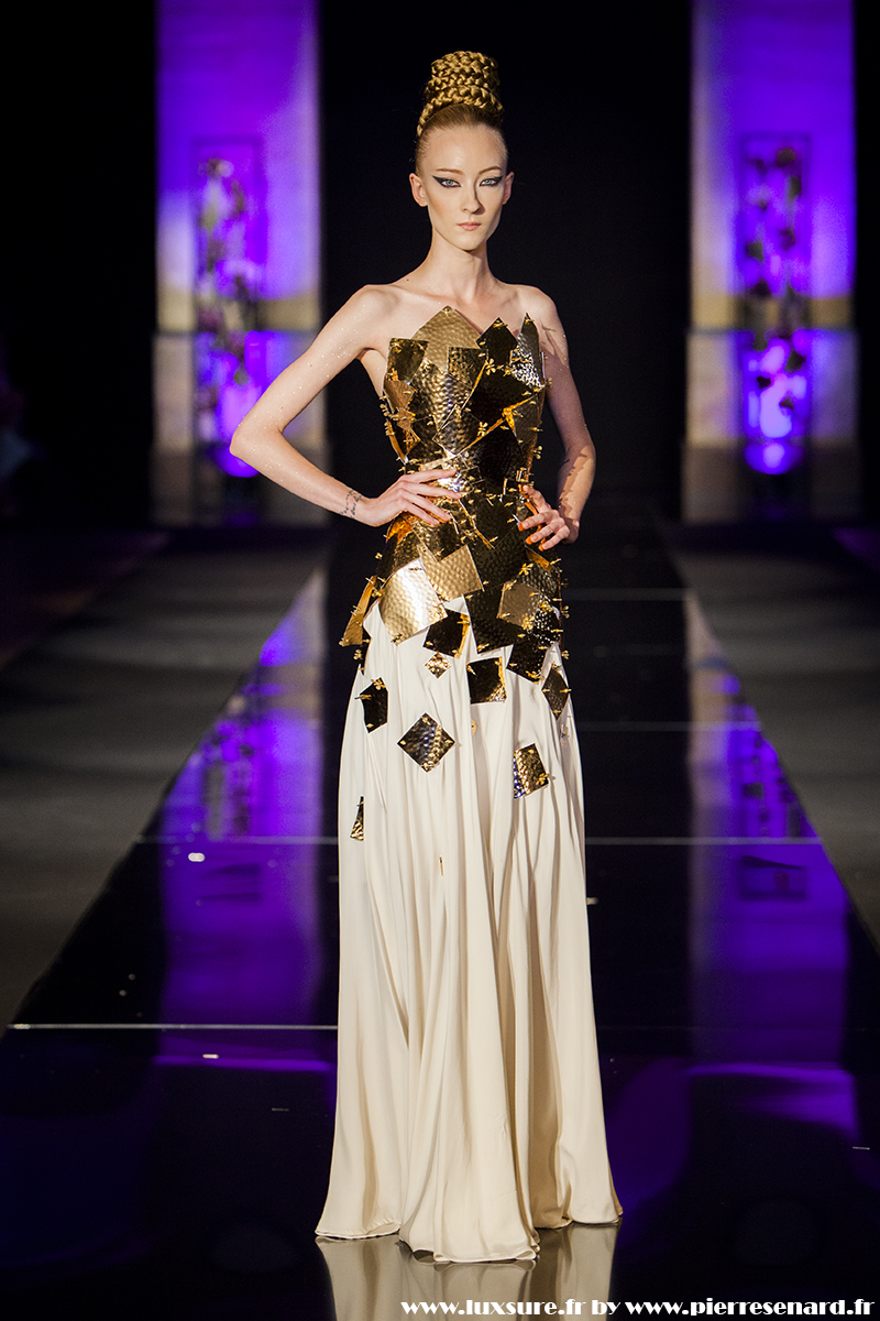 The second act was marked by both suspense and surprise, with an unexpected performance of a requiem from the 2010 Salle Pleyel opera couture. The baroque-like lyric artist was adorned in a black leopard bocard coat, a gown of silk taffeta and ostrich feathers, a large black horsehair gown and a laced aluminum bustier, and finally a gown tattooed with black and purple passementerie. Each ‘layer’ was revealed by two male escorts who gradually ‘stripped’ her of each ornament. This intermission merely heralded the immoderation of what was to come.