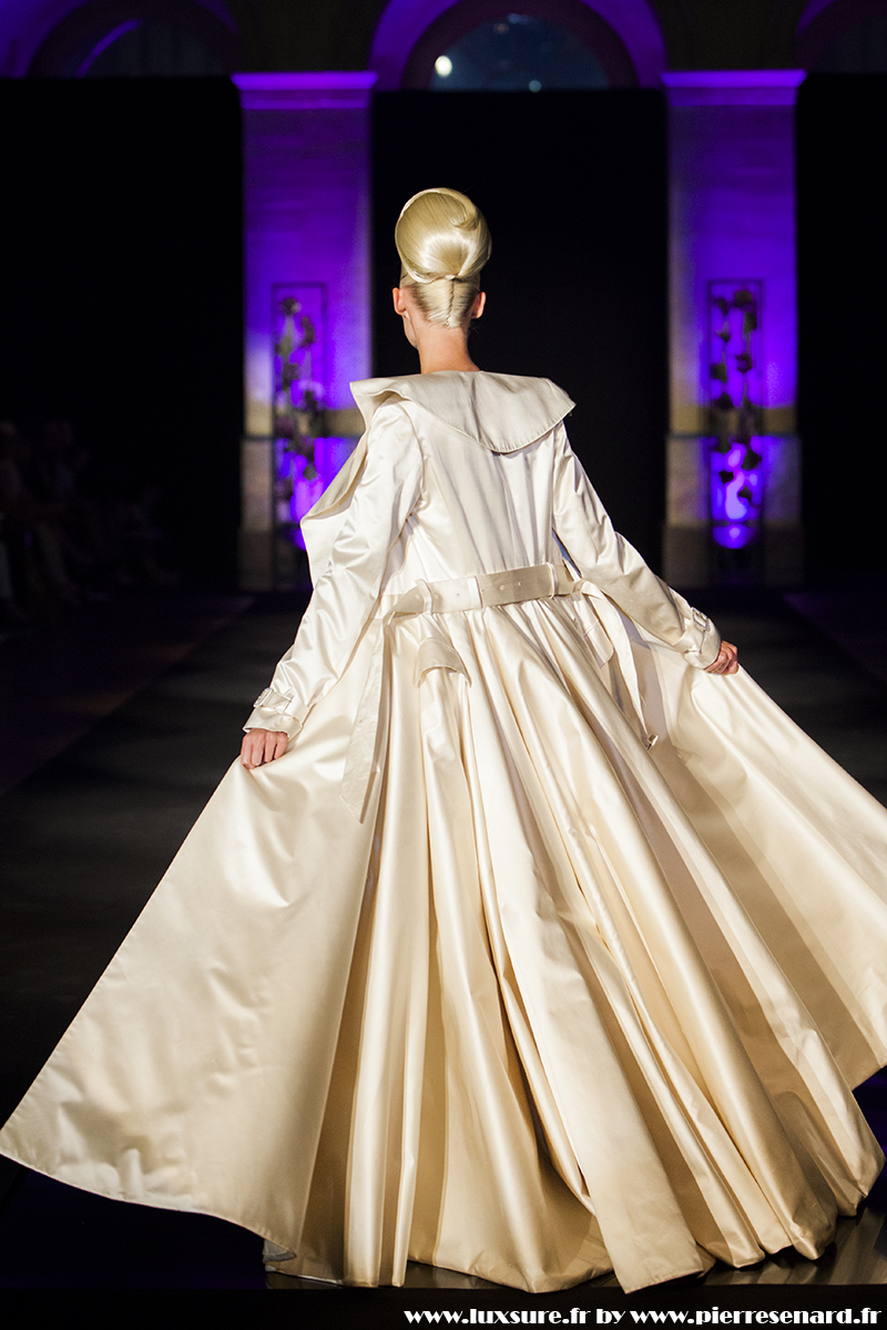 Eymeric François’ eagerly-awaited show on July 9 brought Paris haute couture week to a fitting close. The show took place in the nave of the Palais Brongniart on the Place de la Bourse, almost following on from Zvonko Markovic’s show, which preceded it by barely fifteen minutes. But Monsieur François was clearly confident enough to go straight after the Serbian designer, for he had meticulously orchestrated a veritable procession for an awake but surprised public. Like a classical opera, the show was composed of three acts, each with its own dramatic quota.