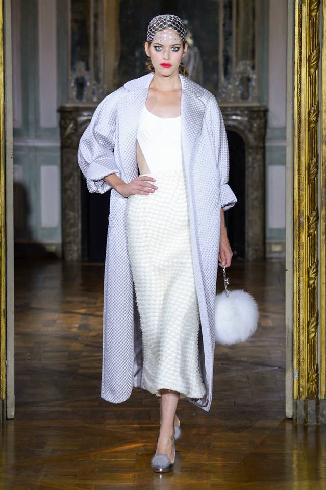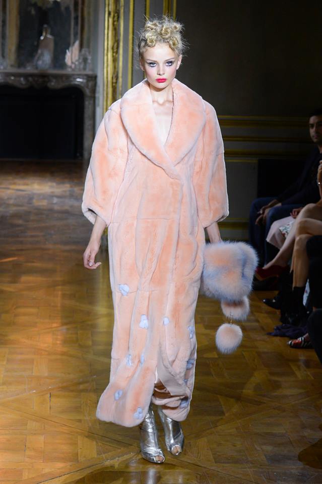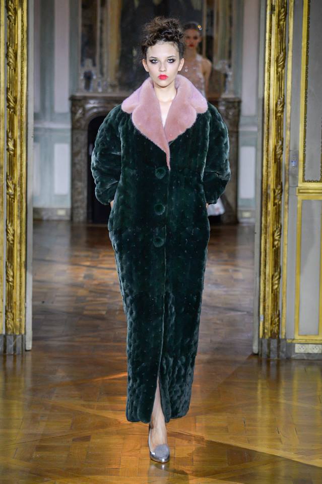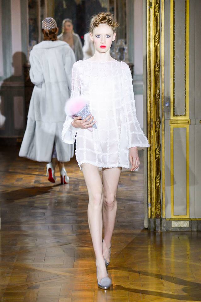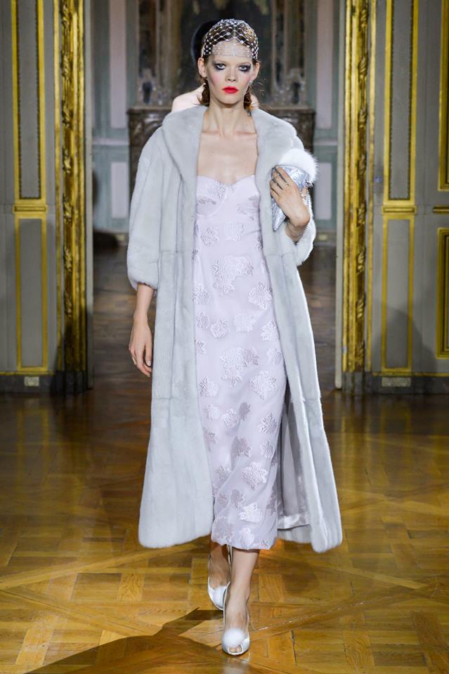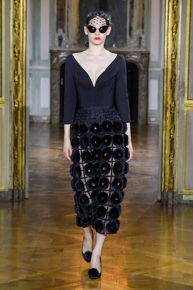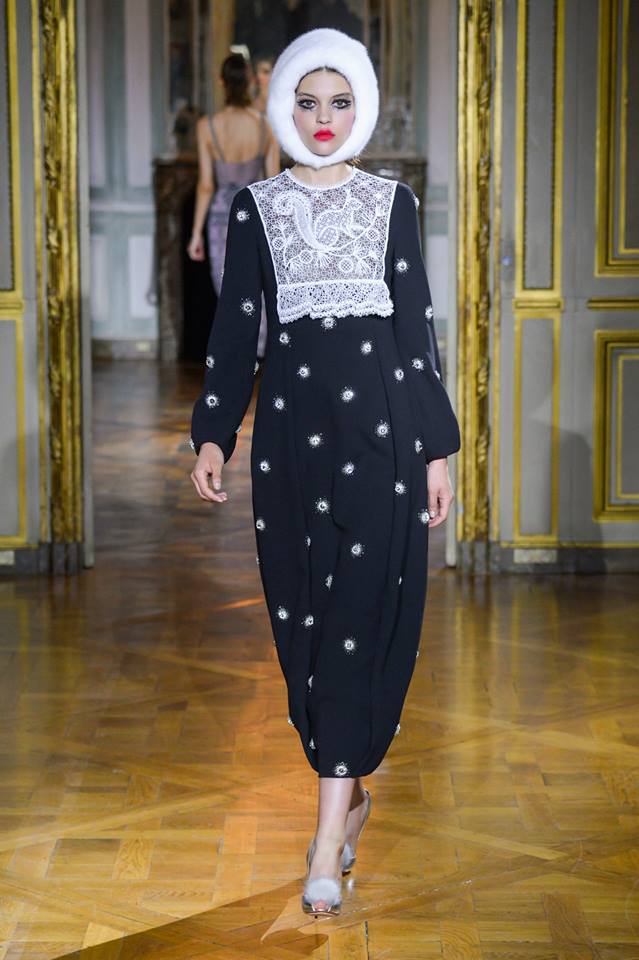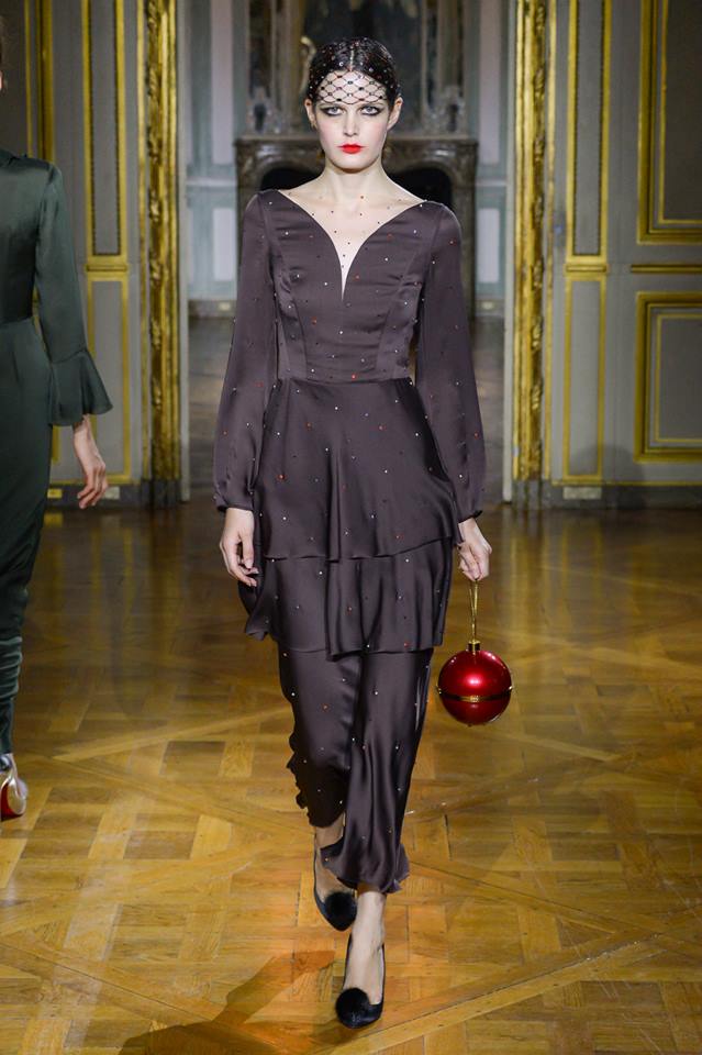 Inviting us to travel to her native Saint Petersburg, Ulyana Sergeenko took us back to the communal apartments of the Soviet era, each piece subtly suggesting the traditional interiors of her childhood: a sofa became a soft fur coat, and a fully embroidered dress evoked the structured silhouette of a lampshade. The designer has made high-flying craftsmanship her trademark, and this season was no exception, from meticulously hand-applied crystals to delicate lace bibs and sumptuous fur coats. Christian Louboutin chose to echo the fur pompoms that punctuated the collection, topping his Youpi 120 in silver metallic leather and his brand-new Dorissima 120 in matte leather with a single fluffy mink pompom. From head to toe, Ulyana Sergeenko paid a vibrant tribute to old-world nostalgia and Haute Couture opulence.
