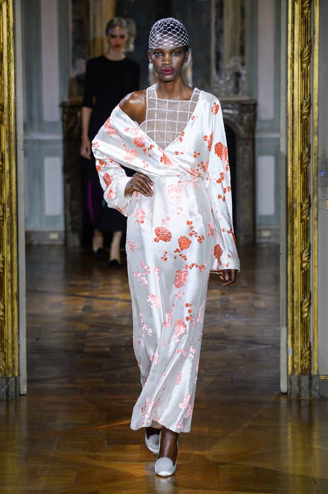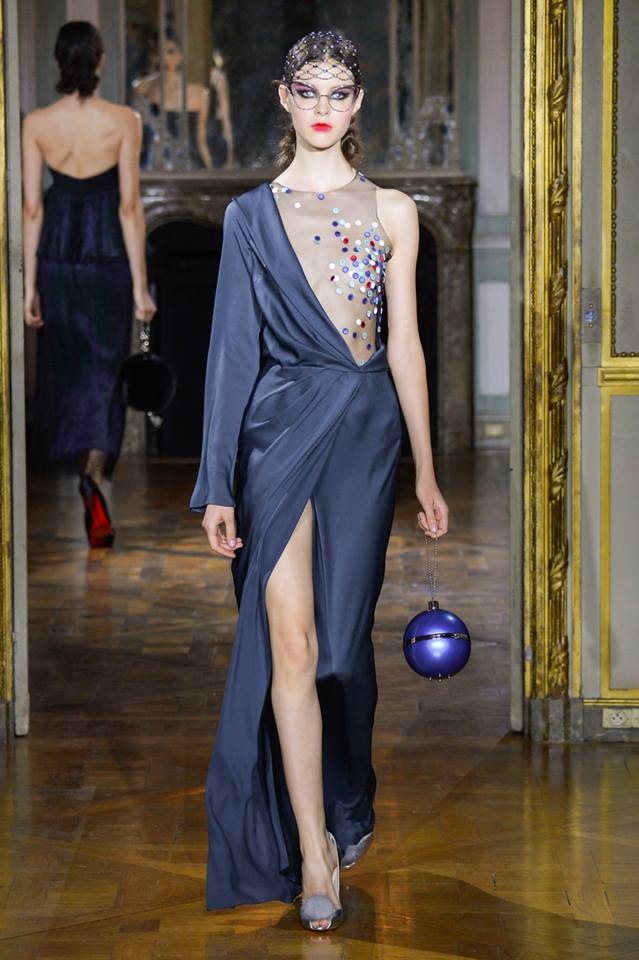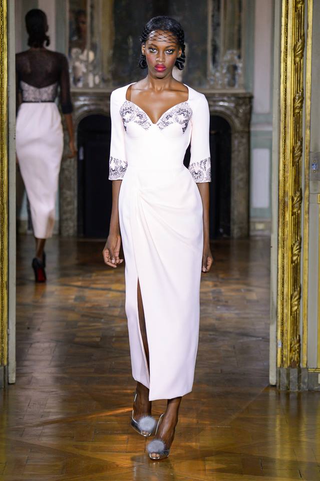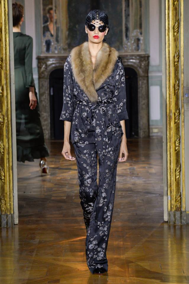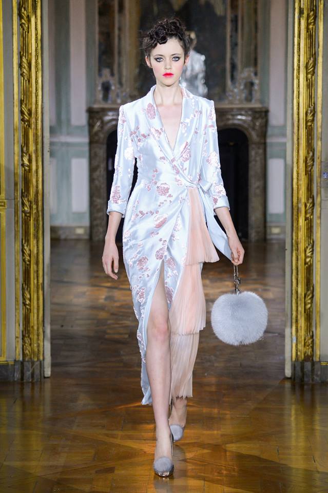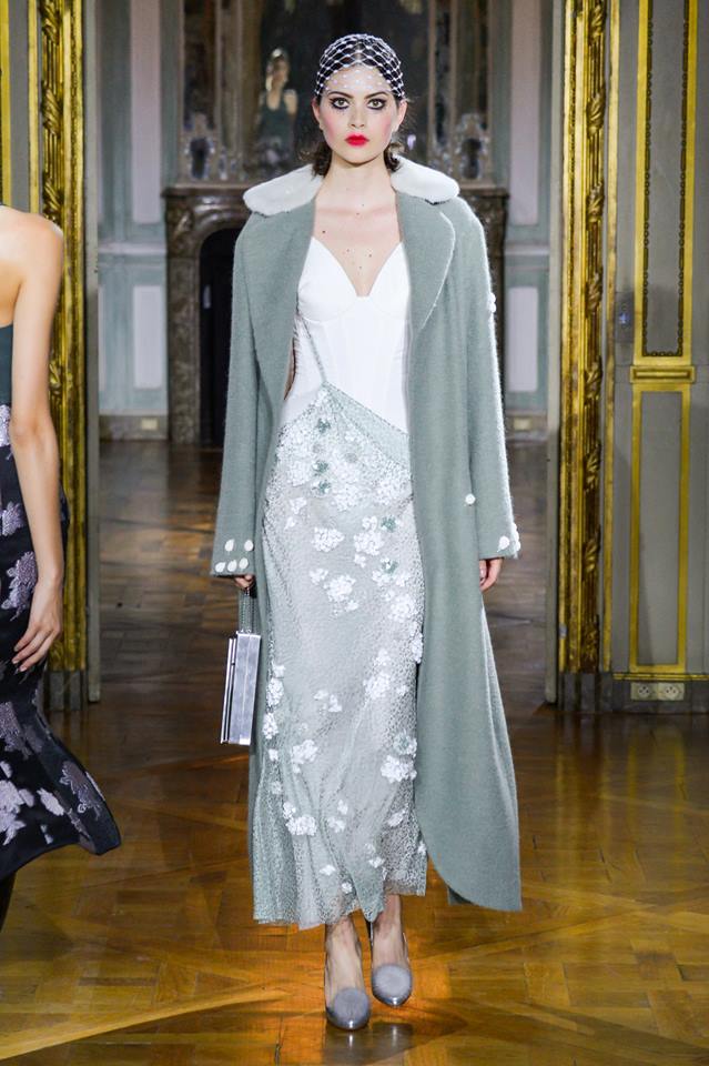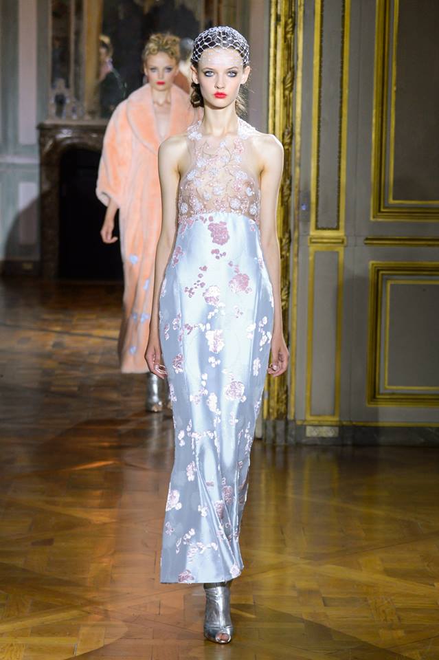 Inviting us to travel to her native Saint Petersburg, Ulyana Sergeenko took us back to the communal apartments of the Soviet era, each piece subtly suggesting the traditional interiors of her childhood: a sofa became a soft fur coat, and a fully embroidered dress evoked the structured silhouette of a lampshade. The designer has made high-flying craftsmanship her trademark, and this season was no exception, from meticulously hand-applied crystals to delicate lace bibs and sumptuous fur coats. Christian Louboutin chose to echo the fur pompoms that punctuated the collection, topping his Youpi 120 in silver metallic leather and his brand-new Dorissima 120 in matte leather with a single fluffy mink pompom. From head to toe, Ulyana Sergeenko paid a vibrant tribute to old-world nostalgia and Haute Couture opulence.