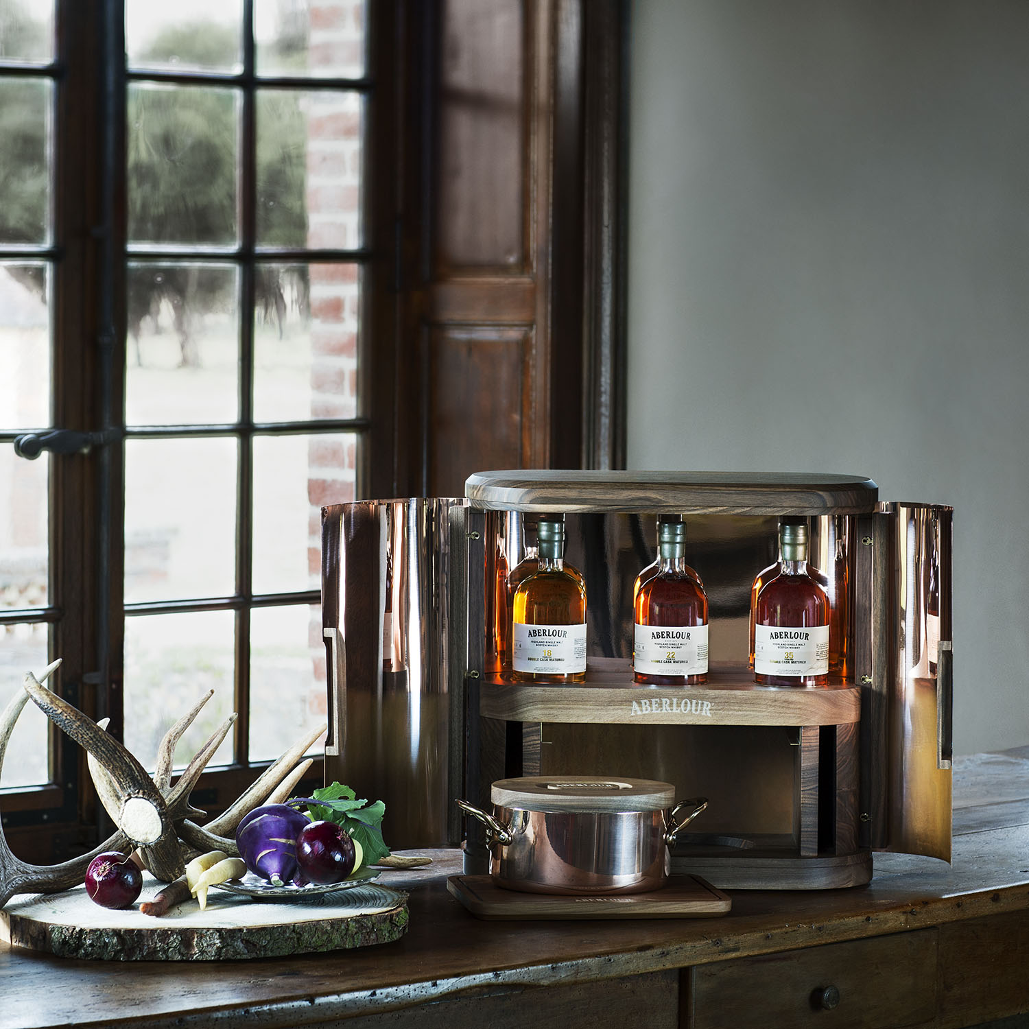 This box contains three new bottles: 18, 22 and 35 years old, and all you need to prepare a gourmet dinner with game and Aberlour Single Malts: a casserole dish and a cutting board.