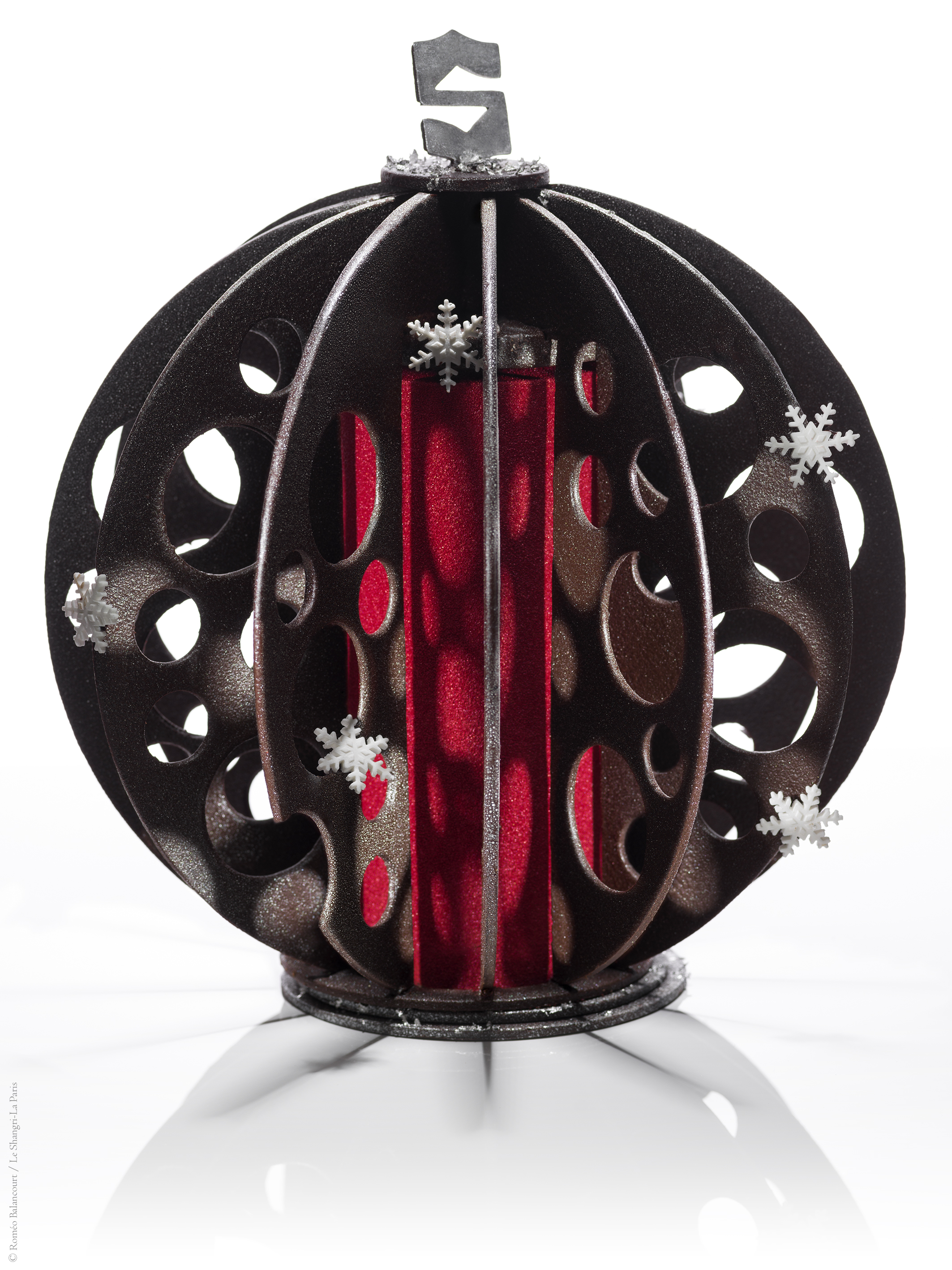 Barely three months after his arrival at the Shangri-La Hotel, Paris, Pastry Chef Michaël Bartocetti unveils his “Sphère de Noël” log: a delicate creation, combining the crunch of chocolate with the freshness of fruit and citrus.